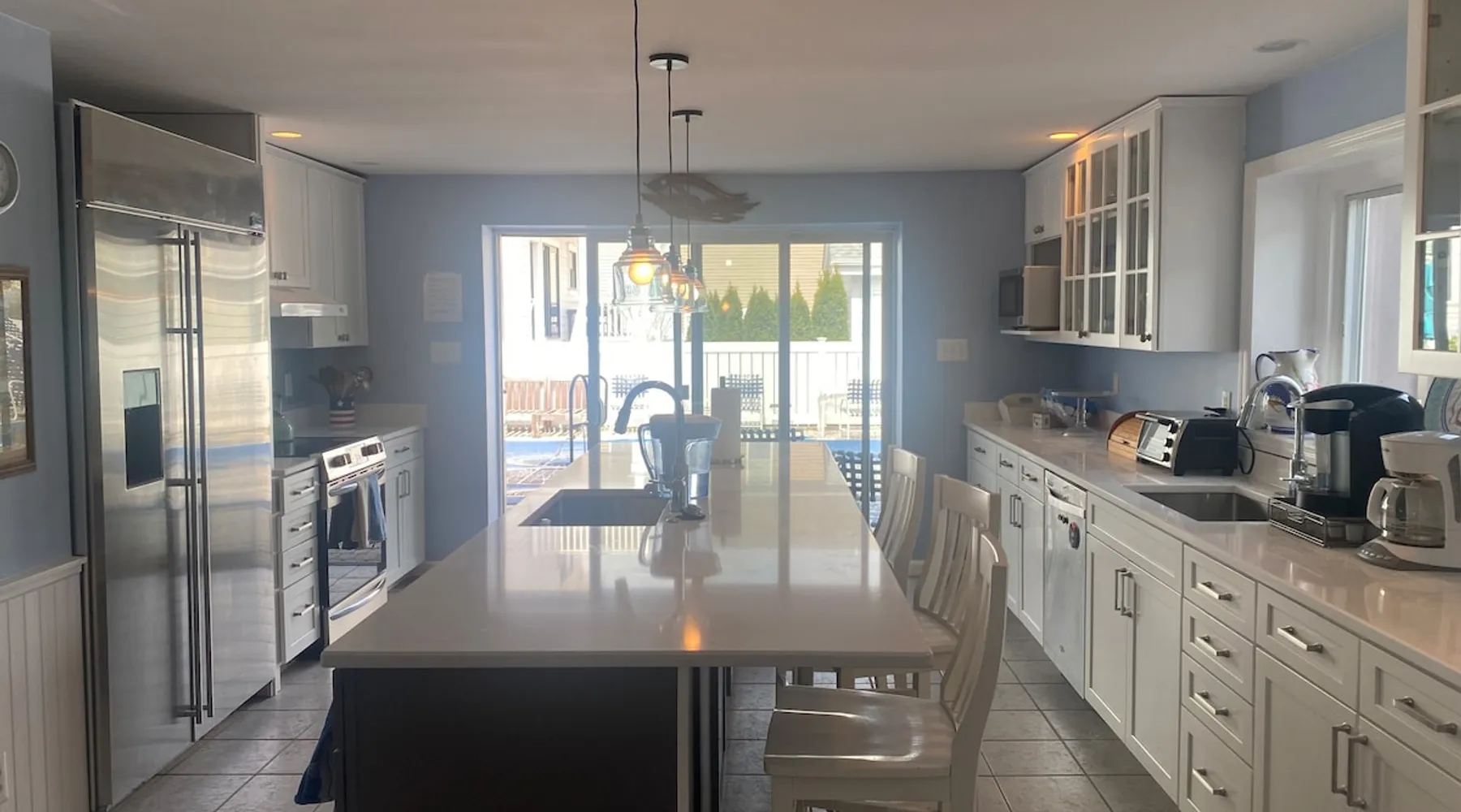 Home has been in the family for 3 generations, has been renovated and updated. It is perfect for large families. It has a downstairs with 3 bedrooms, 2 bathrooms, kitchen and grand room. It has an upstairs with a separate kitchenette, den, 4 bedrooms and two bathrooms. It has 3 separate porches and the one of the largest, if not the largest, pool on the island. Pool usually open Memorial Day to about the middle or end of Sept. We do not rent the house from July to mid August The space Linens and towels are not included, but there are local places to rent them. Contact owner if you want assistance. This house boasts kitchen on the main floor and kitchenette upstairs, and family rooms on both floors. The downstairs kitchen has all modern appliances, with an oversized center island that can easily seat 4, 2 sinks, and 2 dishwashers. The kitchen is fully equipped with all the tools you need prepare great meals for your family and friends. The living/dining/kitchen open area leads out to a full size in-ground swimming pool with ample outdoor furniture and an outside shower to rinse the sand off before you plunge into the pool, which is a full size pool and one of the largest on the Island. Pool is usually open from Memorial Day weekend to late September, but please check with owner if pool will be open. Or spend time at the Stone Harbor recreation area 3 short blocks away, with 12 tennis courts, basketball courts, playground and various ball fields. Or walk to town in just 8 blocks where you must be sure to get Springers famous ice cream and stroll the town or catch a movie. This house has 7 nicely decorated, comfortable bedrooms. The upstairs master has a king size bed and balcony, the downstairs master has a king size bed, and front porch. There is also another queen bedroom and a third bedroom with two singles on the first floor and 2 bathrooms. Upstairs has a total of 4 bedrooms, one has a king, two have queens and the largest room has 3 singles. TV's throughout. We have central air and heat, 2 wood burning fireplaces and enough balconies and windows to enjoy the ocean breeze. This house is perfect for any family gathering of up to 14 people, plenty of places to hide, 3 balconies to choose from! We have been enjoying this house for many years and so will you. In the late Spring, June and September, weekly rentals are usually Friday to Friday. Two night minimum stay. If you want to book either weekend night you must pay rate for a full weekend. So Sat and Sun nights, or Thurs and Fri nights, would the same as Fri and Sat night LINENS AND/OR TOWELS CAN BE SUPPLIED BY A SERVICE FOR A SMALL REASONABLE FEE. MOST GUESTS DO NOT WANT THIS, SO I DO NOT INCLUDE THE COST IN THE CHARGES. BUT YOU CAN GET EITHER OR BOTH FOR A REASONABLE FEE. PLEASE CHECK WITH OWNER.