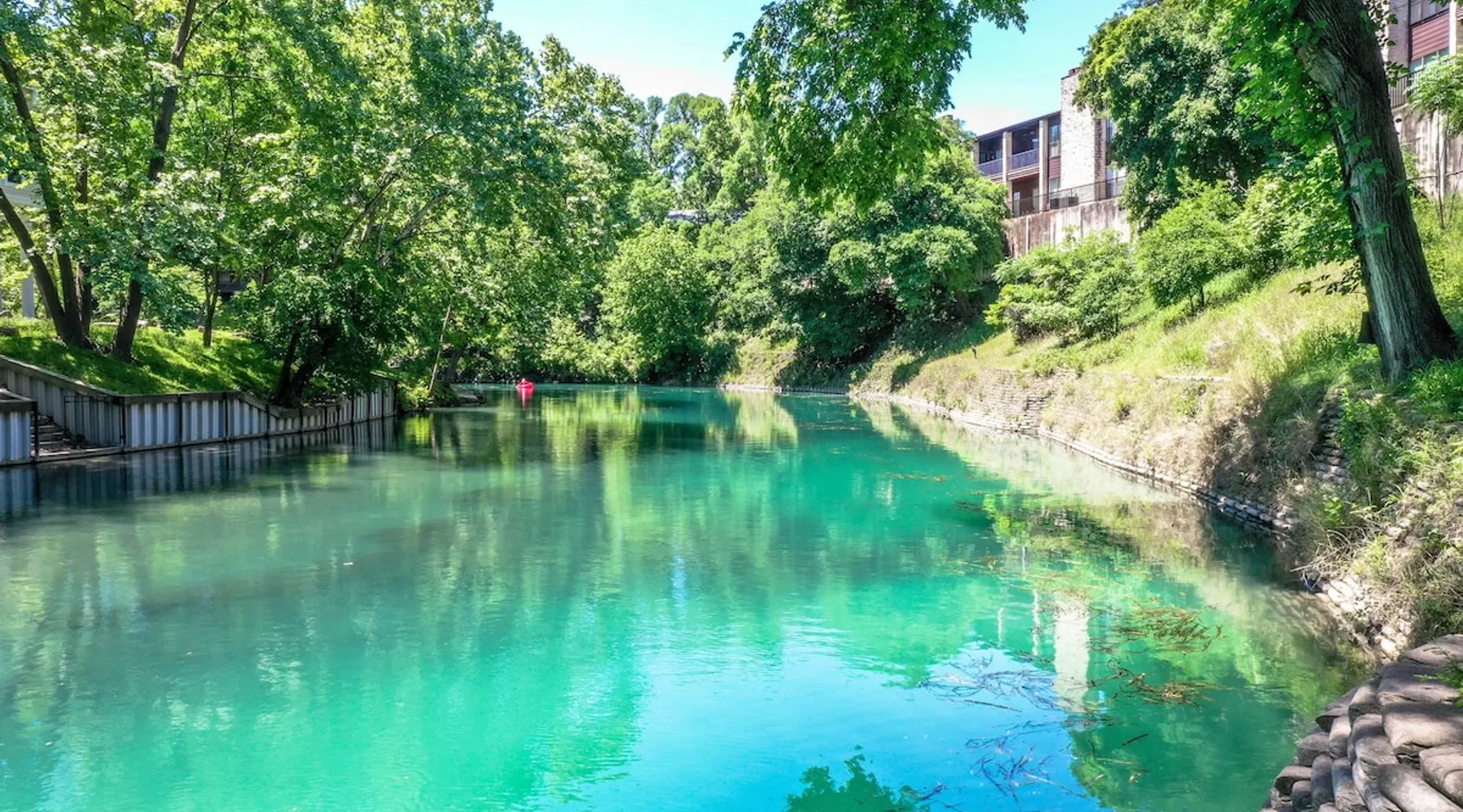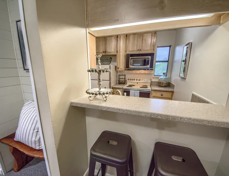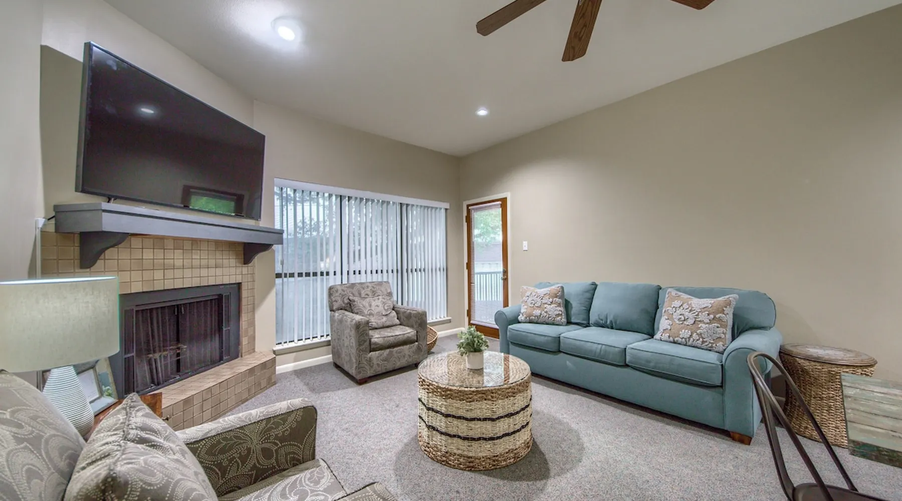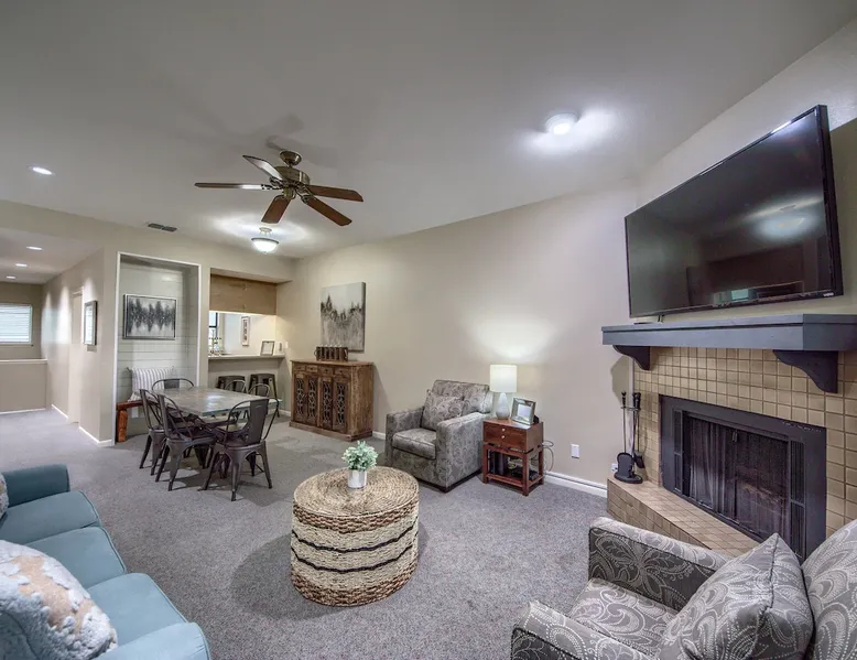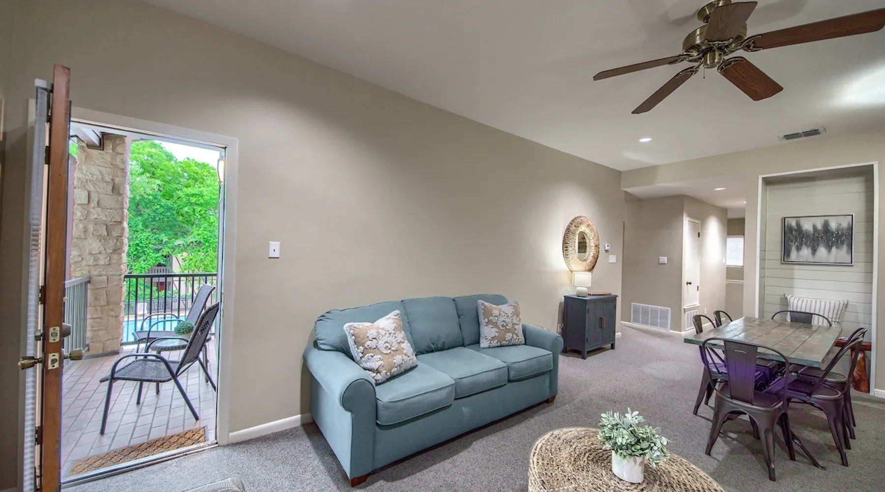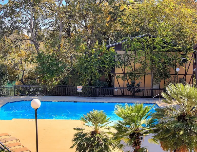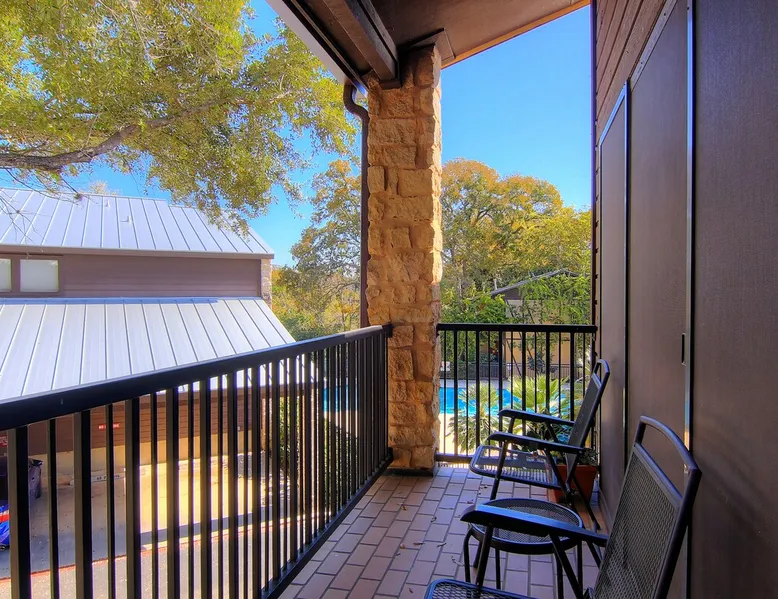 2/2 condo. Sleeps 8. Master: King. 2nd bedroom: 2 Queens. Living Room: Sofa Sleeper. No Pets Allowed. MUST BE 25 TO RENT. Renter's ID and Credit Card must be presented at check in or via email. The space Beautiful 2 bedroom, 2 bath condo at Camp Warnecke Estates is just steps from the Comal River and right across the street from Schlitterbahn! The open living room/dining room is a great place to relax after a day on the River with it’s beautiful fireplace and flat screen TV. Enjoy a cup of coffee in the morning sitting in the cozy bar stools or out on the patio, enjoying a great view of the beautiful pool and hot tub area! The dining table has seating for 6 and the bar has seating for 2. The cozy kitchen is equipped with all the basics you will need to cook breakfast, lunch and dinner. The master bedroom has a king size bed, a TV and has patio access as well! The spacious master bathroom has everything you need to get ready! Enjoy the beautiful shower or take a long relaxing bath in the separate bathtub. The second bedroom also has two cozy Queen beds and is just down the hall from the second spacious bathroom with a shower/tub combo. There is a sofa sleeper in the living room and a washer and dryer in the unit. Accommodates 8 people very comfortably. All bedrooms and bathrooms come stocked with high quality linens. Enjoy walking down to the Comal River with private river access for guests or swim in the pool and hot tub! Visit Gruene or downtown New Braunfels for shopping, restaurants and live music. River’s Edge is an amazing place to enjoy your trip to New Braunfels! Rockin' R is a local tube outfitter which can pick up in the parking lot next to Camp Warnecke between Memorial Day and Labor Day. For any reservation outside of that time period, the Rockin' R shop is located only .5 miles away. Only two parking passes provided with one guaranteed numbered spot. The second parking pass is for general parking and is 'first come first served.' This condo is on the ground floor, however as soon as you enter the condo you must walk up a flight of stairs. Host must be 25 years of age or older to make a reservation and must be staying at the property. No pets allowed. Guests will be allowed 2 vehicles on premise with parking passes and 8 wristbands (max amount allowed). This condo has a maximum occupancy of 8 guests. This maximum occupancy is not to be exceeded at any time. No daytime guests allowed. No RV’s or trailers. **WRISTBANDS & PARKING PASSES REQUIRED*** These condos are individually owned and the owners graciously allow their "second homes" to be rented out and enjoyed! The HOA of the complex had laid out some policies to ensure everyone staying at the complex can have a wonderful time. Because of the fabulous location, we can have trouble with trespassers. The security guards on premise are there to ensure only renters are using the grounds and that guests are parking in the correct parking spaces. Please do not be offended by the wristband and parking pass policies, they are really there to ensure that you have a fabulous time! To comply with city and county short-term rental permit restrictions, the outdoor areas of this home are monitored by video camera. This property includes accidental damage protection up to $1500. WINTER MONTHLY RENTALS - if you are interested in renting monthly in the winter months, please contact New Braunfels Escapes for pricing details. This property is $1900 per month. ***Although every effort has been made by New Braunfels Escapes to ensure the accuracy of the information in this site, it is not guaranteed. It is subject to errors, omissions, change of price, change of house contents and/or features or withdrawal without notice. Starter pack of amenities is provided until you are able to get to the store. No perishables (including salt and pepper) are provided.***