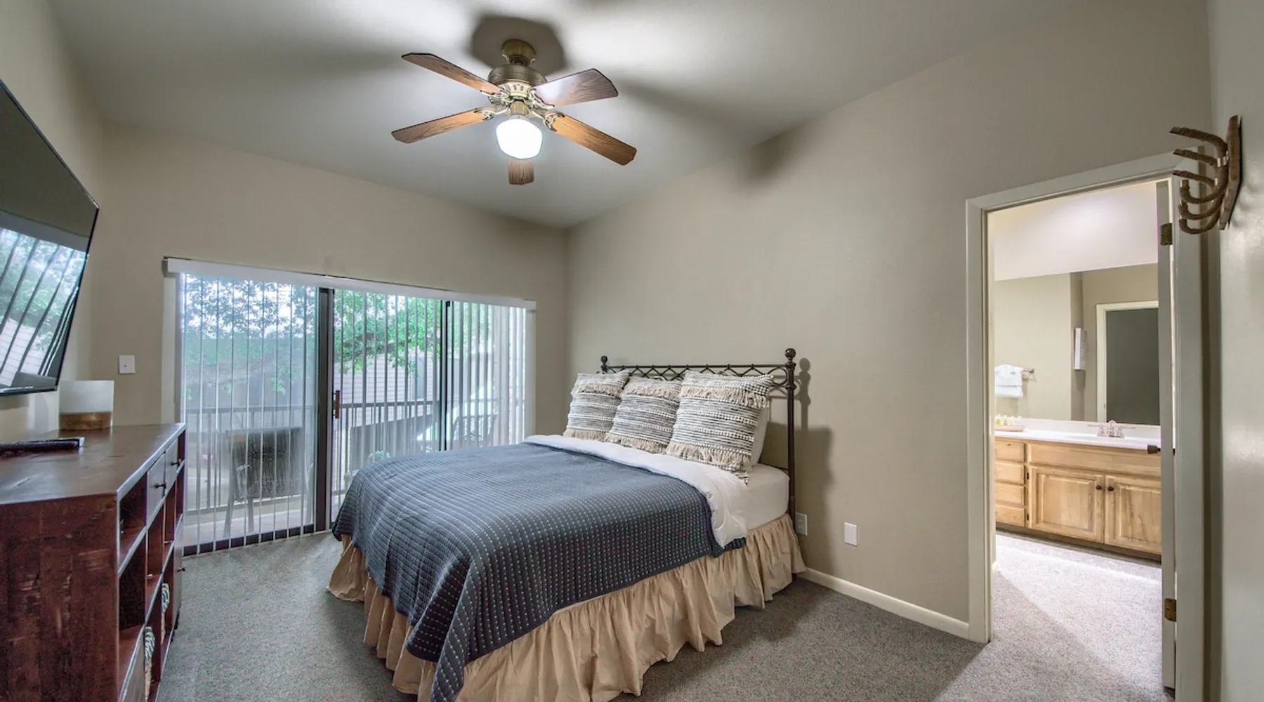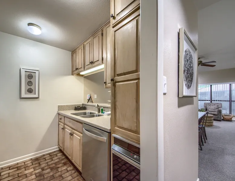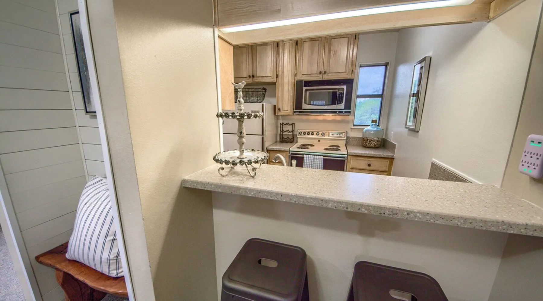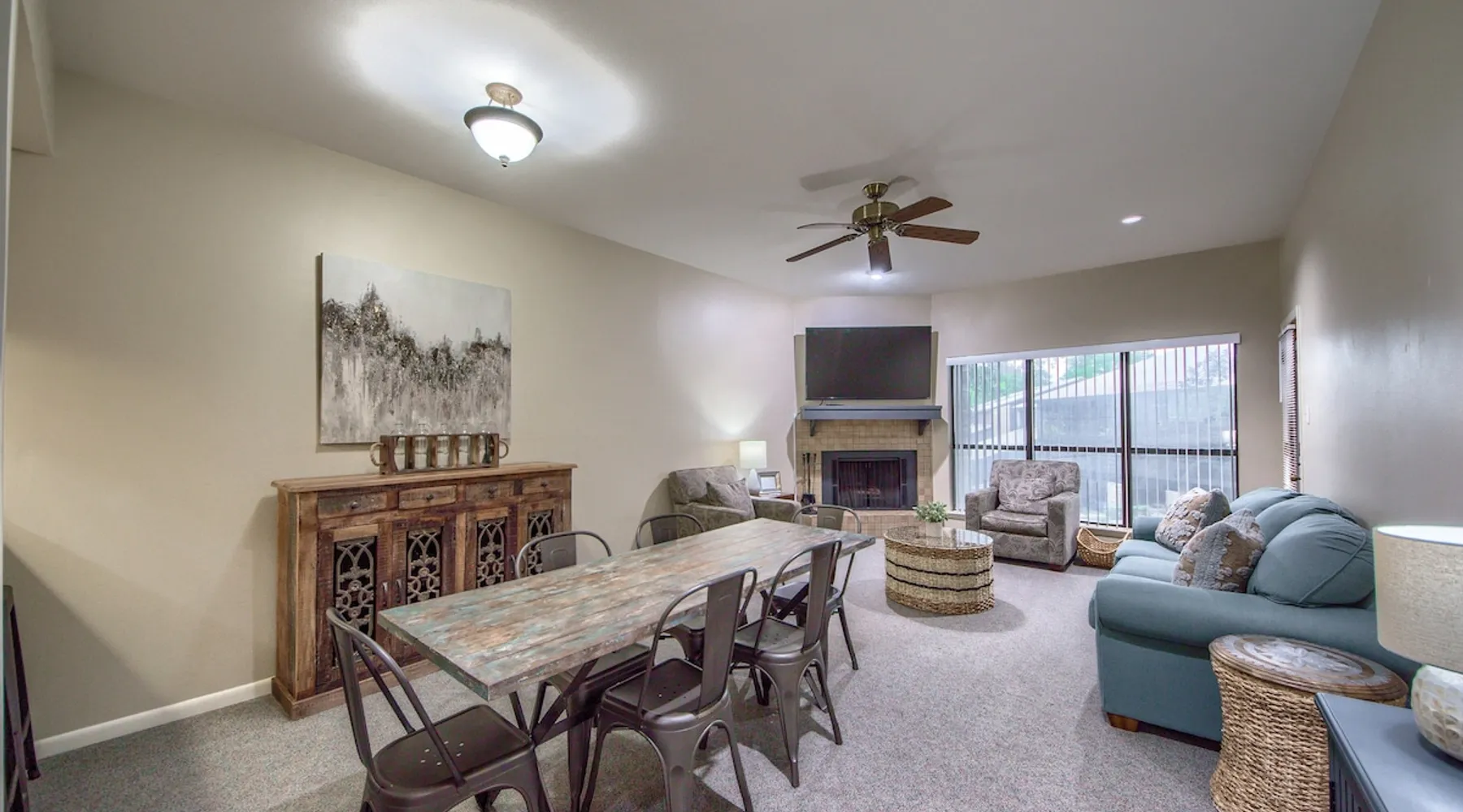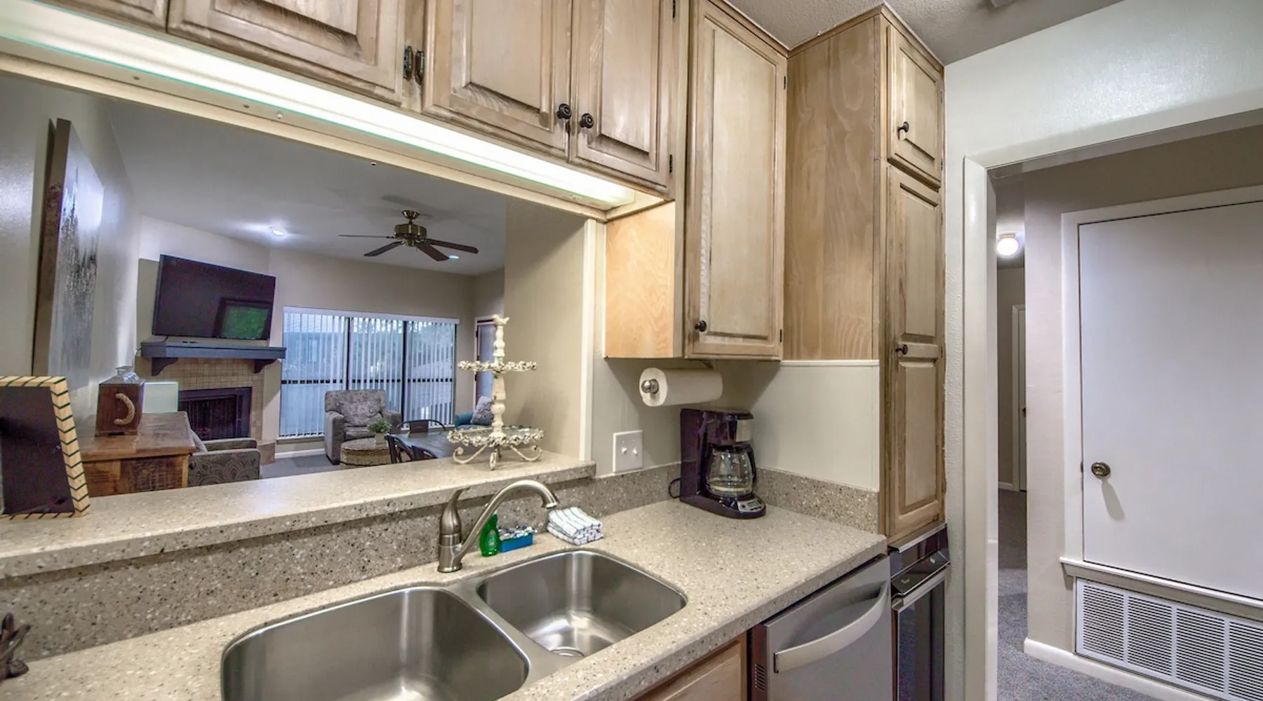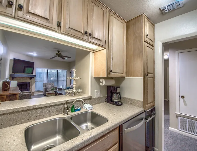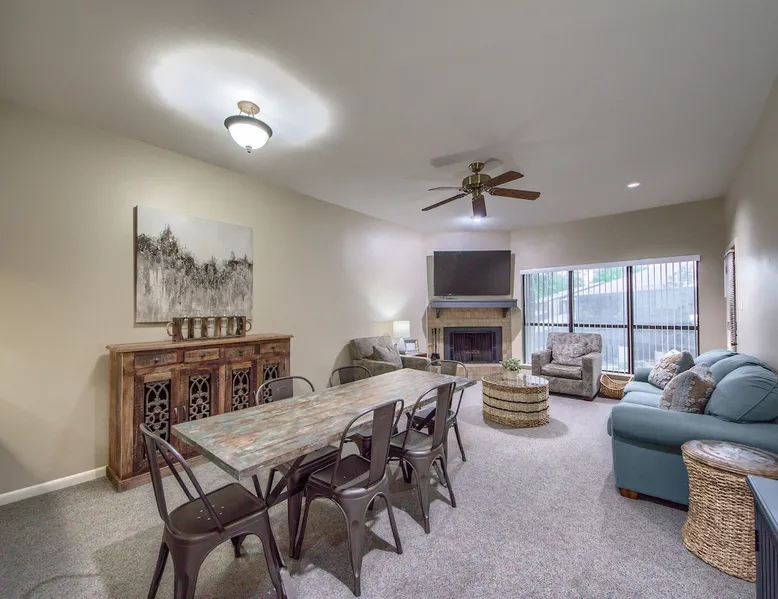 2/2 condo. Sleeps 8. Master: King. 2nd bedroom: 2 Queens. Living Room: Sofa Sleeper. No Pets Allowed. MUST BE 25 TO RENT. Renter's ID and Credit Card must be presented at check in or via email. The space Beautiful 2 bedroom, 2 bath condo at Camp Warnecke Estates is just steps from the Comal River and right across the street from Schlitterbahn! The open living room/dining room is a great place to relax after a day on the River with it’s beautiful fireplace and flat screen TV. Enjoy a cup of coffee in the morning sitting in the cozy bar stools or out on the patio, enjoying a great view of the beautiful pool and hot tub area! The dining table has seating for 6 and the bar has seating for 2. The cozy kitchen is equipped with all the basics you will need to cook breakfast, lunch and dinner. The master bedroom has a king size bed, a TV and has patio access as well! The spacious master bathroom has everything you need to get ready! Enjoy the beautiful shower or take a long relaxing bath in the separate bathtub. The second bedroom also has two cozy Queen beds and is just down the hall from the second spacious bathroom with a shower/tub combo. There is a sofa sleeper in the living room and a washer and dryer in the unit. Accommodates 8 people very comfortably. All bedrooms and bathrooms come stocked with high quality linens. Enjoy walking down to the Comal River with private river access for guests or swim in the pool and hot tub! Visit Gruene or downtown New Braunfels for shopping, restaurants and live music. River’s Edge is an amazing place to enjoy your trip to New Braunfels! Rockin' R is a local tube outfitter which can pick up in the parking lot next to Camp Warnecke between Memorial Day and Labor Day. For any reservation outside of that time period, the Rockin' R shop is located only .5 miles away. Only two parking passes provided with one guaranteed numbered spot. The second parking pass is for general parking and is 'first come first served.' This condo is on the ground floor, however as soon as you enter the condo you must walk up a flight of stairs. Host must be 25 years of age or older to make a reservation and must be staying at the property. No pets allowed. Guests will be allowed 2 vehicles on premise with parking passes and 8 wristbands (max amount allowed). This condo has a maximum occupancy of 8 guests. This maximum occupancy is not to be exceeded at any time. No daytime guests allowed. No RV’s or trailers. **WRISTBANDS & PARKING PASSES REQUIRED*** These condos are individually owned and the owners graciously allow their "second homes" to be rented out and enjoyed! The HOA of the complex had laid out some policies to ensure everyone staying at the complex can have a wonderful time. Because of the fabulous location, we can have trouble with trespassers. The security guards on premise are there to ensure only renters are using the grounds and that guests are parking in the correct parking spaces. Please do not be offended by the wristband and parking pass policies, they are really there to ensure that you have a fabulous time! To comply with city and county short-term rental permit restrictions, the outdoor areas of this home are monitored by video camera. This property includes accidental damage protection up to $1500. WINTER MONTHLY RENTALS - if you are interested in renting monthly in the winter months, please contact New Braunfels Escapes for pricing details. This property is $1900 per month. ***Although every effort has been made by New Braunfels Escapes to ensure the accuracy of the information in this site, it is not guaranteed. It is subject to errors, omissions, change of price, change of house contents and/or features or withdrawal without notice. Starter pack of amenities is provided until you are able to get to the store. No perishables (including salt and pepper) are provided.***
