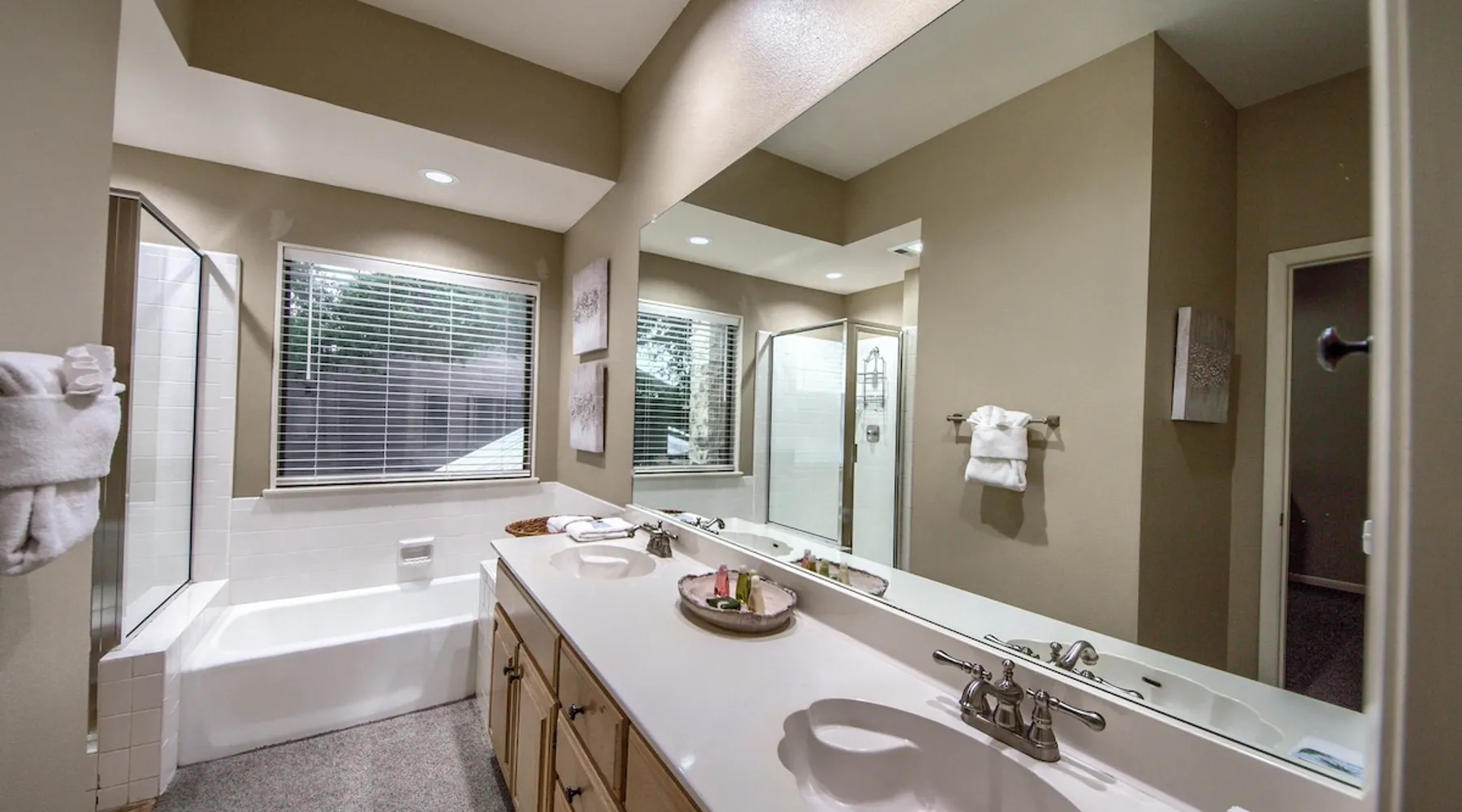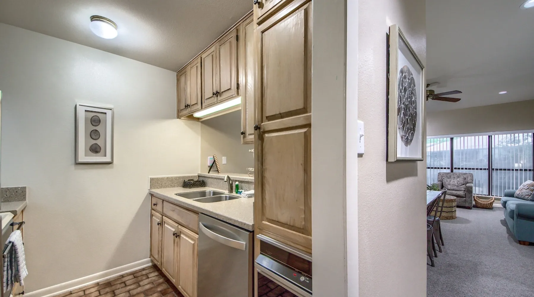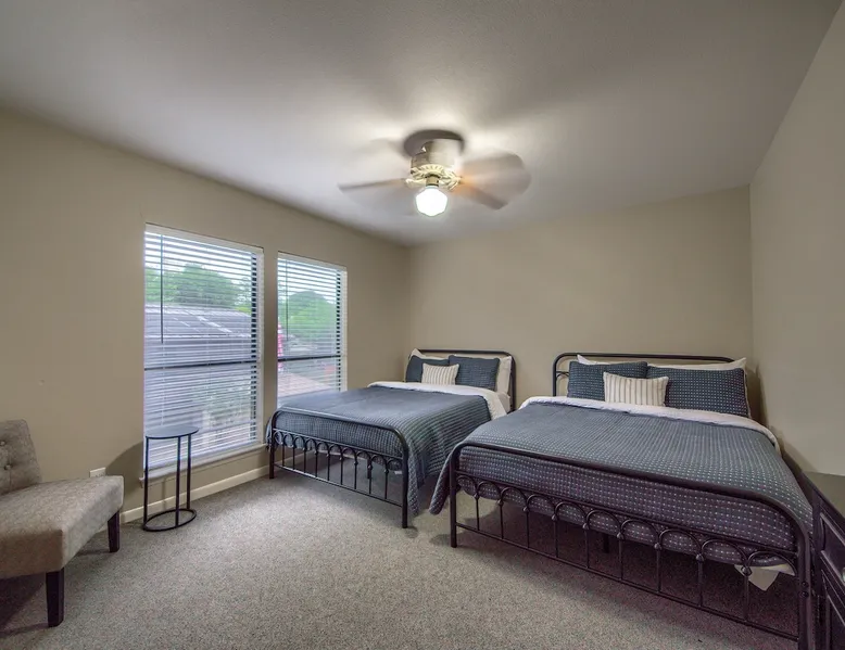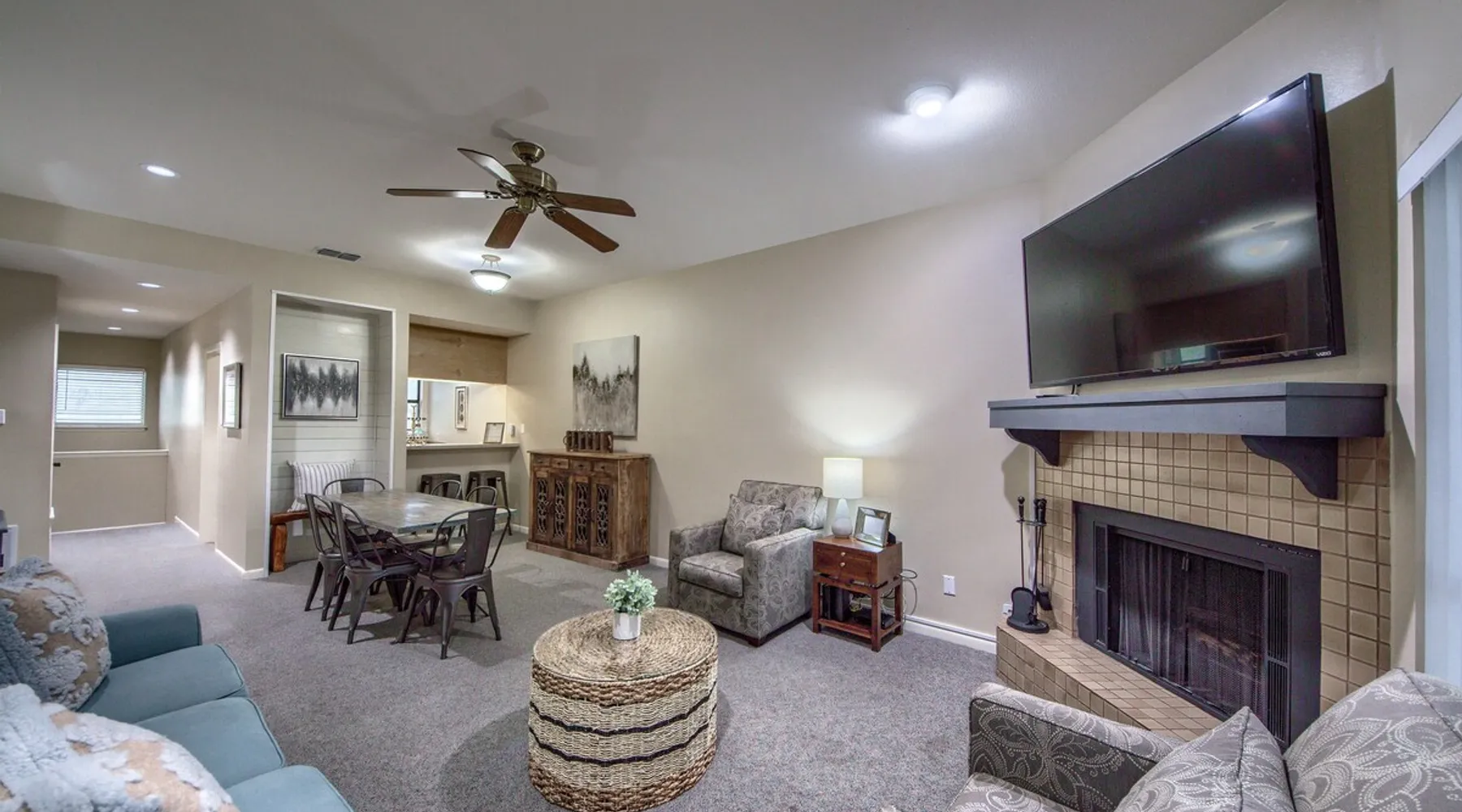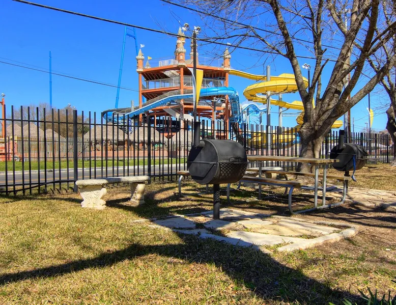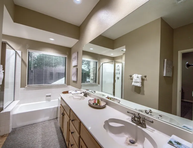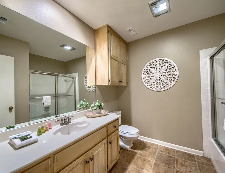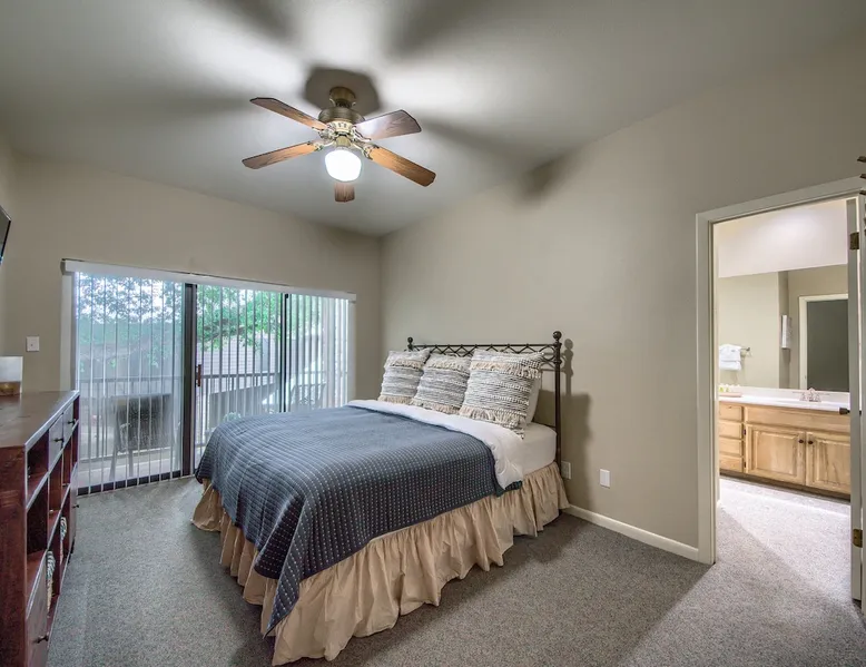 2/2 condo. Sleeps 8. Master: King. 2nd bedroom: 2 Queens. Living Room: Sofa Sleeper. No Pets Allowed. MUST BE 25 TO RENT. Renter's ID and Credit Card must be presented at check in or via email. The space Beautiful 2 bedroom, 2 bath condo at Camp Warnecke Estates is just steps from the Comal River and right across the street from Schlitterbahn! The open living room/dining room is a great place to relax after a day on the River with it’s beautiful fireplace and flat screen TV. Enjoy a cup of coffee in the morning sitting in the cozy bar stools or out on the patio, enjoying a great view of the beautiful pool and hot tub area! The dining table has seating for 6 and the bar has seating for 2. The cozy kitchen is equipped with all the basics you will need to cook breakfast, lunch and dinner. The master bedroom has a king size bed, a TV and has patio access as well! The spacious master bathroom has everything you need to get ready! Enjoy the beautiful shower or take a long relaxing bath in the separate bathtub. The second bedroom also has two cozy Queen beds and is just down the hall from the second spacious bathroom with a shower/tub combo. There is a sofa sleeper in the living room and a washer and dryer in the unit. Accommodates 8 people very comfortably. All bedrooms and bathrooms come stocked with high quality linens. Enjoy walking down to the Comal River with private river access for guests or swim in the pool and hot tub! Visit Gruene or downtown New Braunfels for shopping, restaurants and live music. River’s Edge is an amazing place to enjoy your trip to New Braunfels! Rockin' R is a local tube outfitter which can pick up in the parking lot next to Camp Warnecke between Memorial Day and Labor Day. For any reservation outside of that time period, the Rockin' R shop is located only .5 miles away. Only two parking passes provided with one guaranteed numbered spot. The second parking pass is for general parking and is 'first come first served.' This condo is on the ground floor, however as soon as you enter the condo you must walk up a flight of stairs. Host must be 25 years of age or older to make a reservation and must be staying at the property. No pets allowed. Guests will be allowed 2 vehicles on premise with parking passes and 8 wristbands (max amount allowed). This condo has a maximum occupancy of 8 guests. This maximum occupancy is not to be exceeded at any time. No daytime guests allowed. No RV’s or trailers. **WRISTBANDS & PARKING PASSES REQUIRED*** These condos are individually owned and the owners graciously allow their "second homes" to be rented out and enjoyed! The HOA of the complex had laid out some policies to ensure everyone staying at the complex can have a wonderful time. Because of the fabulous location, we can have trouble with trespassers. The security guards on premise are there to ensure only renters are using the grounds and that guests are parking in the correct parking spaces. Please do not be offended by the wristband and parking pass policies, they are really there to ensure that you have a fabulous time! To comply with city and county short-term rental permit restrictions, the outdoor areas of this home are monitored by video camera. This property includes accidental damage protection up to $1500. WINTER MONTHLY RENTALS - if you are interested in renting monthly in the winter months, please contact New Braunfels Escapes for pricing details. This property is $1900 per month. ***Although every effort has been made by New Braunfels Escapes to ensure the accuracy of the information in this site, it is not guaranteed. It is subject to errors, omissions, change of price, change of house contents and/or features or withdrawal without notice. Starter pack of amenities is provided until you are able to get to the store. No perishables (including salt and pepper) are provided.***