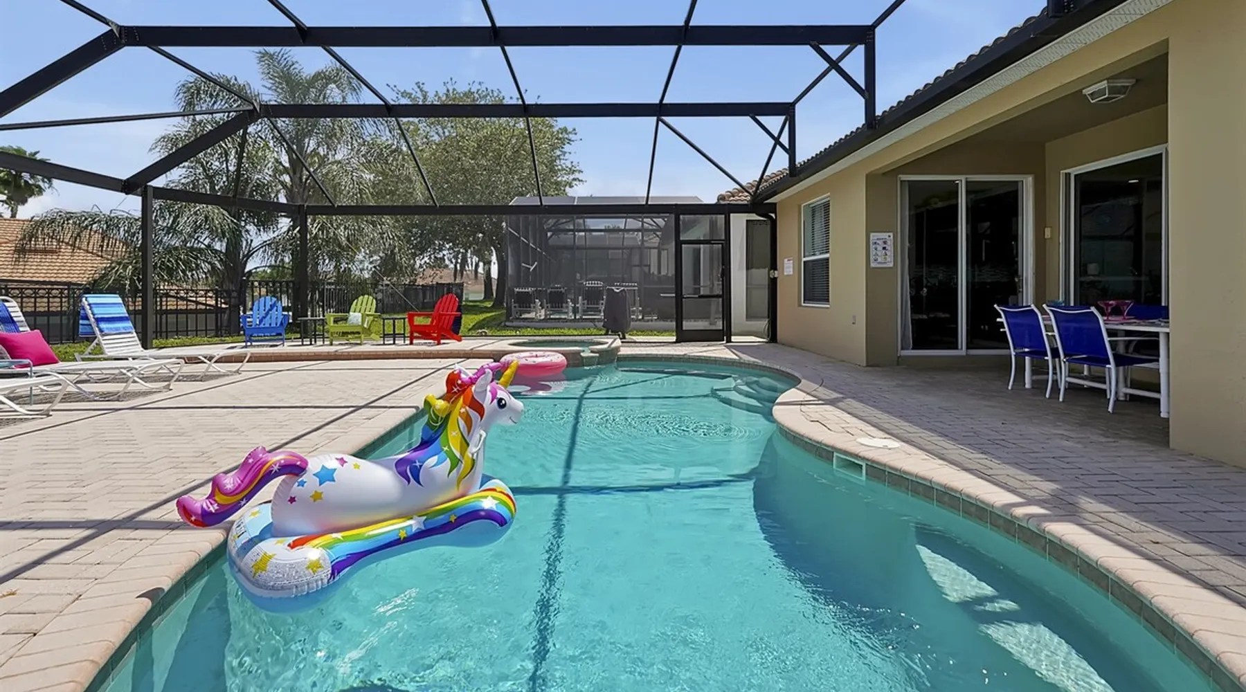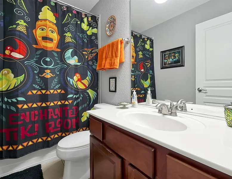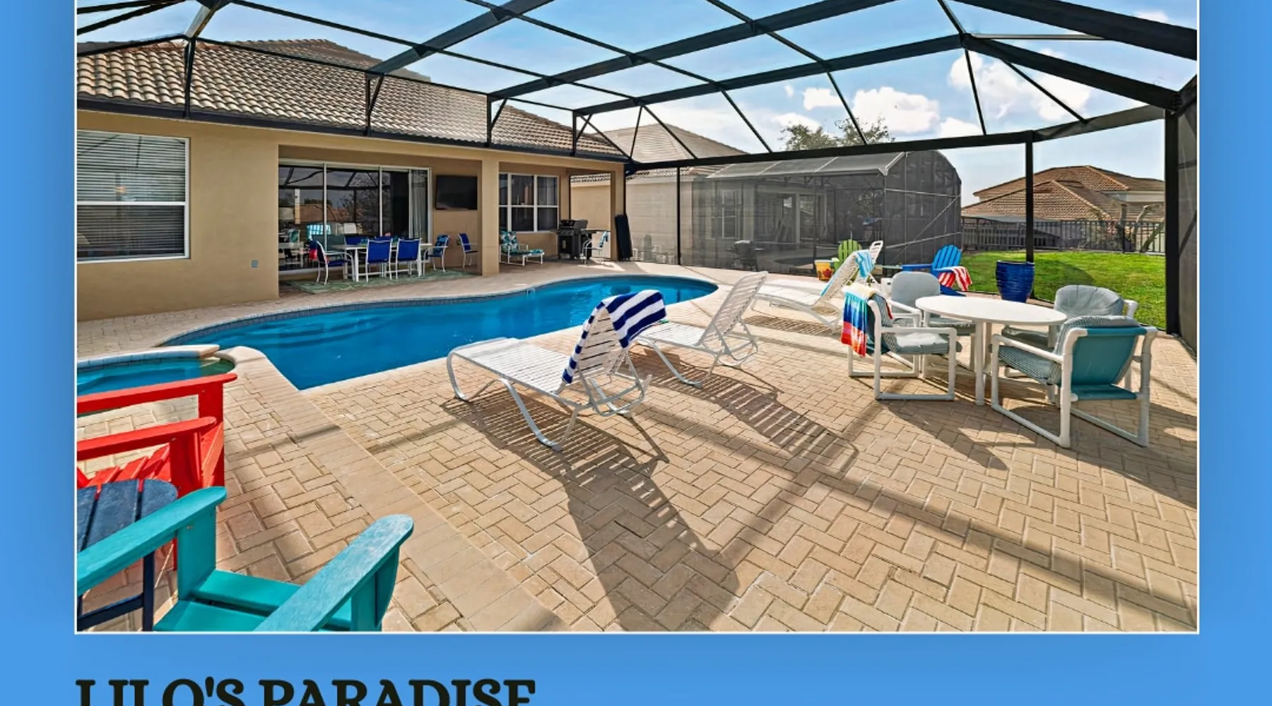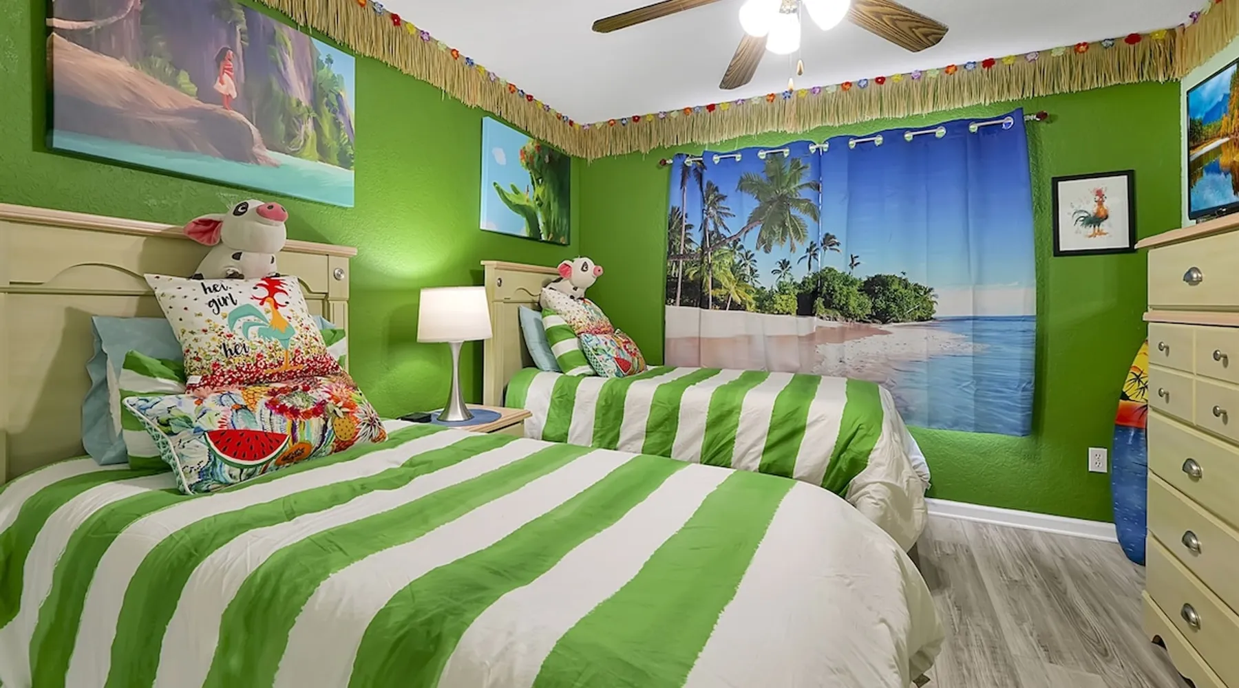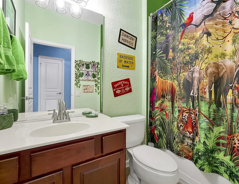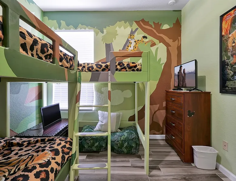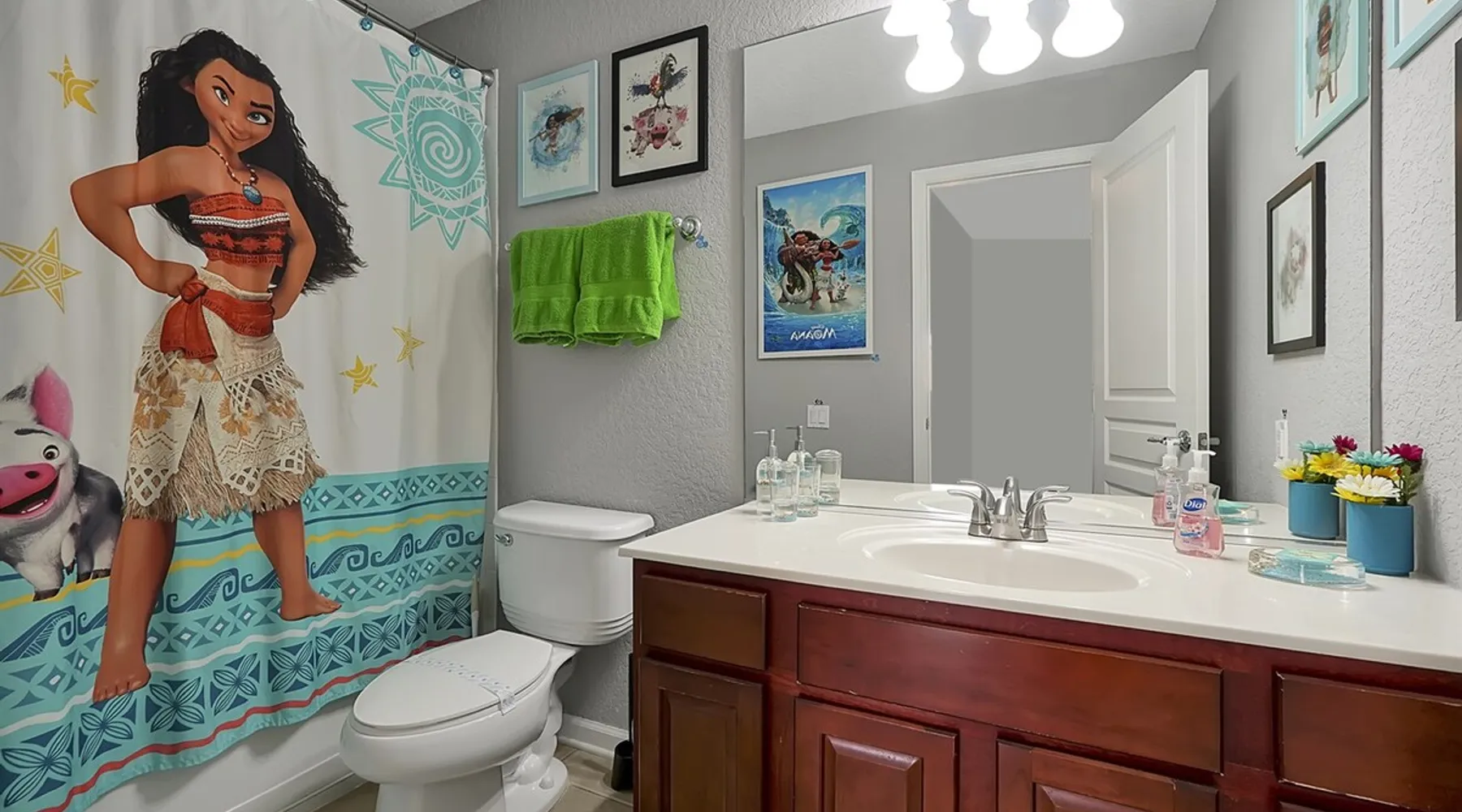 Lilo’s Paradise is a great place for large families who want to enjoy the ultimate convenience and relaxation. With a private pool, comfy themed bedrooms, a fun game room, a full kitchen, and many amenities that come with the gated community, there’s something for the whole family! Plus, you’ll be just a short drive from famous attractions. Disney World - 9 min drive Old Town - 14 min drive Fun Spot America - 15 min drive Create Lasting Memories In Kissimmee With Us & Learn More Below! The space ☆☆ HIGHLIGHTS ☆☆ ✹ 5 themed bedrooms; 3 kings, 1 bunk bed, 2 twins ✹ 5 full bathrooms ✹ Open floor plan ✹ Fully equipped kitchen w/ stainless appliances ✹ Coffee station ✹ Bright living room ✹ Family-friendly amenities ✹ Free wifi + flat-screen Smart TVs ✹ Pirates of the Caribbean themes Game room w/ mural, pool table, arcade game, PS4, Xbox One, and foosball. ✹ Washer + dryer ✹ Expansive outdoor patio (one of the largest pool decks in Windsor Hills) ✹ Private heated swimming pool + hot tub (complimentary heating) ✹ Sun loungers + outdoor TV ✹ Outdoor dining tables + BBQ (complimentary propane) ✹ Free parking for 3 vehicles at the home. ✹ Free access to Windsor Hills amenities including a waterpark, gym, pools + more! Eager to Read More? Here Are A Few Kind Words From Our Previous Guests: “Chuck and Deanna were very responsive and helpful. They met all of our needs. The home was super comfy with lots and lots of cooking stuff. The sun deck was amazing, the pool was incredible, outdoor entertainment was excellent! I love the keepsake the most!! We'll be back soon!” - Latoyor (Other listing) “Chuck and Deanna are great hosts! They are very friendly and try to help with everything you need. The house is very clean and very good equipped. The best part of the house is the big deck with the pool. The pool was heated and my kids spent all day playing in the pool. Thank you Deanna to make our vacation wonderful! :)” - Mihaela “Hands down some of the best hosts I have ever rented from. The communication from Chuck and Deanna has been second to none. The house was well stocked and was the perfect place for our dance team to stay while in town for the Dance Worlds.” - Sheila (Other listing) ★★ BEDROOMS ★★ This private oasis features five thoughtfully designed and welcoming bedrooms, each with a fun theme and comfy beds topped with plush mattresses and high-end linens. No matter which room you’re in, you’ll have a ceiling fan, a TV with cable and a Roku, and easy access to a full bathroom. ✹ Primary bedroom (Vintage Disney theme): King-sized bed, ensuite bathroom ✹ Second bedroom (Jungle Cruise theme): Custom-built bunk beds sleep 3 guests in twin beds (two “top” bunks, one “low” bunk, fun mural ✹ Third bedroom (Under The Sea theme): King-sized bed, ensuite bathroom, walk-in shower, water closet ✹ Fourth bedroom (Tiki Theme): King-sized bed ✹ Fifth bedroom (Moana Theme): 2 twin beds ★★ BATHROOMS ★★ Lilo’s Paradise boasts five full bathrooms, providing ample space for the whole family to get ready for an exciting day at a theme park. Each bathroom is stocked with fresh towels and has plenty of storage space to unpack all your toiletries. ✹ Bathroom 1: Ensuite to the primary bedroom, dual vanity, walk-in shower, water closet ✹ Bathroom 2: Jungle-themed, single vanity, shower/tub combination ✹ Bathroom 3: Ensuite to the Under The Sea room, single vanity, walk-in shower, water closet ✹ Bathroom 4: Tiki theme, single vanity, shower/tub combination ✹ Bathroom 5: Moana theme single vanity, shower/tub combination ✔ Fresh towels ✔ Hair dryer ✔ Washer and dryer ✔ Iron ★★ KITCHEN & DINING ★★ Make delicious meals in the kitchen when you’re not trying some of the nearby restaurants. You’ll love the stainless steel appliances, granite countertops, and open-concept layout, making it easy to keep the conversation flowing between the lounge space and kitchen. A variety of basic kitchen supplies are provided to start you off, including spices, coffee, tea, coffee filters, salt and pepper, napkins, and cleaning supplies. When you’re ready to eat, you’ll find various areas to eat, including at the kitchen counter, at the small bistro table, around the formal dining table, or at the outdoor dining table. ✔ Stainless steel appliances and granite counters ✔ Full-size fridge and freezer ✔ Dishwasher, oven, stove, microwave ✔ Coffee station with coffee, tea, and coffee filters ✔ Basic spices, salt, and pepper ✔ Kitchen counter with seating for 2 ✔ Small dinette for 4 ✔ Dining table for 6 ★★ LIVING ROOM ★★ The charming living room is the perfect place to enjoy a small break from the Florida sun. Sit back on the sofa and watch your favorite movie on the Smart TV, enjoy some games or chit-chat with your companions, or catch up with friends back home using the free wifi. ✔ Plush sofa, loveseat, and chair ✔ 65” smart TV ✔ Free wifi ✔ High ceilings and huge windows ✔ Patio access ★★ GAME ROOM ★★ Enjoy some friendly competition in the Super Hero themed game room. This converted garage features a pool table, game consoles, a 3-TV gaming station, and an arcade game to keep your group entertained for hours on end. This is a perfect spot to keep the kids busy while the adults enjoy some grown-up time. ✔ Pool table ✔ 3-TV game station with Xbox One and PS4 ✔ Multi-game arcade game ✔ Wooden train table ★★ OUTDOOR SPACE ★★ Step out onto the expansive patio and enjoy outdoor living at its finest. The patio has been extended 17 feet behind the pool so you can enjoy even more of this private oasis without being bothered by bugs. A bonus of this outdoor area is the impressive view of the Magic Kingdom fireworks at night (when they’re running). Spend days in the pool and basking in the sunshine on the southern-facing deck, and evenings in the hot tub after enj