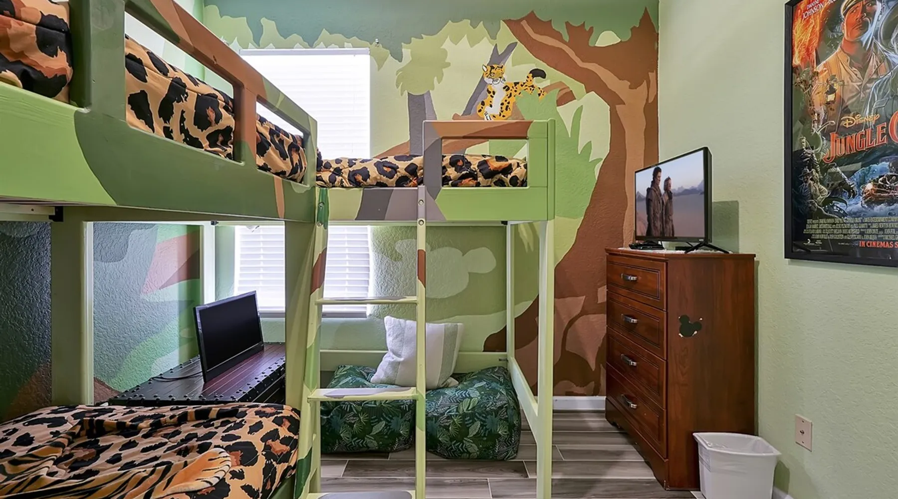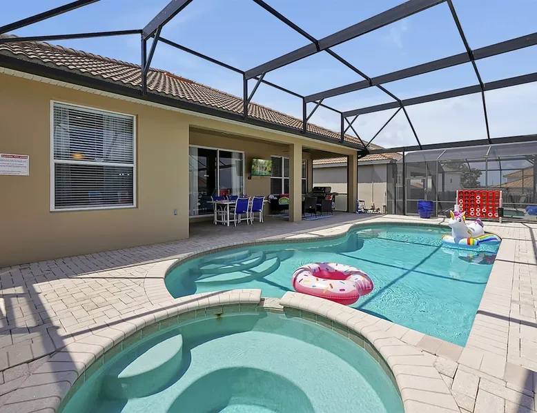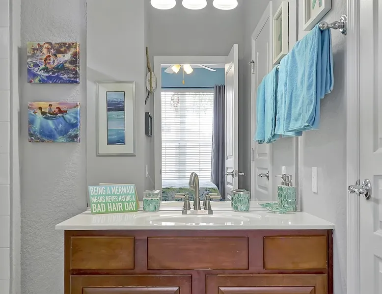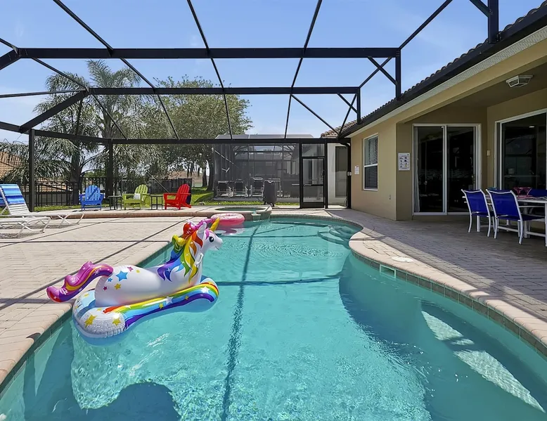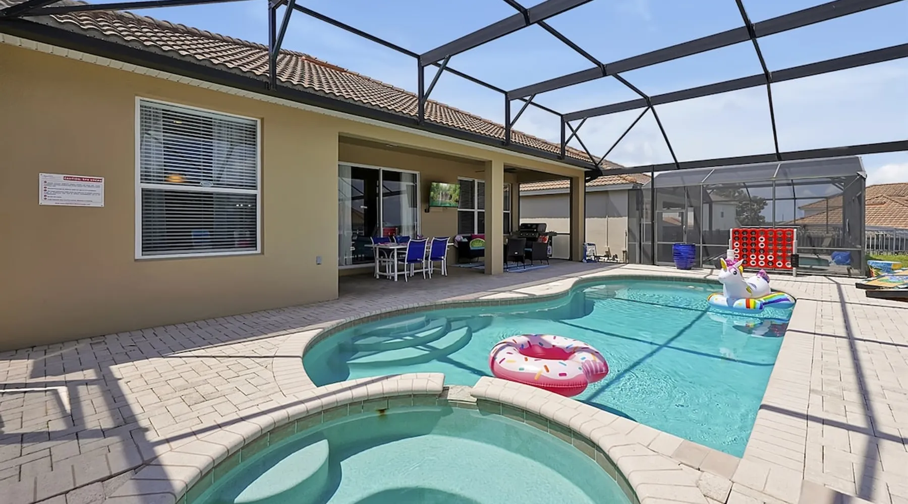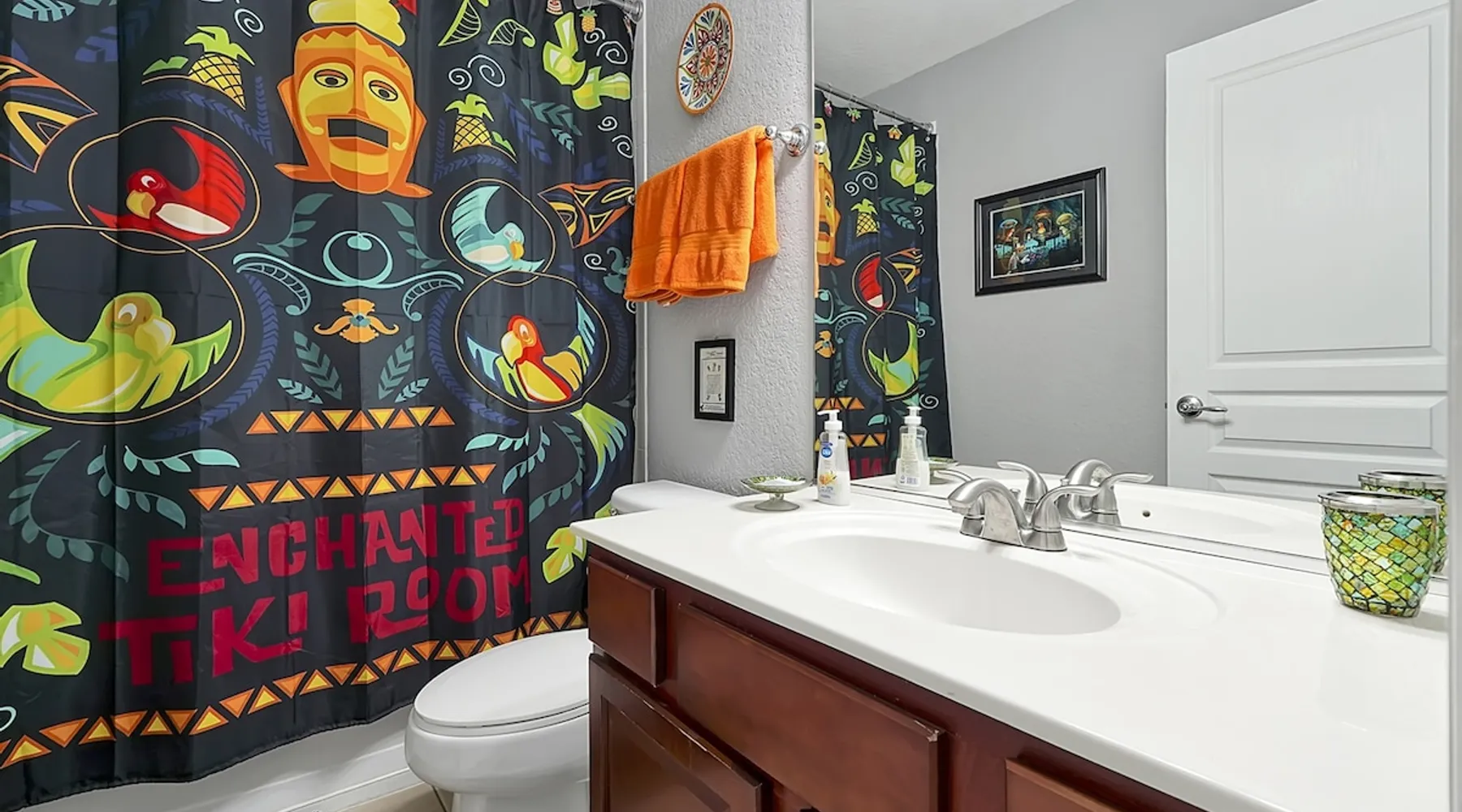 Lilo’s Paradise is a great place for large families who want to enjoy the ultimate convenience and relaxation. With a private pool, comfy themed bedrooms, a fun game room, a full kitchen, and many amenities that come with the gated community, there’s something for the whole family! Plus, you’ll be just a short drive from famous attractions. Disney World - 9 min drive Old Town - 14 min drive Fun Spot America - 15 min drive Create Lasting Memories In Kissimmee With Us & Learn More Below! The space ☆☆ HIGHLIGHTS ☆☆ ✹ 5 themed bedrooms; 3 kings, 1 bunk bed, 2 twins ✹ 5 full bathrooms ✹ Open floor plan ✹ Fully equipped kitchen w/ stainless appliances ✹ Coffee station ✹ Bright living room ✹ Family-friendly amenities ✹ Free wifi + flat-screen Smart TVs ✹ Pirates of the Caribbean themes Game room w/ mural, pool table, arcade game, PS4, Xbox One, and foosball. ✹ Washer + dryer ✹ Expansive outdoor patio (one of the largest pool decks in Windsor Hills) ✹ Private heated swimming pool + hot tub (complimentary heating) ✹ Sun loungers + outdoor TV ✹ Outdoor dining tables + BBQ (complimentary propane) ✹ Free parking for 3 vehicles at the home. ✹ Free access to Windsor Hills amenities including a waterpark, gym, pools + more! Eager to Read More? Here Are A Few Kind Words From Our Previous Guests: “Chuck and Deanna were very responsive and helpful. They met all of our needs. The home was super comfy with lots and lots of cooking stuff. The sun deck was amazing, the pool was incredible, outdoor entertainment was excellent! I love the keepsake the most!! We'll be back soon!” - Latoyor (Other listing) “Chuck and Deanna are great hosts! They are very friendly and try to help with everything you need. The house is very clean and very good equipped. The best part of the house is the big deck with the pool. The pool was heated and my kids spent all day playing in the pool. Thank you Deanna to make our vacation wonderful! :)” - Mihaela “Hands down some of the best hosts I have ever rented from. The communication from Chuck and Deanna has been second to none. The house was well stocked and was the perfect place for our dance team to stay while in town for the Dance Worlds.” - Sheila (Other listing) ★★ BEDROOMS ★★ This private oasis features five thoughtfully designed and welcoming bedrooms, each with a fun theme and comfy beds topped with plush mattresses and high-end linens. No matter which room you’re in, you’ll have a ceiling fan, a TV with cable and a Roku, and easy access to a full bathroom. ✹ Primary bedroom (Vintage Disney theme): King-sized bed, ensuite bathroom ✹ Second bedroom (Jungle Cruise theme): Custom-built bunk beds sleep 3 guests in twin beds (two “top” bunks, one “low” bunk, fun mural ✹ Third bedroom (Under The Sea theme): King-sized bed, ensuite bathroom, walk-in shower, water closet ✹ Fourth bedroom (Tiki Theme): King-sized bed ✹ Fifth bedroom (Moana Theme): 2 twin beds ★★ BATHROOMS ★★ Lilo’s Paradise boasts five full bathrooms, providing ample space for the whole family to get ready for an exciting day at a theme park. Each bathroom is stocked with fresh towels and has plenty of storage space to unpack all your toiletries. ✹ Bathroom 1: Ensuite to the primary bedroom, dual vanity, walk-in shower, water closet ✹ Bathroom 2: Jungle-themed, single vanity, shower/tub combination ✹ Bathroom 3: Ensuite to the Under The Sea room, single vanity, walk-in shower, water closet ✹ Bathroom 4: Tiki theme, single vanity, shower/tub combination ✹ Bathroom 5: Moana theme single vanity, shower/tub combination ✔ Fresh towels ✔ Hair dryer ✔ Washer and dryer ✔ Iron ★★ KITCHEN & DINING ★★ Make delicious meals in the kitchen when you’re not trying some of the nearby restaurants. You’ll love the stainless steel appliances, granite countertops, and open-concept layout, making it easy to keep the conversation flowing between the lounge space and kitchen. A variety of basic kitchen supplies are provided to start you off, including spices, coffee, tea, coffee filters, salt and pepper, napkins, and cleaning supplies. When you’re ready to eat, you’ll find various areas to eat, including at the kitchen counter, at the small bistro table, around the formal dining table, or at the outdoor dining table. ✔ Stainless steel appliances and granite counters ✔ Full-size fridge and freezer ✔ Dishwasher, oven, stove, microwave ✔ Coffee station with coffee, tea, and coffee filters ✔ Basic spices, salt, and pepper ✔ Kitchen counter with seating for 2 ✔ Small dinette for 4 ✔ Dining table for 6 ★★ LIVING ROOM ★★ The charming living room is the perfect place to enjoy a small break from the Florida sun. Sit back on the sofa and watch your favorite movie on the Smart TV, enjoy some games or chit-chat with your companions, or catch up with friends back home using the free wifi. ✔ Plush sofa, loveseat, and chair ✔ 65” smart TV ✔ Free wifi ✔ High ceilings and huge windows ✔ Patio access ★★ GAME ROOM ★★ Enjoy some friendly competition in the Super Hero themed game room. This converted garage features a pool table, game consoles, a 3-TV gaming station, and an arcade game to keep your group entertained for hours on end. This is a perfect spot to keep the kids busy while the adults enjoy some grown-up time. ✔ Pool table ✔ 3-TV game station with Xbox One and PS4 ✔ Multi-game arcade game ✔ Wooden train table ★★ OUTDOOR SPACE ★★ Step out onto the expansive patio and enjoy outdoor living at its finest. The patio has been extended 17 feet behind the pool so you can enjoy even more of this private oasis without being bothered by bugs. A bonus of this outdoor area is the impressive view of the Magic Kingdom fireworks at night (when they’re running). Spend days in the pool and basking in the sunshine on the southern-facing deck, and evenings in the hot tub after enj