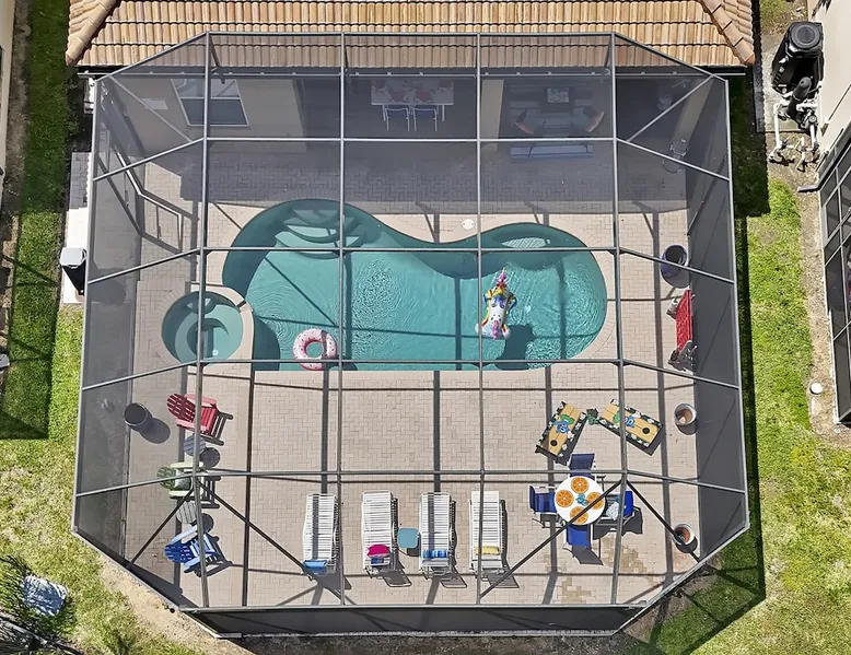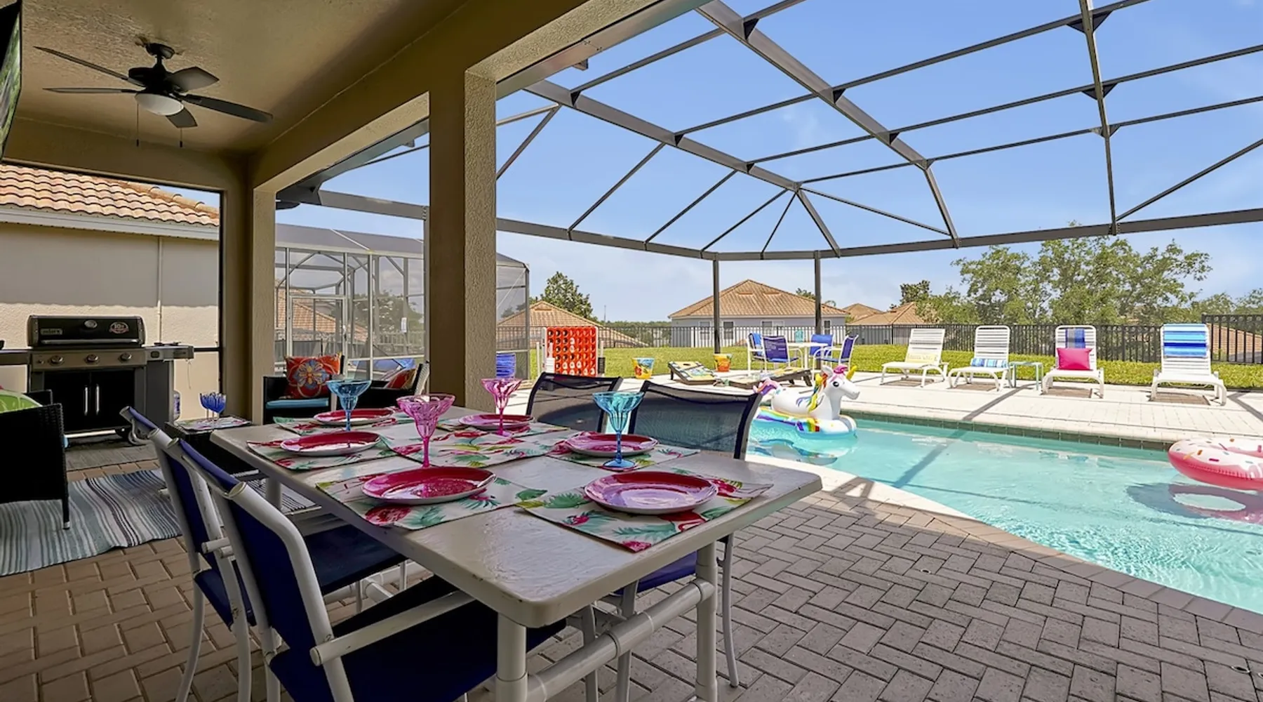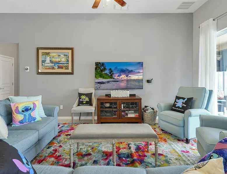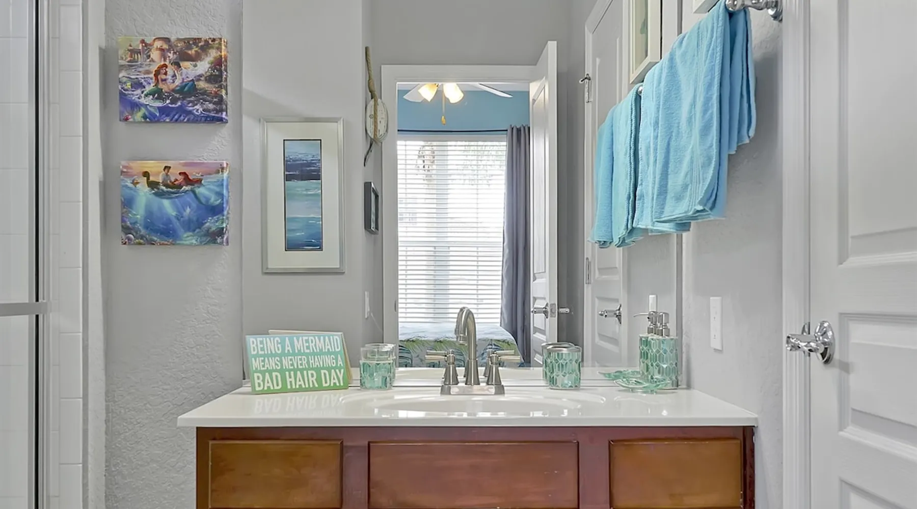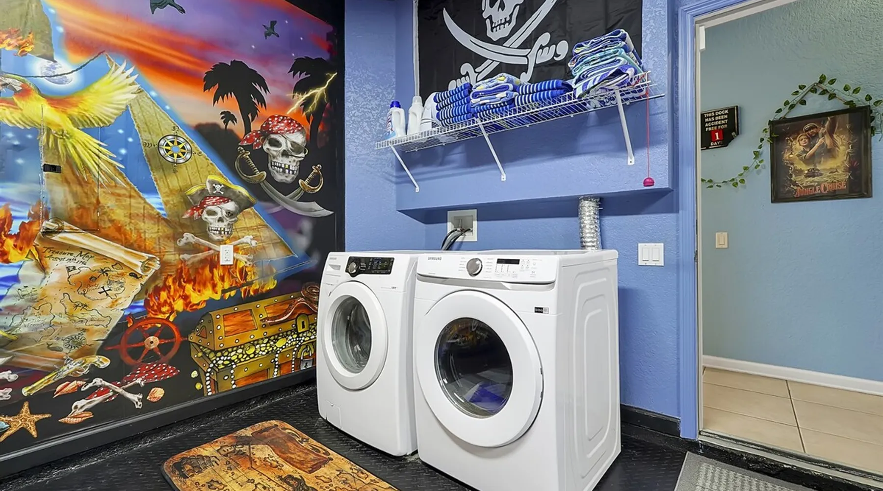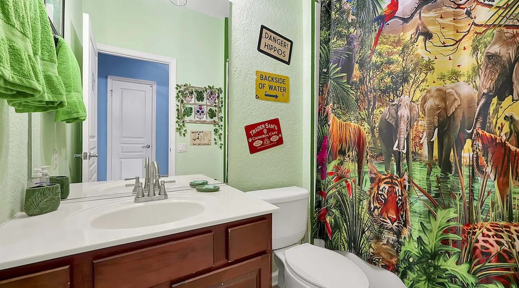 Lilo’s Paradise is a great place for large families who want to enjoy the ultimate convenience and relaxation. With a private pool, comfy themed bedrooms, a fun game room, a full kitchen, and many amenities that come with the gated community, there’s something for the whole family! Plus, you’ll be just a short drive from famous attractions. Disney World - 9 min drive Old Town - 14 min drive Fun Spot America - 15 min drive Create Lasting Memories In Kissimmee With Us & Learn More Below! The space ☆☆ HIGHLIGHTS ☆☆ ✹ 5 themed bedrooms; 3 kings, 1 bunk bed, 2 twins ✹ 5 full bathrooms ✹ Open floor plan ✹ Fully equipped kitchen w/ stainless appliances ✹ Coffee station ✹ Bright living room ✹ Family-friendly amenities ✹ Free wifi + flat-screen Smart TVs ✹ Pirates of the Caribbean themes Game room w/ mural, pool table, arcade game, PS4, Xbox One, and foosball. ✹ Washer + dryer ✹ Expansive outdoor patio (one of the largest pool decks in Windsor Hills) ✹ Private heated swimming pool + hot tub (complimentary heating) ✹ Sun loungers + outdoor TV ✹ Outdoor dining tables + BBQ (complimentary propane) ✹ Free parking for 3 vehicles at the home. ✹ Free access to Windsor Hills amenities including a waterpark, gym, pools + more! Eager to Read More? Here Are A Few Kind Words From Our Previous Guests: “Chuck and Deanna were very responsive and helpful. They met all of our needs. The home was super comfy with lots and lots of cooking stuff. The sun deck was amazing, the pool was incredible, outdoor entertainment was excellent! I love the keepsake the most!! We'll be back soon!” - Latoyor (Other listing) “Chuck and Deanna are great hosts! They are very friendly and try to help with everything you need. The house is very clean and very good equipped. The best part of the house is the big deck with the pool. The pool was heated and my kids spent all day playing in the pool. Thank you Deanna to make our vacation wonderful! :)” - Mihaela “Hands down some of the best hosts I have ever rented from. The communication from Chuck and Deanna has been second to none. The house was well stocked and was the perfect place for our dance team to stay while in town for the Dance Worlds.” - Sheila (Other listing) ★★ BEDROOMS ★★ This private oasis features five thoughtfully designed and welcoming bedrooms, each with a fun theme and comfy beds topped with plush mattresses and high-end linens. No matter which room you’re in, you’ll have a ceiling fan, a TV with cable and a Roku, and easy access to a full bathroom. ✹ Primary bedroom (Vintage Disney theme): King-sized bed, ensuite bathroom ✹ Second bedroom (Jungle Cruise theme): Custom-built bunk beds sleep 3 guests in twin beds (two “top” bunks, one “low” bunk, fun mural ✹ Third bedroom (Under The Sea theme): King-sized bed, ensuite bathroom, walk-in shower, water closet ✹ Fourth bedroom (Tiki Theme): King-sized bed ✹ Fifth bedroom (Moana Theme): 2 twin beds ★★ BATHROOMS ★★ Lilo’s Paradise boasts five full bathrooms, providing ample space for the whole family to get ready for an exciting day at a theme park. Each bathroom is stocked with fresh towels and has plenty of storage space to unpack all your toiletries. ✹ Bathroom 1: Ensuite to the primary bedroom, dual vanity, walk-in shower, water closet ✹ Bathroom 2: Jungle-themed, single vanity, shower/tub combination ✹ Bathroom 3: Ensuite to the Under The Sea room, single vanity, walk-in shower, water closet ✹ Bathroom 4: Tiki theme, single vanity, shower/tub combination ✹ Bathroom 5: Moana theme single vanity, shower/tub combination ✔ Fresh towels ✔ Hair dryer ✔ Washer and dryer ✔ Iron ★★ KITCHEN & DINING ★★ Make delicious meals in the kitchen when you’re not trying some of the nearby restaurants. You’ll love the stainless steel appliances, granite countertops, and open-concept layout, making it easy to keep the conversation flowing between the lounge space and kitchen. A variety of basic kitchen supplies are provided to start you off, including spices, coffee, tea, coffee filters, salt and pepper, napkins, and cleaning supplies. When you’re ready to eat, you’ll find various areas to eat, including at the kitchen counter, at the small bistro table, around the formal dining table, or at the outdoor dining table. ✔ Stainless steel appliances and granite counters ✔ Full-size fridge and freezer ✔ Dishwasher, oven, stove, microwave ✔ Coffee station with coffee, tea, and coffee filters ✔ Basic spices, salt, and pepper ✔ Kitchen counter with seating for 2 ✔ Small dinette for 4 ✔ Dining table for 6 ★★ LIVING ROOM ★★ The charming living room is the perfect place to enjoy a small break from the Florida sun. Sit back on the sofa and watch your favorite movie on the Smart TV, enjoy some games or chit-chat with your companions, or catch up with friends back home using the free wifi. ✔ Plush sofa, loveseat, and chair ✔ 65” smart TV ✔ Free wifi ✔ High ceilings and huge windows ✔ Patio access ★★ GAME ROOM ★★ Enjoy some friendly competition in the Super Hero themed game room. This converted garage features a pool table, game consoles, a 3-TV gaming station, and an arcade game to keep your group entertained for hours on end. This is a perfect spot to keep the kids busy while the adults enjoy some grown-up time. ✔ Pool table ✔ 3-TV game station with Xbox One and PS4 ✔ Multi-game arcade game ✔ Wooden train table ★★ OUTDOOR SPACE ★★ Step out onto the expansive patio and enjoy outdoor living at its finest. The patio has been extended 17 feet behind the pool so you can enjoy even more of this private oasis without being bothered by bugs. A bonus of this outdoor area is the impressive view of the Magic Kingdom fireworks at night (when they’re running). Spend days in the pool and basking in the sunshine on the southern-facing deck, and evenings in the hot tub after enj