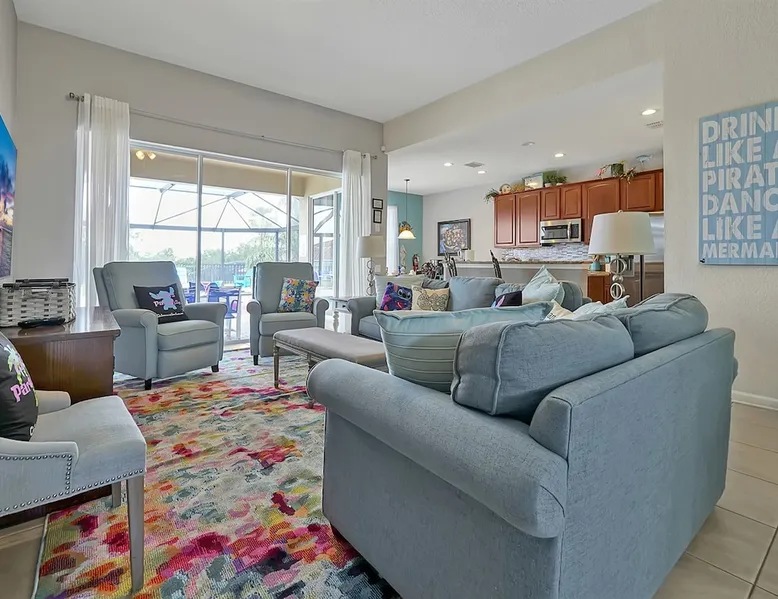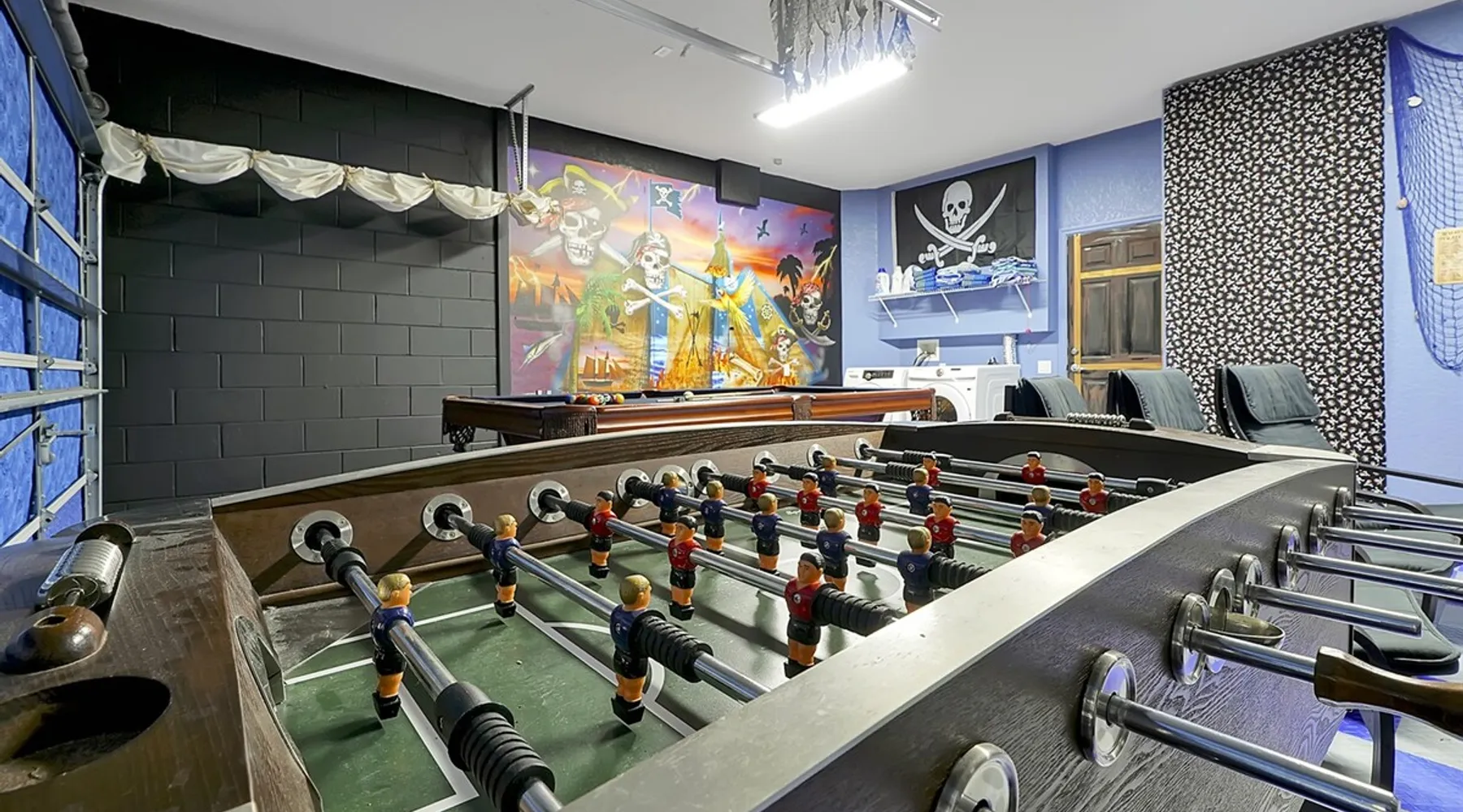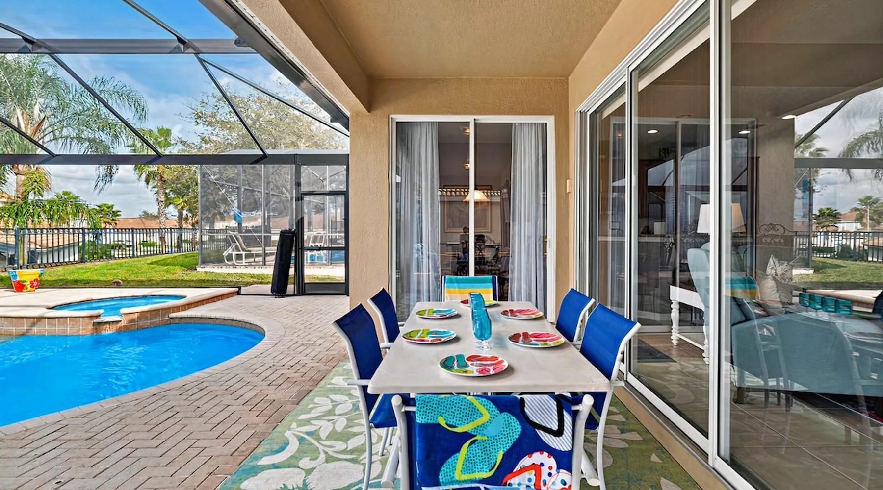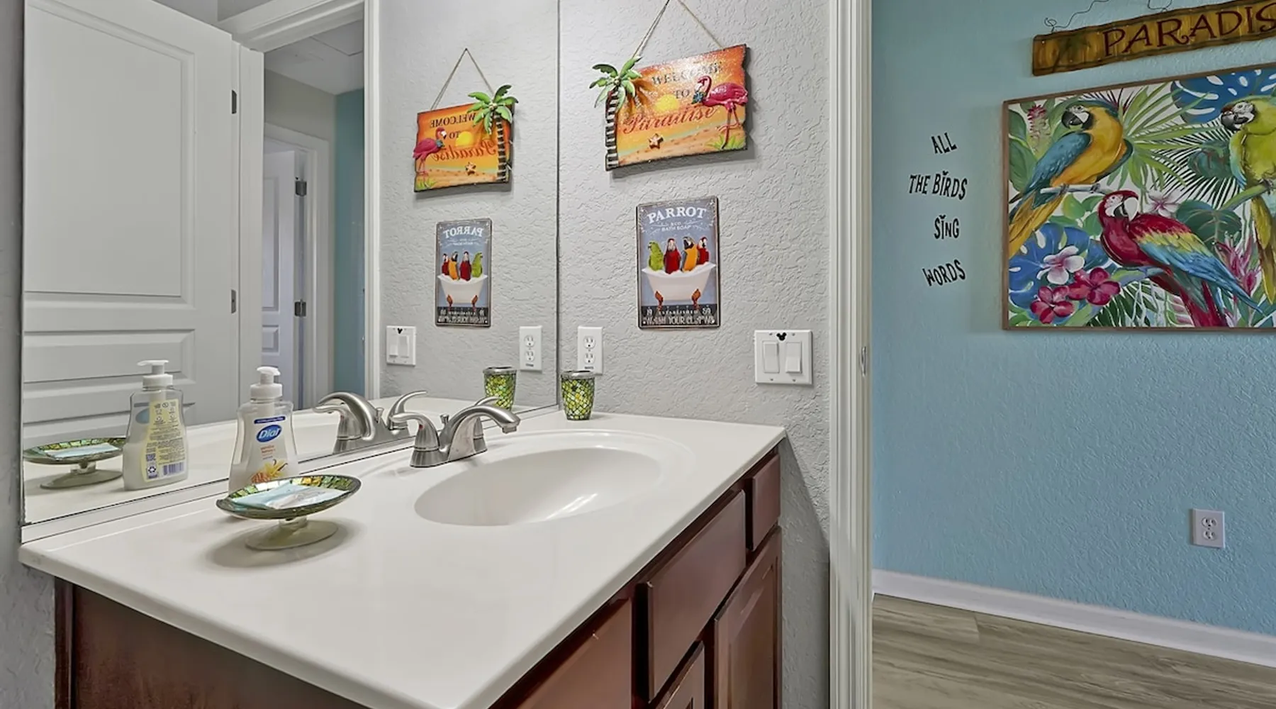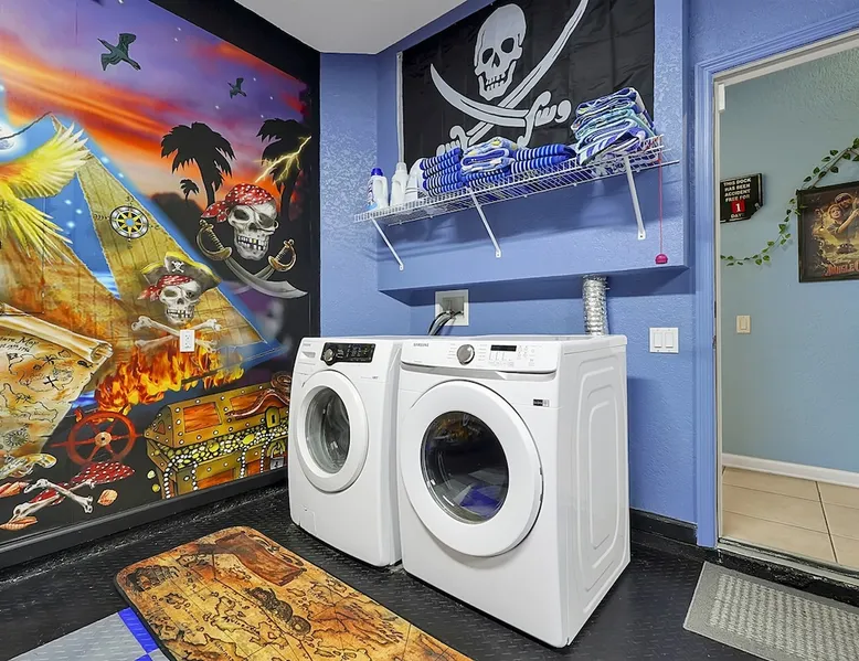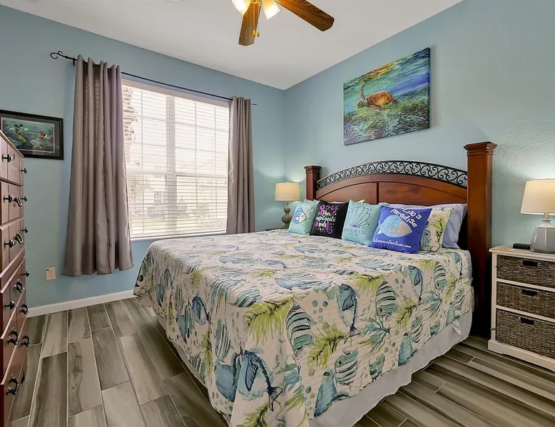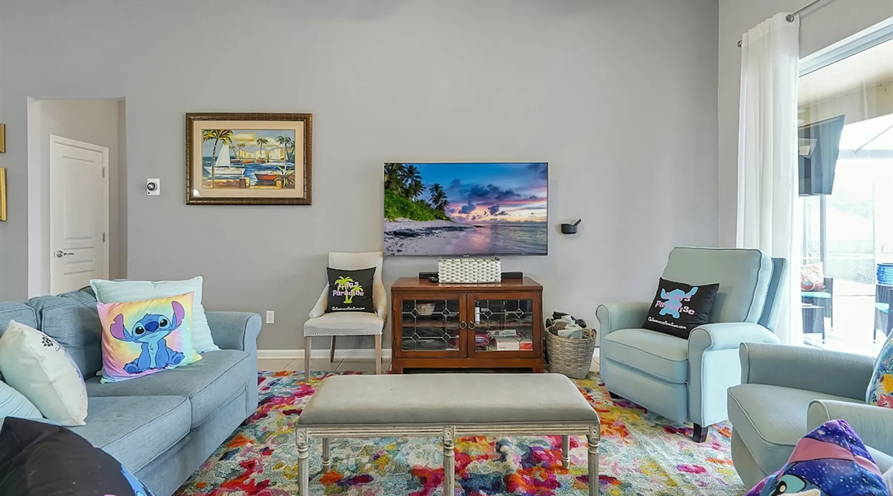 Lilo’s Paradise is a great place for large families who want to enjoy the ultimate convenience and relaxation. With a private pool, comfy themed bedrooms, a fun game room, a full kitchen, and many amenities that come with the gated community, there’s something for the whole family! Plus, you’ll be just a short drive from famous attractions. Disney World - 9 min drive Old Town - 14 min drive Fun Spot America - 15 min drive Create Lasting Memories In Kissimmee With Us & Learn More Below! The space ☆☆ HIGHLIGHTS ☆☆ ✹ 5 themed bedrooms; 3 kings, 1 bunk bed, 2 twins ✹ 5 full bathrooms ✹ Open floor plan ✹ Fully equipped kitchen w/ stainless appliances ✹ Coffee station ✹ Bright living room ✹ Family-friendly amenities ✹ Free wifi + flat-screen Smart TVs ✹ Pirates of the Caribbean themes Game room w/ mural, pool table, arcade game, PS4, Xbox One, and foosball. ✹ Washer + dryer ✹ Expansive outdoor patio (one of the largest pool decks in Windsor Hills) ✹ Private heated swimming pool + hot tub (complimentary heating) ✹ Sun loungers + outdoor TV ✹ Outdoor dining tables + BBQ (complimentary propane) ✹ Free parking for 3 vehicles at the home. ✹ Free access to Windsor Hills amenities including a waterpark, gym, pools + more! Eager to Read More? Here Are A Few Kind Words From Our Previous Guests: “Chuck and Deanna were very responsive and helpful. They met all of our needs. The home was super comfy with lots and lots of cooking stuff. The sun deck was amazing, the pool was incredible, outdoor entertainment was excellent! I love the keepsake the most!! We'll be back soon!” - Latoyor (Other listing) “Chuck and Deanna are great hosts! They are very friendly and try to help with everything you need. The house is very clean and very good equipped. The best part of the house is the big deck with the pool. The pool was heated and my kids spent all day playing in the pool. Thank you Deanna to make our vacation wonderful! :)” - Mihaela “Hands down some of the best hosts I have ever rented from. The communication from Chuck and Deanna has been second to none. The house was well stocked and was the perfect place for our dance team to stay while in town for the Dance Worlds.” - Sheila (Other listing) ★★ BEDROOMS ★★ This private oasis features five thoughtfully designed and welcoming bedrooms, each with a fun theme and comfy beds topped with plush mattresses and high-end linens. No matter which room you’re in, you’ll have a ceiling fan, a TV with cable and a Roku, and easy access to a full bathroom. ✹ Primary bedroom (Vintage Disney theme): King-sized bed, ensuite bathroom ✹ Second bedroom (Jungle Cruise theme): Custom-built bunk beds sleep 3 guests in twin beds (two “top” bunks, one “low” bunk, fun mural ✹ Third bedroom (Under The Sea theme): King-sized bed, ensuite bathroom, walk-in shower, water closet ✹ Fourth bedroom (Tiki Theme): King-sized bed ✹ Fifth bedroom (Moana Theme): 2 twin beds ★★ BATHROOMS ★★ Lilo’s Paradise boasts five full bathrooms, providing ample space for the whole family to get ready for an exciting day at a theme park. Each bathroom is stocked with fresh towels and has plenty of storage space to unpack all your toiletries. ✹ Bathroom 1: Ensuite to the primary bedroom, dual vanity, walk-in shower, water closet ✹ Bathroom 2: Jungle-themed, single vanity, shower/tub combination ✹ Bathroom 3: Ensuite to the Under The Sea room, single vanity, walk-in shower, water closet ✹ Bathroom 4: Tiki theme, single vanity, shower/tub combination ✹ Bathroom 5: Moana theme single vanity, shower/tub combination ✔ Fresh towels ✔ Hair dryer ✔ Washer and dryer ✔ Iron ★★ KITCHEN & DINING ★★ Make delicious meals in the kitchen when you’re not trying some of the nearby restaurants. You’ll love the stainless steel appliances, granite countertops, and open-concept layout, making it easy to keep the conversation flowing between the lounge space and kitchen. A variety of basic kitchen supplies are provided to start you off, including spices, coffee, tea, coffee filters, salt and pepper, napkins, and cleaning supplies. When you’re ready to eat, you’ll find various areas to eat, including at the kitchen counter, at the small bistro table, around the formal dining table, or at the outdoor dining table. ✔ Stainless steel appliances and granite counters ✔ Full-size fridge and freezer ✔ Dishwasher, oven, stove, microwave ✔ Coffee station with coffee, tea, and coffee filters ✔ Basic spices, salt, and pepper ✔ Kitchen counter with seating for 2 ✔ Small dinette for 4 ✔ Dining table for 6 ★★ LIVING ROOM ★★ The charming living room is the perfect place to enjoy a small break from the Florida sun. Sit back on the sofa and watch your favorite movie on the Smart TV, enjoy some games or chit-chat with your companions, or catch up with friends back home using the free wifi. ✔ Plush sofa, loveseat, and chair ✔ 65” smart TV ✔ Free wifi ✔ High ceilings and huge windows ✔ Patio access ★★ GAME ROOM ★★ Enjoy some friendly competition in the Super Hero themed game room. This converted garage features a pool table, game consoles, a 3-TV gaming station, and an arcade game to keep your group entertained for hours on end. This is a perfect spot to keep the kids busy while the adults enjoy some grown-up time. ✔ Pool table ✔ 3-TV game station with Xbox One and PS4 ✔ Multi-game arcade game ✔ Wooden train table ★★ OUTDOOR SPACE ★★ Step out onto the expansive patio and enjoy outdoor living at its finest. The patio has been extended 17 feet behind the pool so you can enjoy even more of this private oasis without being bothered by bugs. A bonus of this outdoor area is the impressive view of the Magic Kingdom fireworks at night (when they’re running). Spend days in the pool and basking in the sunshine on the southern-facing deck, and evenings in the hot tub after enj