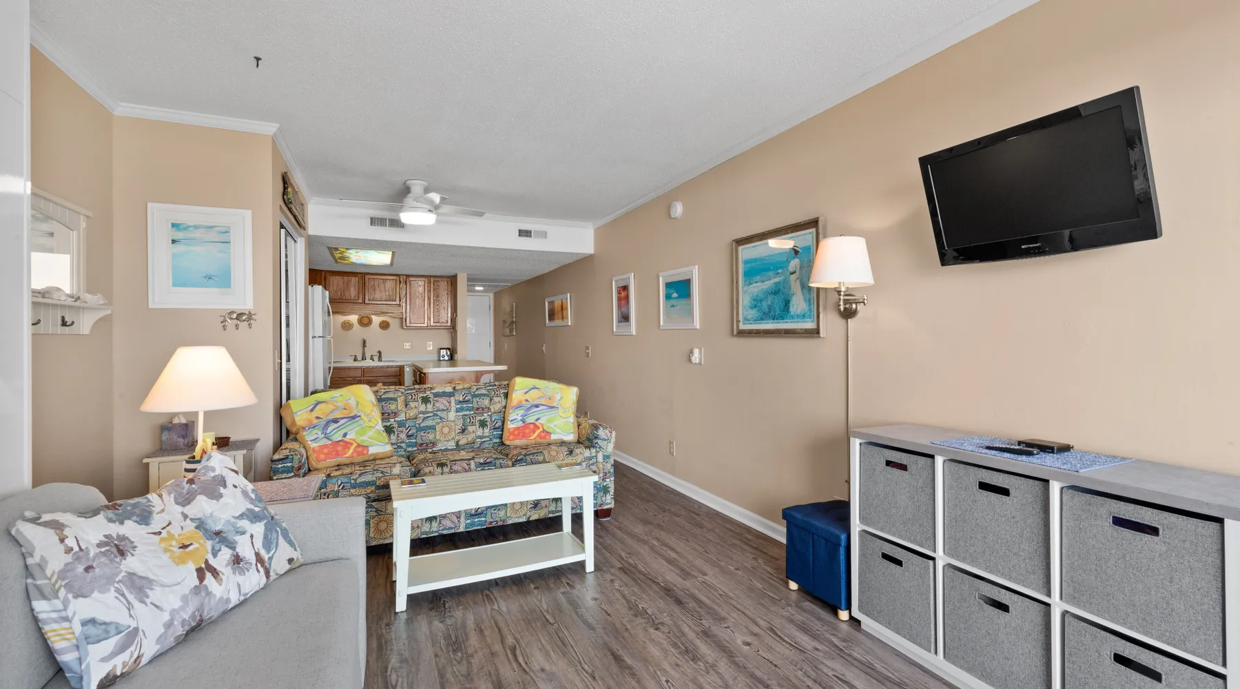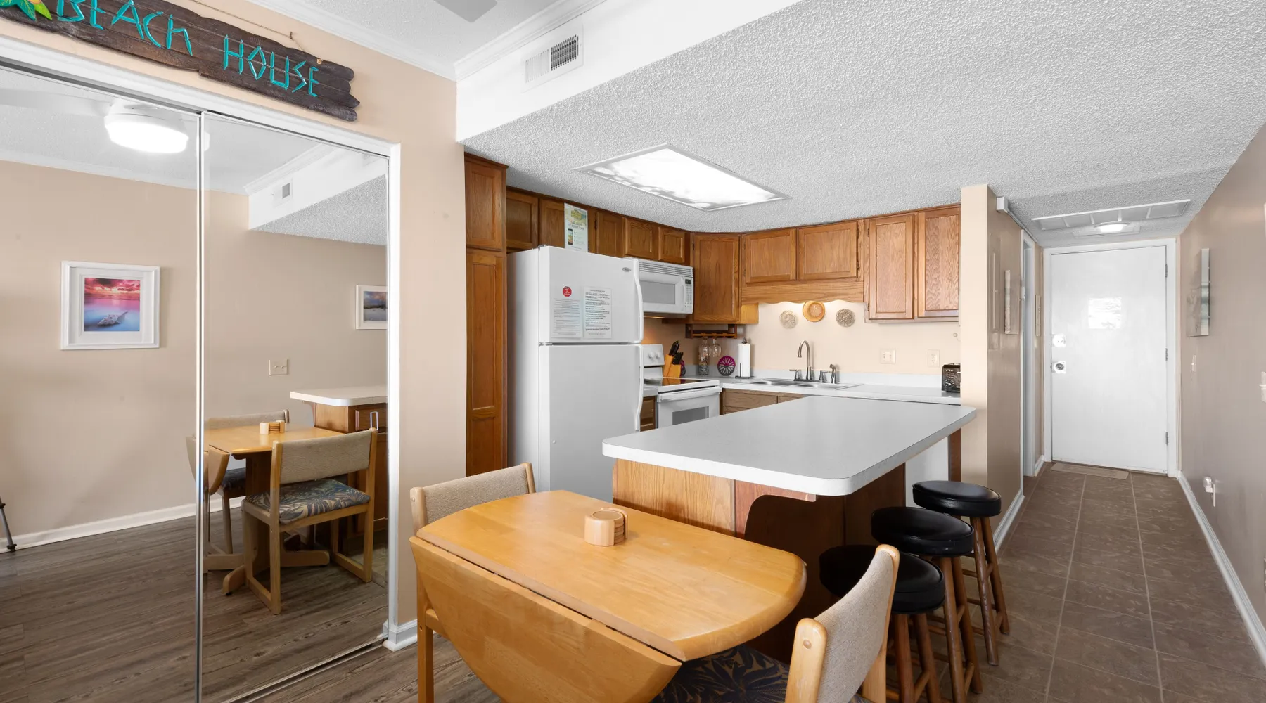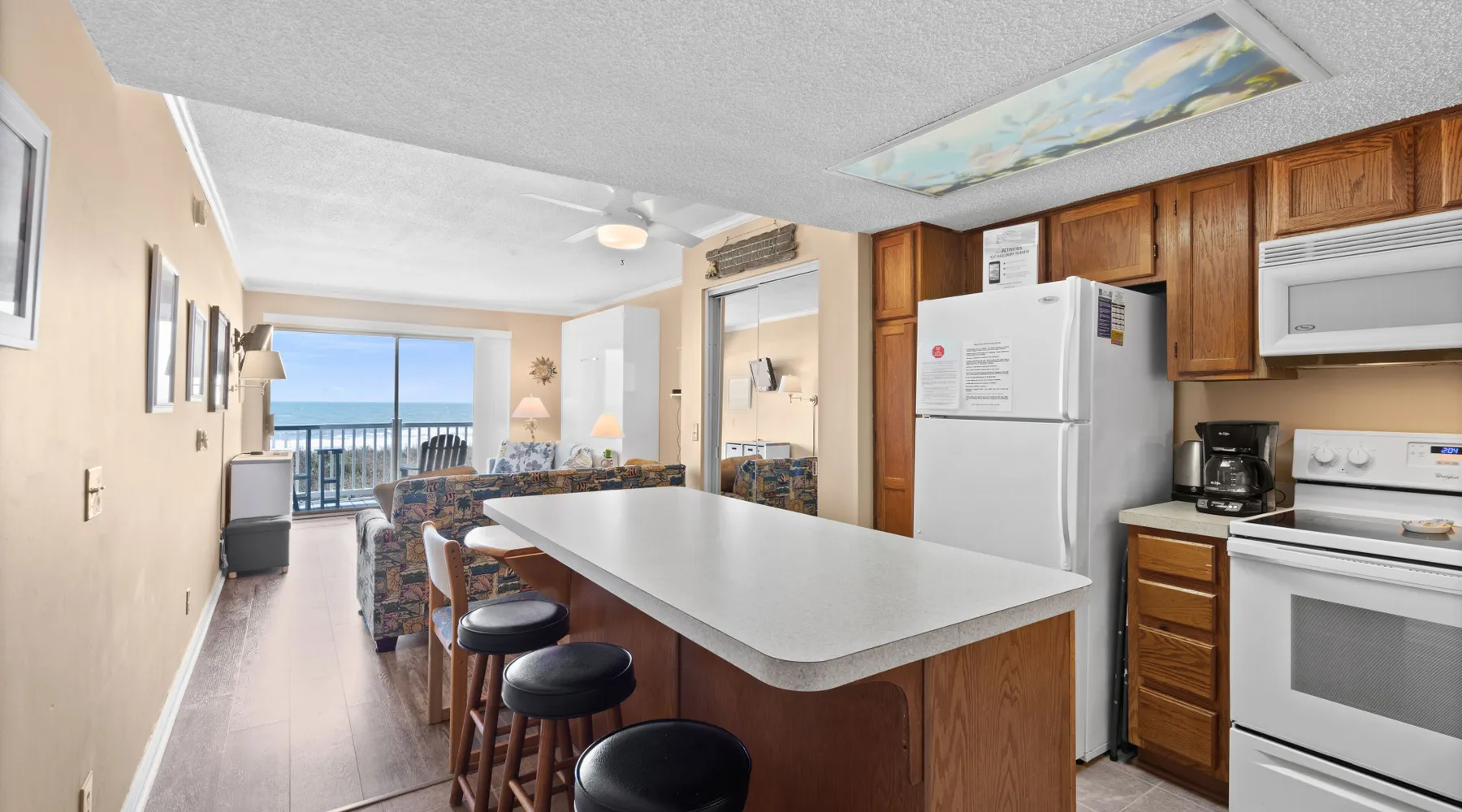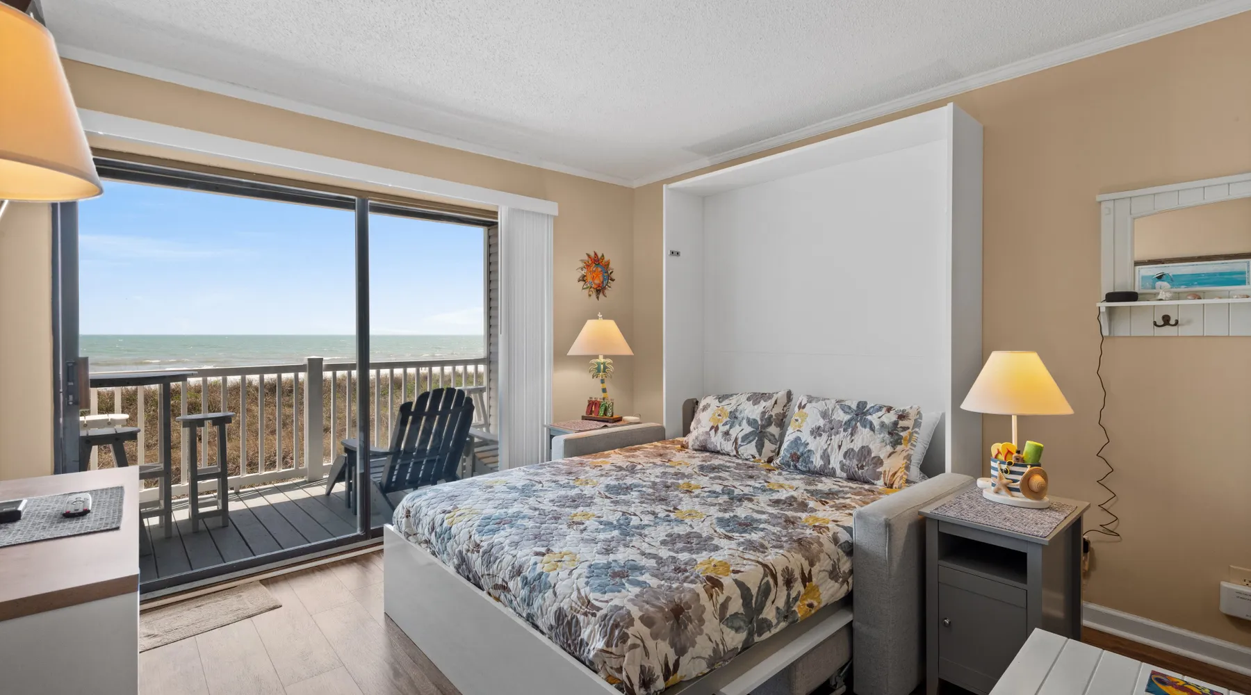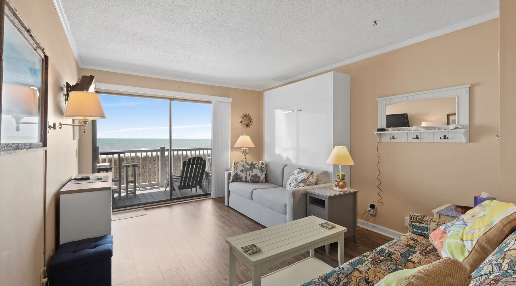 This cute studio/1 Bath unit is perfect for a small family up to 4 with a Queen Murphy Bed and a Queen Sleeper Sofa both in the living room. This 2nd floor walk up has everything you need to enjoy the beach with a large ocean front balcony, a fully equipped kitchen, smart TV, and Washer/Dryer all for your convenience. Located in the Windy Hill Section of North Myrtle Beach, Nautical Watch is convenient to all the popular Restaurants, Shopping and Family Entertainment for your family to enjoy. The on-site amenities include a street side outdoor pool, 2 sundecks, outdoor shower, grill facilities, on-site parking and free wifi! There is NO elevator at this property. Free Fun Included Every Day! To enhance your vacation experience, North Beach Vacations has partnered with Xplorie, which means your stay includes over $250.00 in complimentary activities, per day. Just for booking with us, you’ll receive free tickets, every day of your stay to top activities like golfing, water parks, dinner shows, and more!!! NO MOTORCYCLES, BOATS, RV'S, GOLF CARTS OR TRAILERS ALLOWED ONSITE! WE DO OFFER FREE PARKING AT OUR LOCAL RENTAL OFFICE IF YOU PLAN TO BRING A MOTORCYCLES, BOAT, RV, GOLF CART, TRAILER AND/OR EXCEED THE NUMBER OF VEHICLES PERMITTED PER UNIT. PARK AT YOUR OWN RISK. NO SMOKING IN UNIT OR ON BALCONY! NO PETS! 25 YEAR AGE REQUIRMENT! FOR ALL NON-FAMILY GROUPS, EVERYONE MUST MEET THIS AGE REQUIRMENT AT THE TIME OF CHECK-IN!