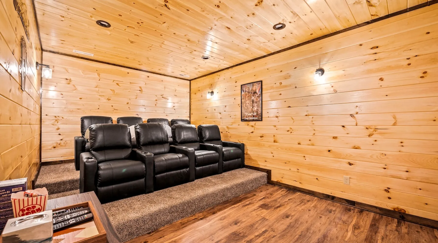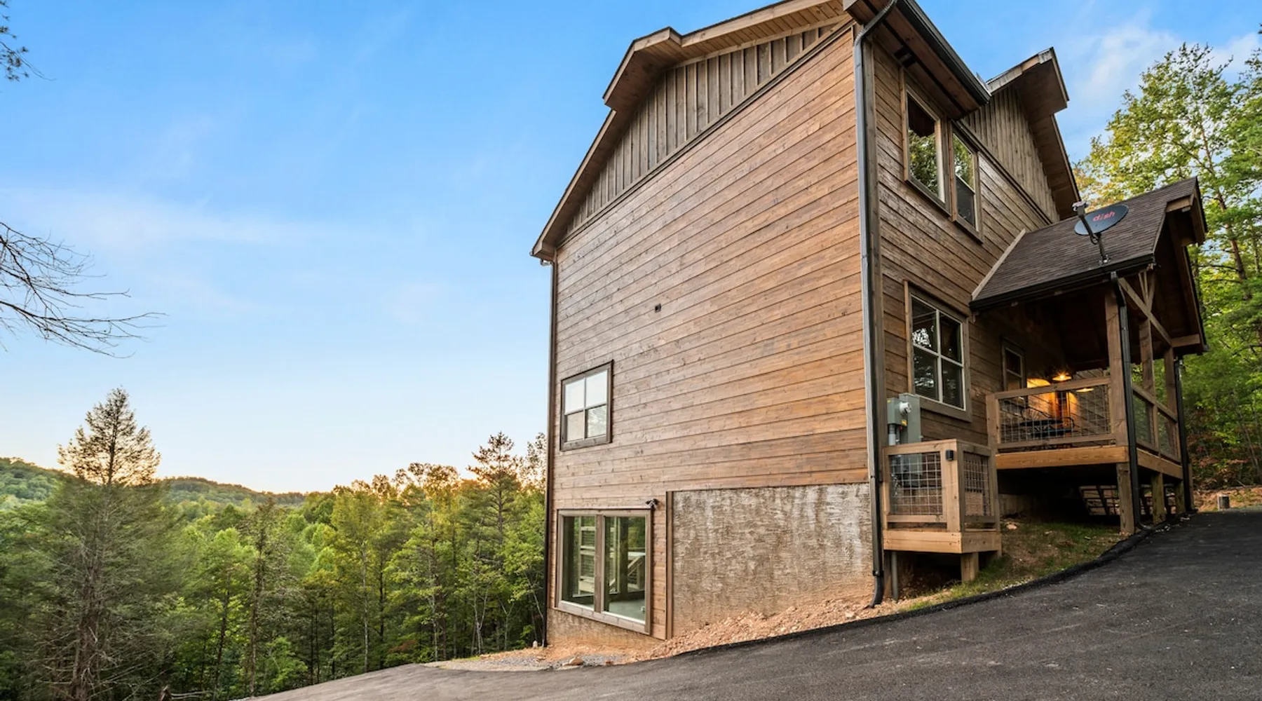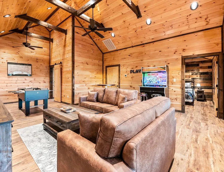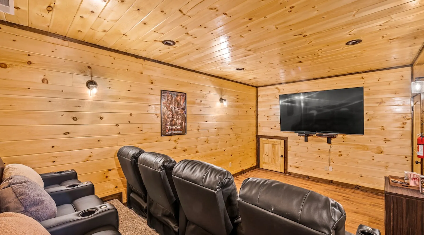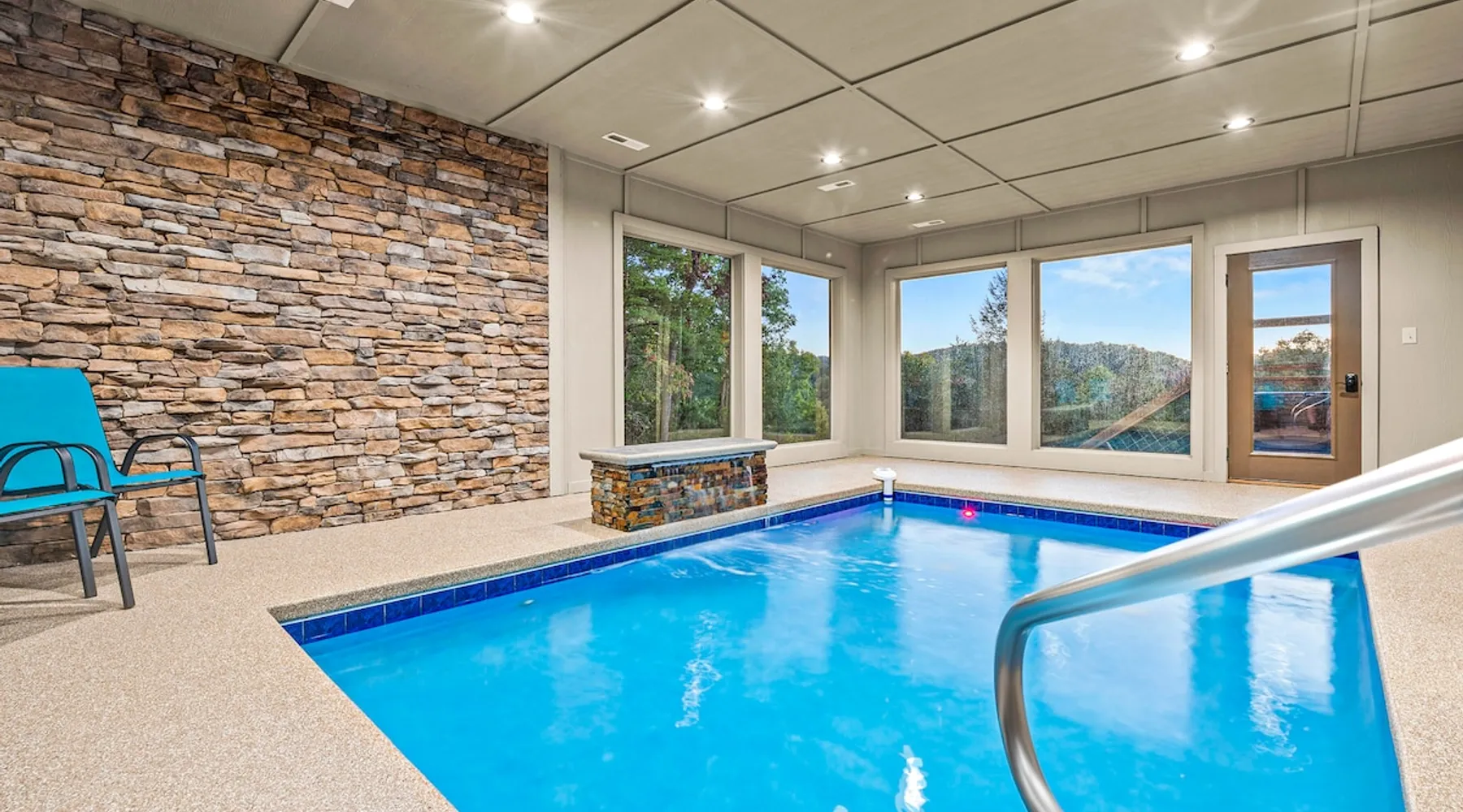 This spacious, five-bedroom pool cabin is your perfect Smoky Mountain vacation! Featuring 4 king bedrooms plus a bunk room, an amazing loft, a theatre room to watch the big game, views for miles on our three decks, and an indoor heated pool with a view of the Smokies. Minutes to Pigeon Forge and Dollywood, this cabin boosts Wi-Fi, Satellite TV, a game room, outdoor hot tub, and an outdoor fireplace to enjoy those beautiful TN sunsets. Easy access roads means anyone can reach this cabin! The space Features • 5 Bed/5.5 Bathroom Cabin - Sleeps 16 • Indoor Heated Pool • Foosball/2x Arcades/Game Room • Outdoor Hot Tub - Seats 4 • Satellite TV and High Speed Cellular Wi-Fi • Parking for up to 5 vehicles • 10 Minutes from Pigeon Forge/15 from Dollywood This spacious, five-bedroom pool cabin is your perfect Smoky Mountain vacation! Featuring 4 king bedrooms plus a bunk room, an amazing loft, a theatre room to watch the big game, views for miles on our three decks, and an indoor heated pool with a view of the Smokies. Minutes to Pigeon Forge and Dollywood, this cabin boosts Wi-Fi, Satellite TV, arcade cabinet, hot tub, and an outdoor fireplace to enjoy those beautiful TN sunsets. Easy access roads means anyone can reach this cabin! Host your next vacation or holiday gathering at Overlook Swim Lodge, a gorgeous three-story Tennessee cabin, complete with an indoor heated pool, game room, theatre, and a private outdoor hot tub. Take a short drive over to Pigeon Forge, the home of Dollywood and so many other fun-filled attractions, shops, and excellent restaurants! Overlook Swim Lodge is a custom designed cabin that is positively aglow with rich, knotty pine walls, 3 different level decks, and two beautiful fireplaces with all the desirable modern conveniences of home. Overlook Swim Lodge has amble parking to fit 5 vehicles. The open living area has a plush leather sofa (with pull-out queen), twin matching chairs, and a stone-face electric fireplace. The open concept kitchen has cabinets and drawers stocked with essential cookware and dinnerware, and a full array of appliances including a dishwasher and Keurig. Augment those home-cooked meals with the gas grill located outside on the well-appointed deck. Close by, there's a dining table with seating for twelve and a breakfast bar with seating for four. The main floor also includes two bedrooms which both offer a cozy king-size bed and a large en suite bathroom. Upstairs there are three additional bedrooms, two kings and a bunk room all with their own en suite bathrooms. The bunk room is great for children or young adults with four twin mattress and its own attached bathroom with double vanities and shower. With five bedrooms, a furnished loft with a pull-out sofa (queen), and an additional sleeper sofa on the main level, this home sleeps up to 16 guests very comfortably. While upstairs you can enjoy the full use of our game room featuring a large TV and sitting area, foosball, 2x 2-player premium arcade system with over 18,000 titles, and rustic pub table. Step outside onto the deck for gorgeous views of the smokies while sitting next to an electric outdoor fireplace. Custom built for our cabin you can enjoy that glass of wine/whiskey while the fireplace keeps you warm on those cool fall and spring nights. Thanks to the complimentary cellular Wi-Fi, you can easily stream your favorite shows and share photos and videos of your vacation with friends and family back home. Check on the local news and weather or keep up with all your favorite shows on multiple TVs with satellite service. Heading downstairs you will find the huge theatre room with seating for eight. Featuring satellite TV, Blue Ray/DVD player and an 85-inch HD TV, this room is perfect for the latest blockbuster or watching the game with family and friends. Just off the theatre you will find our indoor heated pool. Relax and have a good time while you view those smoky mountains right from the pool! As you head towards the deck you will see our full washer/dryer that is available for your use as well as a half bathroom. Outside on the deck you will find a five-seater hot tub just waiting for you to relax with those jets after a long day of adventure. No visit to the area would be complete without a trip to nearby Dollywood or Pigeon Forge. The cabin is just 10 minutes from Pigeon Forge and 20 minutes from Gatlinburg. Conveniently close to a main road with no windy or steep mountains to climb. No matter the season, make your reservation today and get ready to make a splash and enjoy the beauty of the Great Smoky Mountain National Park at this brand-new pool cabin! Guest access You will have the entire cabin to yourself! Other things to note Indoor Heated Pool: Our pool is kept at a moderate 82 degrees year round. We have a separate locked door between the pool room and the cabin to make sure those without access are not in the pool room unsupervised. Weather Related: The weather in Tennessee can be unpredictable. We appreciate if all guest be aware of any weather impacts to their stay. We are not responsible for maintaining the conditions of roads, decks, and driveways in the event of snow, ice, rain, etc.