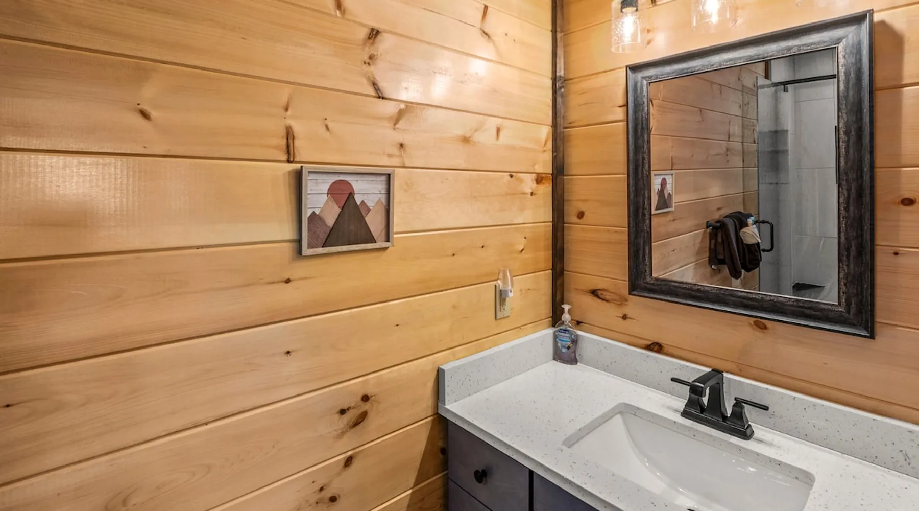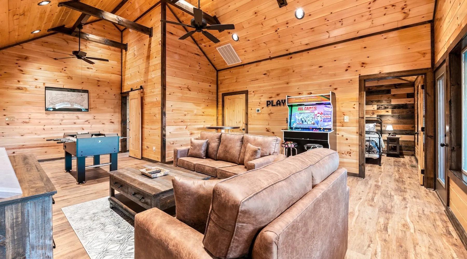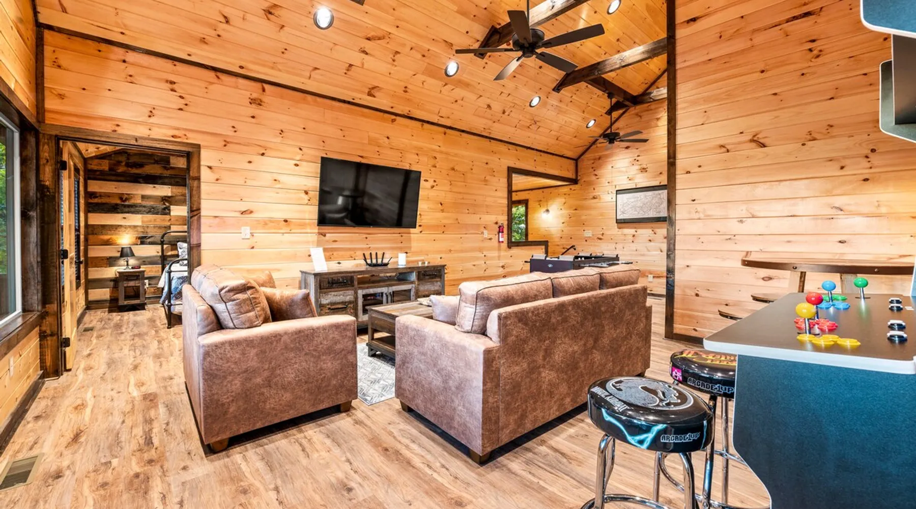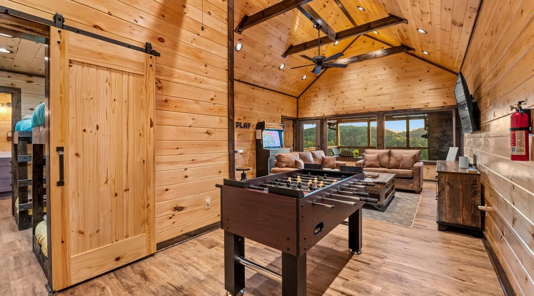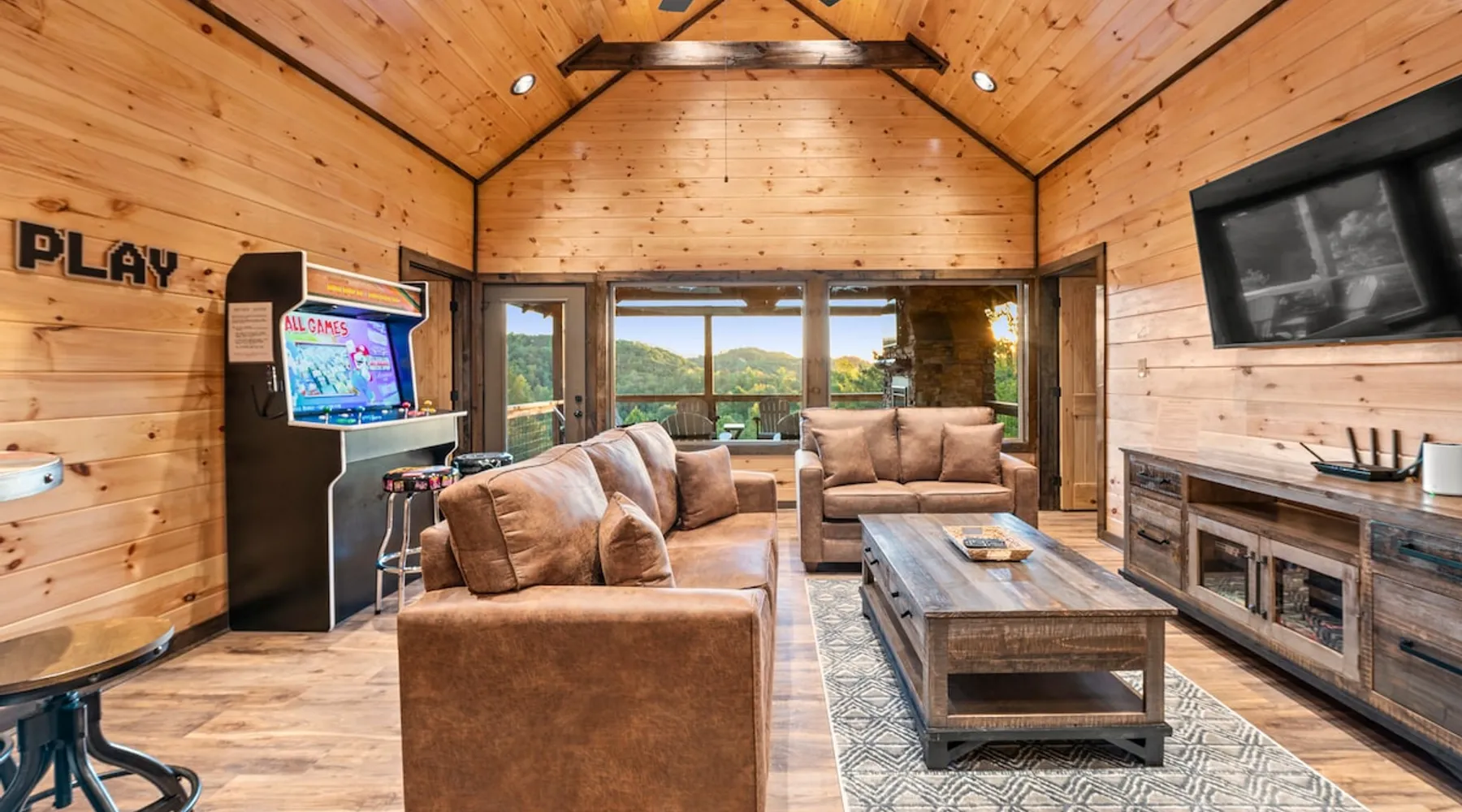 This spacious, five-bedroom pool cabin is your perfect Smoky Mountain vacation! Featuring 4 king bedrooms plus a bunk room, an amazing loft, a theatre room to watch the big game, views for miles on our three decks, and an indoor heated pool with a view of the Smokies. Minutes to Pigeon Forge and Dollywood, this cabin boosts Wi-Fi, Satellite TV, a game room, outdoor hot tub, and an outdoor fireplace to enjoy those beautiful TN sunsets. Easy access roads means anyone can reach this cabin! The space Features • 5 Bed/5.5 Bathroom Cabin - Sleeps 16 • Indoor Heated Pool • Foosball/2x Arcades/Game Room • Outdoor Hot Tub - Seats 4 • Satellite TV and High Speed Cellular Wi-Fi • Parking for up to 5 vehicles • 10 Minutes from Pigeon Forge/15 from Dollywood This spacious, five-bedroom pool cabin is your perfect Smoky Mountain vacation! Featuring 4 king bedrooms plus a bunk room, an amazing loft, a theatre room to watch the big game, views for miles on our three decks, and an indoor heated pool with a view of the Smokies. Minutes to Pigeon Forge and Dollywood, this cabin boosts Wi-Fi, Satellite TV, arcade cabinet, hot tub, and an outdoor fireplace to enjoy those beautiful TN sunsets. Easy access roads means anyone can reach this cabin! Host your next vacation or holiday gathering at Overlook Swim Lodge, a gorgeous three-story Tennessee cabin, complete with an indoor heated pool, game room, theatre, and a private outdoor hot tub. Take a short drive over to Pigeon Forge, the home of Dollywood and so many other fun-filled attractions, shops, and excellent restaurants! Overlook Swim Lodge is a custom designed cabin that is positively aglow with rich, knotty pine walls, 3 different level decks, and two beautiful fireplaces with all the desirable modern conveniences of home. Overlook Swim Lodge has amble parking to fit 5 vehicles. The open living area has a plush leather sofa (with pull-out queen), twin matching chairs, and a stone-face electric fireplace. The open concept kitchen has cabinets and drawers stocked with essential cookware and dinnerware, and a full array of appliances including a dishwasher and Keurig. Augment those home-cooked meals with the gas grill located outside on the well-appointed deck. Close by, there's a dining table with seating for twelve and a breakfast bar with seating for four. The main floor also includes two bedrooms which both offer a cozy king-size bed and a large en suite bathroom. Upstairs there are three additional bedrooms, two kings and a bunk room all with their own en suite bathrooms. The bunk room is great for children or young adults with four twin mattress and its own attached bathroom with double vanities and shower. With five bedrooms, a furnished loft with a pull-out sofa (queen), and an additional sleeper sofa on the main level, this home sleeps up to 16 guests very comfortably. While upstairs you can enjoy the full use of our game room featuring a large TV and sitting area, foosball, 2x 2-player premium arcade system with over 18,000 titles, and rustic pub table. Step outside onto the deck for gorgeous views of the smokies while sitting next to an electric outdoor fireplace. Custom built for our cabin you can enjoy that glass of wine/whiskey while the fireplace keeps you warm on those cool fall and spring nights. Thanks to the complimentary cellular Wi-Fi, you can easily stream your favorite shows and share photos and videos of your vacation with friends and family back home. Check on the local news and weather or keep up with all your favorite shows on multiple TVs with satellite service. Heading downstairs you will find the huge theatre room with seating for eight. Featuring satellite TV, Blue Ray/DVD player and an 85-inch HD TV, this room is perfect for the latest blockbuster or watching the game with family and friends. Just off the theatre you will find our indoor heated pool. Relax and have a good time while you view those smoky mountains right from the pool! As you head towards the deck you will see our full washer/dryer that is available for your use as well as a half bathroom. Outside on the deck you will find a five-seater hot tub just waiting for you to relax with those jets after a long day of adventure. No visit to the area would be complete without a trip to nearby Dollywood or Pigeon Forge. The cabin is just 10 minutes from Pigeon Forge and 20 minutes from Gatlinburg. Conveniently close to a main road with no windy or steep mountains to climb. No matter the season, make your reservation today and get ready to make a splash and enjoy the beauty of the Great Smoky Mountain National Park at this brand-new pool cabin! Guest access You will have the entire cabin to yourself! Other things to note Indoor Heated Pool: Our pool is kept at a moderate 82 degrees year round. We have a separate locked door between the pool room and the cabin to make sure those without access are not in the pool room unsupervised. Weather Related: The weather in Tennessee can be unpredictable. We appreciate if all guest be aware of any weather impacts to their stay. We are not responsible for maintaining the conditions of roads, decks, and driveways in the event of snow, ice, rain, etc.
