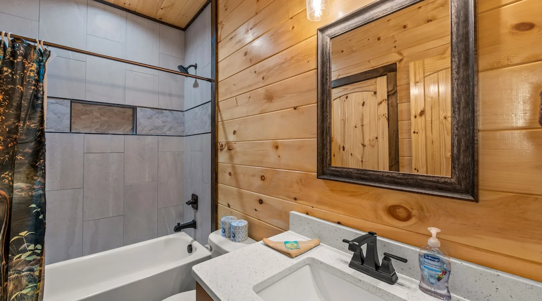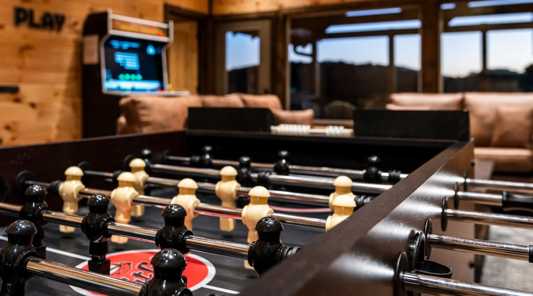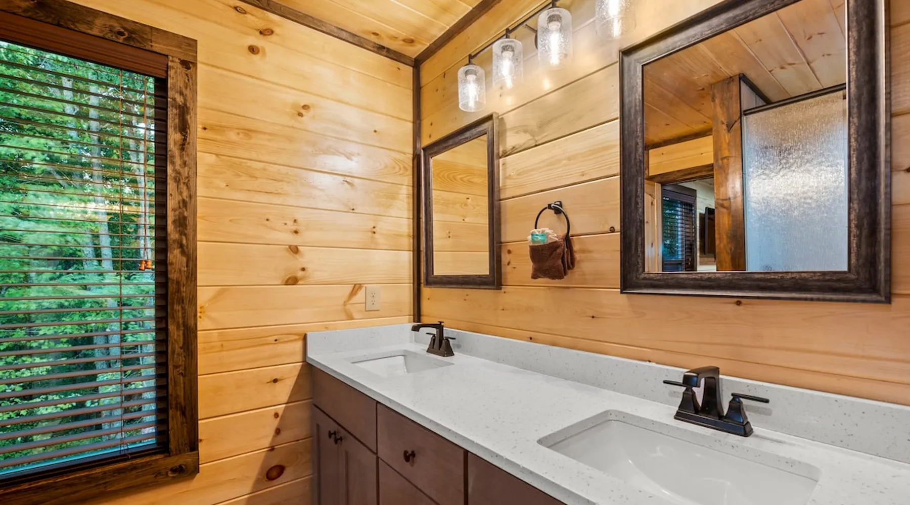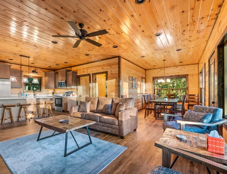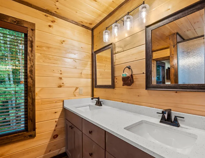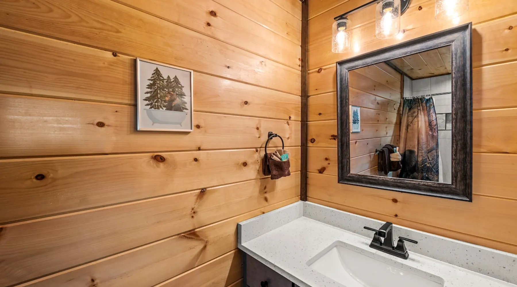 This spacious, five-bedroom pool cabin is your perfect Smoky Mountain vacation! Featuring 4 king bedrooms plus a bunk room, an amazing loft, a theatre room to watch the big game, views for miles on our three decks, and an indoor heated pool with a view of the Smokies. Minutes to Pigeon Forge and Dollywood, this cabin boosts Wi-Fi, Satellite TV, a game room, outdoor hot tub, and an outdoor fireplace to enjoy those beautiful TN sunsets. Easy access roads means anyone can reach this cabin! The space Features • 5 Bed/5.5 Bathroom Cabin - Sleeps 16 • Indoor Heated Pool • Foosball/2x Arcades/Game Room • Outdoor Hot Tub - Seats 4 • Satellite TV and High Speed Cellular Wi-Fi • Parking for up to 5 vehicles • 10 Minutes from Pigeon Forge/15 from Dollywood This spacious, five-bedroom pool cabin is your perfect Smoky Mountain vacation! Featuring 4 king bedrooms plus a bunk room, an amazing loft, a theatre room to watch the big game, views for miles on our three decks, and an indoor heated pool with a view of the Smokies. Minutes to Pigeon Forge and Dollywood, this cabin boosts Wi-Fi, Satellite TV, arcade cabinet, hot tub, and an outdoor fireplace to enjoy those beautiful TN sunsets. Easy access roads means anyone can reach this cabin! Host your next vacation or holiday gathering at Overlook Swim Lodge, a gorgeous three-story Tennessee cabin, complete with an indoor heated pool, game room, theatre, and a private outdoor hot tub. Take a short drive over to Pigeon Forge, the home of Dollywood and so many other fun-filled attractions, shops, and excellent restaurants! Overlook Swim Lodge is a custom designed cabin that is positively aglow with rich, knotty pine walls, 3 different level decks, and two beautiful fireplaces with all the desirable modern conveniences of home. Overlook Swim Lodge has amble parking to fit 5 vehicles. The open living area has a plush leather sofa (with pull-out queen), twin matching chairs, and a stone-face electric fireplace. The open concept kitchen has cabinets and drawers stocked with essential cookware and dinnerware, and a full array of appliances including a dishwasher and Keurig. Augment those home-cooked meals with the gas grill located outside on the well-appointed deck. Close by, there's a dining table with seating for twelve and a breakfast bar with seating for four. The main floor also includes two bedrooms which both offer a cozy king-size bed and a large en suite bathroom. Upstairs there are three additional bedrooms, two kings and a bunk room all with their own en suite bathrooms. The bunk room is great for children or young adults with four twin mattress and its own attached bathroom with double vanities and shower. With five bedrooms, a furnished loft with a pull-out sofa (queen), and an additional sleeper sofa on the main level, this home sleeps up to 16 guests very comfortably. While upstairs you can enjoy the full use of our game room featuring a large TV and sitting area, foosball, 2x 2-player premium arcade system with over 18,000 titles, and rustic pub table. Step outside onto the deck for gorgeous views of the smokies while sitting next to an electric outdoor fireplace. Custom built for our cabin you can enjoy that glass of wine/whiskey while the fireplace keeps you warm on those cool fall and spring nights. Thanks to the complimentary cellular Wi-Fi, you can easily stream your favorite shows and share photos and videos of your vacation with friends and family back home. Check on the local news and weather or keep up with all your favorite shows on multiple TVs with satellite service. Heading downstairs you will find the huge theatre room with seating for eight. Featuring satellite TV, Blue Ray/DVD player and an 85-inch HD TV, this room is perfect for the latest blockbuster or watching the game with family and friends. Just off the theatre you will find our indoor heated pool. Relax and have a good time while you view those smoky mountains right from the pool! As you head towards the deck you will see our full washer/dryer that is available for your use as well as a half bathroom. Outside on the deck you will find a five-seater hot tub just waiting for you to relax with those jets after a long day of adventure. No visit to the area would be complete without a trip to nearby Dollywood or Pigeon Forge. The cabin is just 10 minutes from Pigeon Forge and 20 minutes from Gatlinburg. Conveniently close to a main road with no windy or steep mountains to climb. No matter the season, make your reservation today and get ready to make a splash and enjoy the beauty of the Great Smoky Mountain National Park at this brand-new pool cabin! Guest access You will have the entire cabin to yourself! Other things to note Indoor Heated Pool: Our pool is kept at a moderate 82 degrees year round. We have a separate locked door between the pool room and the cabin to make sure those without access are not in the pool room unsupervised. Weather Related: The weather in Tennessee can be unpredictable. We appreciate if all guest be aware of any weather impacts to their stay. We are not responsible for maintaining the conditions of roads, decks, and driveways in the event of snow, ice, rain, etc.