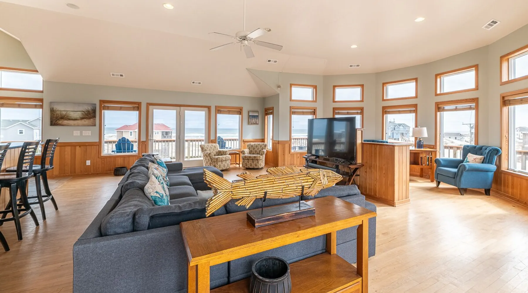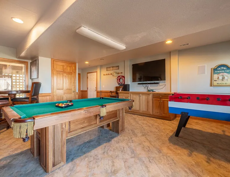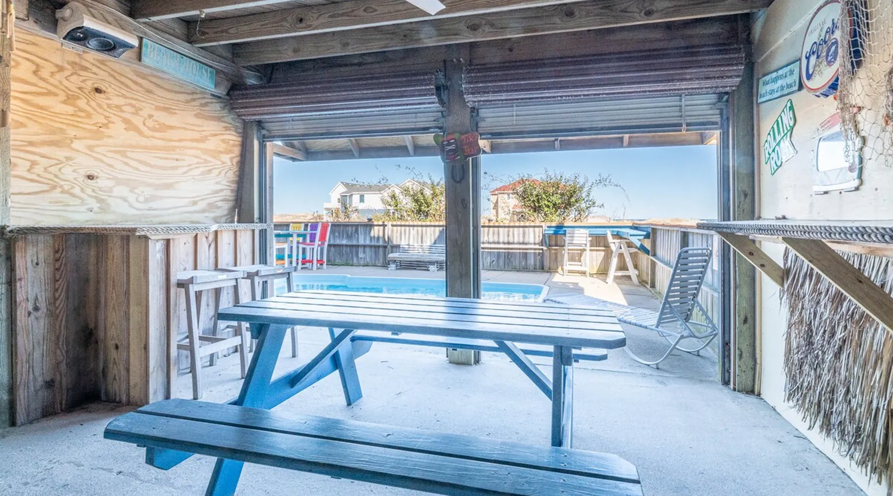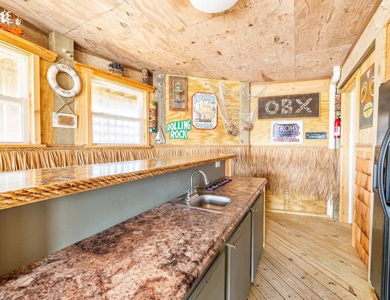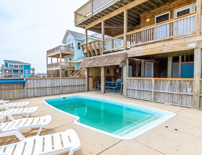 Beautiful semi-oceanfront 7 bedroom home sits atop a dune with spectacular ocean views. Spacious interior and lovely decor makes this the perfect getaway for rest and relaxation. Soak up the salty air while relaxing in the Adirondack chairs on one of the large decks. You may even see some of the famous Corolla Wild Horses roaming around the property. The space **A 4x4 Vehicle is required to access this home, there are no paved roads in Carova. This home is located 7.4 miles from the 4-wheel drive access on-ramp. ** New in 2025: New Leather Sectional in the Living Room New Queen Bedroom Set plus Mattress (replaces the Pyramid Bunk) 2 New Futons for the Little Ones or Fur Babies New Loungers and Table in Pool Area New Silverware, Pots and Pans Movie Theater Style Popcorn Machine Foosball Table Beautiful semi-oceanfront 7 bedroom home sits atop a dune with spectacular ocean views. Spacious interior and lovely decor makes this the perfect getaway for rest and relaxation. Soak up the salty air while relaxing in the Adirondack chairs on one of the large decks. You may even see some of the famous Corolla Wild Horses roaming around the property. Amenities include a private pool, hot tub, tiki bar w/fridge, corn hole game, Foosball, gas grill, rec room with pool table and wet bar. 2 washers and dryers, 2 dishwashers, bed linens and towels and 2 Jacuzzi tubs. This home is pet-friendly and non-smoking. Keyless entry for your convenience. 500 feet to the beach access. Lower Level Outside: Pool w/Furniture, Hot Tub, Tiki Bar w/9 Stools, Refrigerator; Outdoor Shower. Lower Level: Rec Room w/Pool Table, refrigerator, Wet Bar, 65" 4K TV with Bluetooth Sound Bar; Half Hall Bath; Washer / Dryer in Closet. Mid-Level: King Master w/Large Flat Screen TV with Roku, Jacuzzi & Separate Shower, Deck access, Ocean View; King Master w/Large Flat Screen TV with Roku, Jacuzzi & Separate Shower, Deck access, Ocean View; Bedroom w/2 Twins with 32" HD Smart TV, Deck access shares Full Bath (Tub/Shower) w/Pyramid Bunk Bedroom and 32" HD Smart TV; Queen Bedroom w/Flat Screen TV with Roku, Deck access, shares Full Bath (Tub/Shower) w/Bedroom w/2 Bunk Sets with 32" HD Smart TV, Deck access. Upper Level: Great Room w/Large Flat Screen TV w/ Bluetooth Sound Bar; Kitchen w/Breakfast Bar seats 6, Dining Area w/Table seats 10, Keurig; King Master w/Flat Screen TV with Roku, Jacuzzi & Separate Shower, Ocean View; Washer / Dryer in Hall Closet; Half Hall Bath. 2024 Updates: Carpet Replaced with Hard Flooring New Carpet on Stairways New Artwork and Decor All New Kitchen Cutlery, Baking and Cookware, Mixing Bowls, and an Airfryer New Furniture in the Pool Room New Outside Grill New Pool Furniture New Bed Pillows A Kids Play Area with Puzzles, Games, Coloring Books, Blocks... 2026 Pool Dates: 3/14 - 10/31 2026 Free Pool Heat: April 18 - May 30 and Oct 3 - Oct 31 Pool Heat Fee: $250 Please note that pool heat can only raise the temperature 10 degrees higher than the consistent ambient air temperature (60 degrees and higher), and that pool heat systems vary in capability based on temperature and other factors. **Please be advised that a “video only” security camera is installed outside the home overlooking the driveway. The audio feature on the camera has been disabled. There are no other security cameras inside or outside the home.** Beach Parking: Parking passes are REQUIRED on Currituck County beaches between April 30 and October 1. This home provides two 4x4 beach parking permits.