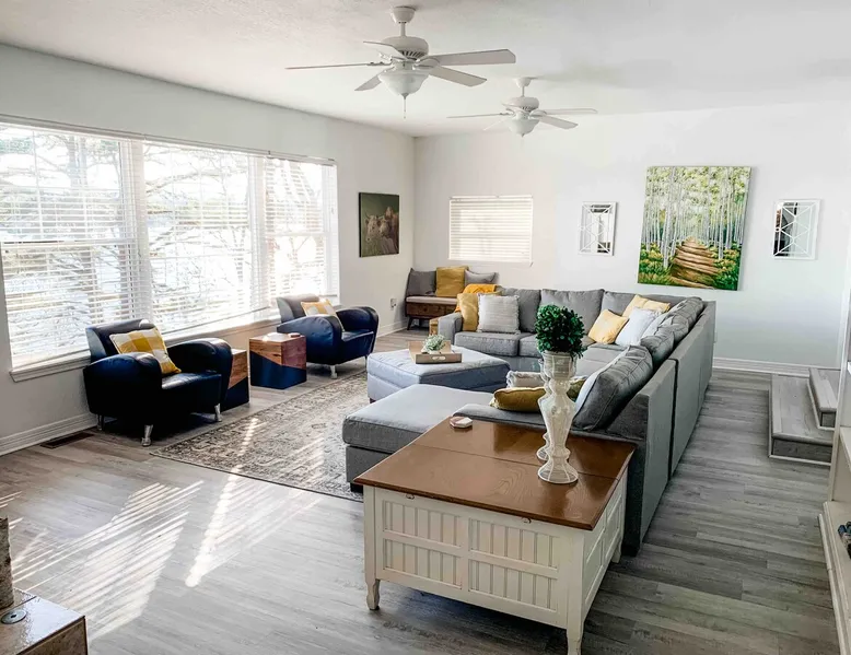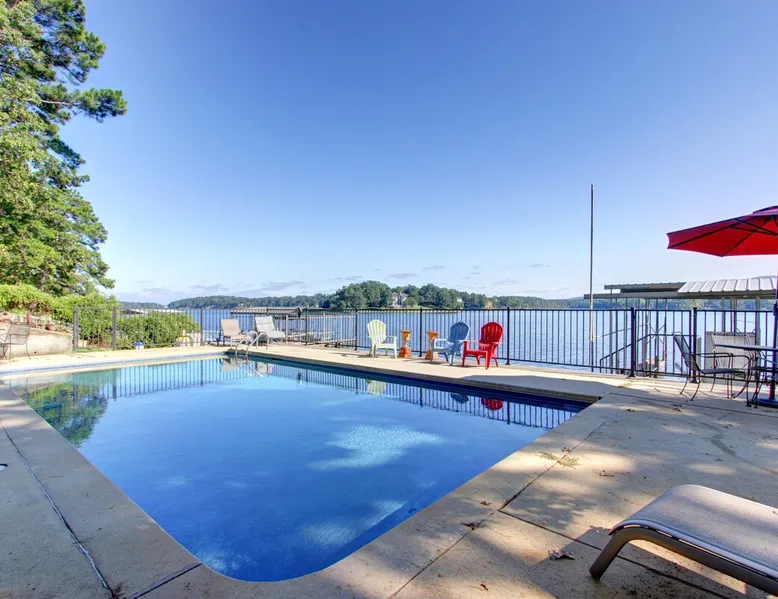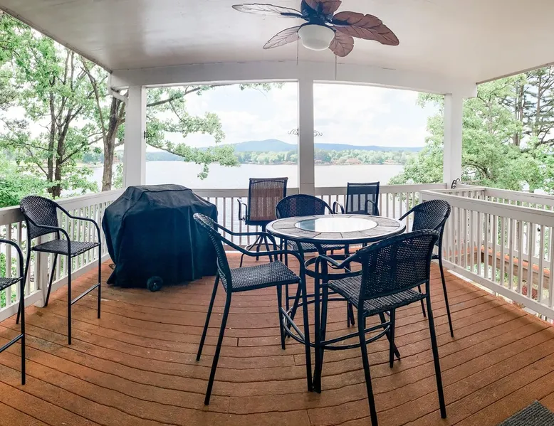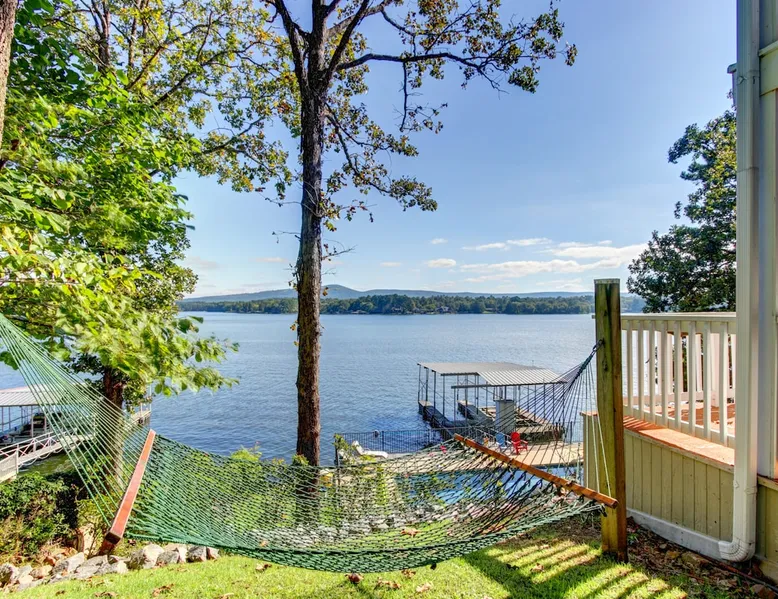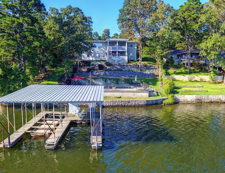 Enjoy one of the best views that Lake Hamilton has to offer while spending afternoons relaxing in the pool or playing on the lake! Waterfront property with swimming pool spans across 2 levels with tremendous mountain and lake views from both inside and outside the house. The multi-level family home has 5 Bedrooms, a fully-stocked kitchen with two adjoining dining areas, and large living space. A covered dock and pool are also available for your use! The space Each of the three bedrooms on the main level has its own set of dresser drawers, large closet, and adjoining full bathroom. The Master Bedroom is very spacious, offering a king size bed, walk-in closet, and master bath with a jacuzzi tub and shower. Bedroom 2 (second master) contains a king bed, walk-in closet, and adjoining bathroom with tub/shower enclosure. Bedroom 3 contains a queen bed, and adjoins to a full bathroom with two entries to also serve as the upper living area guest bathroom. The upper level also contains a large living area with sectional and chairs, a large flat-screen TV outfitted with Chromecast to satisfy your TV needs, and awesome lake views available from inside the house. The upper-level kitchen comes fully equipped with a dishwasher, stove with electric cooktop, refrigerator, microwave, storage pantry, and drip coffee maker. There are two dining spaces that run adjacent to either side of the kitchen to comfortably seat 12 people total. In addition, the covered, upper deck is accessible via walk out from one of the main level dining areas via large patio doors. It has a ceiling fan, 2 outdoor high-top tables, a gas grill with propane, and an additional few chairs available for guest use. The upper and lower decks are connected by a flight of stairs. The lower level of the home is very spacious and includes: Bedroom 4 with double-bunk twin beds (sleeps 4); a second suite downstairs with a large sitting area (sofa, chairs, TV), a queen bed, and a breakfast bar/kitchenette with a small refrigerator, sink, and counter space; a laundry room with washer, dryer, and folding table; and a full bathroom with shower/tub enclosure. The lower level patio is accessible from the upper deck via stairs, or is walk-out from the lower level living area. It contains a large table with 4 chairs and a smaller table with 2 chairs. There is direct access (easy walk) down to the pool and lake from the lower deck/lower level of the home via slightly sloped flagstone walkway with handrail. The walkway leads to the private, gated pool, which remains closed for the winter months and reopens in April each year. From the pool, there are a few steps down to the two-stall boat dock. The dock contains a ladder for access to swimming in the lake and has an area for relaxing. We think you will agree that we offer a wonderful home with significant amenities to make your visit to our lake home one of the most memorable ever. Swim, sunbathe, sit back, and relax either indoors or outdoors by enjoying our property as it it were your own. Thank you for your interest! Guest access Private pool on the water! Great views of mountains and the lake from both inside and outside the home. Spacious master bedroom has large, jetted tub. Bonus second suite downstairs outfitted with sitting area and breakfast bar. Multi-level covered patio/decks. Plenty of space (and 4 full bathrooms) to spread out and relax so you don't feel on top of other guests. 3 upper level bedrooms each have adjoining bathrooms. Cozy, cottage feel. Double-slip boat dock is great for multi-family or large groups renting.