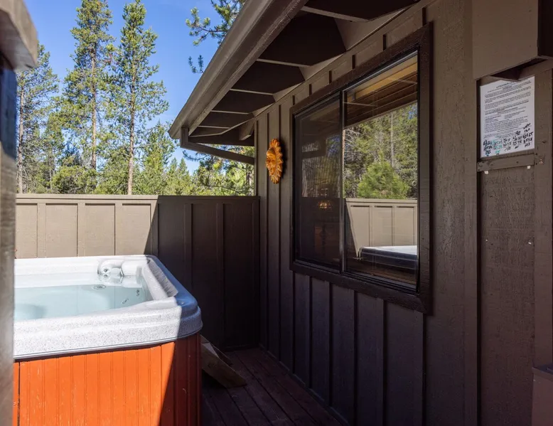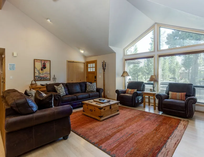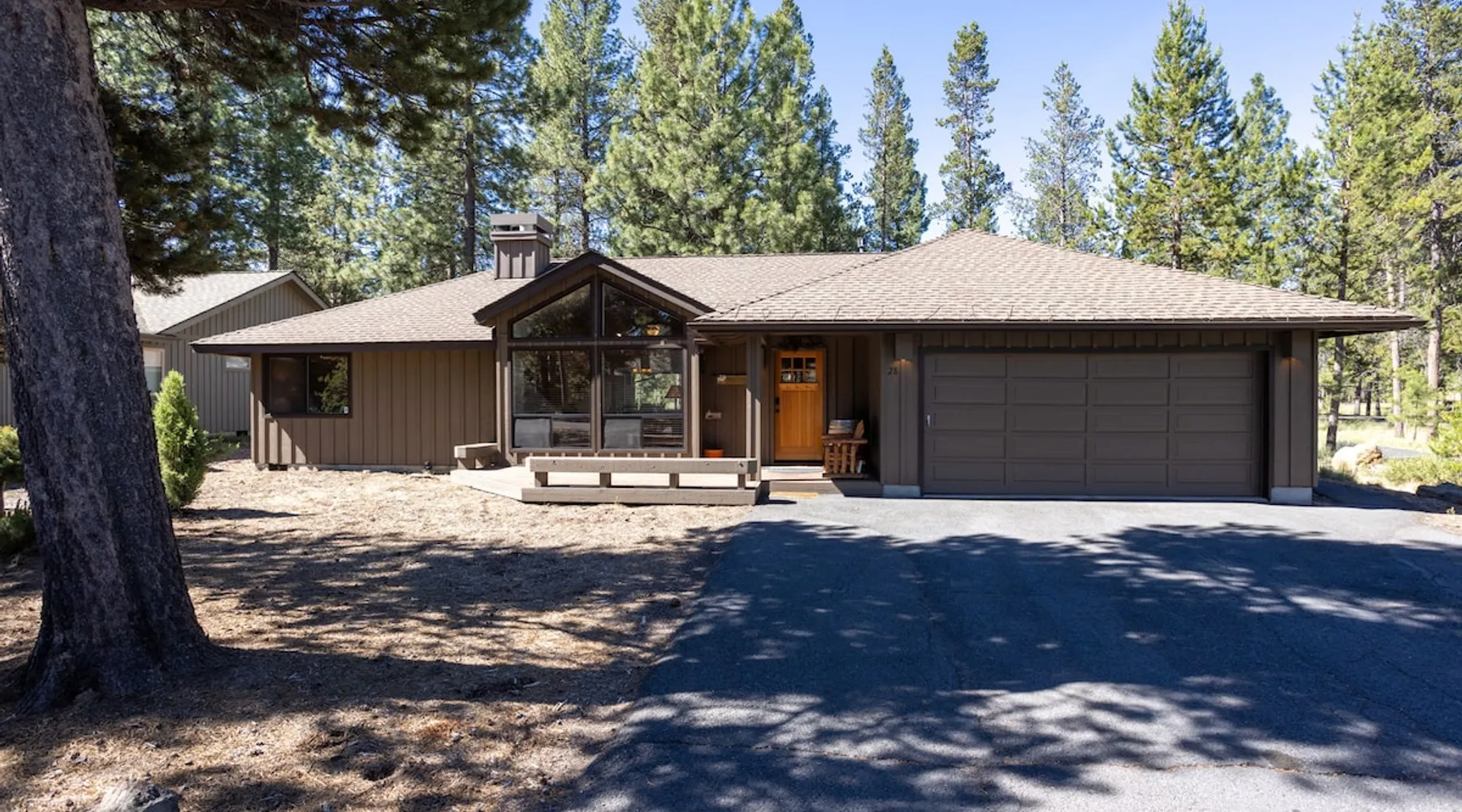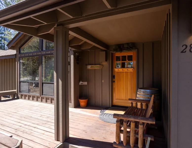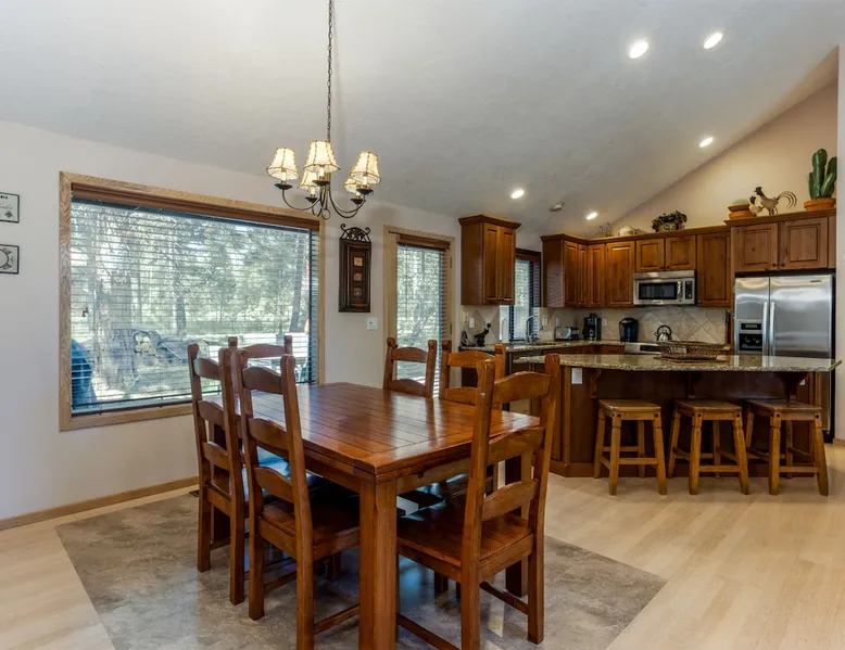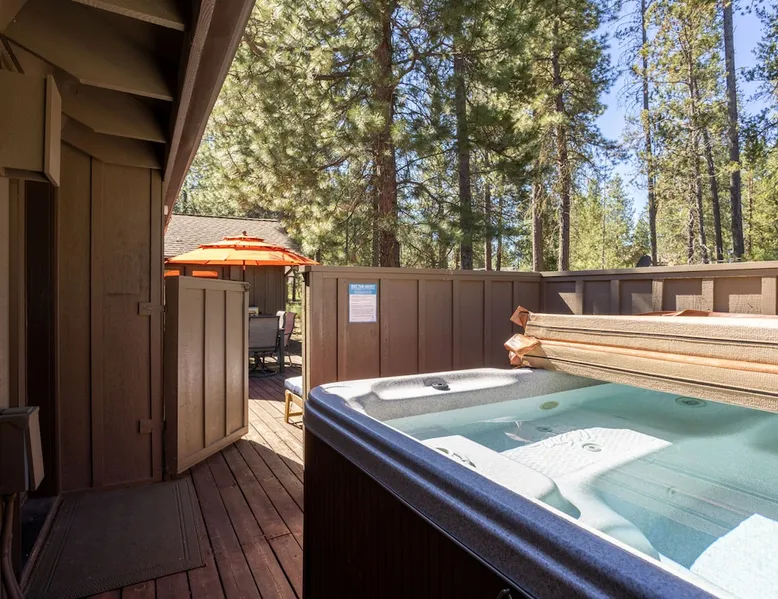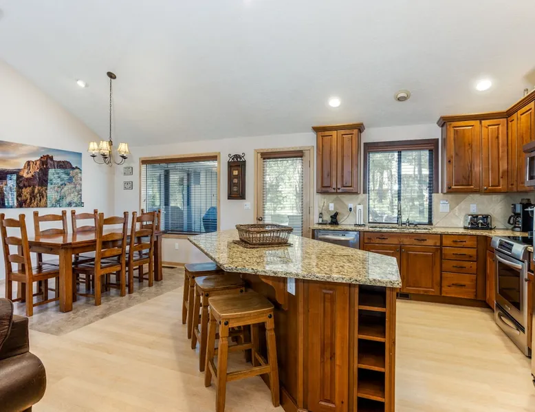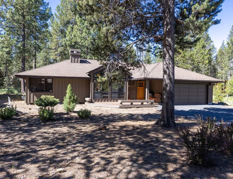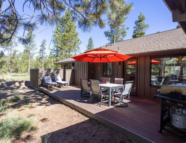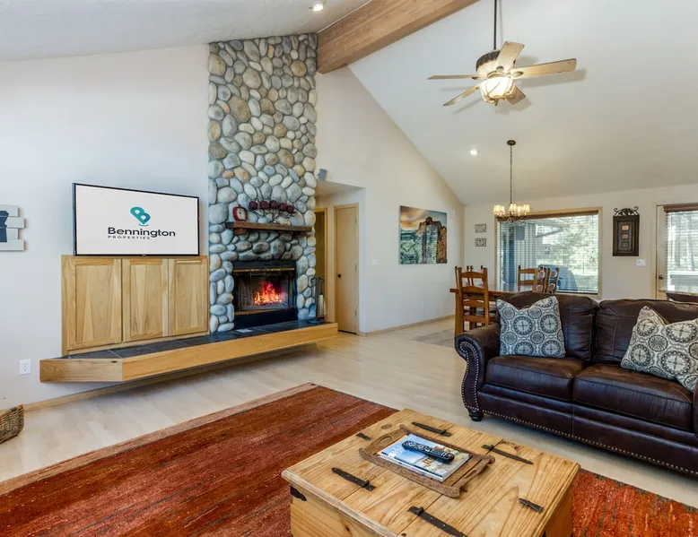 Near Woodlands golf course and scenic Deschutes river. Open floor plan of beautiful lodge style colors, ping pong, hot tub. Two ensuite bedrooms, well equipped kitchen. The space This single level home has an open floor plan with vaulted ceilings for a spacious feel. Wood and stone paired with Americana accents give this home the feel of a ski lodge with all the amenities. Warm up by the wood burning fireplace in the winter, or enjoy grilling on the back deck in the summer. A well-stocked kitchen and dining for 8 make group meals a breeze. This home has three bedrooms, all nicely spaced for privacy. Bedroom one is a queen bedroom adjacent to the full hall bathroom. Down the hall is a spacious king ensuite bedroom with private bathroom and double doors giving access to the back deck and hot tub. Bedroom three is a queen ensuite with private bath and deck access as well. In addition, there is a sofa sleeper in the living room. All bedrooms feature their own TV, including 2 Smart TVs, 2 Flat Screens, and 3 DVD players. In the garage you’ll find Ping Pong and 4 adult bikes. This home is a quick trek from Woodlands Golf Course, Fort Rock Park, and the Deschutes River. This home, along with most Sunriver homes, is not air conditioned. With our cool mountain evenings and ice cold rivers and lakes to keep you cool, this is a great house for a slow paced, ice cream and iced beer kinda summer. This home welcomes dogs, 2 max, no other pets are allowed. Fees apply Family Reunion in Sunriver? Great! Book this home along with our 3 Topflite or 12 Topflite homes and have room for the whole family. Guest access Home access information will be sent 7 - 10 days prior to arrival. All homes are set up for self check-in, no need to stop by the office, just go straight to the home. Other things to note This single level home has an open floor plan with vaulted ceilings for a spacious feel. Wood and stone paired with Americana accents give this home the feel of a ski lodge with all the amenities. Warm up by the wood burning fireplace in the winter, or enjoy grilling on the back deck in the summer. A well-stocked kitchen and dining for 8 make group meals a breeze. This home has three bedrooms, all nicely spaced for privacy. Bedroom one is a queen bedroom adjacent to the full hall bathroom. Down the hall is a spacious king ensuite bedroom with private bathroom and double doors giving access to the back deck and hot tub. Bedroom three is a queen ensuite with private bath and deck access as well. In addition, there is a sofa sleeper in the living room. All bedrooms feature their own TV, including 2 Smart TVs, 2 Flat Screens, and 3 DVD players. In the garage you’ll find Ping Pong and 4 adult bikes. This home is a quick trek from Woodlands Golf Course, Fort Rock Park, and the Deschutes River. This home, along with most Sunriver homes, is not air conditioned. With our cool mountain evenings and ice cold rivers and lakes to keep you cool, this is a great house for a slow paced, ice cream and iced beer kinda summer. This home welcomes dogs, 2 max, no other pets are allowed. Fees apply Family Reunion in Sunriver? Great! Book this home along with our 3 Topflite or 12 Topflite homes and have room for the whole family.
