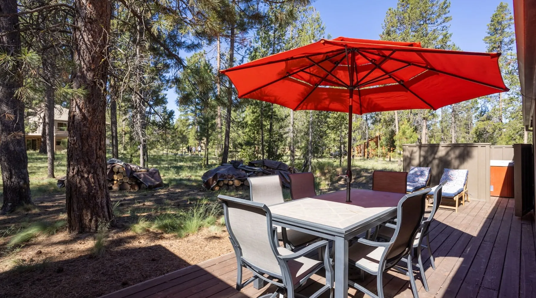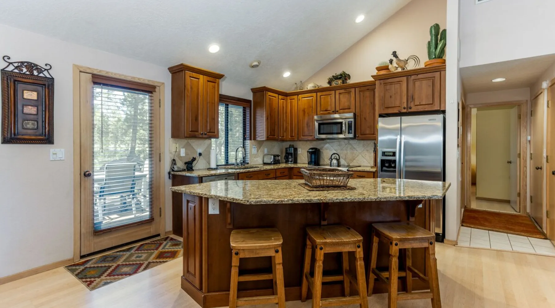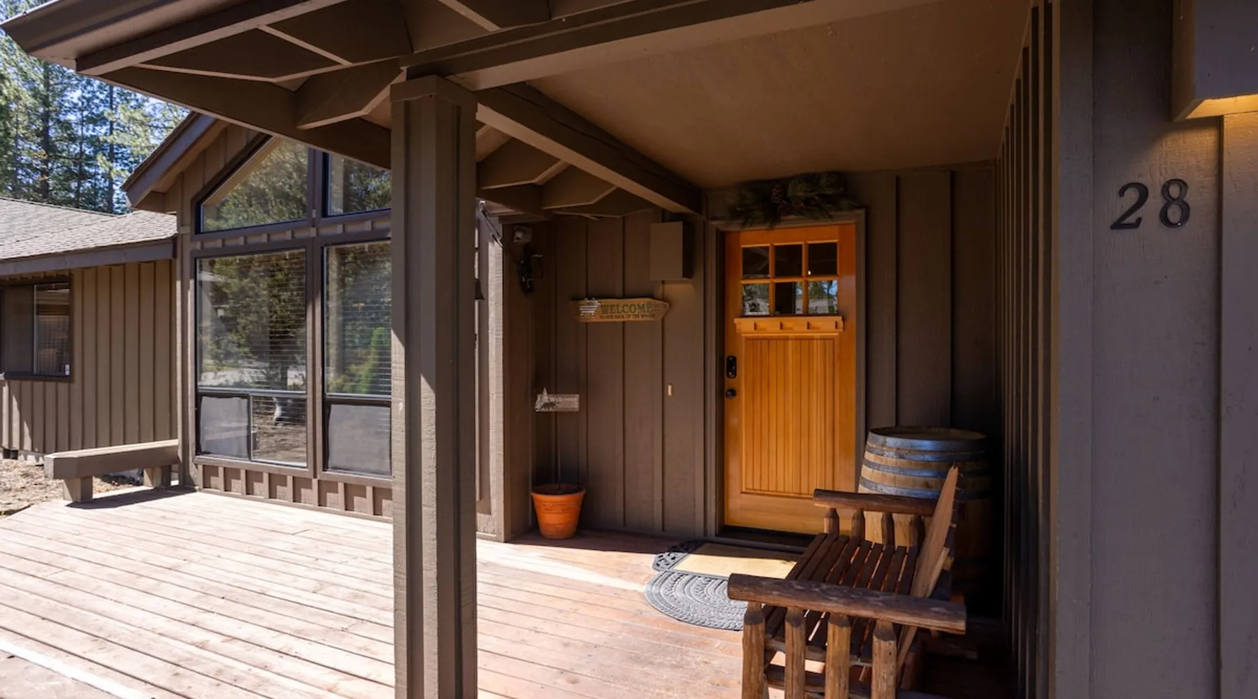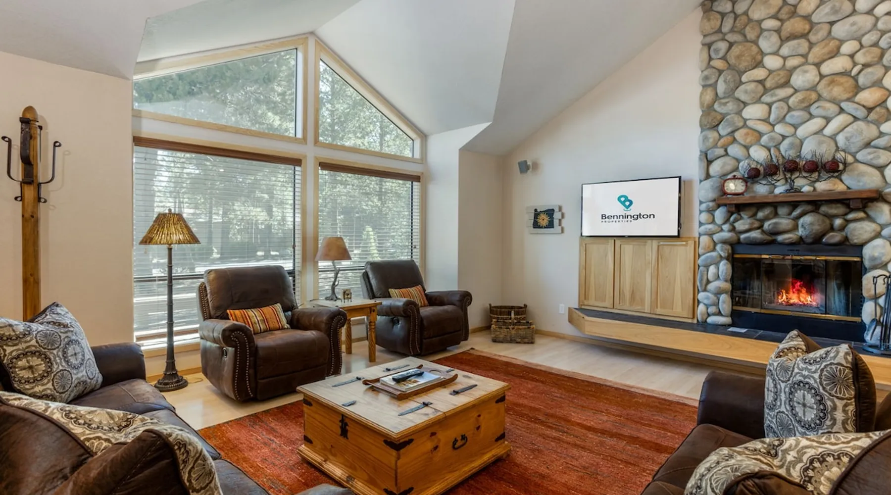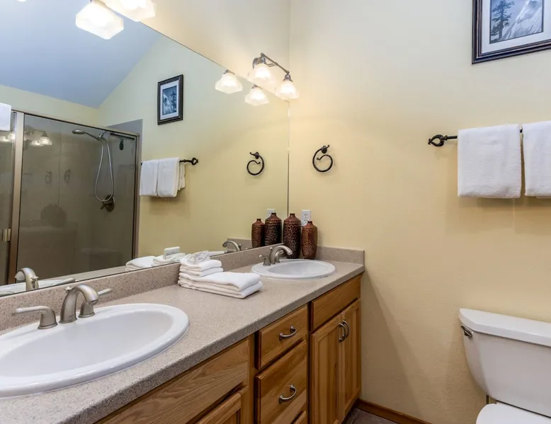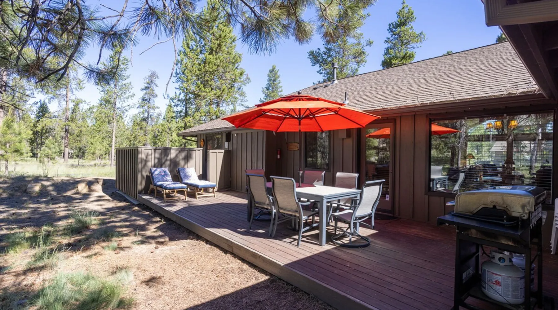 Near Woodlands golf course and scenic Deschutes river. Open floor plan of beautiful lodge style colors, ping pong, hot tub. Two ensuite bedrooms, well equipped kitchen. The space This single level home has an open floor plan with vaulted ceilings for a spacious feel. Wood and stone paired with Americana accents give this home the feel of a ski lodge with all the amenities. Warm up by the wood burning fireplace in the winter, or enjoy grilling on the back deck in the summer. A well-stocked kitchen and dining for 8 make group meals a breeze. This home has three bedrooms, all nicely spaced for privacy. Bedroom one is a queen bedroom adjacent to the full hall bathroom. Down the hall is a spacious king ensuite bedroom with private bathroom and double doors giving access to the back deck and hot tub. Bedroom three is a queen ensuite with private bath and deck access as well. In addition, there is a sofa sleeper in the living room. All bedrooms feature their own TV, including 2 Smart TVs, 2 Flat Screens, and 3 DVD players. In the garage you’ll find Ping Pong and 4 adult bikes. This home is a quick trek from Woodlands Golf Course, Fort Rock Park, and the Deschutes River. This home, along with most Sunriver homes, is not air conditioned. With our cool mountain evenings and ice cold rivers and lakes to keep you cool, this is a great house for a slow paced, ice cream and iced beer kinda summer. This home welcomes dogs, 2 max, no other pets are allowed. Fees apply Family Reunion in Sunriver? Great! Book this home along with our 3 Topflite or 12 Topflite homes and have room for the whole family. Guest access Home access information will be sent 7 - 10 days prior to arrival. All homes are set up for self check-in, no need to stop by the office, just go straight to the home. Other things to note This single level home has an open floor plan with vaulted ceilings for a spacious feel. Wood and stone paired with Americana accents give this home the feel of a ski lodge with all the amenities. Warm up by the wood burning fireplace in the winter, or enjoy grilling on the back deck in the summer. A well-stocked kitchen and dining for 8 make group meals a breeze. This home has three bedrooms, all nicely spaced for privacy. Bedroom one is a queen bedroom adjacent to the full hall bathroom. Down the hall is a spacious king ensuite bedroom with private bathroom and double doors giving access to the back deck and hot tub. Bedroom three is a queen ensuite with private bath and deck access as well. In addition, there is a sofa sleeper in the living room. All bedrooms feature their own TV, including 2 Smart TVs, 2 Flat Screens, and 3 DVD players. In the garage you’ll find Ping Pong and 4 adult bikes. This home is a quick trek from Woodlands Golf Course, Fort Rock Park, and the Deschutes River. This home, along with most Sunriver homes, is not air conditioned. With our cool mountain evenings and ice cold rivers and lakes to keep you cool, this is a great house for a slow paced, ice cream and iced beer kinda summer. This home welcomes dogs, 2 max, no other pets are allowed. Fees apply Family Reunion in Sunriver? Great! Book this home along with our 3 Topflite or 12 Topflite homes and have room for the whole family.