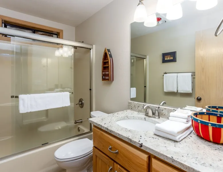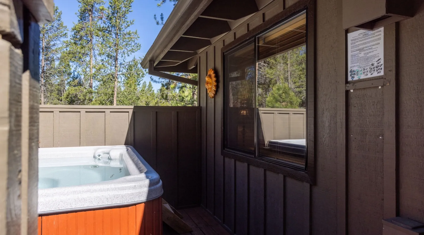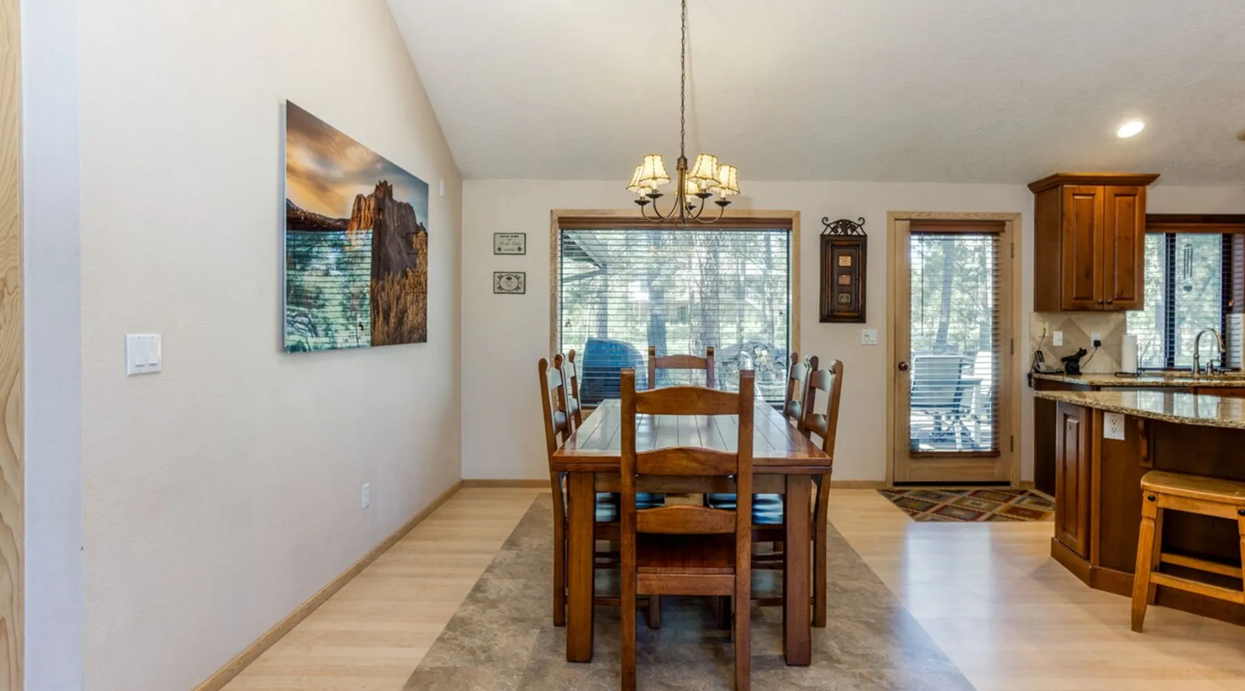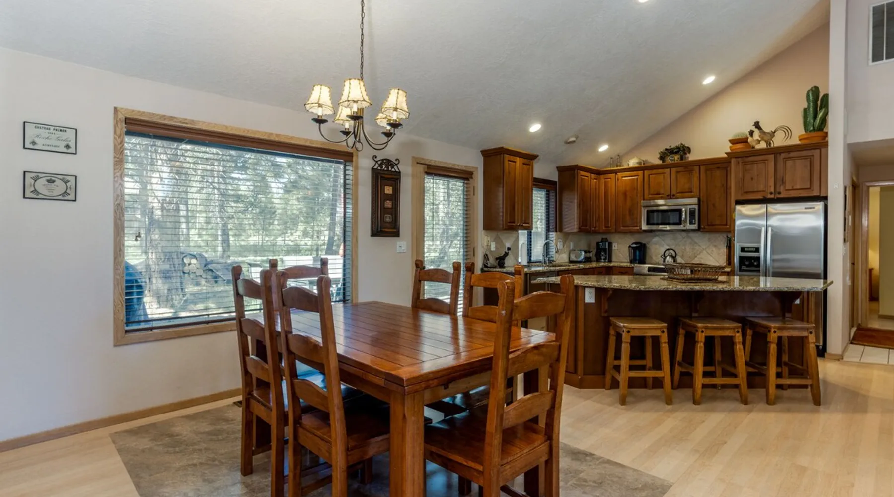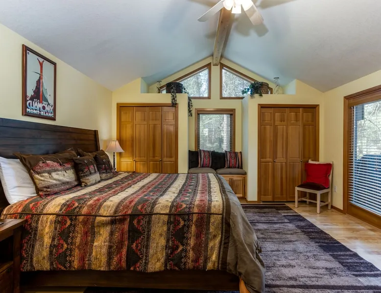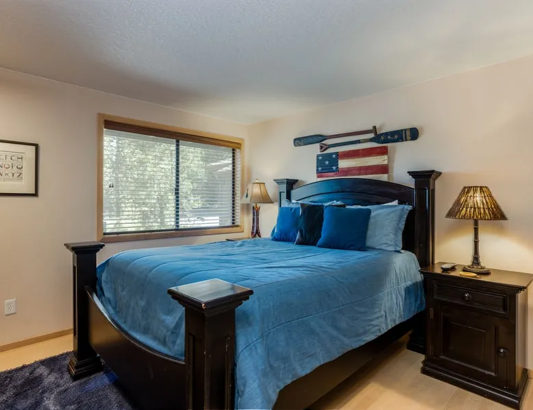 Near Woodlands golf course and scenic Deschutes river. Open floor plan of beautiful lodge style colors, ping pong, hot tub. Two ensuite bedrooms, well equipped kitchen. The space This single level home has an open floor plan with vaulted ceilings for a spacious feel. Wood and stone paired with Americana accents give this home the feel of a ski lodge with all the amenities. Warm up by the wood burning fireplace in the winter, or enjoy grilling on the back deck in the summer. A well-stocked kitchen and dining for 8 make group meals a breeze. This home has three bedrooms, all nicely spaced for privacy. Bedroom one is a queen bedroom adjacent to the full hall bathroom. Down the hall is a spacious king ensuite bedroom with private bathroom and double doors giving access to the back deck and hot tub. Bedroom three is a queen ensuite with private bath and deck access as well. In addition, there is a sofa sleeper in the living room. All bedrooms feature their own TV, including 2 Smart TVs, 2 Flat Screens, and 3 DVD players. In the garage you’ll find Ping Pong and 4 adult bikes. This home is a quick trek from Woodlands Golf Course, Fort Rock Park, and the Deschutes River. This home, along with most Sunriver homes, is not air conditioned. With our cool mountain evenings and ice cold rivers and lakes to keep you cool, this is a great house for a slow paced, ice cream and iced beer kinda summer. This home welcomes dogs, 2 max, no other pets are allowed. Fees apply Family Reunion in Sunriver? Great! Book this home along with our 3 Topflite or 12 Topflite homes and have room for the whole family. Guest access Home access information will be sent 7 - 10 days prior to arrival. All homes are set up for self check-in, no need to stop by the office, just go straight to the home. Other things to note This single level home has an open floor plan with vaulted ceilings for a spacious feel. Wood and stone paired with Americana accents give this home the feel of a ski lodge with all the amenities. Warm up by the wood burning fireplace in the winter, or enjoy grilling on the back deck in the summer. A well-stocked kitchen and dining for 8 make group meals a breeze. This home has three bedrooms, all nicely spaced for privacy. Bedroom one is a queen bedroom adjacent to the full hall bathroom. Down the hall is a spacious king ensuite bedroom with private bathroom and double doors giving access to the back deck and hot tub. Bedroom three is a queen ensuite with private bath and deck access as well. In addition, there is a sofa sleeper in the living room. All bedrooms feature their own TV, including 2 Smart TVs, 2 Flat Screens, and 3 DVD players. In the garage you’ll find Ping Pong and 4 adult bikes. This home is a quick trek from Woodlands Golf Course, Fort Rock Park, and the Deschutes River. This home, along with most Sunriver homes, is not air conditioned. With our cool mountain evenings and ice cold rivers and lakes to keep you cool, this is a great house for a slow paced, ice cream and iced beer kinda summer. This home welcomes dogs, 2 max, no other pets are allowed. Fees apply Family Reunion in Sunriver? Great! Book this home along with our 3 Topflite or 12 Topflite homes and have room for the whole family.