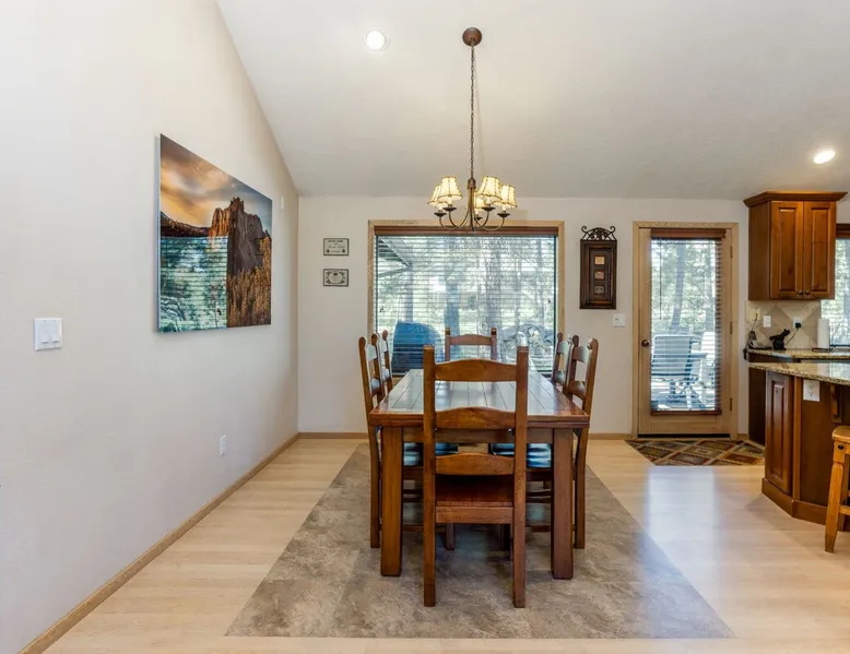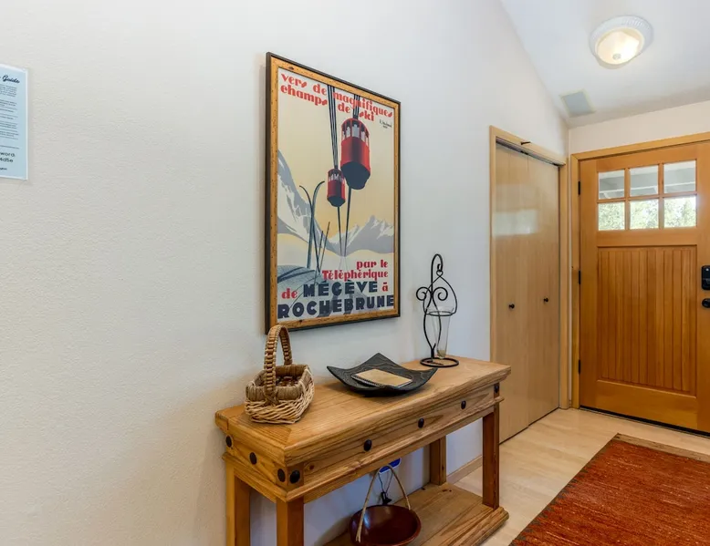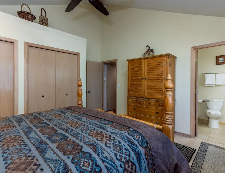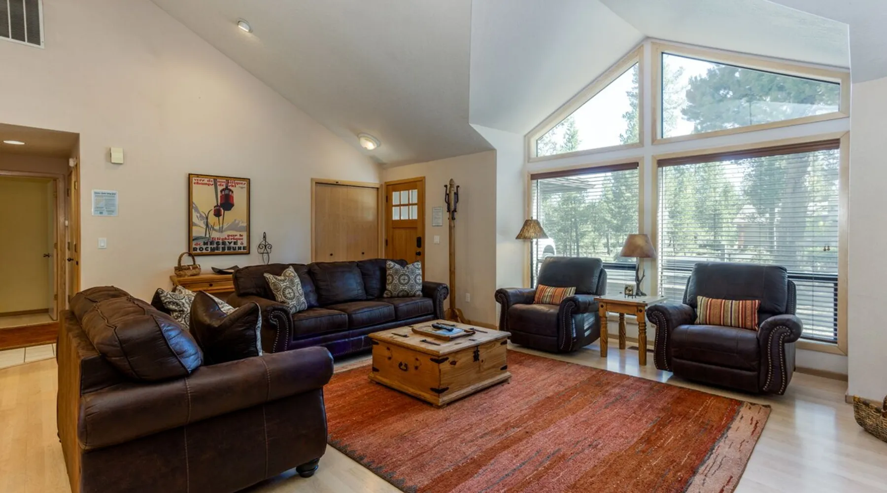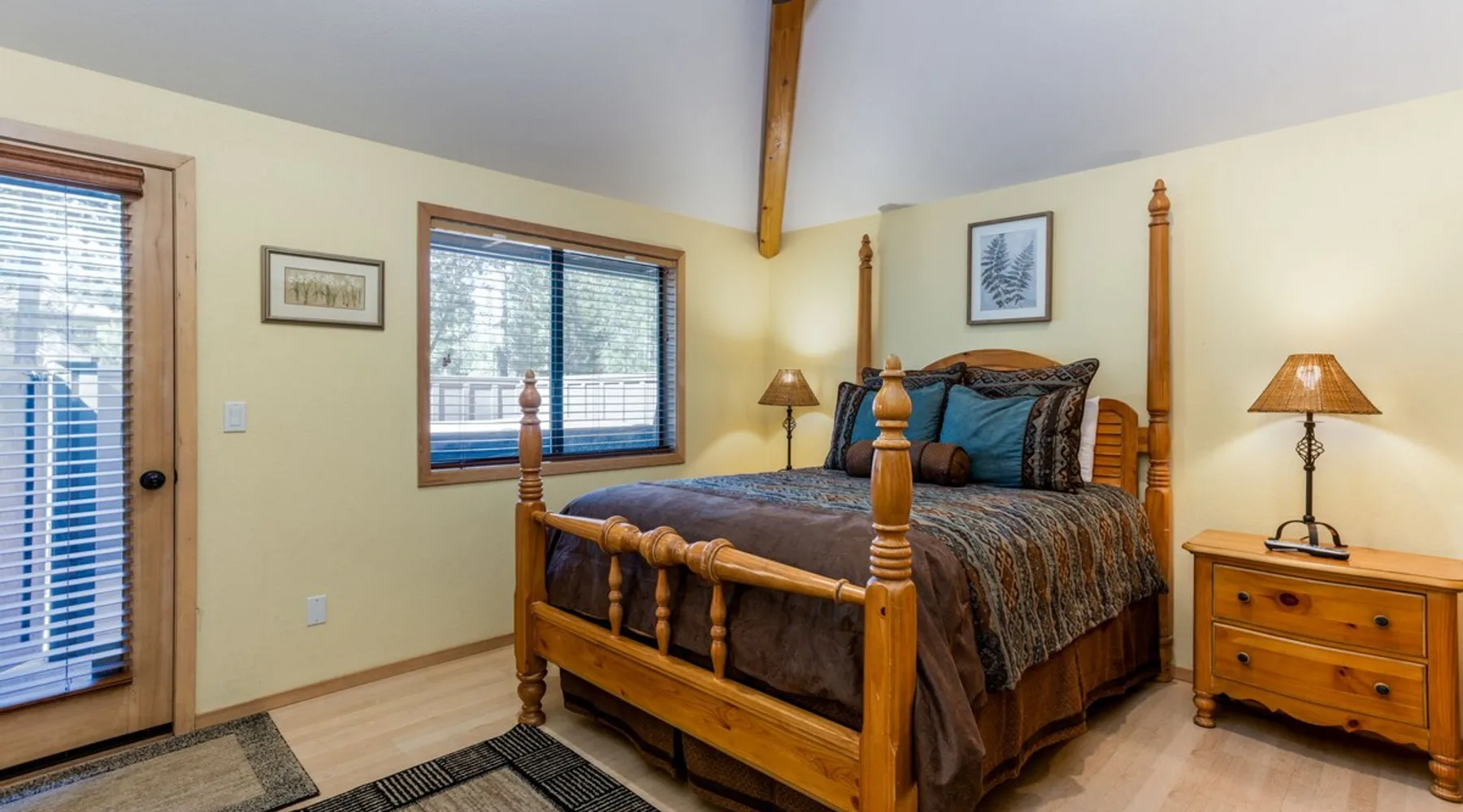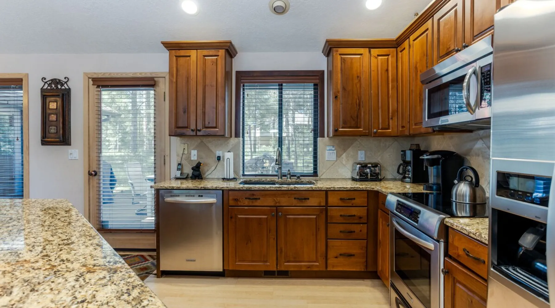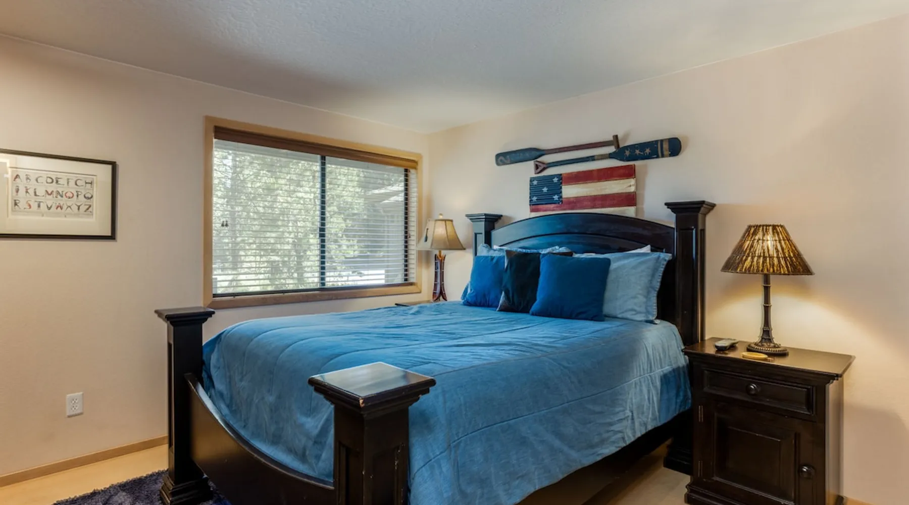 Near Woodlands golf course and scenic Deschutes river. Open floor plan of beautiful lodge style colors, ping pong, hot tub. Two ensuite bedrooms, well equipped kitchen. The space This single level home has an open floor plan with vaulted ceilings for a spacious feel. Wood and stone paired with Americana accents give this home the feel of a ski lodge with all the amenities. Warm up by the wood burning fireplace in the winter, or enjoy grilling on the back deck in the summer. A well-stocked kitchen and dining for 8 make group meals a breeze. This home has three bedrooms, all nicely spaced for privacy. Bedroom one is a queen bedroom adjacent to the full hall bathroom. Down the hall is a spacious king ensuite bedroom with private bathroom and double doors giving access to the back deck and hot tub. Bedroom three is a queen ensuite with private bath and deck access as well. In addition, there is a sofa sleeper in the living room. All bedrooms feature their own TV, including 2 Smart TVs, 2 Flat Screens, and 3 DVD players. In the garage you’ll find Ping Pong and 4 adult bikes. This home is a quick trek from Woodlands Golf Course, Fort Rock Park, and the Deschutes River. This home, along with most Sunriver homes, is not air conditioned. With our cool mountain evenings and ice cold rivers and lakes to keep you cool, this is a great house for a slow paced, ice cream and iced beer kinda summer. This home welcomes dogs, 2 max, no other pets are allowed. Fees apply Family Reunion in Sunriver? Great! Book this home along with our 3 Topflite or 12 Topflite homes and have room for the whole family. Guest access Home access information will be sent 7 - 10 days prior to arrival. All homes are set up for self check-in, no need to stop by the office, just go straight to the home. Other things to note This single level home has an open floor plan with vaulted ceilings for a spacious feel. Wood and stone paired with Americana accents give this home the feel of a ski lodge with all the amenities. Warm up by the wood burning fireplace in the winter, or enjoy grilling on the back deck in the summer. A well-stocked kitchen and dining for 8 make group meals a breeze. This home has three bedrooms, all nicely spaced for privacy. Bedroom one is a queen bedroom adjacent to the full hall bathroom. Down the hall is a spacious king ensuite bedroom with private bathroom and double doors giving access to the back deck and hot tub. Bedroom three is a queen ensuite with private bath and deck access as well. In addition, there is a sofa sleeper in the living room. All bedrooms feature their own TV, including 2 Smart TVs, 2 Flat Screens, and 3 DVD players. In the garage you’ll find Ping Pong and 4 adult bikes. This home is a quick trek from Woodlands Golf Course, Fort Rock Park, and the Deschutes River. This home, along with most Sunriver homes, is not air conditioned. With our cool mountain evenings and ice cold rivers and lakes to keep you cool, this is a great house for a slow paced, ice cream and iced beer kinda summer. This home welcomes dogs, 2 max, no other pets are allowed. Fees apply Family Reunion in Sunriver? Great! Book this home along with our 3 Topflite or 12 Topflite homes and have room for the whole family.