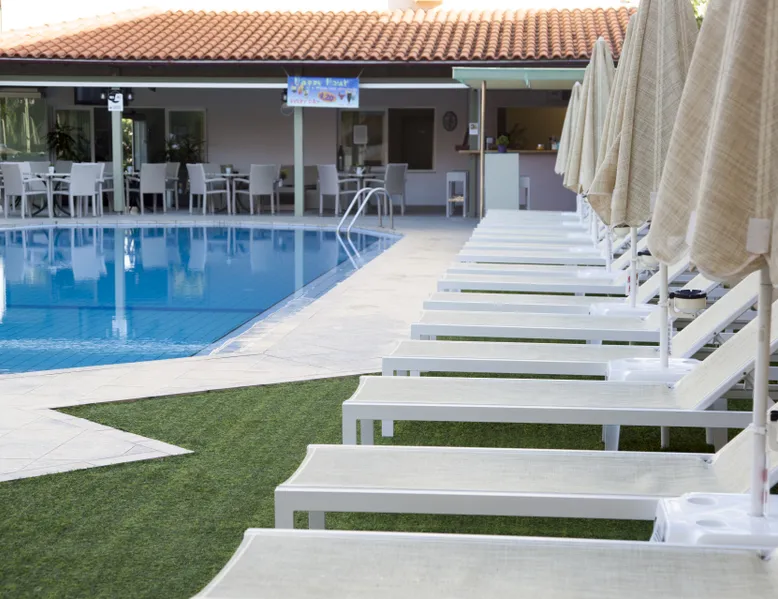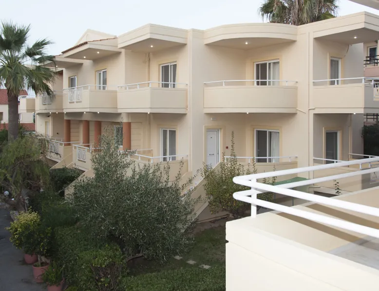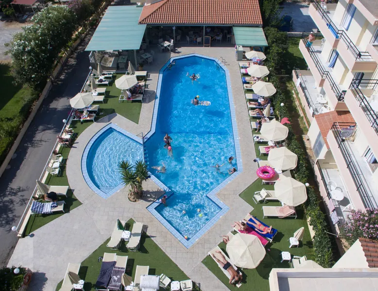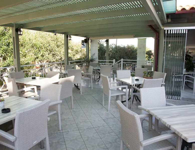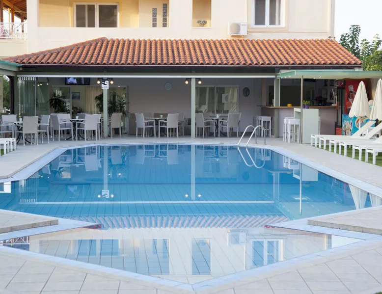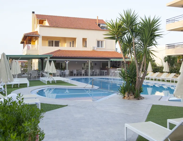 Near the famous beach of Agia Marina stands the Blue Sky Hotel. A lovely and nice decorated hotel which was built by Soilentakis family and is well known for the quality of the services provided. It is a family business that provides its guests all the necessary to feel as home. The pool is placed in the middle of the hotel next to the restaurant. All guests can see the garden which is in the back side of the hotel, where the family collects all the vegetables that are carefully taken care off and that are served for all the meals.