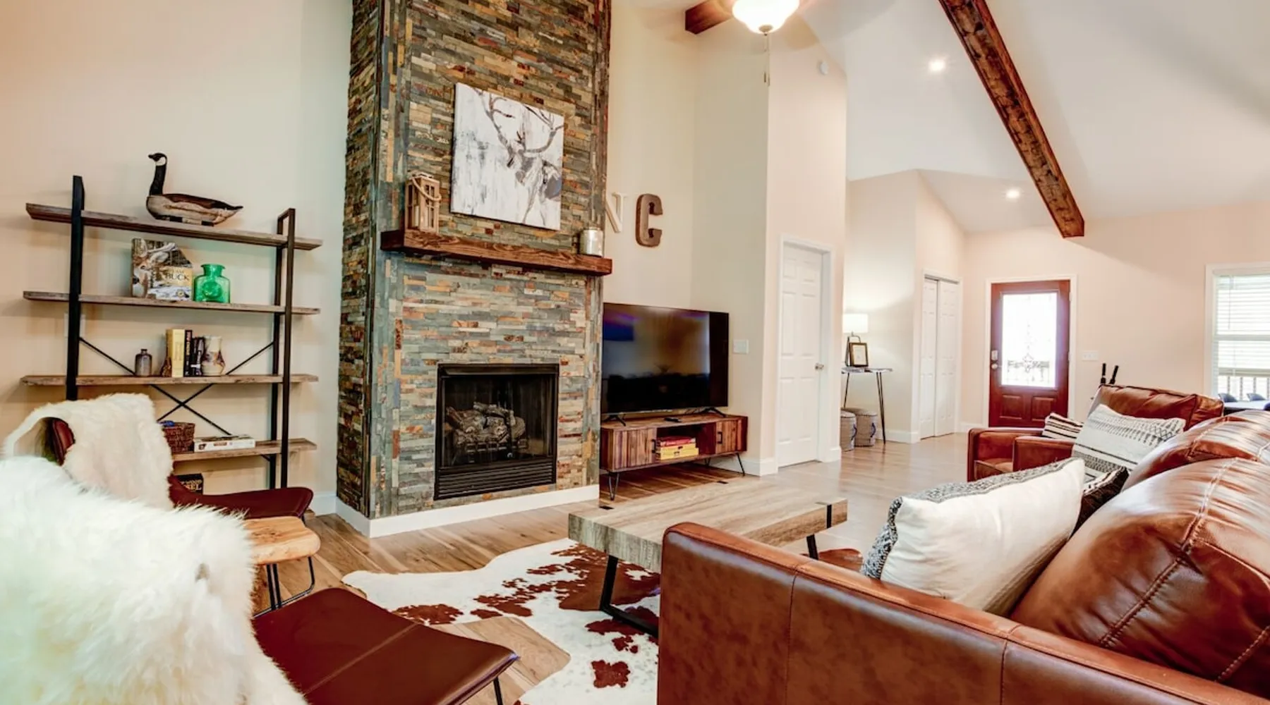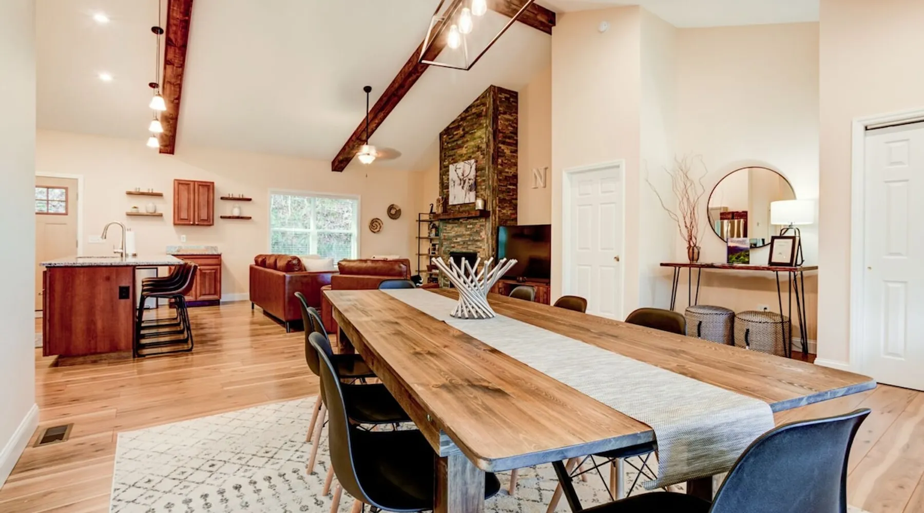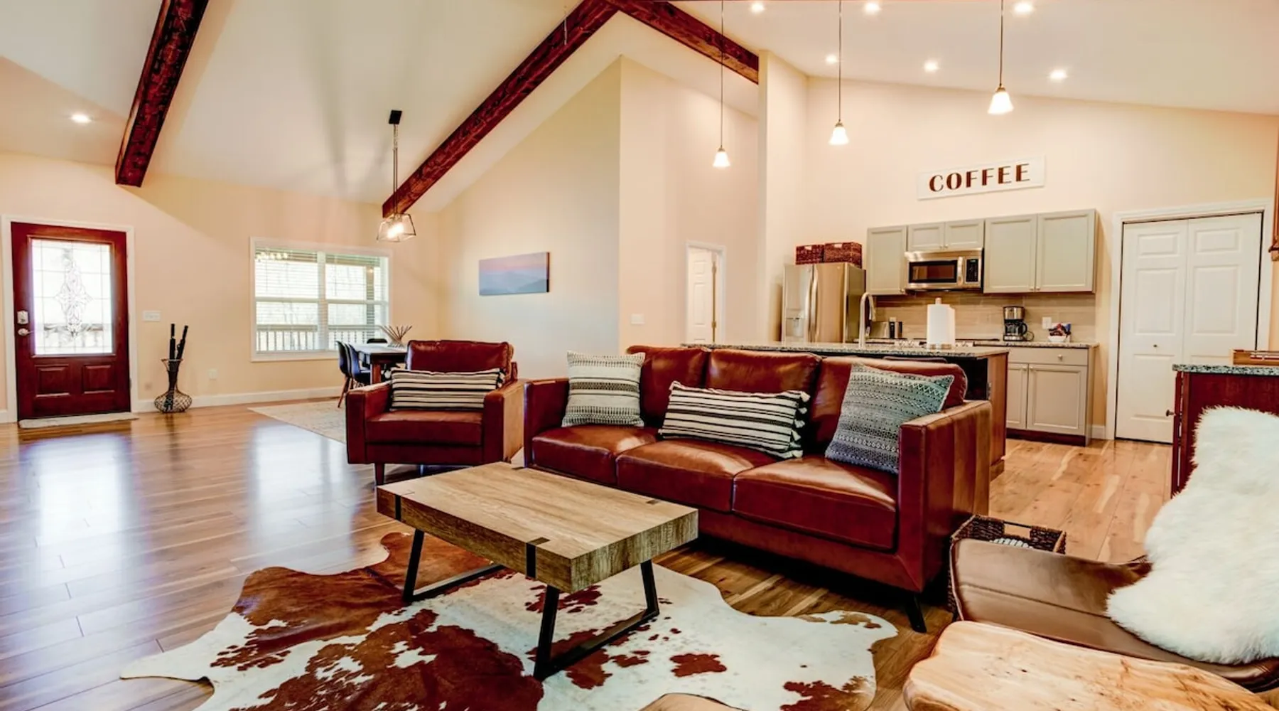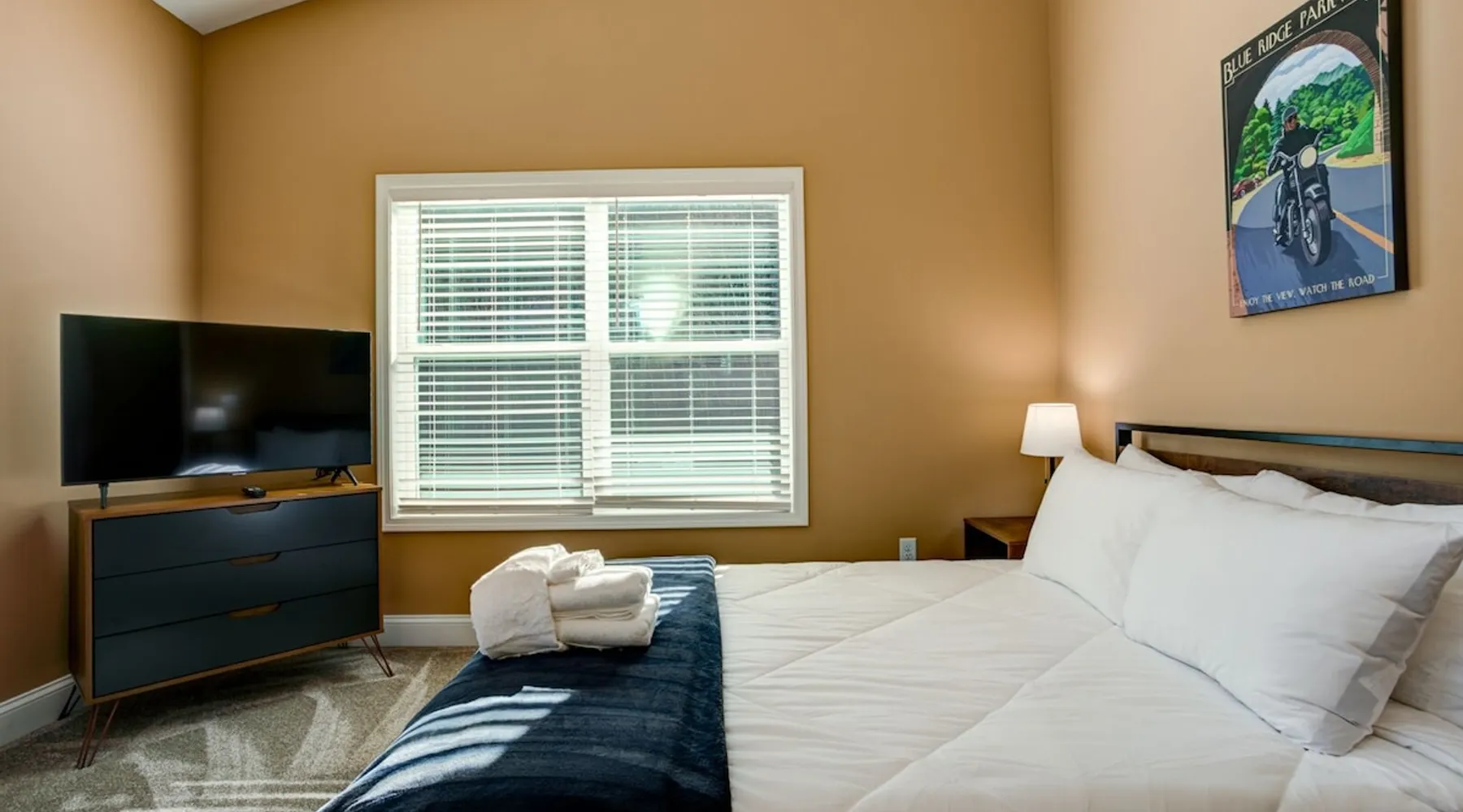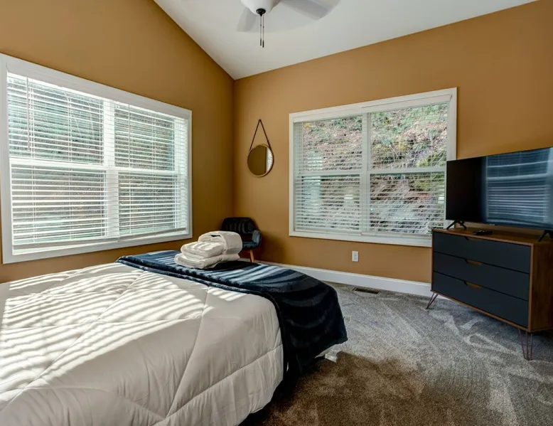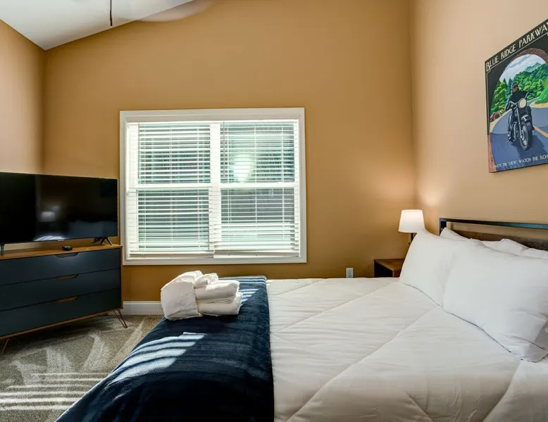 Antler View Ridge provides just what the name suggests; a mountain escape, located "amidst the Blue Ridge Mountains", on what feels like your own private ridge, with long-range views that may just afford a peek at deer! Antler View Ridge is a one-of-a-kind mountain home experience.....a new Yonder gem, creating memories for a lifetime! This hidden mountain gem sits on a newly constructed homestead, in a private development, and offers both short & long-range mountain views year-round. The space Come escape to your own memorable vacation destination! Location: Private mountain retreat located in Waynesville, overlooking scenic mountain vistas, app. 10 minutes outside of downtown Waynesville, and only 40 minutes to downtown Asheville, 45 minutes to Asheville Regional airport, 40 minutes to the gates of Biltmore Estate. You are less than 10 minutes to the Blue Ridge Parkway, and under 20 minutes to the ski slopes and downtown Maggie Valley. Close to virtually everything. Accommodations: (Sleeps 6-8) 3 bedroom, 2 full baths Occupancy Summary / Sleeps in beds: 6 Max. Occupancy: 8 (PLEASE NOTE: we provide linens for all beds; other occupancy will require guests providing their own linens.) Description: Welcome to Antler View Ridge! Yet another spectacular vacation rental hitches its wagon to our portfolio of luxury mountain rentals! And everyone has raved about their vacations ever since! This splendidly situated, and newly constructed mountain home has been built and outfitted with the goal of entertaining travelers for years, as they flock to experience the wonder that is the Blue Ridge mountains. Escape to greater Asheville and the Waynesville area to discover Antler View Ridge. This private mountain retreat offers an escape from the daily grind, complete with an expansive front porch overlooking the Appalachian Mountains! A true mountain home with modern updates & amenities; you will be relaxed by the mountain craftsman inspired accents, featuring an open living space surrounding you with the warmth of wood, offering a calming atmosphere with natural elements all around. The fireplace draws you to unwind and let all your cares float away, as you share stories, break bread, and congregate after a day of exploring all that WNC has to offer tourists. A large front porch area offers the incredible views of the mountainous skyline that our mountains are known for, and the stunning Blue Ridge mountain vistas. Gather with some friends, family, or both, and celebrate, relax, and unwind together at Antler View Ridge. Enjoy a plethora of amenities, including privacy, wireless Internet access, a large stone fireplace for those chilly nights (year round), new central air conditioning for those warm days, wildlife sightings, and more! Extremely convenient to everything Waynesville, Asheville, Maggie Valley and the Blue Ridge Parkway; come enjoy the eclectic, artsy town that is the now world famous downtown Waynesville, venture out into the western North Carolina wilderness, stay in to enjoy this marvelous getaway, hop in the car for a short drive to Asheville, or simply do it all! Whatever you choose, you will relax and unwind in style at this luxurious private retreat! This spectacular vacation rental is located just outside downtown Waynesville and is approximately 40 minutes driving distance to downtown Asheville. You are just minutes from America's favorite scenic byway, The Blue Ridge Parkway, motorcycle touring, biking, hiking, white water rafting, rock climbing, kayaking, canoeing, zip lining, Segway tour…just about any outdoor activity! Or, take a quick ride up to downtown Asheville to enjoy the first-rate restaurants, shopping, galleries, spas, and entertainment. Exclusive Special: When you book Antler View Ridge you will receive a special code for discounted tickets to the Biltmore Estate! Contact us for more info. Bedroom/Bath Layout: 3 bedroom, 2 full baths Bedroom #1 – Main Level – Master Suite – King Bed – Private Full Bath (#1) Bedroom #2 – Main Level – Guest Room – Queen Bed – Hall Full Bath (#2) Bedroom #3 – Main Level – Guest Room – Queen Bed – Hall Full Bath (#2) Occupancy Summary / Sleeps in beds: 6 Max Occupancy: 8 (PLEASE NOTE: We provide linens for all beds; other occupancy will require guests providing their own linens.) New smart TV's in every bedroom Additional Rate and Fees information: We openly share our Cleaning Fees in a manner of full disclosure, as we think this is the most honest and forthright approach with respect to our guests. Our Cleaning Fees are backed by our Clean Guarantee, which reflects the highest level of standards, pristine environments for our guests, and a level of clean that surpasses any other vacation homes; we literally guarantee it! Processing fee Current local tax rate is 13% No Security Deposit / Guests are responsible for damages. Early Check In and/or Late Check Out may be possible, depending on cleaning schedules and other reservations. If it is possible, there may be an additional fee that would be determined based on the time that you wish to check in or out and the seasonal rates. Quiet Policy: Please note that the home is located in a very private, quiet and exclusive development. Parties, loud noise and unruly behavior are absolutely prohibited, and guests are expected to respect the neighbors and their development. Internet Speed: Download - 59.5 Mbps Upload - .65 Mbps Pets: Many of our guests have allergies so we have maintained a pet-free environment so they can enjoy their vacation without the potential of an allergic reaction. If you have a pet we can recommend some alternatives nearby. Please inquire for details regarding payment, the cancellation policy, military discounts, and trip insurance. Note: Reservations over 30 days are subject for review prior to acceptance. A separate rental agreement will be required for 90+ day stays. Last Minute Bookings: Reservations made within 7 days of check-in require ad