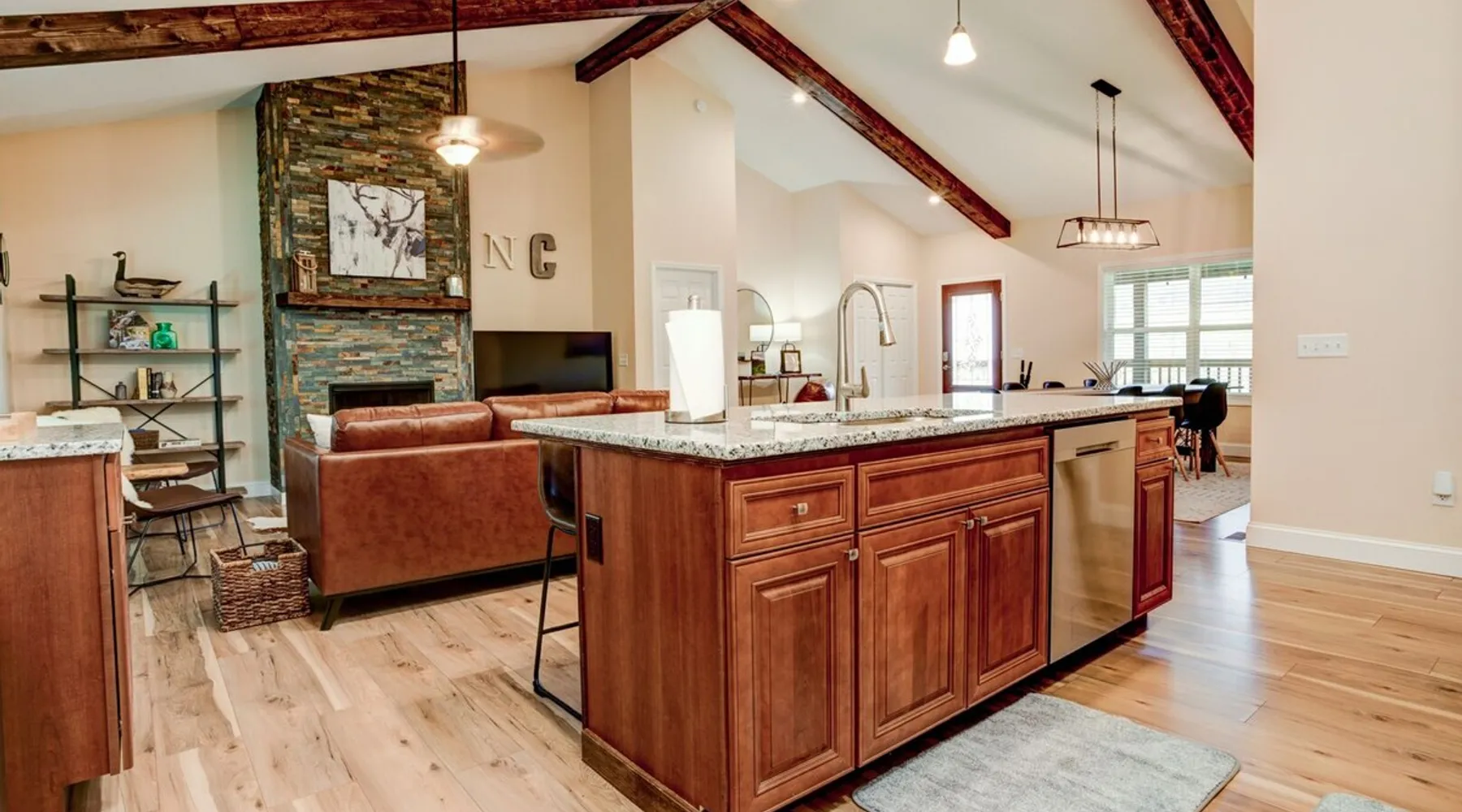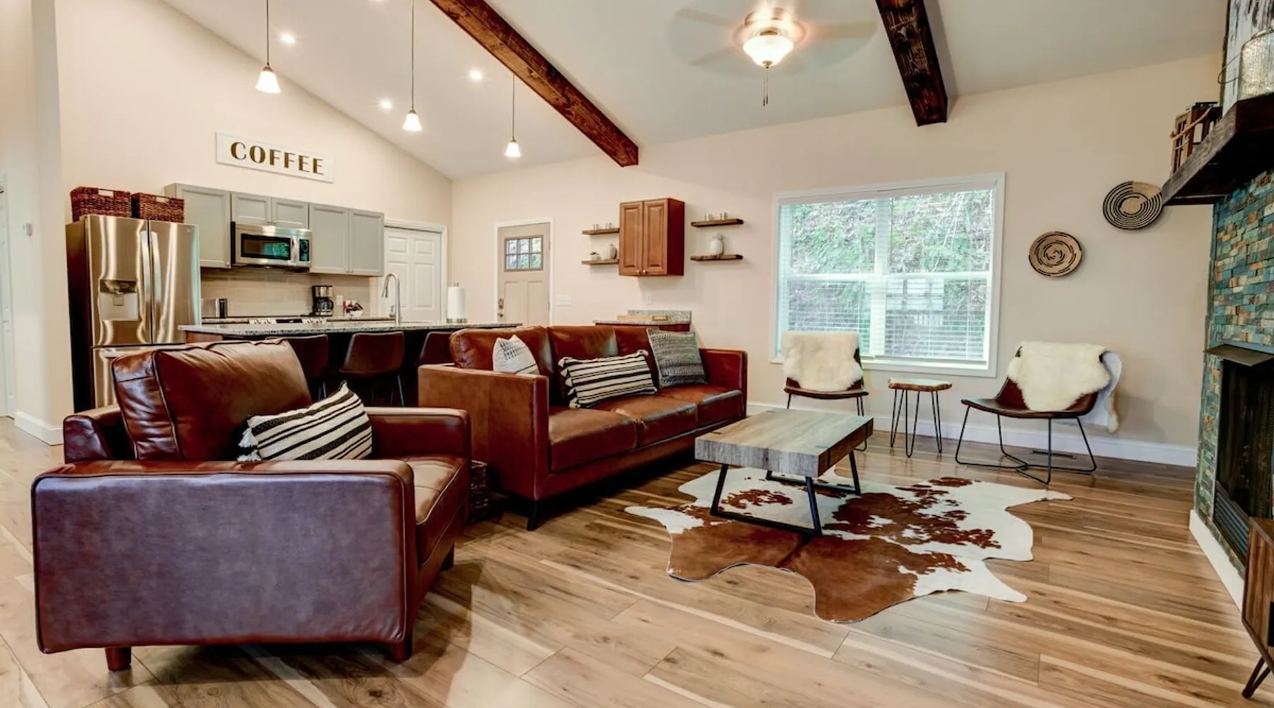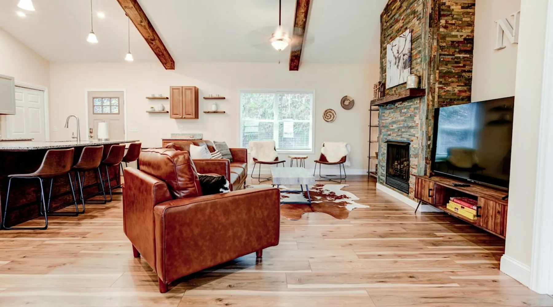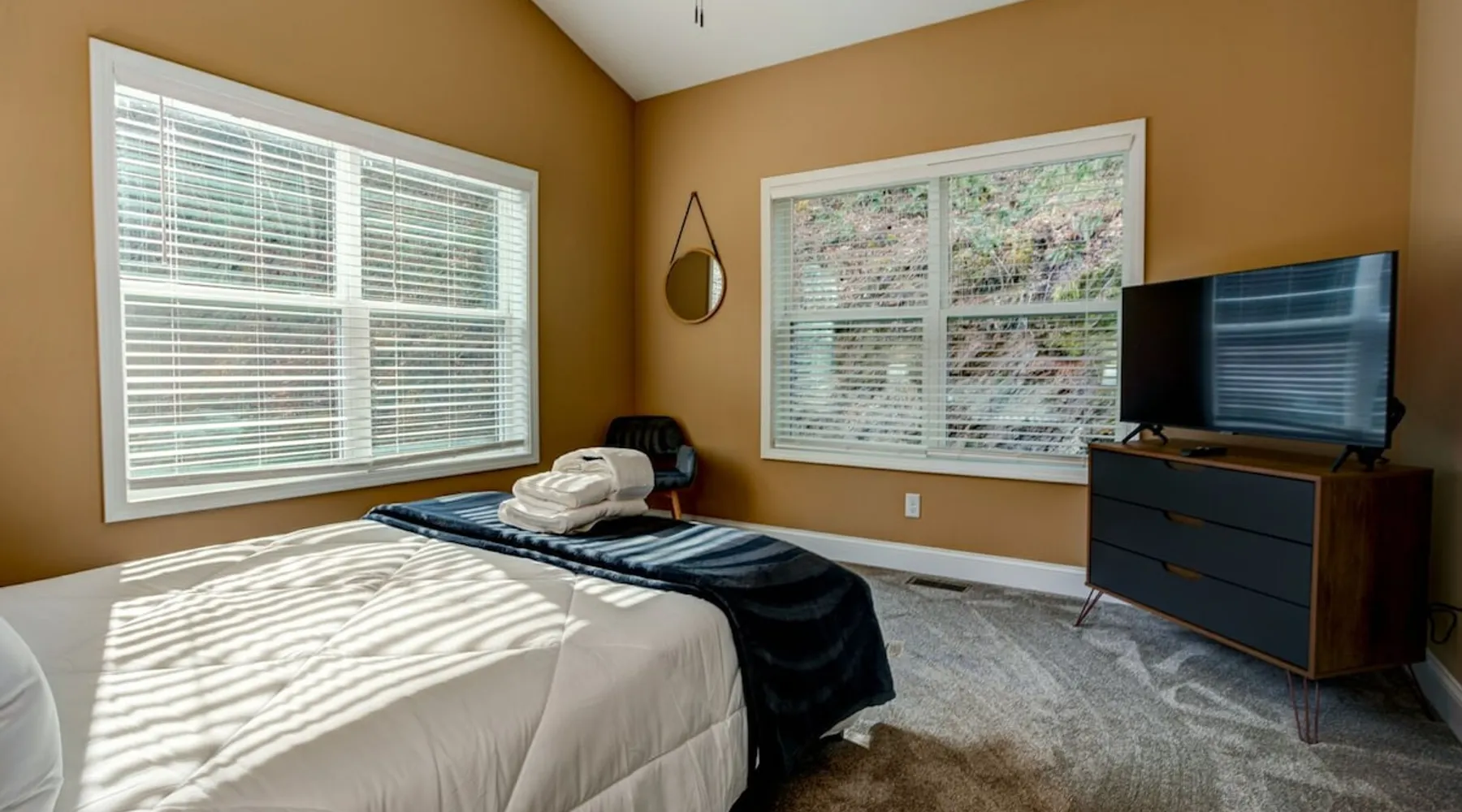Antler View Ridge provides just what the name suggests; a mountain escape, located "amidst the Blue Ridge Mountains", on what feels like your own private ridge, with long-range views that may just afford a peek at deer! Antler View Ridge is a one-of-a-kind mountain home experience.....a new Yonder gem, creating memories for a lifetime! This hidden mountain gem sits on a newly constructed homestead, in a private development, and offers both short & long-range mountain views year-round. The space Come escape to your own memorable vacation destination! Location: Private mountain retreat located in Waynesville, overlooking scenic mountain vistas, app. 10 minutes outside of downtown Waynesville, and only 40 minutes to downtown Asheville, 45 minutes to Asheville Regional airport, 40 minutes to the gates of Biltmore Estate. You are less than 10 minutes to the Blue Ridge Parkway, and under 20 minutes to the ski slopes and downtown Maggie Valley. Close to virtually everything. Accommodations: (Sleeps 6-8) 3 bedroom, 2 full baths Occupancy Summary / Sleeps in beds: 6 Max. Occupancy: 8 (PLEASE NOTE: we provide linens for all beds; other occupancy will require guests providing their own linens.) Description: Welcome to Antler View Ridge! Yet another spectacular vacation rental hitches its wagon to our portfolio of luxury mountain rentals! And everyone has raved about their vacations ever since! This splendidly situated, and newly constructed mountain home has been built and outfitted with the goal of entertaining travelers for years, as they flock to experience the wonder that is the Blue Ridge mountains. Escape to greater Asheville and the Waynesville area to discover Antler View Ridge. This private mountain retreat offers an escape from the daily grind, complete with an expansive front porch overlooking the Appalachian Mountains! A true mountain home with modern updates & amenities; you will be relaxed by the mountain craftsman inspired accents, featuring an open living space surrounding you with the warmth of wood, offering a calming atmosphere with natural elements all around. The fireplace draws you to unwind and let all your cares float away, as you share stories, break bread, and congregate after a day of exploring all that WNC has to offer tourists. A large front porch area offers the incredible views of the mountainous skyline that our mountains are known for, and the stunning Blue Ridge mountain vistas. Gather with some friends, family, or both, and celebrate, relax, and unwind together at Antler View Ridge. Enjoy a plethora of amenities, including privacy, wireless Internet access, a large stone fireplace for those chilly nights (year round), new central air conditioning for those warm days, wildlife sightings, and more! Extremely convenient to everything Waynesville, Asheville, Maggie Valley and the Blue Ridge Parkway; come enjoy the eclectic, artsy town that is the now world famous downtown Waynesville, venture out into the western North Carolina wilderness, stay in to enjoy this marvelous getaway, hop in the car for a short drive to Asheville, or simply do it all! Whatever you choose, you will relax and unwind in style at this luxurious private retreat! This spectacular vacation rental is located just outside downtown Waynesville and is approximately 40 minutes driving distance to downtown Asheville. You are just minutes from America's favorite scenic byway, The Blue Ridge Parkway, motorcycle touring, biking, hiking, white water rafting, rock climbing, kayaking, canoeing, zip lining, Segway tour…just about any outdoor activity! Or, take a quick ride up to downtown Asheville to enjoy the first-rate restaurants, shopping, galleries, spas, and entertainment. Exclusive Special: When you book Antler View Ridge you will receive a special code for discounted tickets to the Biltmore Estate! Contact us for more info. Bedroom/Bath Layout: 3 bedroom, 2 full baths Bedroom #1 – Main Level – Master Suite – King Bed – Private Full Bath (#1) Bedroom #2 – Main Level – Guest Room – Queen Bed – Hall Full Bath (#2) Bedroom #3 – Main Level – Guest Room – Queen Bed – Hall Full Bath (#2) Occupancy Summary / Sleeps in beds: 6 Max Occupancy: 8 (PLEASE NOTE: We provide linens for all beds; other occupancy will require guests providing their own linens.) New smart TV's in every bedroom Additional Rate and Fees information: We openly share our Cleaning Fees in a manner of full disclosure, as we think this is the most honest and forthright approach with respect to our guests. Our Cleaning Fees are backed by our Clean Guarantee, which reflects the highest level of standards, pristine environments for our guests, and a level of clean that surpasses any other vacation homes; we literally guarantee it! Processing fee Current local tax rate is 13% No Security Deposit / Guests are responsible for damages. Early Check In and/or Late Check Out may be possible, depending on cleaning schedules and other reservations. If it is possible, there may be an additional fee that would be determined based on the time that you wish to check in or out and the seasonal rates. Quiet Policy: Please note that the home is located in a very private, quiet and exclusive development. Parties, loud noise and unruly behavior are absolutely prohibited, and guests are expected to respect the neighbors and their development. Internet Speed: Download - 59.5 Mbps Upload - .65 Mbps Pets: Many of our guests have allergies so we have maintained a pet-free environment so they can enjoy their vacation without the potential of an allergic reaction. If you have a pet we can recommend some alternatives nearby. Please inquire for details regarding payment, the cancellation policy, military discounts, and trip insurance. Note: Reservations over 30 days are subject for review prior to acceptance. A separate rental agreement will be required for 90+ day stays. Last Minute Bookings: Reservations made within 7 days of check-in require ad