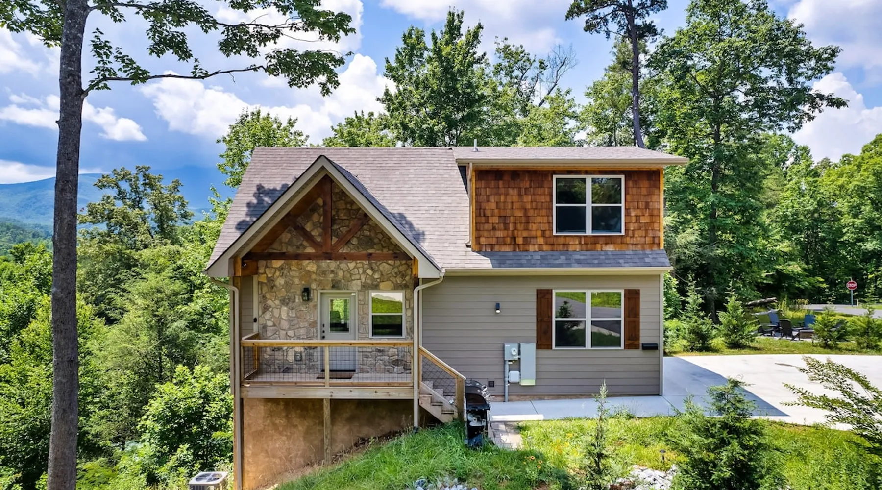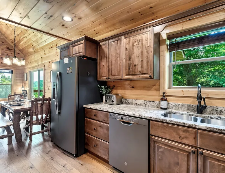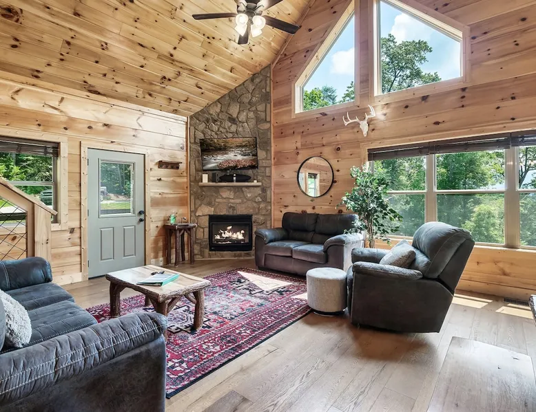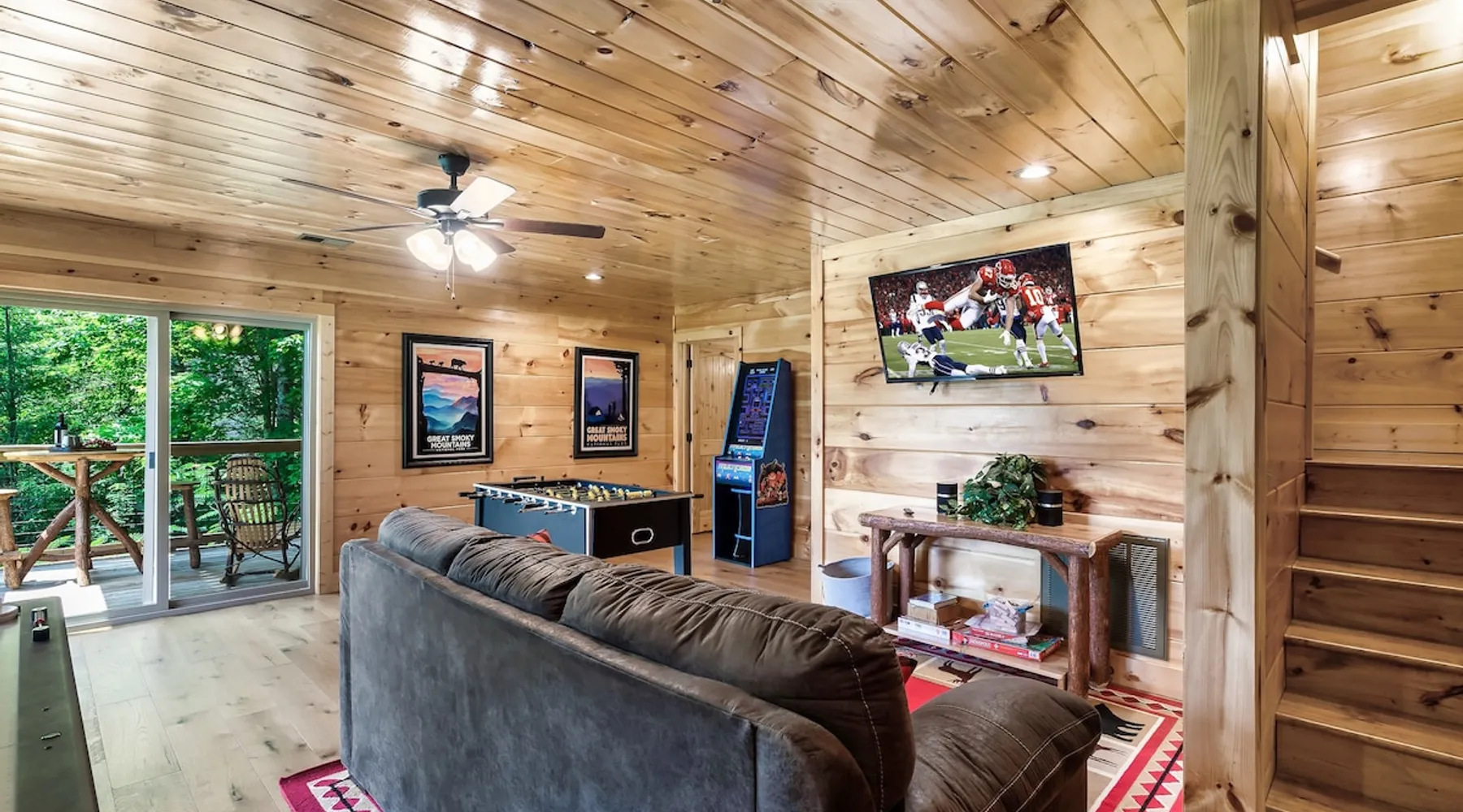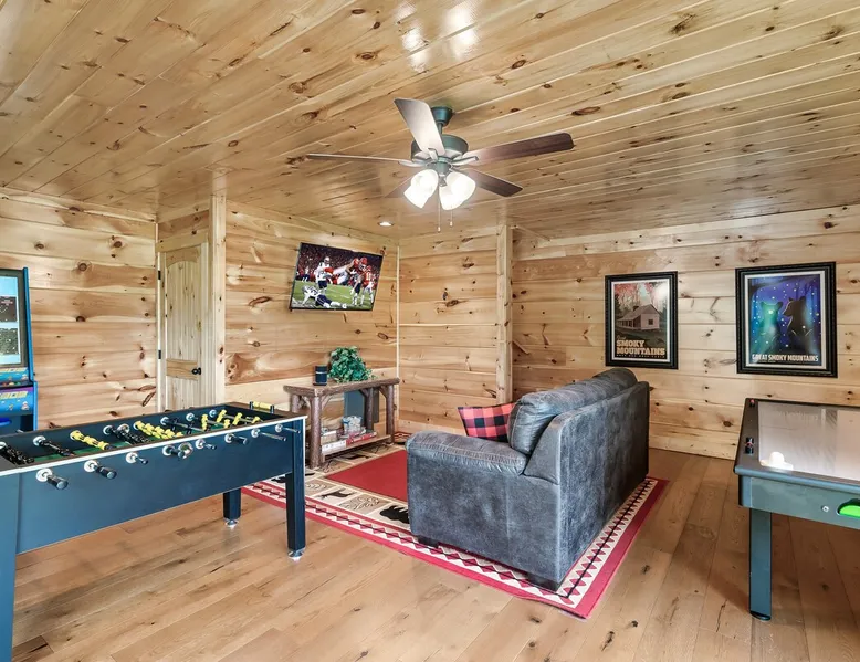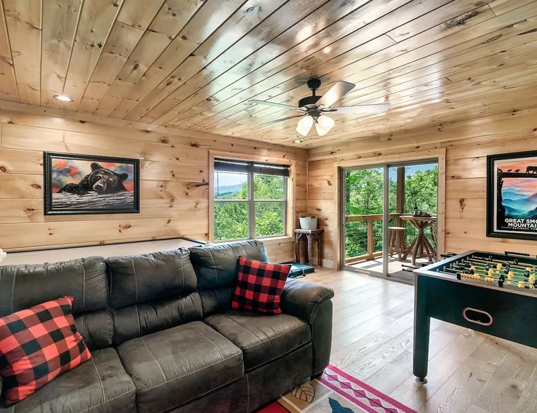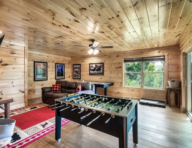 • LOCATION! centrally located in Gatlinburg • Breathtaking Mountain Views • Fire pit & Hot tub • 3 KING suites with their own en-suite bathroom (3 Bathrooms) • Sleeps up to 10 guests • Pet friendly • Game Room with air hockey table, foosball table, arcade games • 8 minutes to downtown Gatlinburg restaurants, shops & attractions • 15 minutes to the Great Smoky Mountains National Park entrance • 20 minutes to Pigeon Forge & Dollywood • Paved roads / No winding roads The space This modern mountain cabin built in 2020 features real stonework and cedar shakes Hardie boards. Perfect for families & groups of friends, everyone can spread out between an expansive Great Room with cathedral ceilings, an entertainment-packed game room, and two relaxing decks with dramatic mountain views. Follow us on FB or Insta: smokymoutainsretreats ► BEDROOMS This three-story cabin accommodates up to 10 guests between the three bedrooms (one on each level) and two queen-size sleeper sofas (one in the living room and one in the game room). You will find a TV in every room. Upper floor: Master Bedroom with a King size bed & en-suite bathroom – sleeps 2 Main floor: Master Bedroom with a King size bed & en-suite bathroom – sleeps 2 Lower floor: Master Bedroom with a King size bed & en-suite bathroom– sleeps 2 Great room: Queen-size sleeper Sofa – sleeps 2 Game room: Queen-size sleeper Sofa – sleeps 2 See pictures of the floor plan in the listing (last pictures). ► KITCHEN The kitchen is equipped with all the cookware, cutlery, and appliances you need to prepare delicious meals during your stay. Refrigerator, stove, microwave, dishwasher, toaster, blender, tea kettle, Crockpot, Keurig Duo with carafe & single serve pod coffee maker. The dining table comfortably seats eight. ► OUTDOOR GRILL There is a private Gas Grill. We provide the Propane Gas. ► OUTDOOR SPACE After a day of hiking and sightseeing, you have a lot of options to chill: *relax by the fire pit *soak in the private hot tub *kick back in the rocking chairs and enjoy the fresh mountain breeze and impressive views towards Mt. LeConte. ► FIRE PIT Our private fire pit is located right by the cabin and offers nice Mountain views. There are 6 outdoor chairs. If you plan on using the fire pit, just remember to bring some fire wood (you can find this at the supermarket next door if needed - 5 min drive). ► GAME ROOM You, your family and guests will love playing in the game room outfitted with an air hockey table, foosball table, video arcade games, and a home theater area for movie nights. There is also an assortment of board games. ► PETS We are a pet friendly cabin and you can bring up to 3 dogs as long as they are house broken/potty trained. We welcome all breeds of dogs and have no restrictions on weight. The pet fee is $175 for the whole stay for up to 3 dogs (the fee is not per dog). ► INTERNET/CABLE High Speed Wireless Internet Smart TVs in the living room/game room as well as in each bedrooms. ► LAUNDRY Full size washer and dryer. ► AMENITIES Our cleaning service provides start-up supplies including: paper towels, dish soap, dish washer soap, kitchen trash can liners, toilet paper, hand soap and bathroom trash liners. Depending on the length of your stay, you may need to purchase additional items when the initial supply runs out. ► PRIVATE PARKING Flat parking for up to 4 vehicles in the driveway. ► ENTRY The front door is equipped with an electronic keypad, we will send a personalized door code. ► SMOKING No Smoking indoors. You can smoke on the decks though. *** Please favorite the property by clicking "save" or "heart shape" in the upper right-hand corner, this will help you find it again and share with others *** Guest access Guests will enjoy the entire cabin/private hot tub/private fire pit. Other things to note For security reasons, we have placed 2 outside cameras, one is located on the entry porch facing the entrance door and one is located facing the fire pit/street. Ring cameras in place and actively recording. Ring cameras are activated by motion and will record anyone that walks in front of them. These recordings are saved and can be reviewed and shared with the booking platform. If we believe that house rules are being violated, we have the ability to access these cameras in real time. Please remember that you are staying in our home away from home. Please treat our cabin with respect. "Out of our control" problems could arise, please note we will do everything in our power to resolve any issue ASAP, as your comfort means everything to us.
