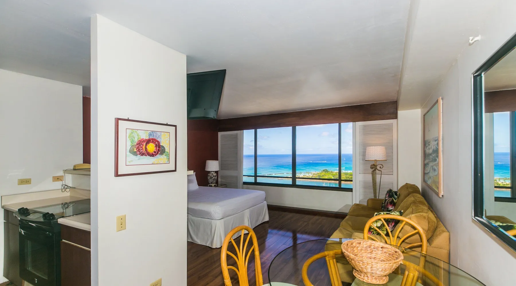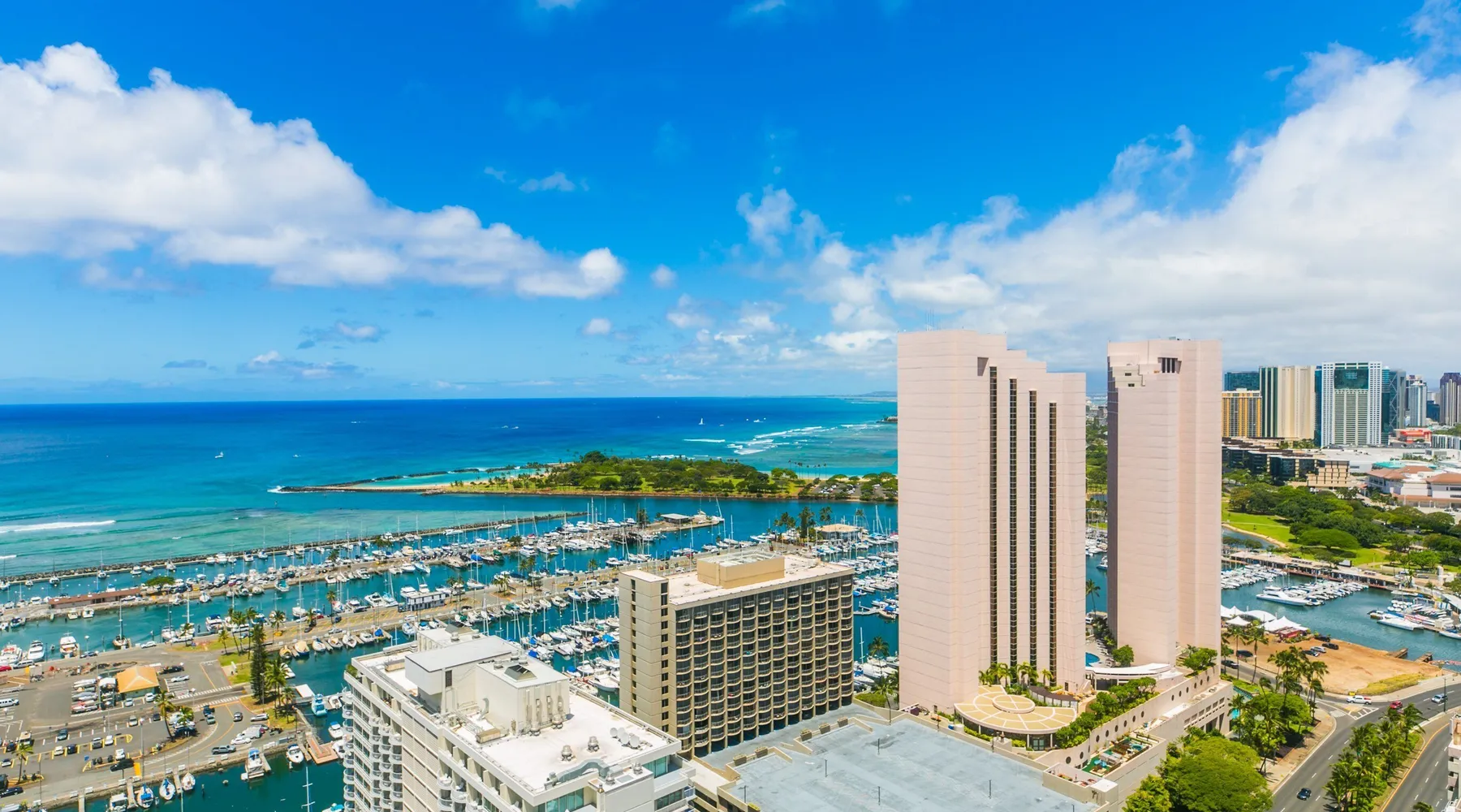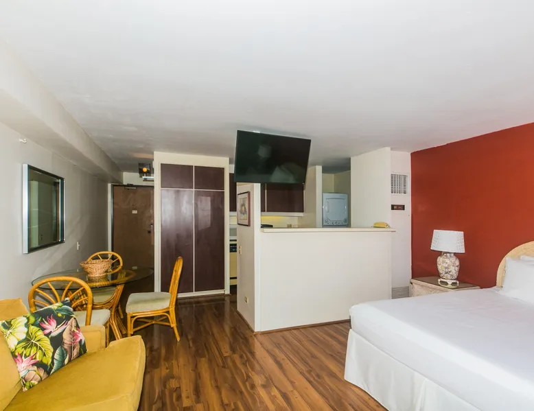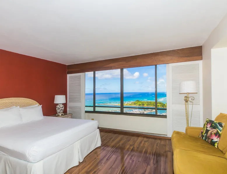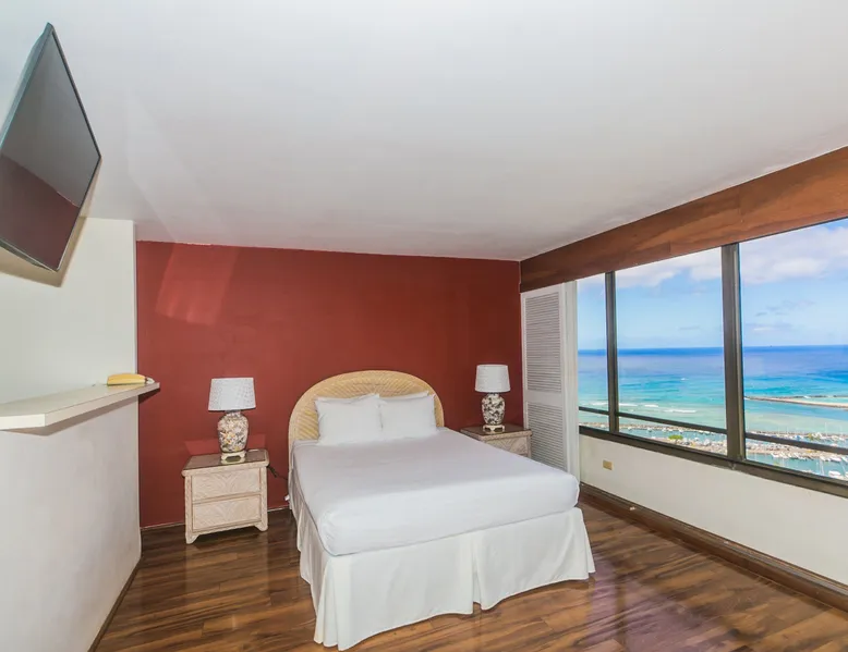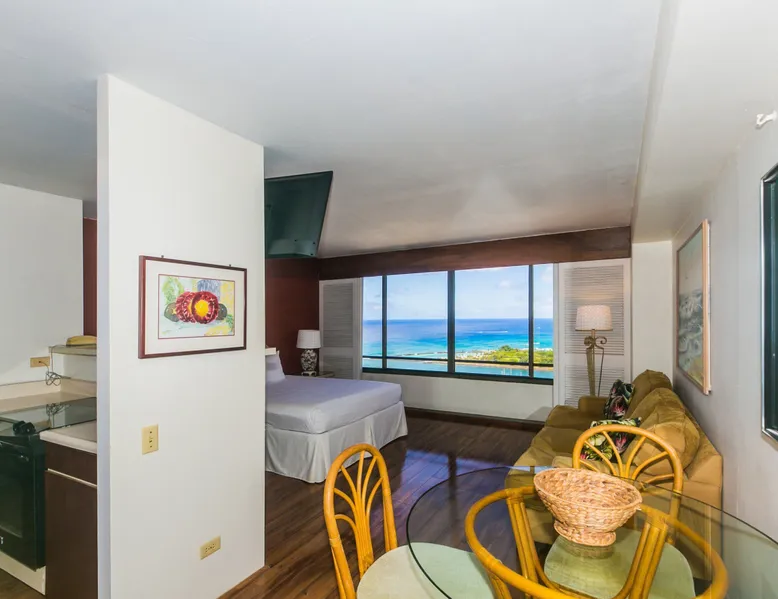 Enjoy the best of city living with scenic ocean views in this inviting studio on the 37th floor of Discovery Bay. Just steps from the beach, this spacious studio offers both comfort and convenience in the heart of Honolulu. Large windows showcase panoramic views of the city and ocean, creating a serene backdrop for your stay. Inside, you'll find a thoughtfully designed open layout with a comfortable seating area, a well-equipped kitchen, and generous storage space. Ideally situated near top attractions, dining, and shopping, this studio is the perfect home base for your island adventure. KITCHEN - Full Size Refrigerator - Cooktop/Oven - Dishwasher - Microwave - Washer/Dryer - Dinnerware, Glassware, Silverware, Cookware, Coffee Maker, Rice Cooker, Blender, Kettle Provided LIVING AREA/BEDROOM - Flat screen Smart TV - Sofa - Dining table seating for 3 - Queen Bed - Central AC BATHROOM - Tub Shower - Toilet - Hair Dryer 1-assigned parking stall included with the rental. AMENITIES Your stay includes cable TV, high-speed internet with password-protected WiFi, and local phone service. We provide a starter kit of essentials, which includes liquid dish soap, a dishwashing packet, a kitchen sponge, trash liners, a roll of paper towels, coffee, condiment packets, travel-size shampoo, conditioner, body lotion, soap, facial tissue, and an extra roll of toilet paper. Please note we do not replenish these items once the starter set is depleted. Each bathroom is equipped with 4 sets of towels, and blankets can be found in each bedroom closet. We are delighted to provide beach towels for your stay. Please ensure they are returned to the room at check-out. If they are not, a $10 fee per towel may be applied to your account. Housekeeping services available for an additional fee. BUILDING AMENITIES The property consists of two 40-story towers, connected by an 11th-floor recreation deck. The deck features an outdoor swimming pool, jacuzzi, fitness center, and sunbathing area. A BBQ area is available on the 5th floor. The building offers secured entry and 24/7 security for added safety and convenience. Marina Hawaii Vacations has been providing fully furnished condo rentals to travelers since 1965. Book with confidence, as we offer only legal vacation rentals in Waikiki and the surrounding areas. Plus, you'll save when you book directly with us! Please note that the condos are privately owned, and construction or building maintenance may occur during your stay. While owners have no control over external work or noise, construction is typically limited to Monday–Friday from 8:00 AM to 4:30 PM, with no work on weekends or holidays. Most guests experience little to no disruption, as they are often out exploring the island, enjoying the beaches, shopping, or participating in activities. If you have any concerns, please contact a vacation rental specialist with Marina Hawaii Vacations