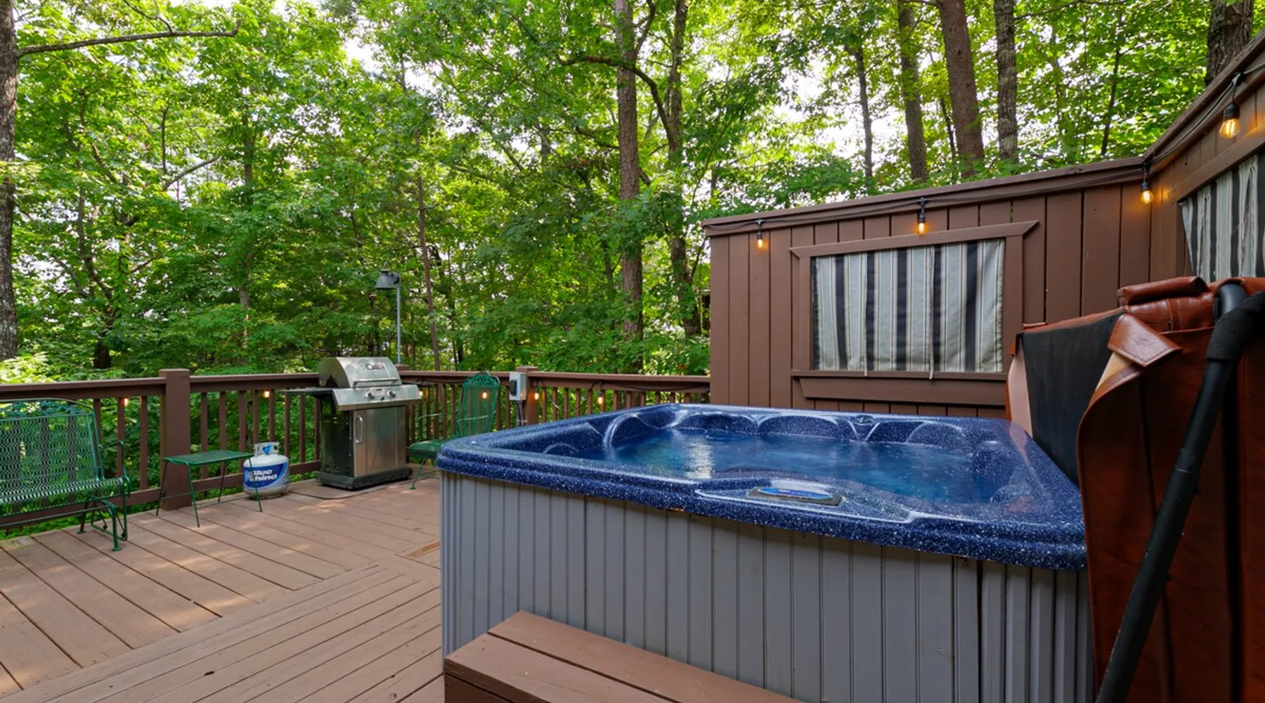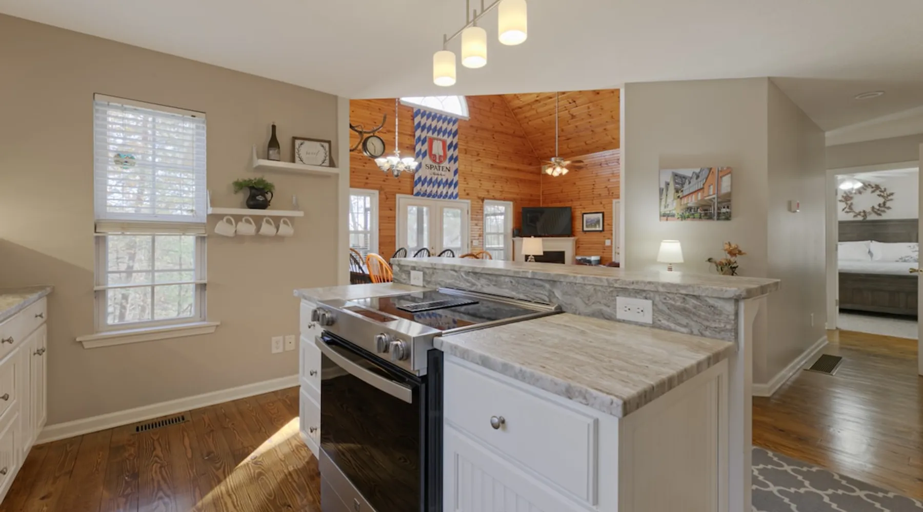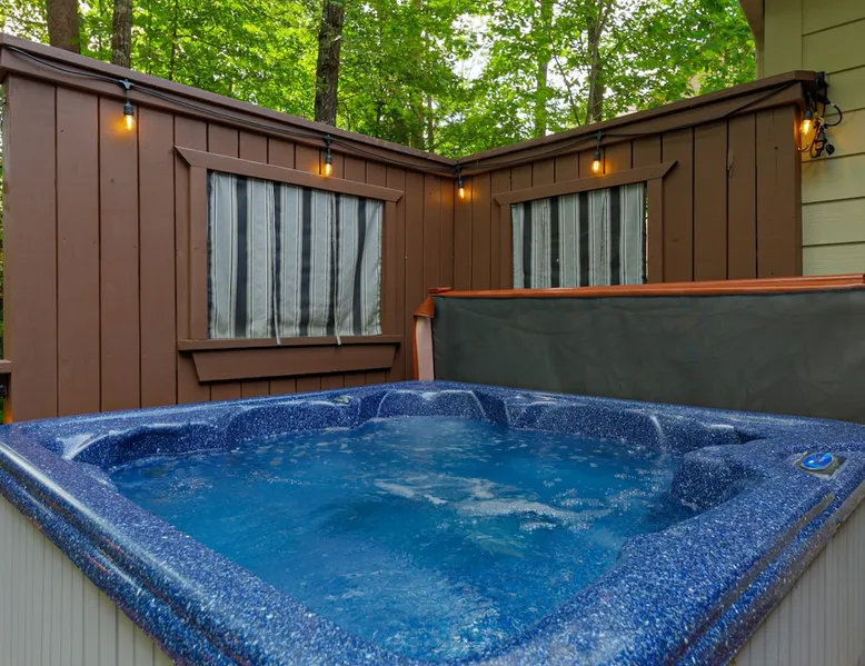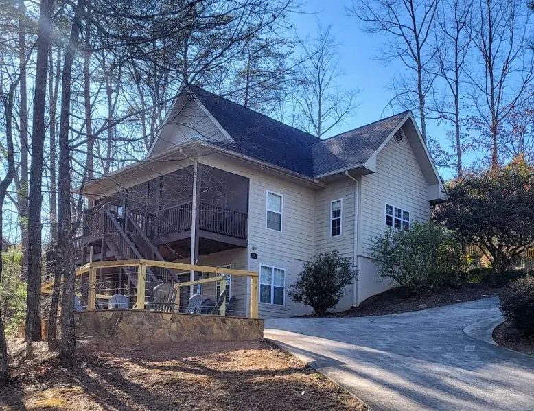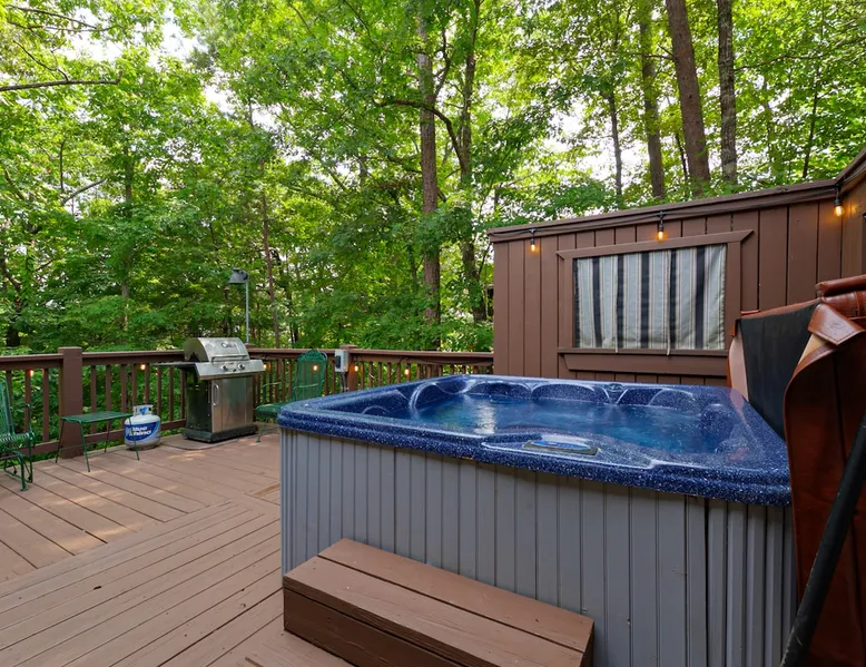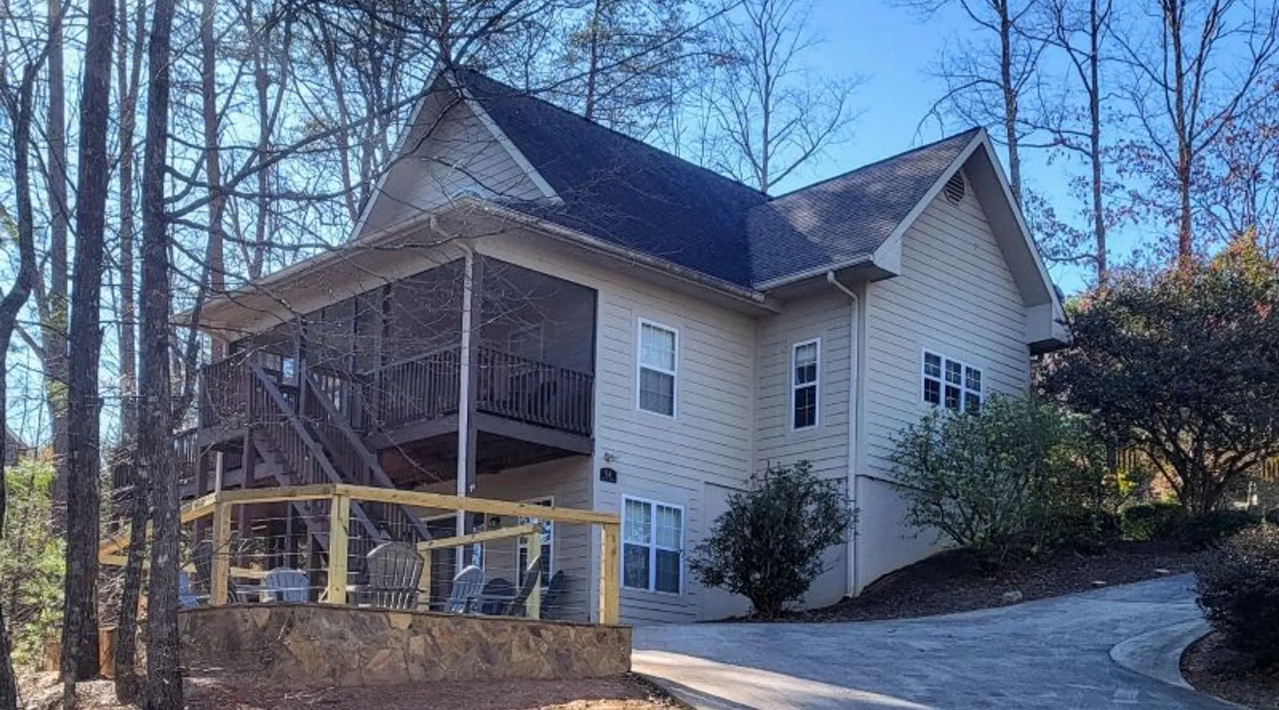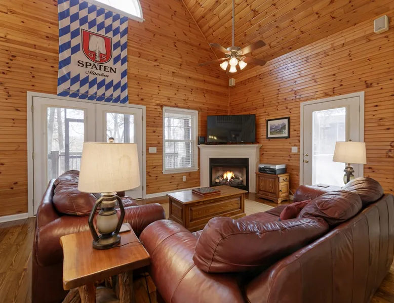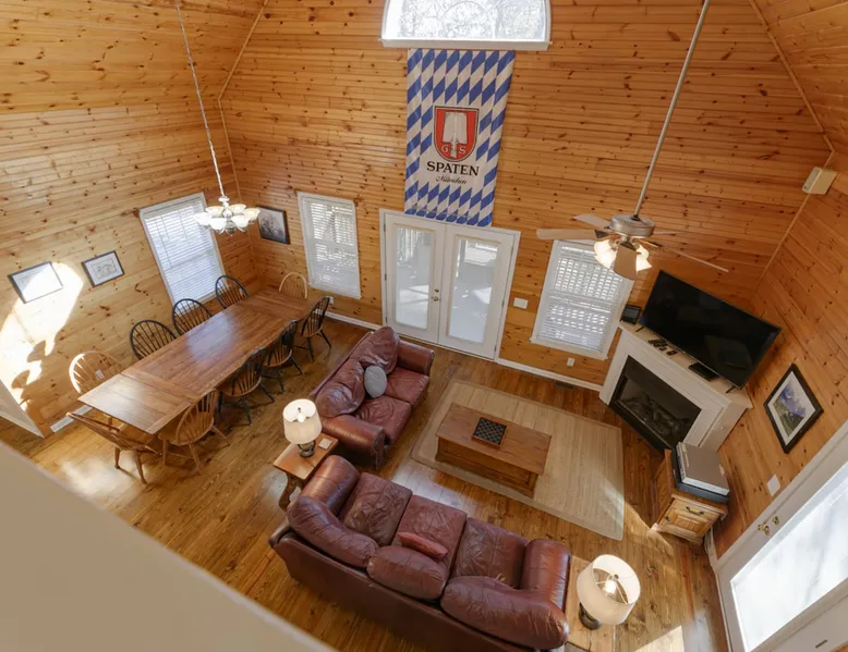 Rest and Be Thankful" Cabin offers the perfect getaway for your family in the North Georgia Mountains. Nestled in Innsbruck Golf Resort, it's just a short drive from Helen's attractions. This spacious retreat boasts a modern rustic design, well-appointed kitchen, hardwood floors, open layout, fast WiFi, and multiple levels for family enjoyment. Accommodating multi-level home with a modern rustic vibe. The space “Rest and Be Thankful” Cabin is the ideal destination for your family’s next trip to the North Georgia Mountains! This spacious 5 bedroom / 4 bathroom home is located in Innsbruck Golf Resort, a short drive from all of Helen’s most popular attractions. Innsbruck Golf Resort offers a variety of amenities gated privacy, 18-hole golf, a rooftop bar, and spa. The space features a modern rustic design, beautifully designed kitchen, hardwood floors, open floor plan, fast WiFi throughout the home, and multiple levels for the family to enjoy. The main level boasts a fully-equipped kitchen, spacious great room with living room and dining area, and a porch with both open and screened-in areas. The kitchen is beautifully designed with new stainless steel appliances, granite countertops, subway tile backsplash, and a large island with a bar and built-in stove/range combo. The living room has an impressive wood vaulted ceiling, a gas fireplace to keep everyone toasty, and comfortable leather couches for the family to relax on. You can also easily access the deck for BBQing on the gas grill or relaxing in the hot tub under the string bulb lights In addition to the accommodating main level, both upper and lower levels add more space for the family to spread out. The upper level features a loft with a bird’s eye view of the great room and an entertainment center with a Playstation 3 for the kids to play. Right next to the loft common area is the kids’ guest bedroom with 2 twin beds and a full bathroom. The lower level features a family and game room combo along with 2 full bedrooms and baths.