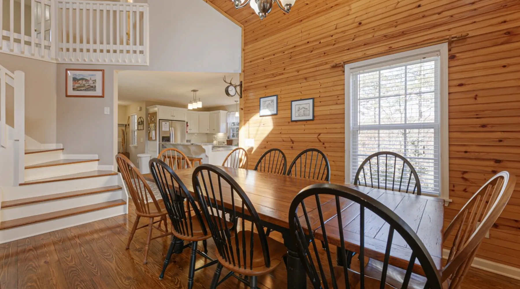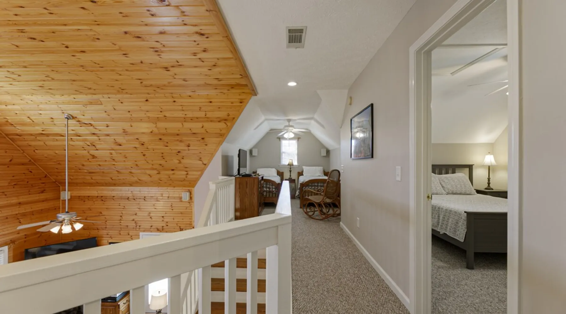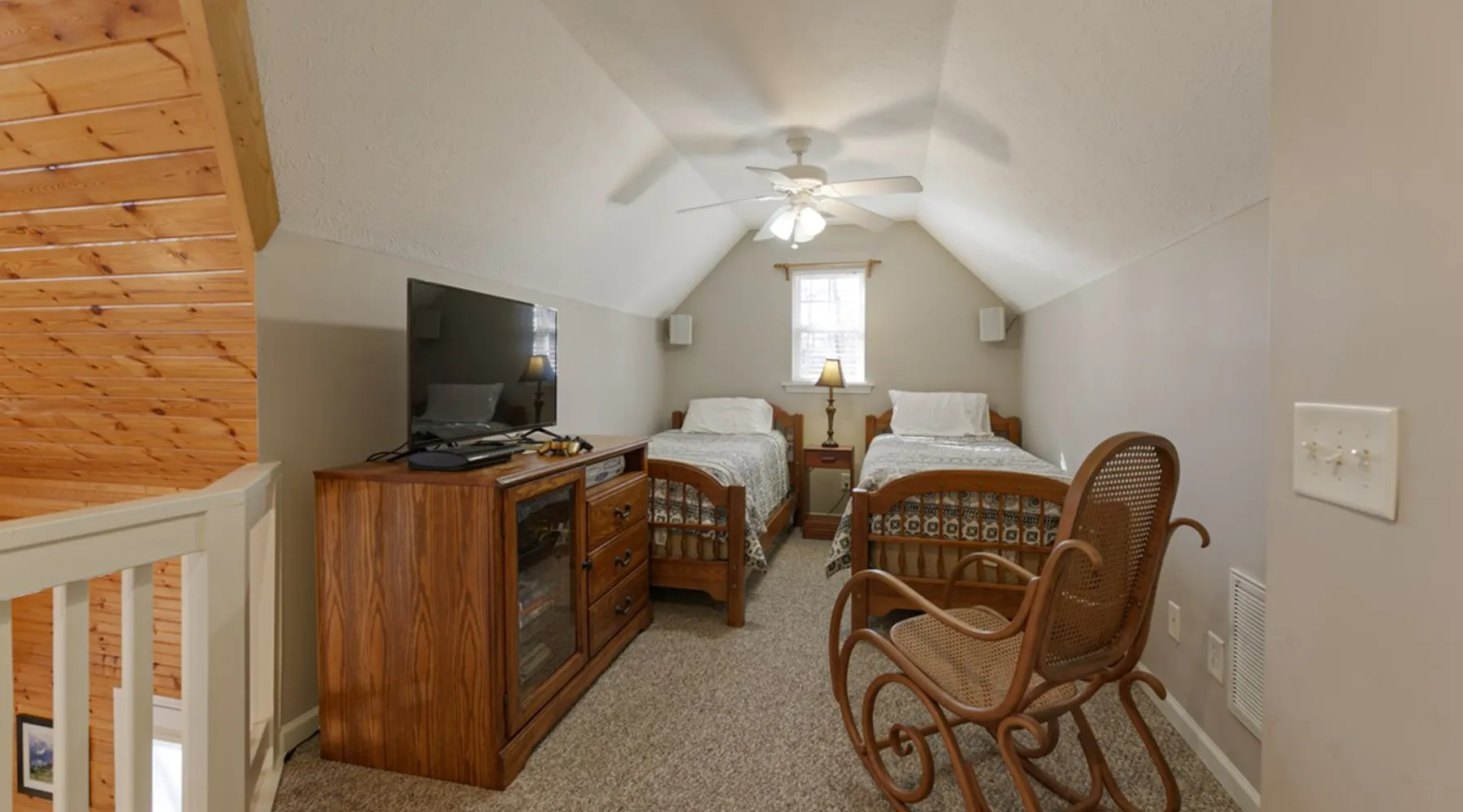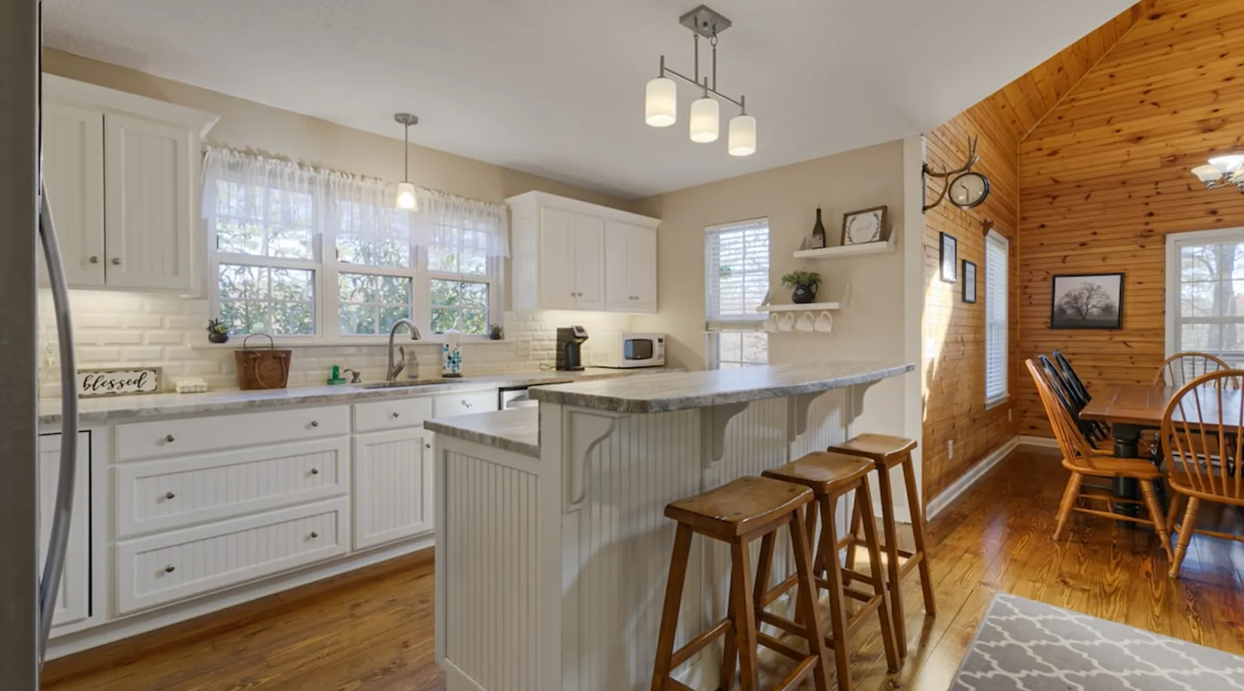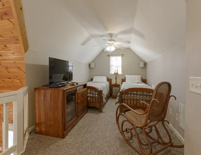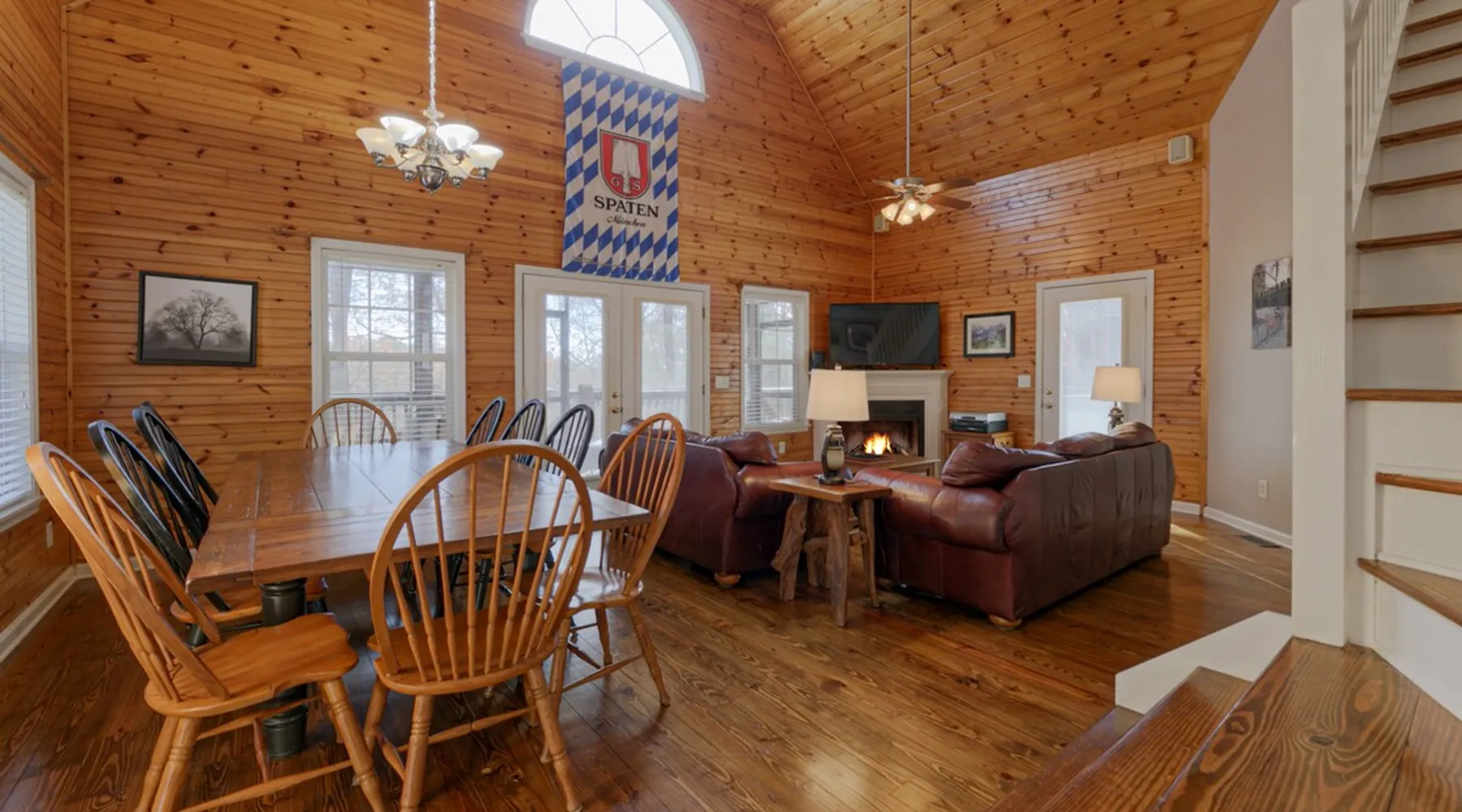 Rest and Be Thankful" Cabin offers the perfect getaway for your family in the North Georgia Mountains. Nestled in Innsbruck Golf Resort, it's just a short drive from Helen's attractions. This spacious retreat boasts a modern rustic design, well-appointed kitchen, hardwood floors, open layout, fast WiFi, and multiple levels for family enjoyment. Accommodating multi-level home with a modern rustic vibe. The space “Rest and Be Thankful” Cabin is the ideal destination for your family’s next trip to the North Georgia Mountains! This spacious 5 bedroom / 4 bathroom home is located in Innsbruck Golf Resort, a short drive from all of Helen’s most popular attractions. Innsbruck Golf Resort offers a variety of amenities gated privacy, 18-hole golf, a rooftop bar, and spa. The space features a modern rustic design, beautifully designed kitchen, hardwood floors, open floor plan, fast WiFi throughout the home, and multiple levels for the family to enjoy. The main level boasts a fully-equipped kitchen, spacious great room with living room and dining area, and a porch with both open and screened-in areas. The kitchen is beautifully designed with new stainless steel appliances, granite countertops, subway tile backsplash, and a large island with a bar and built-in stove/range combo. The living room has an impressive wood vaulted ceiling, a gas fireplace to keep everyone toasty, and comfortable leather couches for the family to relax on. You can also easily access the deck for BBQing on the gas grill or relaxing in the hot tub under the string bulb lights In addition to the accommodating main level, both upper and lower levels add more space for the family to spread out. The upper level features a loft with a bird’s eye view of the great room and an entertainment center with a Playstation 3 for the kids to play. Right next to the loft common area is the kids’ guest bedroom with 2 twin beds and a full bathroom. The lower level features a family and game room combo along with 2 full bedrooms and baths.