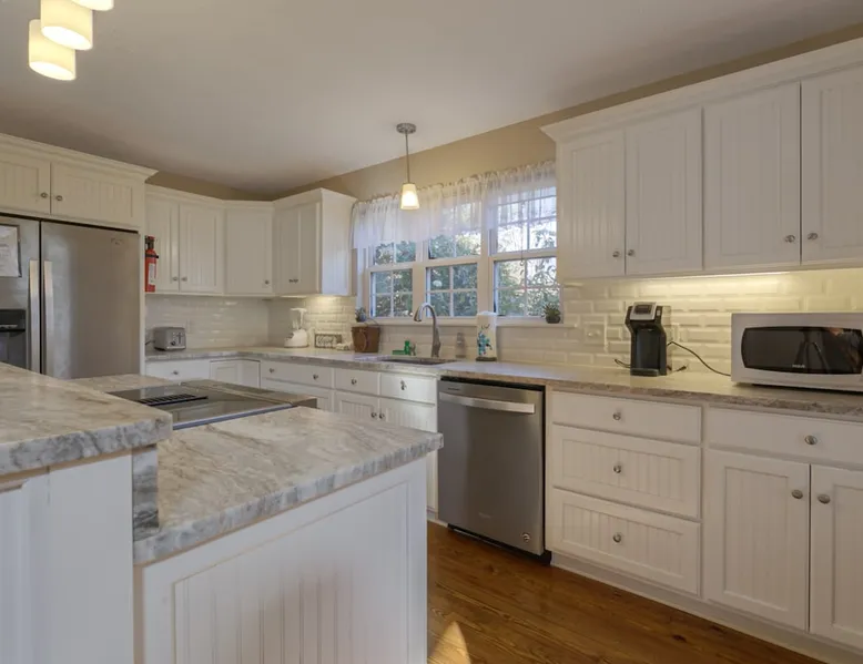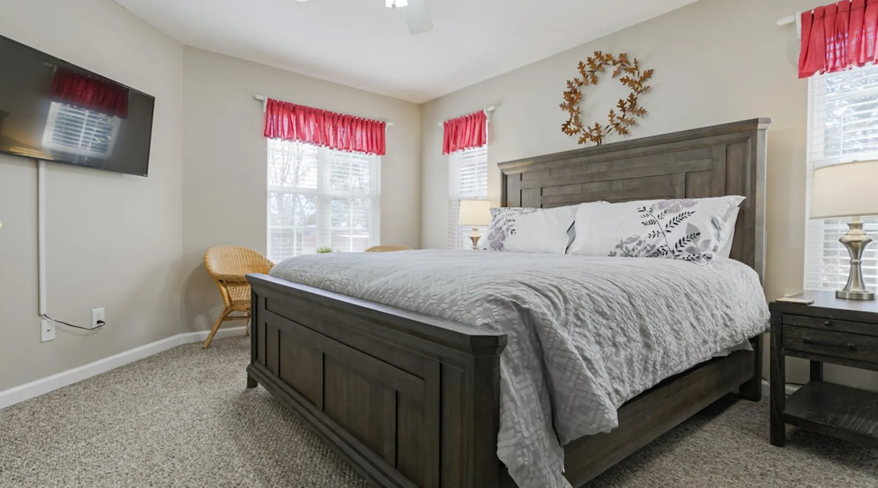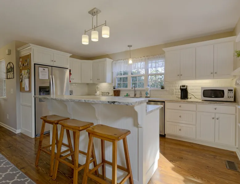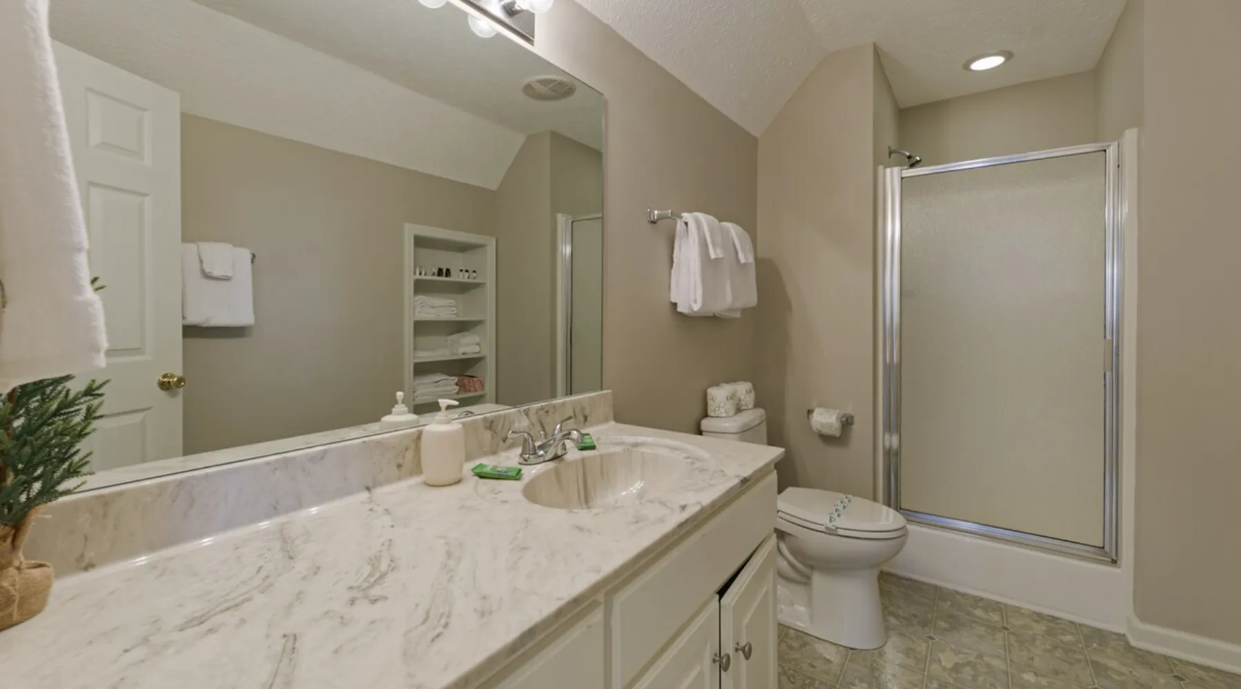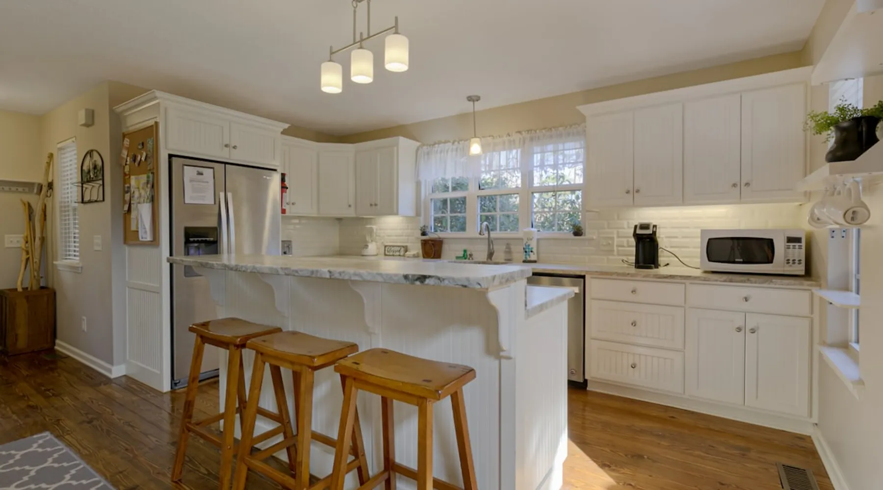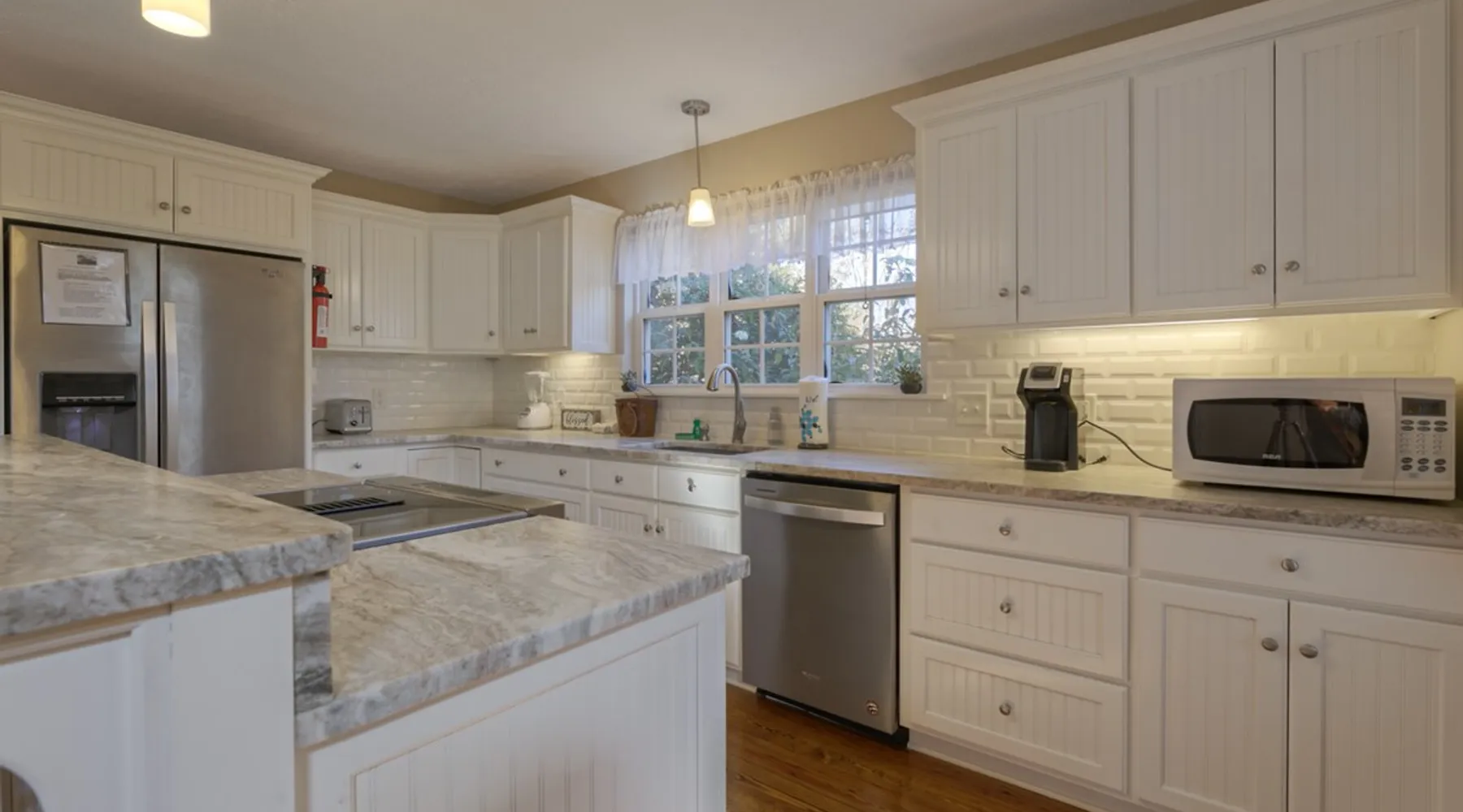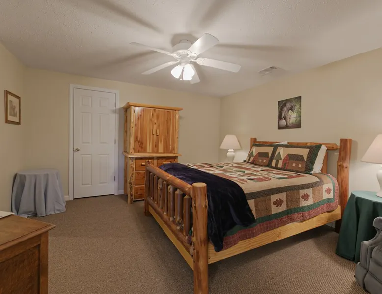 Rest and Be Thankful" Cabin offers the perfect getaway for your family in the North Georgia Mountains. Nestled in Innsbruck Golf Resort, it's just a short drive from Helen's attractions. This spacious retreat boasts a modern rustic design, well-appointed kitchen, hardwood floors, open layout, fast WiFi, and multiple levels for family enjoyment. Accommodating multi-level home with a modern rustic vibe. The space “Rest and Be Thankful” Cabin is the ideal destination for your family’s next trip to the North Georgia Mountains! This spacious 5 bedroom / 4 bathroom home is located in Innsbruck Golf Resort, a short drive from all of Helen’s most popular attractions. Innsbruck Golf Resort offers a variety of amenities gated privacy, 18-hole golf, a rooftop bar, and spa. The space features a modern rustic design, beautifully designed kitchen, hardwood floors, open floor plan, fast WiFi throughout the home, and multiple levels for the family to enjoy. The main level boasts a fully-equipped kitchen, spacious great room with living room and dining area, and a porch with both open and screened-in areas. The kitchen is beautifully designed with new stainless steel appliances, granite countertops, subway tile backsplash, and a large island with a bar and built-in stove/range combo. The living room has an impressive wood vaulted ceiling, a gas fireplace to keep everyone toasty, and comfortable leather couches for the family to relax on. You can also easily access the deck for BBQing on the gas grill or relaxing in the hot tub under the string bulb lights In addition to the accommodating main level, both upper and lower levels add more space for the family to spread out. The upper level features a loft with a bird’s eye view of the great room and an entertainment center with a Playstation 3 for the kids to play. Right next to the loft common area is the kids’ guest bedroom with 2 twin beds and a full bathroom. The lower level features a family and game room combo along with 2 full bedrooms and baths.