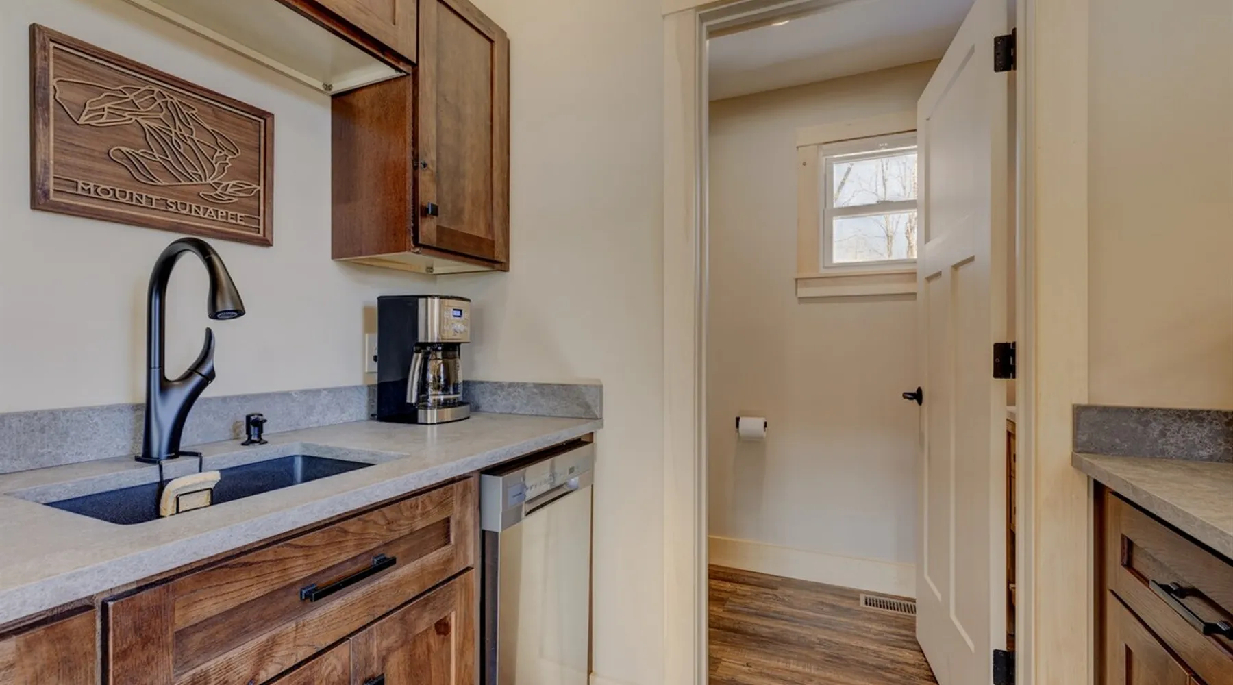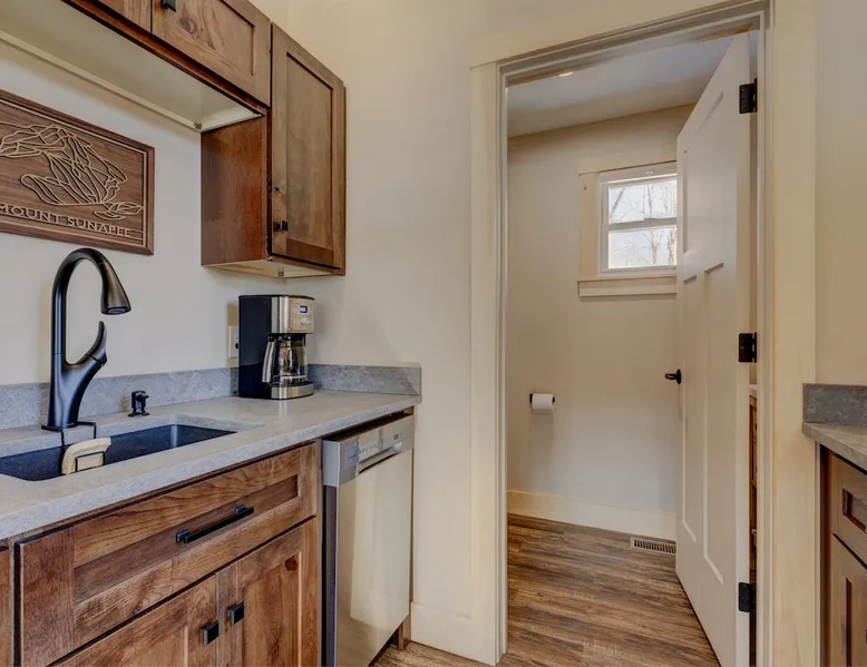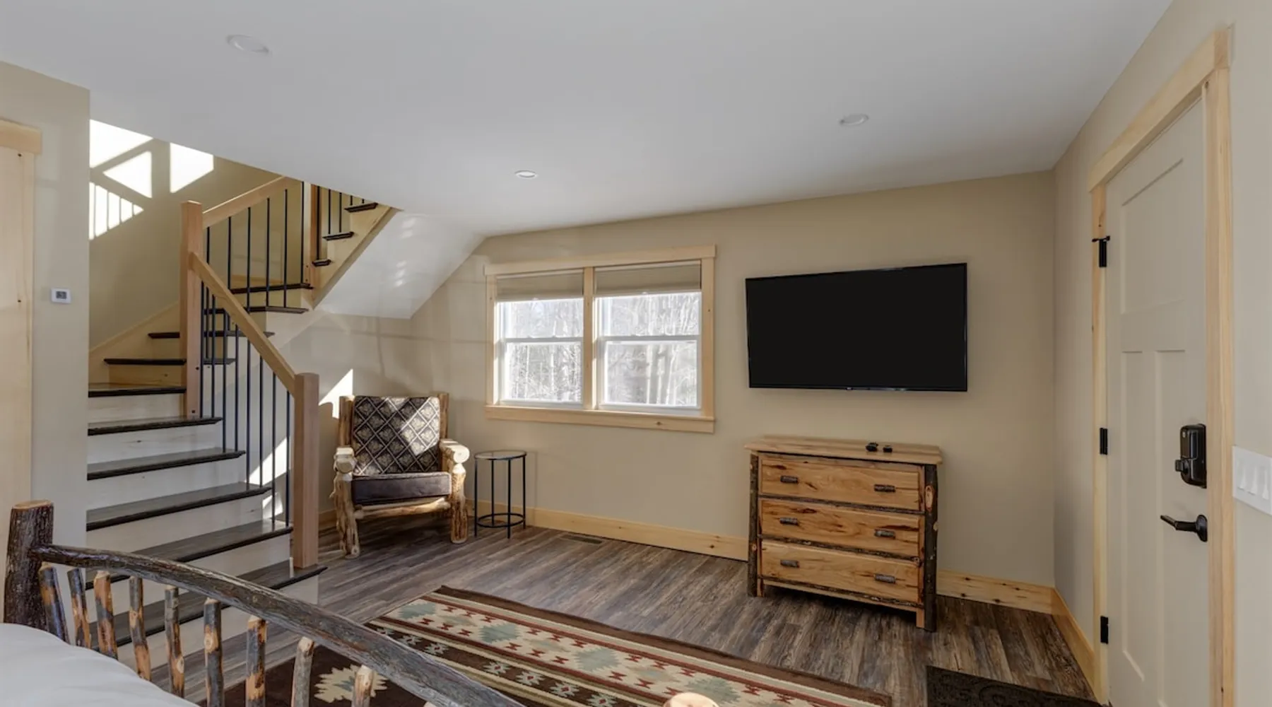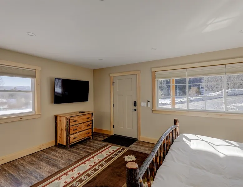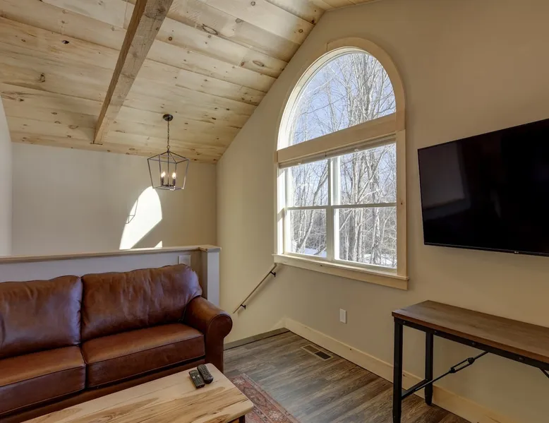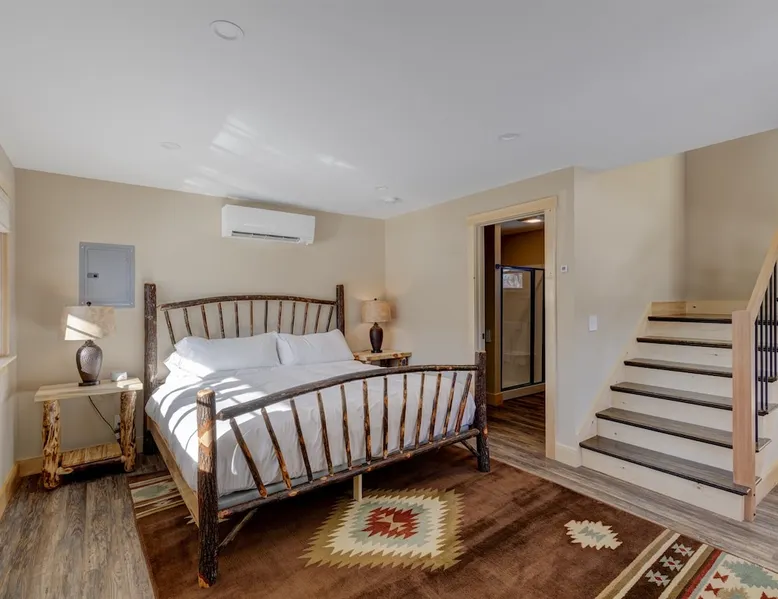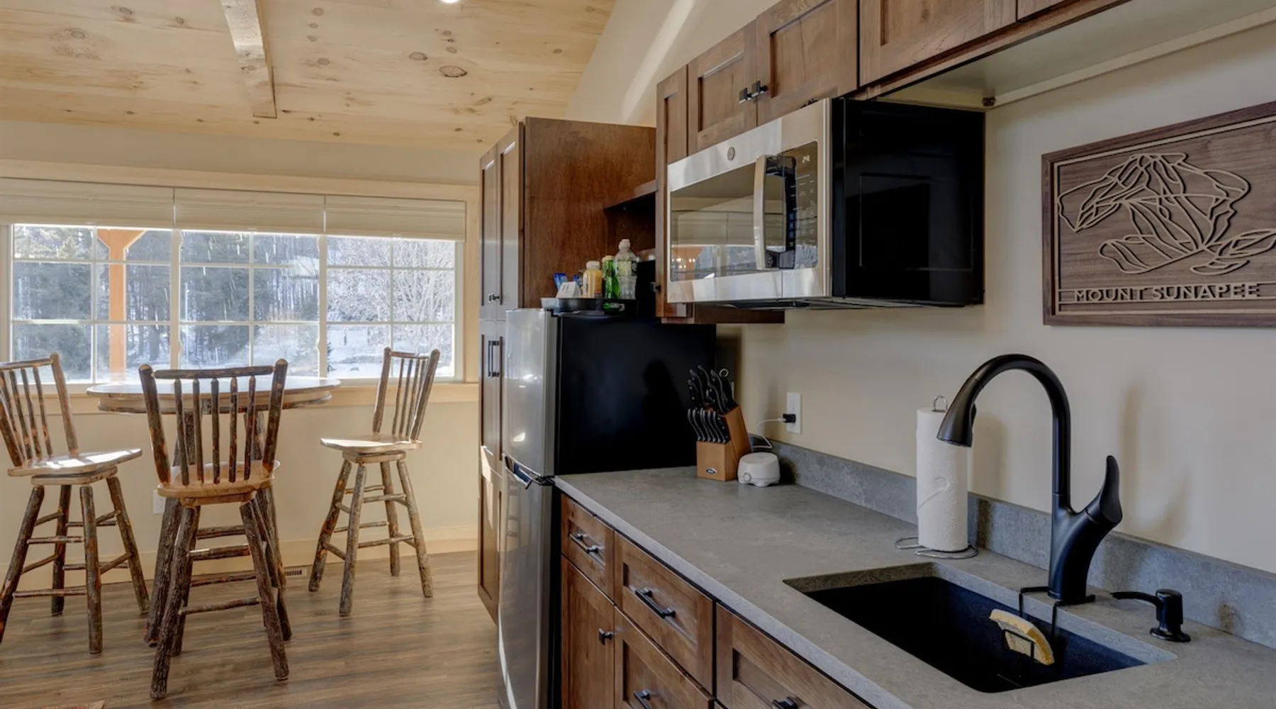 Relax in our inviting two-floor, 1-bedroom, 1.5-bath suite at The Lodge by Sunapee Stays, offering stunning views of Mount Sunapee right outside your door. This suite is one of eleven exceptional accommodations nestled in Sunapee, just minutes from Sunapee Harbor and less than 10 minutes from Mount Sunapee Resort. We welcome dogs, please inquire about our pet policy. A $100 fee per pet applies. The space This modern rustic two level suite features one bedroom, 1.5 bathrooms and a sofa bed. The hickory log furniture, shiplap vaulted ceilings and plush Adirondack style furnishings evoke relaxation after your day of adventures. The bathroom boasts a sanctuary of its own with pebble stone shower surrounded by subway tiles and your very own bidet toilet! On the lower level, you'll find the bedroom with king bed, Smart TV and ensuite full bathroom. On the upper level, you'll find the living area which includes a sofa bed, smart TV, half bathroom and kitchenette with all the amenities to eat in. Outside you'll find a semi-private patio complete with rocking chairs and a side table. There is a shared washer and dryer located on property. Guests can enjoy the two-floor game room, featuring a comfortable lounge area with classic and contemporary family games and a TV. The outdoor heated pool is open seasonally from Memorial Day through Columbus Day and is complemented by a community fire pit, grill, and cabana with a TV and outdoor seating, perfect for relaxing or gathering with family and friends after a day of adventure! Inquire about pet policy; 2 pets maximum allowed with $100 fee, 40lb maximum weight. In Room Amenities: King Bed Full Size Sleeper Sofa Kitchenette Microwave Refrigerator Flat Screen Smart TV (2) Complimentary High Speed Internet Cuisinart Double Induction Electric Cooktop Coffee Pot with Coffee Toaster Oven Plates, Glasses, Silverware, Cookware Hair Dryer Premium Bath amenities Private heating/air conditioning unit Access to washer/dryer Access to clothes steamer Guest access This is a 1 bed/1.5 bath suite and one of eleven suites at The Lodge by Sunapee Stays, each featuring a private entrance and keyless self check-in for your convenience. Your personalized check-in code will be provided seven days prior to your arrival.