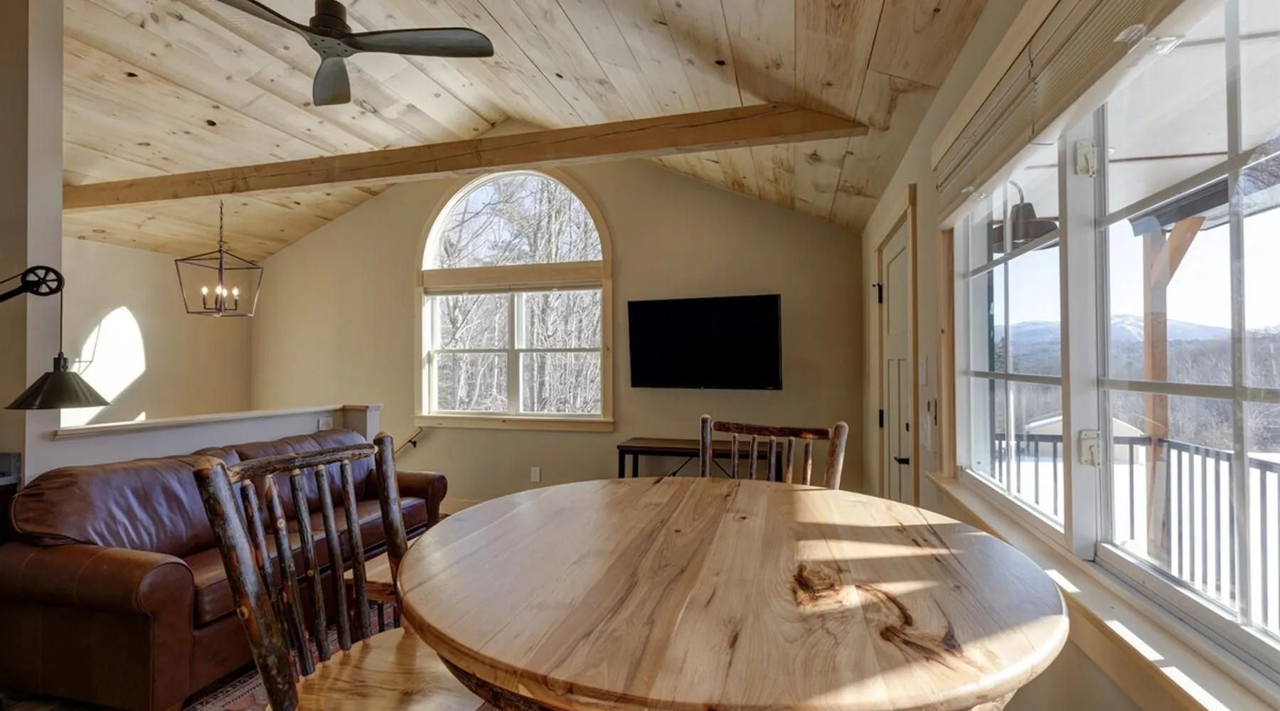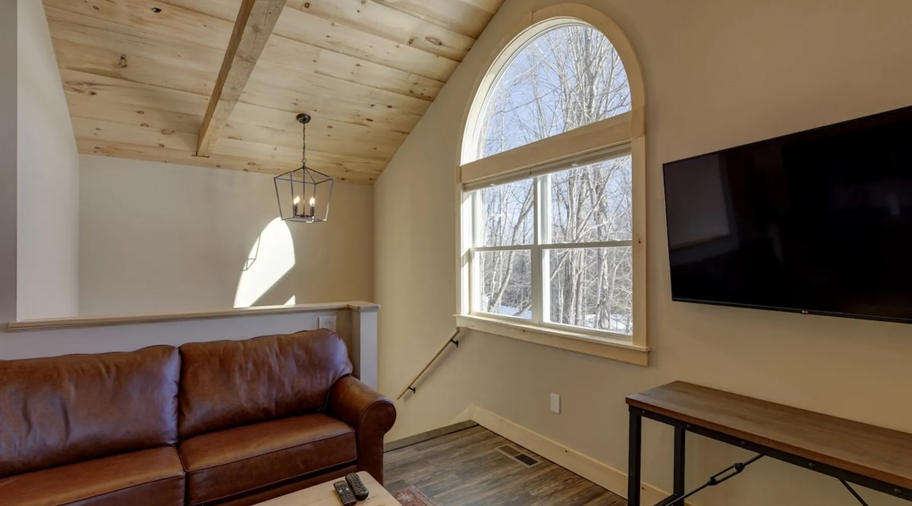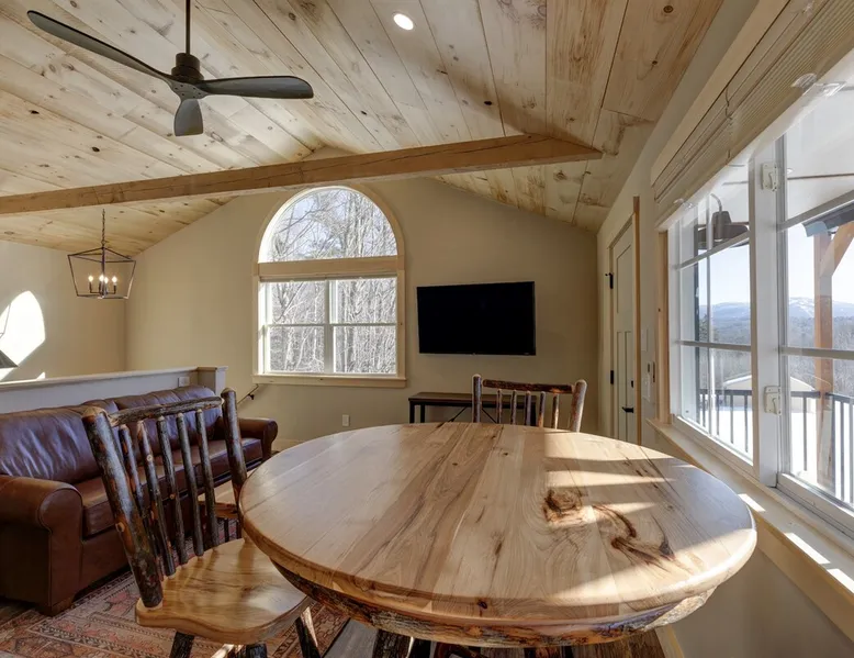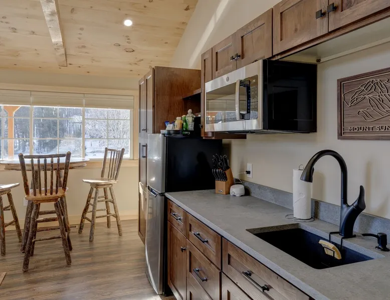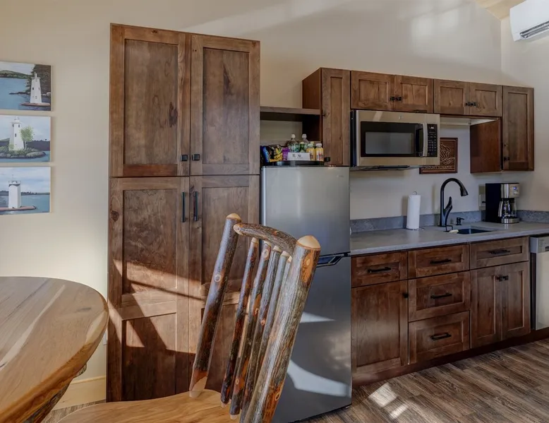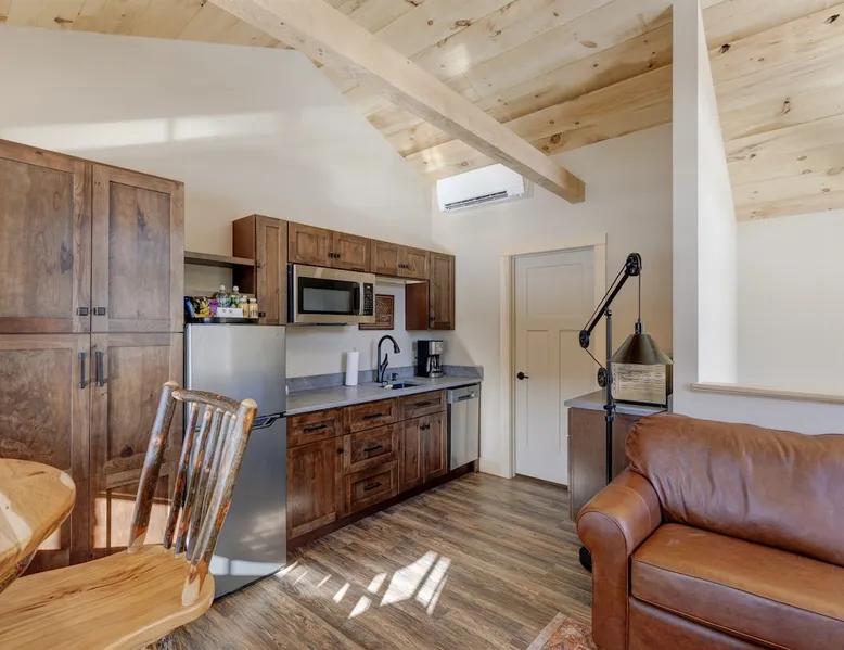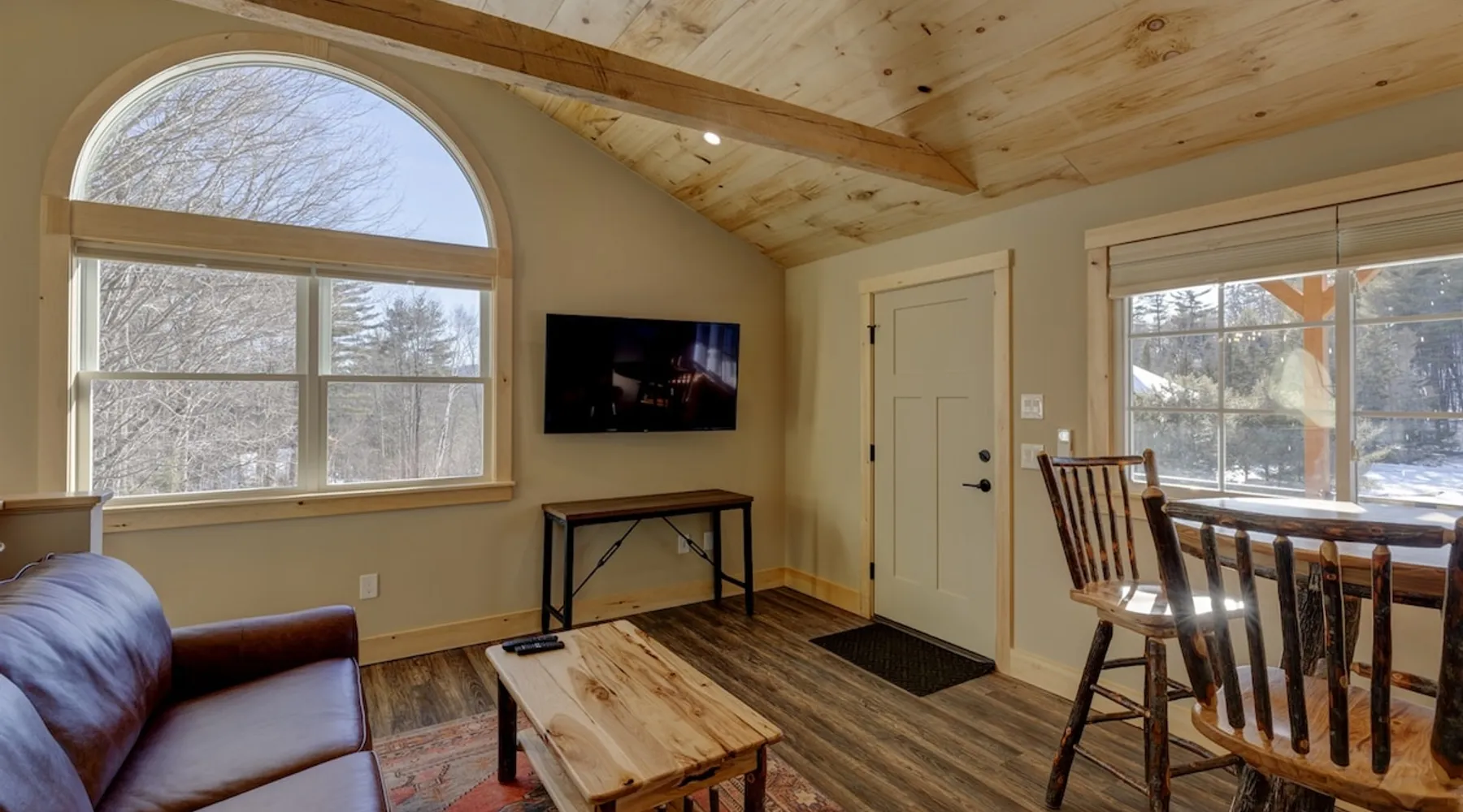 Relax in our inviting two-floor, 1-bedroom, 1.5-bath suite at The Lodge by Sunapee Stays, offering stunning views of Mount Sunapee right outside your door. This suite is one of eleven exceptional accommodations nestled in Sunapee, just minutes from Sunapee Harbor and less than 10 minutes from Mount Sunapee Resort. We welcome dogs, please inquire about our pet policy. A $100 fee per pet applies. The space This modern rustic two level suite features one bedroom, 1.5 bathrooms and a sofa bed. The hickory log furniture, shiplap vaulted ceilings and plush Adirondack style furnishings evoke relaxation after your day of adventures. The bathroom boasts a sanctuary of its own with pebble stone shower surrounded by subway tiles and your very own bidet toilet! On the lower level, you'll find the bedroom with king bed, Smart TV and ensuite full bathroom. On the upper level, you'll find the living area which includes a sofa bed, smart TV, half bathroom and kitchenette with all the amenities to eat in. Outside you'll find a semi-private patio complete with rocking chairs and a side table. There is a shared washer and dryer located on property. Guests can enjoy the two-floor game room, featuring a comfortable lounge area with classic and contemporary family games and a TV. The outdoor heated pool is open seasonally from Memorial Day through Columbus Day and is complemented by a community fire pit, grill, and cabana with a TV and outdoor seating, perfect for relaxing or gathering with family and friends after a day of adventure! Inquire about pet policy; 2 pets maximum allowed with $100 fee, 40lb maximum weight. In Room Amenities: King Bed Full Size Sleeper Sofa Kitchenette Microwave Refrigerator Flat Screen Smart TV (2) Complimentary High Speed Internet Cuisinart Double Induction Electric Cooktop Coffee Pot with Coffee Toaster Oven Plates, Glasses, Silverware, Cookware Hair Dryer Premium Bath amenities Private heating/air conditioning unit Access to washer/dryer Access to clothes steamer Guest access This is a 1 bed/1.5 bath suite and one of eleven suites at The Lodge by Sunapee Stays, each featuring a private entrance and keyless self check-in for your convenience. Your personalized check-in code will be provided seven days prior to your arrival.