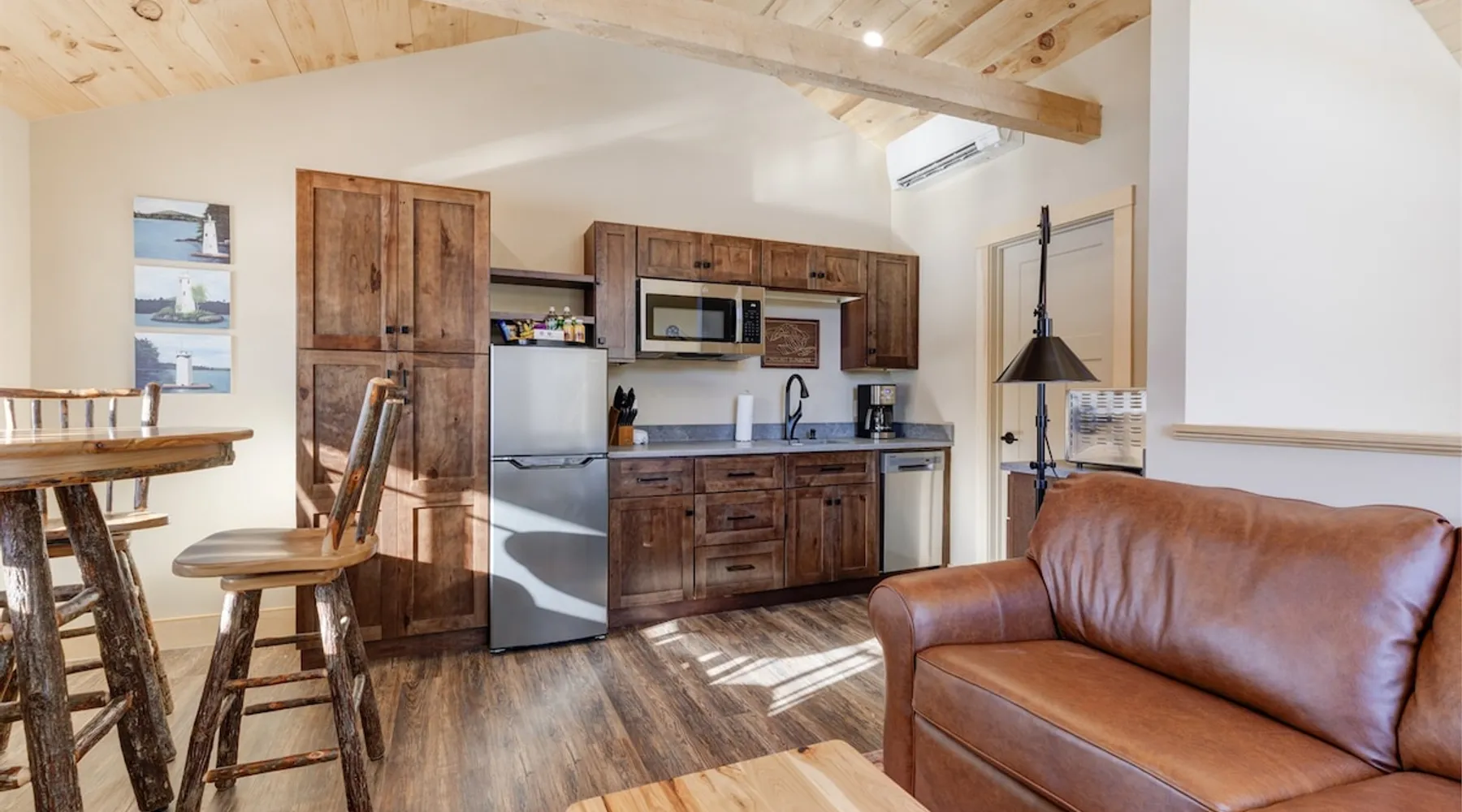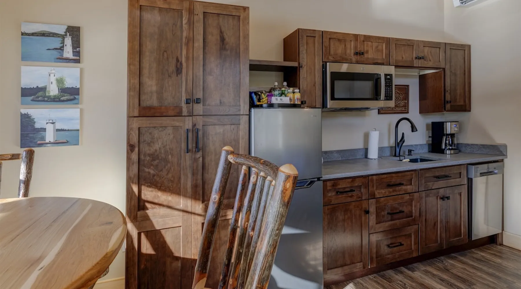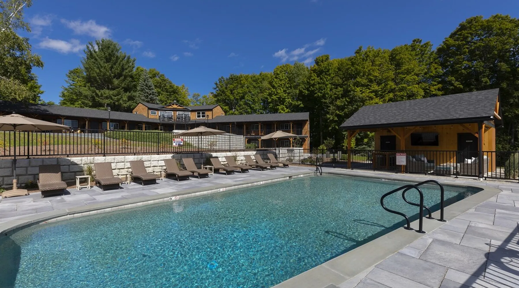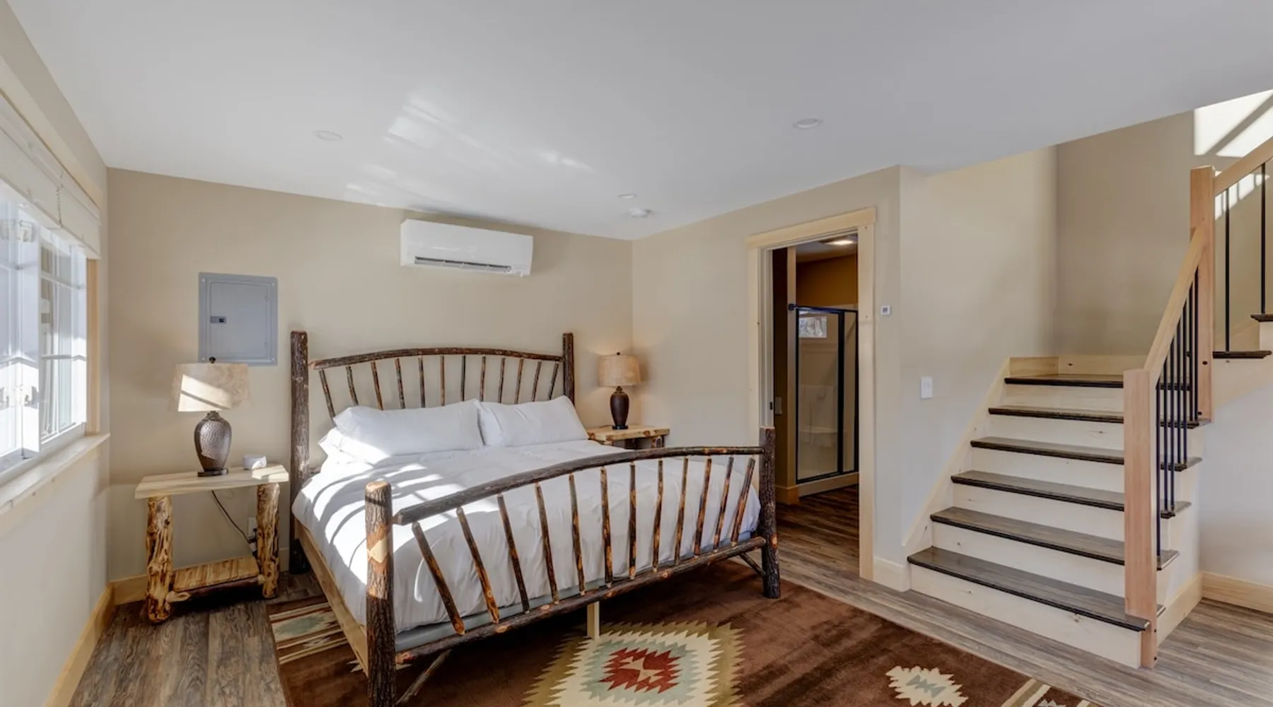 Relax in our inviting two-floor, 1-bedroom, 1.5-bath suite at The Lodge by Sunapee Stays, offering stunning views of Mount Sunapee right outside your door. This suite is one of eleven exceptional accommodations nestled in Sunapee, just minutes from Sunapee Harbor and less than 10 minutes from Mount Sunapee Resort. We welcome dogs, please inquire about our pet policy. A $100 fee per pet applies. The space This modern rustic two level suite features one bedroom, 1.5 bathrooms and a sofa bed. The hickory log furniture, shiplap vaulted ceilings and plush Adirondack style furnishings evoke relaxation after your day of adventures. The bathroom boasts a sanctuary of its own with pebble stone shower surrounded by subway tiles and your very own bidet toilet! On the lower level, you'll find the bedroom with king bed, Smart TV and ensuite full bathroom. On the upper level, you'll find the living area which includes a sofa bed, smart TV, half bathroom and kitchenette with all the amenities to eat in. Outside you'll find a semi-private patio complete with rocking chairs and a side table. There is a shared washer and dryer located on property. Guests can enjoy the two-floor game room, featuring a comfortable lounge area with classic and contemporary family games and a TV. The outdoor heated pool is open seasonally from Memorial Day through Columbus Day and is complemented by a community fire pit, grill, and cabana with a TV and outdoor seating, perfect for relaxing or gathering with family and friends after a day of adventure! Inquire about pet policy; 2 pets maximum allowed with $100 fee, 40lb maximum weight. In Room Amenities: King Bed Full Size Sleeper Sofa Kitchenette Microwave Refrigerator Flat Screen Smart TV (2) Complimentary High Speed Internet Cuisinart Double Induction Electric Cooktop Coffee Pot with Coffee Toaster Oven Plates, Glasses, Silverware, Cookware Hair Dryer Premium Bath amenities Private heating/air conditioning unit Access to washer/dryer Access to clothes steamer Guest access This is a 1 bed/1.5 bath suite and one of eleven suites at The Lodge by Sunapee Stays, each featuring a private entrance and keyless self check-in for your convenience. Your personalized check-in code will be provided seven days prior to your arrival.