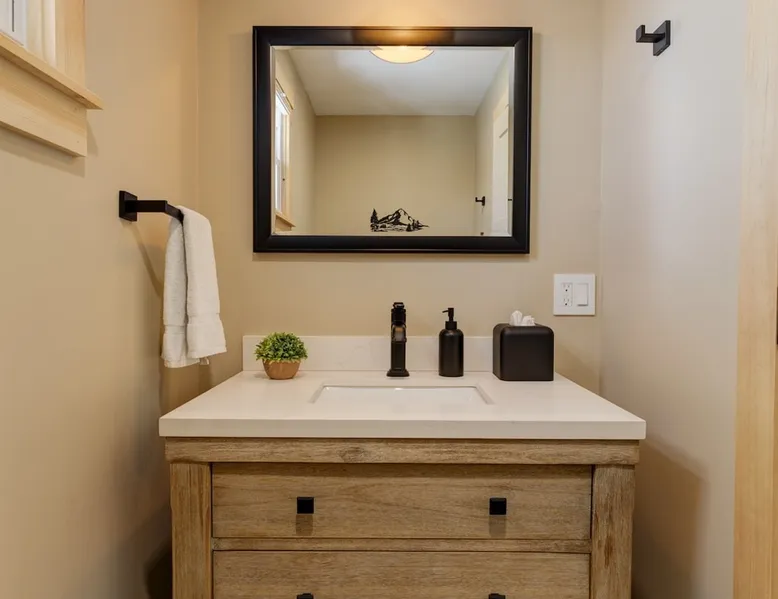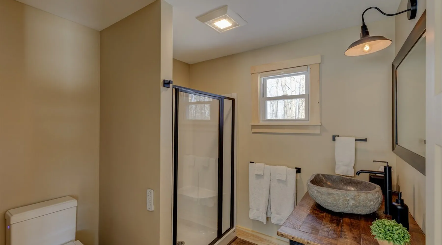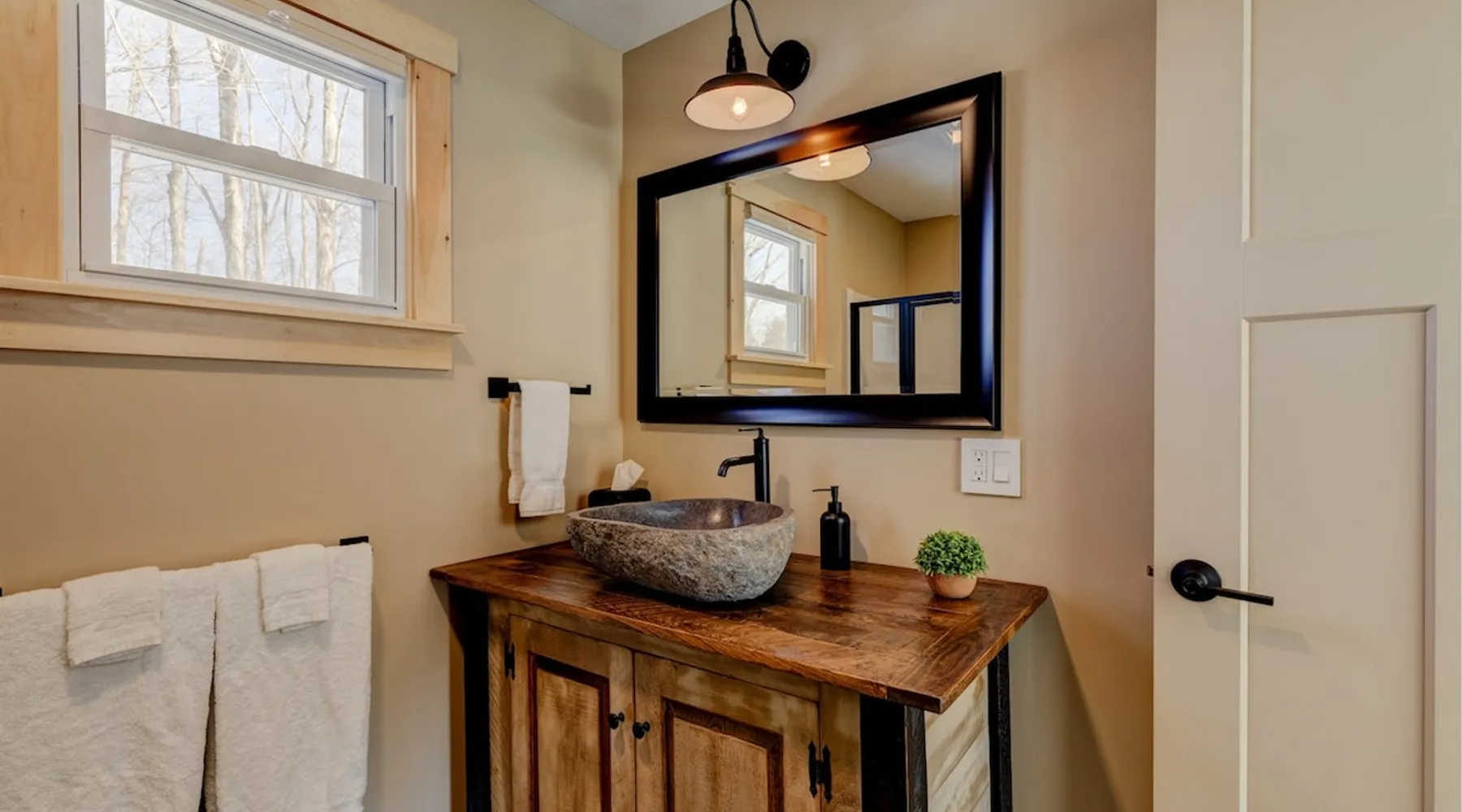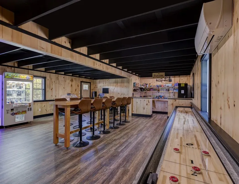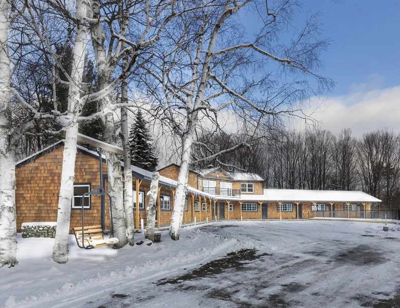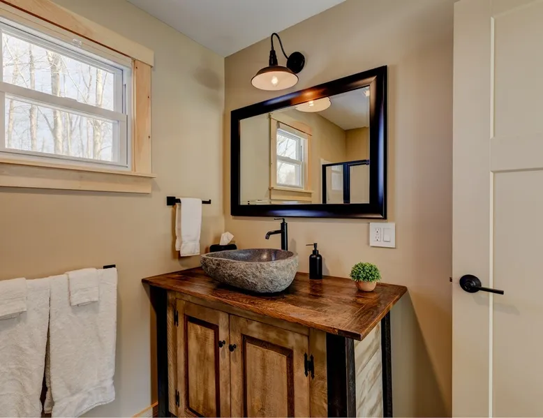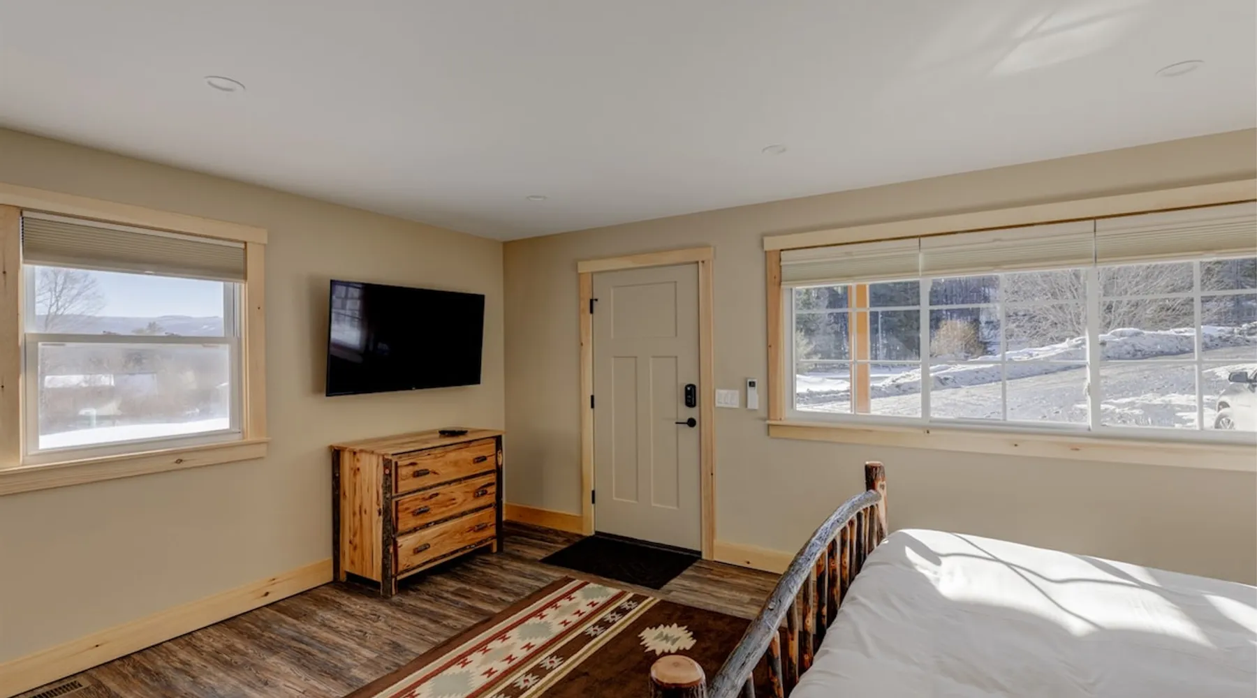 Relax in our inviting two-floor, 1-bedroom, 1.5-bath suite at The Lodge by Sunapee Stays, offering stunning views of Mount Sunapee right outside your door. This suite is one of eleven exceptional accommodations nestled in Sunapee, just minutes from Sunapee Harbor and less than 10 minutes from Mount Sunapee Resort. We welcome dogs, please inquire about our pet policy. A $100 fee per pet applies. The space This modern rustic two level suite features one bedroom, 1.5 bathrooms and a sofa bed. The hickory log furniture, shiplap vaulted ceilings and plush Adirondack style furnishings evoke relaxation after your day of adventures. The bathroom boasts a sanctuary of its own with pebble stone shower surrounded by subway tiles and your very own bidet toilet! On the lower level, you'll find the bedroom with king bed, Smart TV and ensuite full bathroom. On the upper level, you'll find the living area which includes a sofa bed, smart TV, half bathroom and kitchenette with all the amenities to eat in. Outside you'll find a semi-private patio complete with rocking chairs and a side table. There is a shared washer and dryer located on property. Guests can enjoy the two-floor game room, featuring a comfortable lounge area with classic and contemporary family games and a TV. The outdoor heated pool is open seasonally from Memorial Day through Columbus Day and is complemented by a community fire pit, grill, and cabana with a TV and outdoor seating, perfect for relaxing or gathering with family and friends after a day of adventure! Inquire about pet policy; 2 pets maximum allowed with $100 fee, 40lb maximum weight. In Room Amenities: King Bed Full Size Sleeper Sofa Kitchenette Microwave Refrigerator Flat Screen Smart TV (2) Complimentary High Speed Internet Cuisinart Double Induction Electric Cooktop Coffee Pot with Coffee Toaster Oven Plates, Glasses, Silverware, Cookware Hair Dryer Premium Bath amenities Private heating/air conditioning unit Access to washer/dryer Access to clothes steamer Guest access This is a 1 bed/1.5 bath suite and one of eleven suites at The Lodge by Sunapee Stays, each featuring a private entrance and keyless self check-in for your convenience. Your personalized check-in code will be provided seven days prior to your arrival.