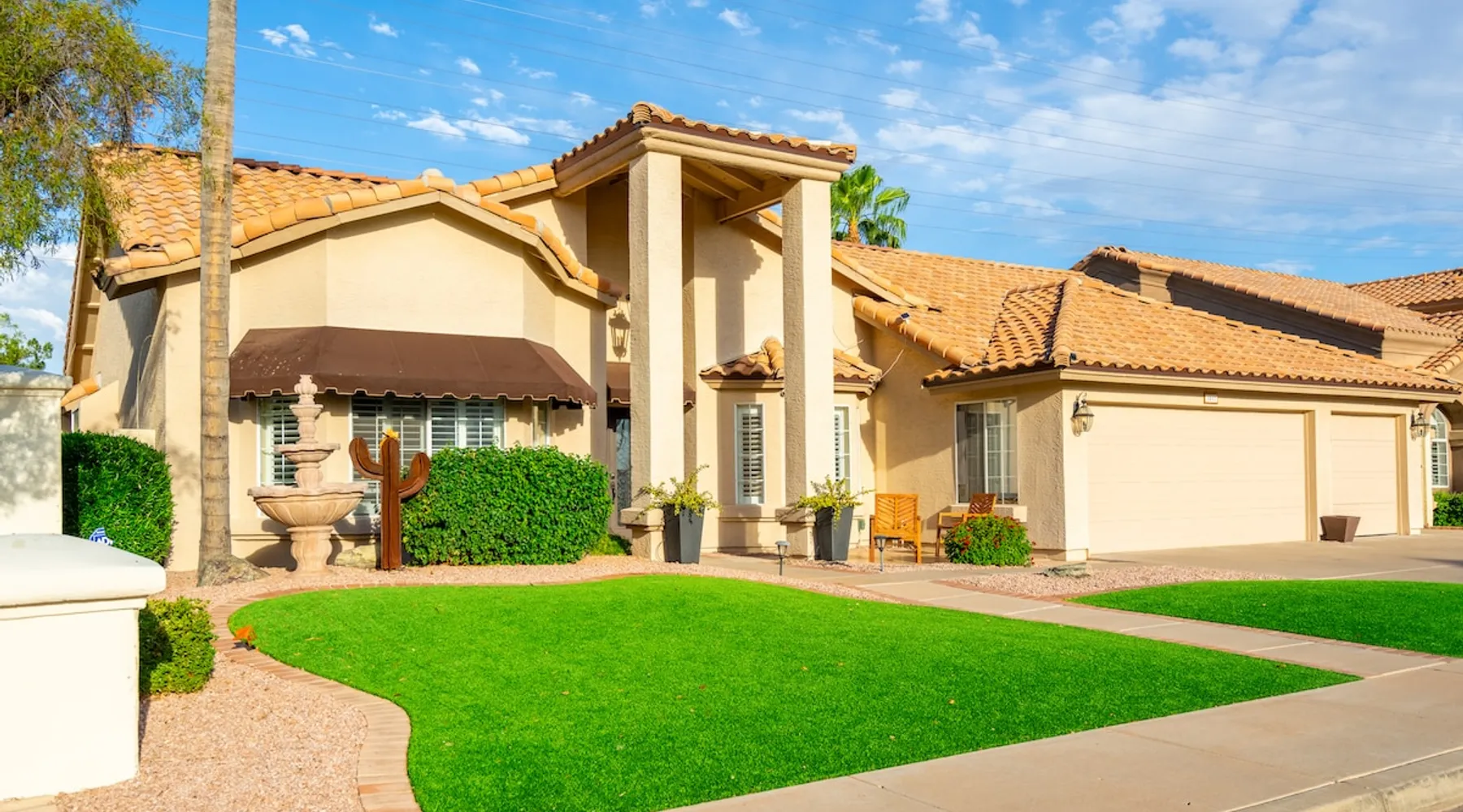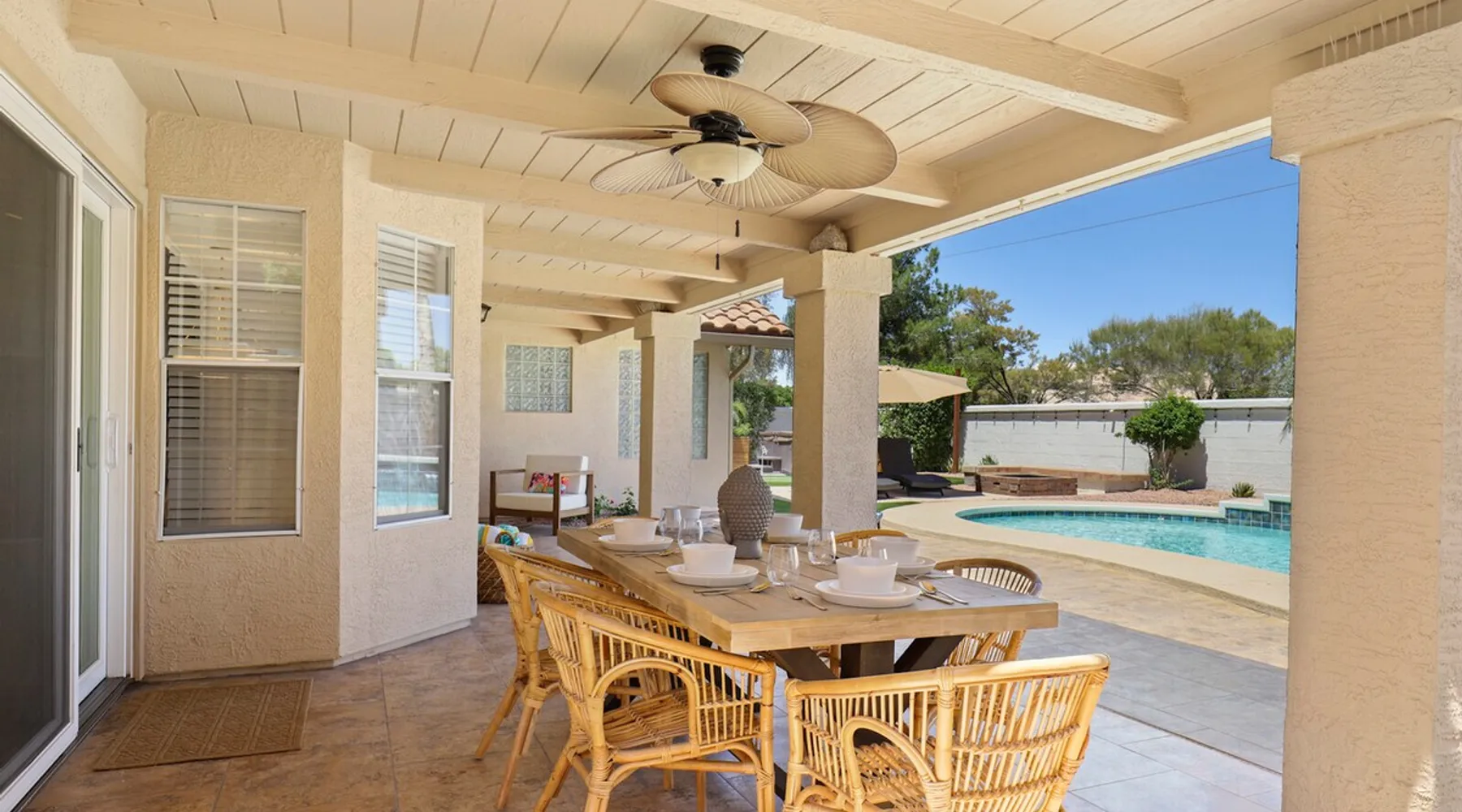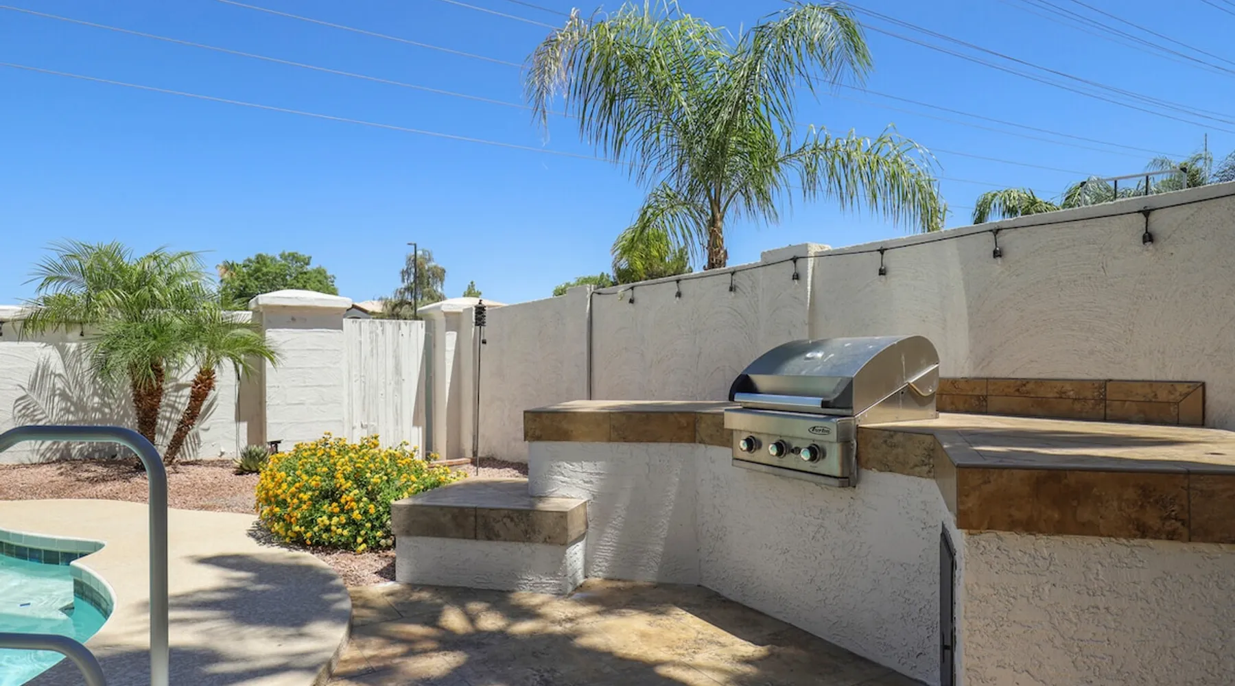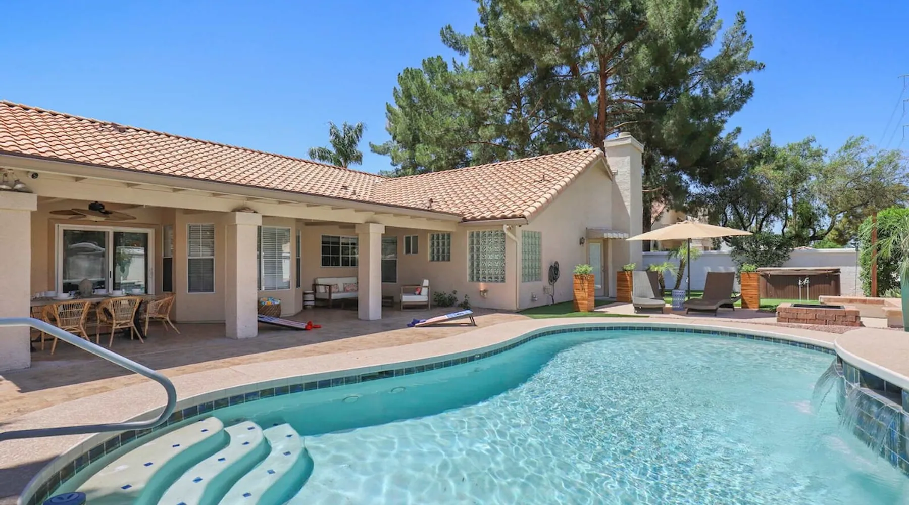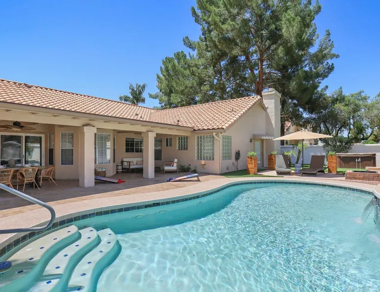 The BEST of Gilbert! This spectacular 5 Bedroom located in the stunning gated community of Val Vista lakes is sure to please everyone in your party! The space Welcome to 7th Heaven A designer desert retreat where style, comfort, and entertainment collide. This stunning 5-bedroom home is your private escape, perfect for families or groups seeking a memorable getaway. Ask us about summer monthly rates as low as $5,500! Outdoor Oasis Lounge by the crystal-clear heated pool, soak in the hot tub, grill out on the propane BBQ, or unwind by the fire pit. Outdoor games, a putting green, and plenty of luxurious seating ensure endless fun under the sun. Chef-Ready Kitchen Cook like a pro in the fully updated kitchen stocked with everything you need—from Starbucks drip coffee and Nespresso to a complimentary bottle of wine. Bon appétit! Special Features Heated Pool Hot Tub Game Room with basketball, lifesize Jenga, TV & more! Putting Green Fire Pit Smart TVs throughout Board Games & Kids’ Toys Kid-Friendly Safety Alarms on Pool Doors Private Office with Desk High-Speed WiFi Walkable to Park and Lake Pool heating is available December–April for $125 per night. Discounts apply to longer stays—ask us for details! Dining Areas Indoor dining table seats 10 Kitchen nook seats 4 Outdoor dining table seats 6 Dishes and utensils for up to 12 guests Bedrooms Master Suite King bed, private sitting area with fireplace and TV, ensuite bathroom with soaking tub and walk-in shower, walk-in closet, and direct yard access. Second Bedroom King bed, Smart TV, reach-in closet. Third Bedroom Queen bed, Smart TV, reach-in closet. Fourth Bedroom Two twin beds, books and toys, reach-in closet. Great for kids! Fifth Bedroom / Office Nook Twin trundle, 65" Smart TV, large desk and sitting area. Bathrooms Two full bathrooms: one ensuite in the master, one shared in the hallway. Both offer a combination bathtub and shower. Family Friendly Equipped with a travel crib, high chair, safety alarms on pool-access doors, kid-friendly dishes, and games—this home is built for families. Amenities High-quality linens and towels Paul Mitchell bathroom products Fully equipped laundry room with washer, dryer, iron, and ironing board Parking for 3 cars in the driveway and 1 in the garage Meet Your Hosts At Hotel Home Stays, we combine hotel-level hospitality with the comfort of a private home. We go above and beyond with rigorous cleaning, hypoallergenic bedding, and contactless check-in via your unique door code. Our digital guest book makes your stay seamless, and our local team is always ready to help with insider tips and quick support. Experience exceptional service and curated comfort—book your stay at 7th Heaven today! Other things to note Pet Policy: - Dogs under 20 lbs allowed, maximum of two. - Approval in writing required, $250 fee per pet. - Unapproved pets result in removal without refund, up to $1,500 in fines. - Cats not allowed due to severe allergies. - Service animals exempt; must be with owner at all times. House Rules: - No smoking or vaping indoors; $1,500 fine. - Disturbing the peace not tolerated; violators asked to leave without refund. - No parties with outside guests; maximum 12 people in the house. - Quiet hours: 10 PM - 8 AM; no loud music. Pool Heating Details: - Optional for $125 per night. - Recommended Oct 15th - April 30th for comfortable swimming. - 3-day advance notice required. - Heating required for entire stay; cannot be turned on/off daily. Concierge Services: - Provided by 3rd party vendors; not affiliated with property owner. - Renter assumes responsibility for third-party activities. Check-In and Check-Out: - Free early/late check-in/out if available; extra fee may apply. - Keyless entry via unique security code provided upon arrival. - Simple check-out instructions provided. - Rental contract emailed for electronic signature before check-in. - Credit card and photo ID required for incidentals.