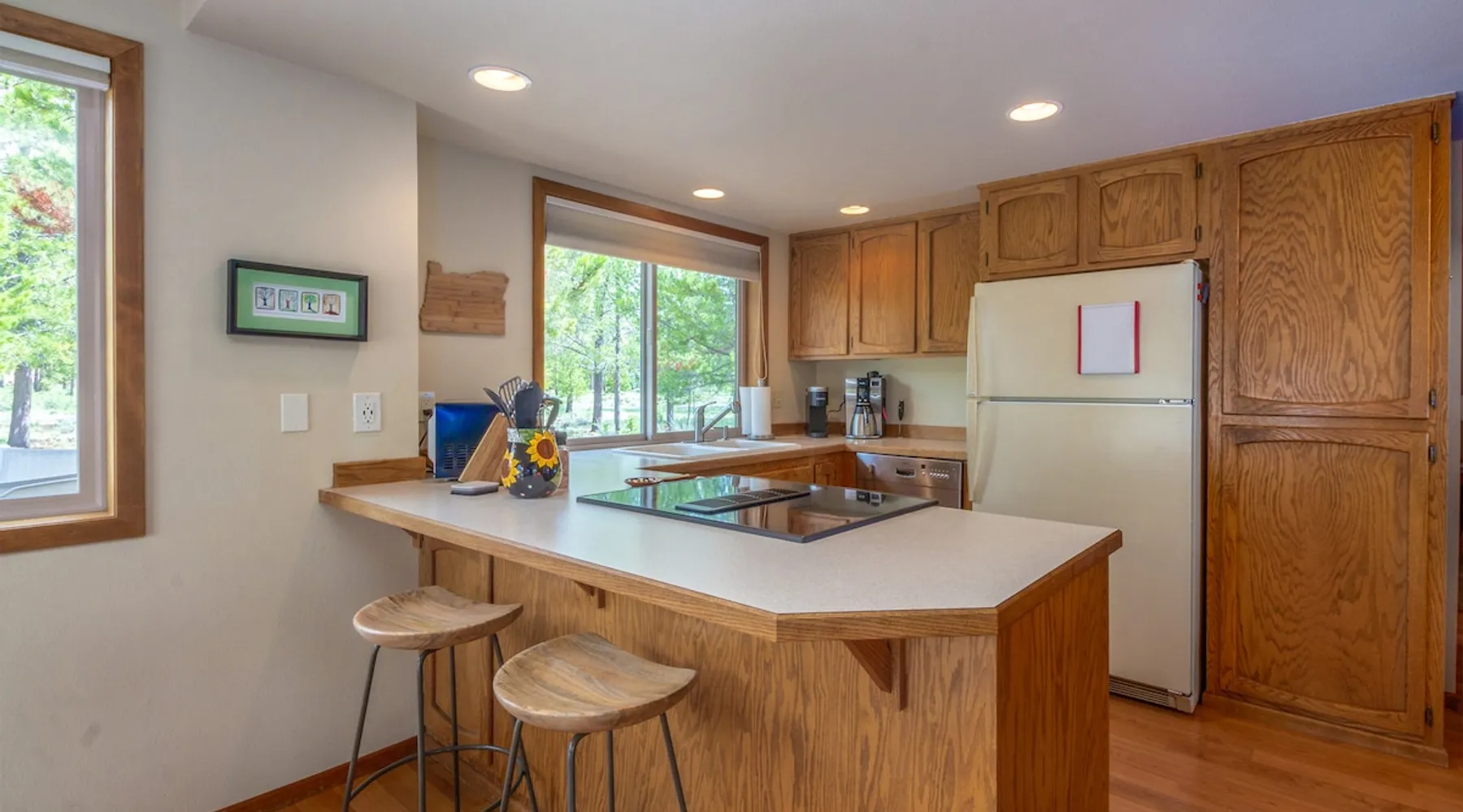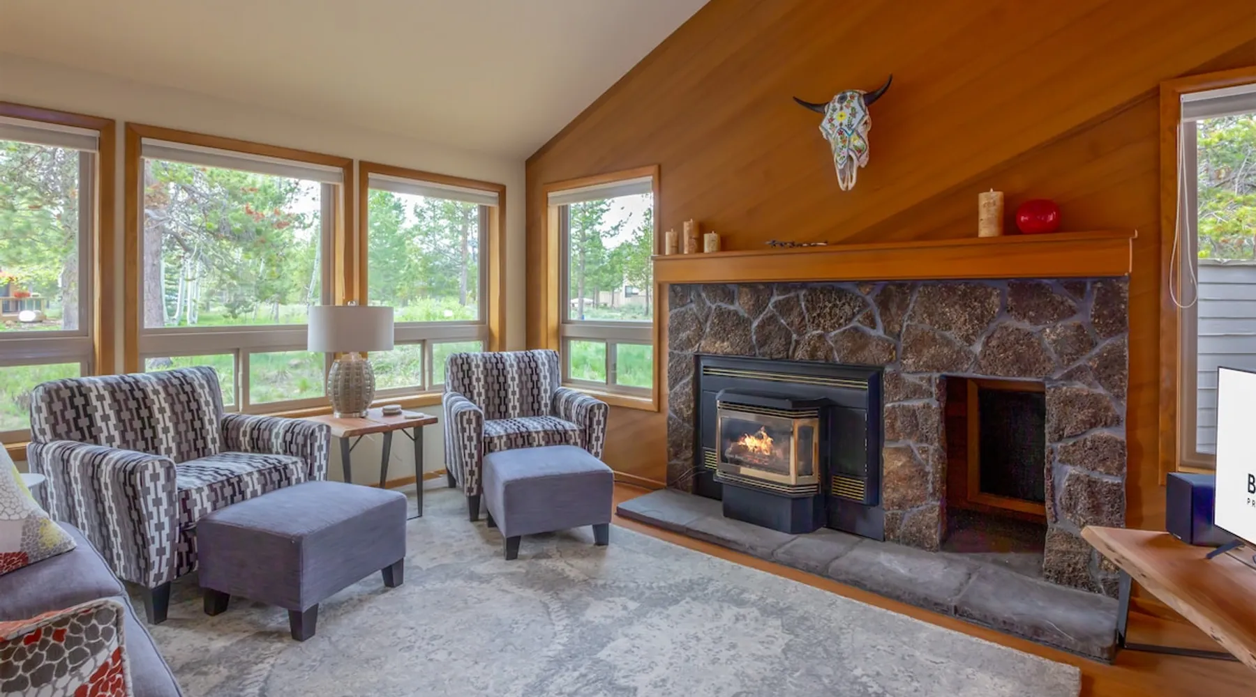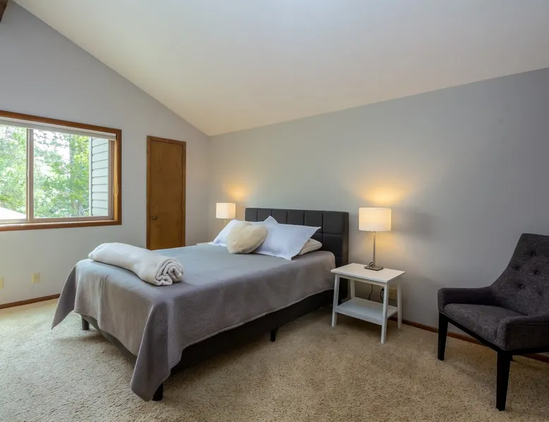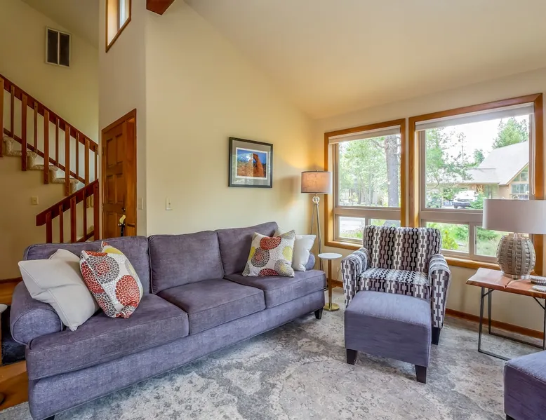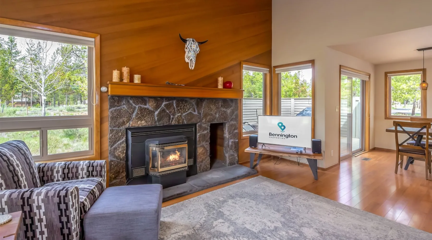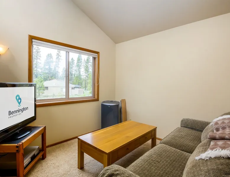 Cozy and inviting, this 2-bedroom Sunriver home features natural wood beam ceilings, a gas fireplace, and forest views through large windows. Enjoy a fully stocked kitchen, dining for four, and a comfy living room to unwind. The main level offers a queen bedroom and full bath; upstairs you'll find a king suite, loft with sleeper sofa, and portable A/C. Relax on the deck with a gas grill, stay connected with free WiFi, and explore all that Sunriver has to offer year-round! The space This 2 bedroom home invites you in with cozy furnishings, lofty ceilings of natural wood beams and large windows that frame the deck and the surrounding forest. The living room, warmed by the gas fireplace, has a flatscreen TV and a sofa where you can put your feet up after a day of hiking, biking, fishing, or skiing. Just around the corner in the kitchen, you'll find everything you need to prepare your favorite meal, a peninsula breakfast bar for two, and an adjacent dining space with a table for four. On this level you'll also find a queen bedroom and a full guest bathroom with shower and tub, plus the laundry room. Head upstairs to find a cozy loft with a pull-out sofa, portable AC unit, TV and DVD player for viewing your favorite movie. A king bedroom with private attached bathroom with gorgeous tiled shower completes this level. Come summertime, you can open the doors to the deck, get the gas grill going for an afternoon barbecue, and find a seat in the shade of the trees. Additional amenities include free WiFi, so you can easily look up a new trail or keep your eye on the snow report. Dogs allowed, 2 max. Fees apply. Other things to note AGE RESTRICTIONS: Guests must be 23 years or older to rent Bennington homes and the person reserving must occupy the home the whole reservation.