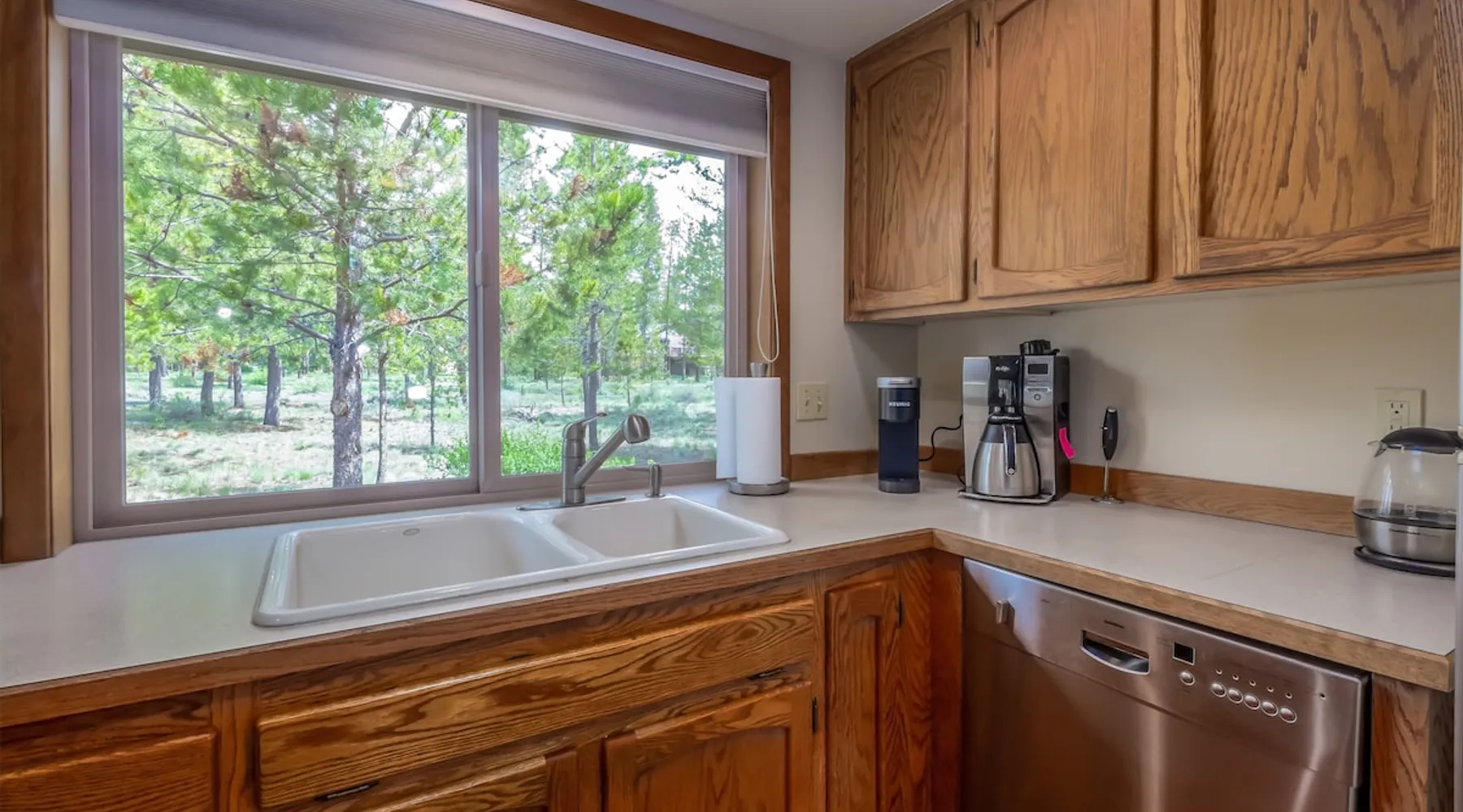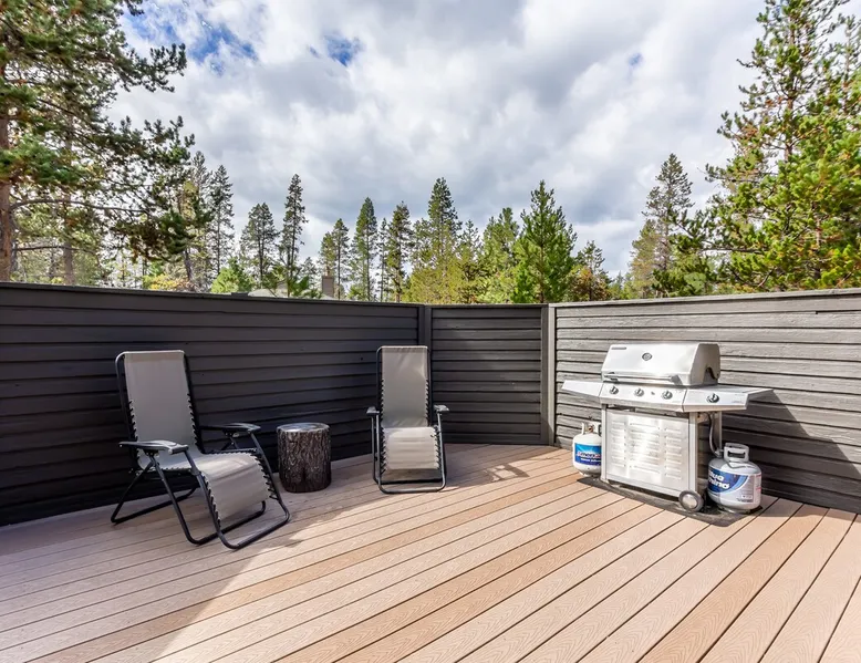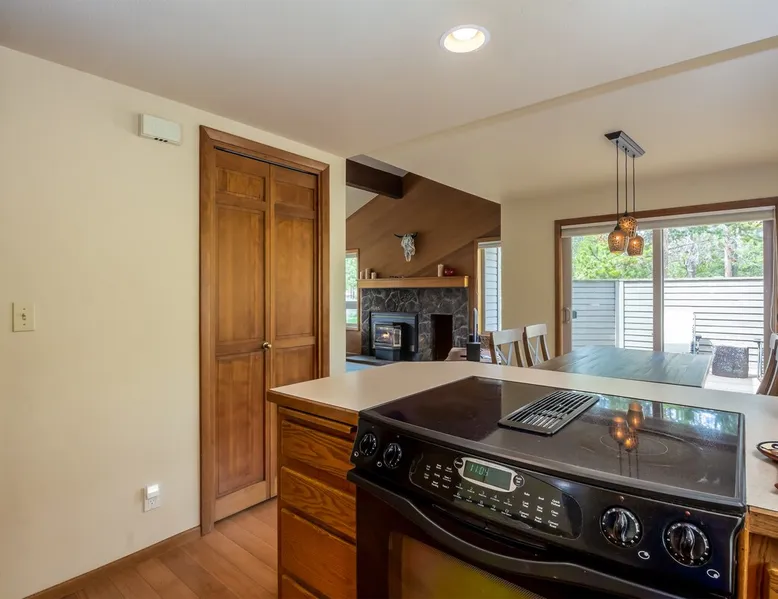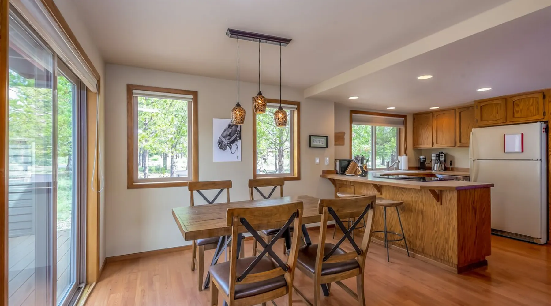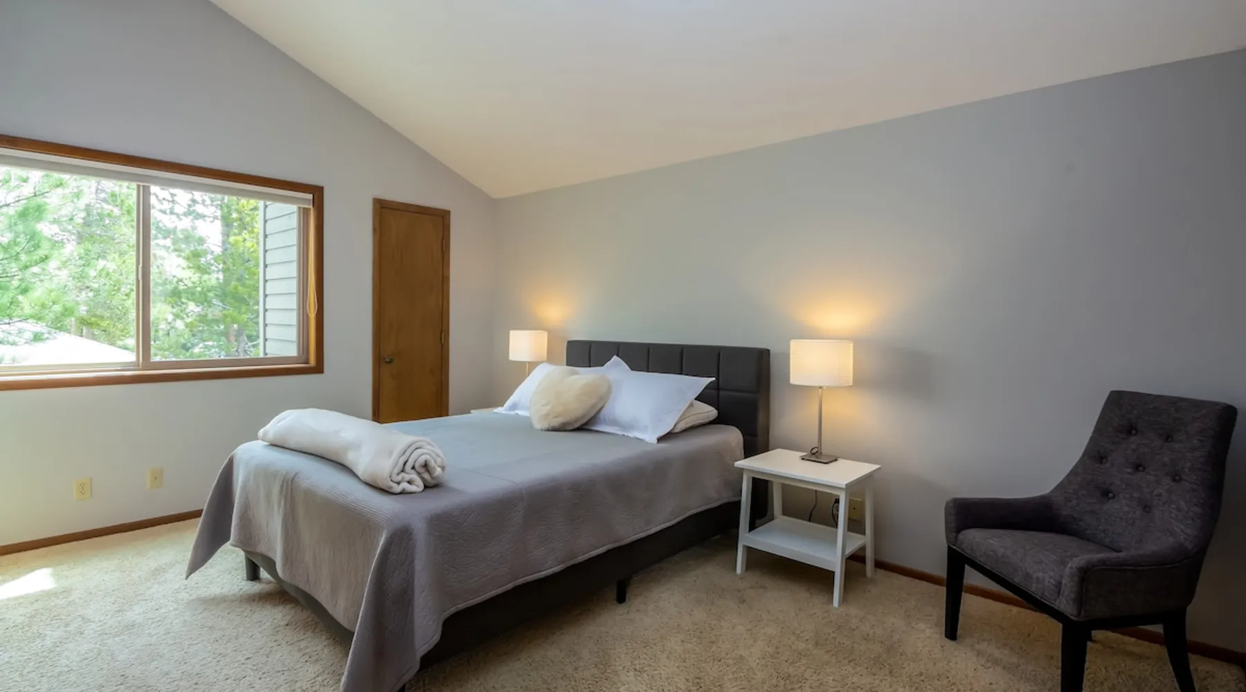 Cozy and inviting, this 2-bedroom Sunriver home features natural wood beam ceilings, a gas fireplace, and forest views through large windows. Enjoy a fully stocked kitchen, dining for four, and a comfy living room to unwind. The main level offers a queen bedroom and full bath; upstairs you'll find a king suite, loft with sleeper sofa, and portable A/C. Relax on the deck with a gas grill, stay connected with free WiFi, and explore all that Sunriver has to offer year-round! The space This 2 bedroom home invites you in with cozy furnishings, lofty ceilings of natural wood beams and large windows that frame the deck and the surrounding forest. The living room, warmed by the gas fireplace, has a flatscreen TV and a sofa where you can put your feet up after a day of hiking, biking, fishing, or skiing. Just around the corner in the kitchen, you'll find everything you need to prepare your favorite meal, a peninsula breakfast bar for two, and an adjacent dining space with a table for four. On this level you'll also find a queen bedroom and a full guest bathroom with shower and tub, plus the laundry room. Head upstairs to find a cozy loft with a pull-out sofa, portable AC unit, TV and DVD player for viewing your favorite movie. A king bedroom with private attached bathroom with gorgeous tiled shower completes this level. Come summertime, you can open the doors to the deck, get the gas grill going for an afternoon barbecue, and find a seat in the shade of the trees. Additional amenities include free WiFi, so you can easily look up a new trail or keep your eye on the snow report. Dogs allowed, 2 max. Fees apply. Other things to note AGE RESTRICTIONS: Guests must be 23 years or older to rent Bennington homes and the person reserving must occupy the home the whole reservation.