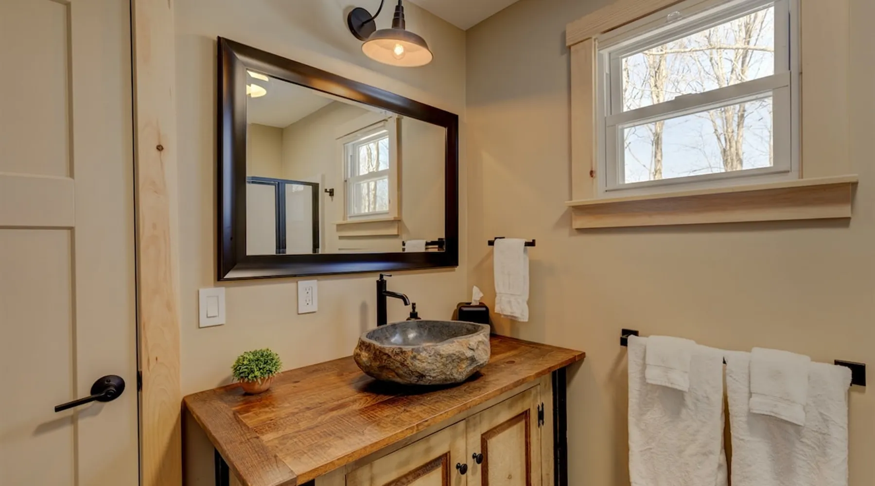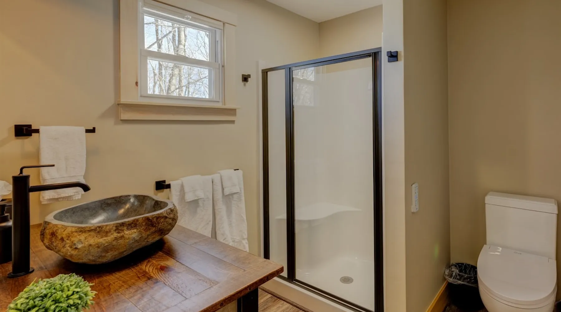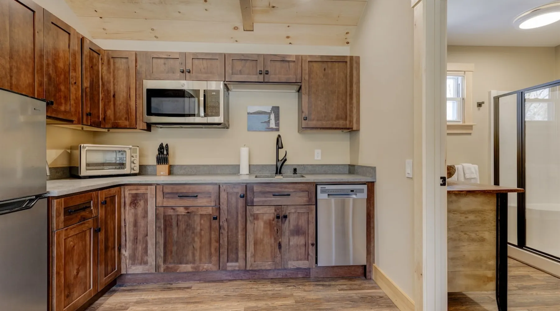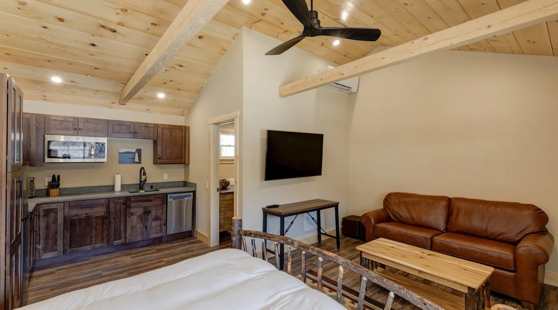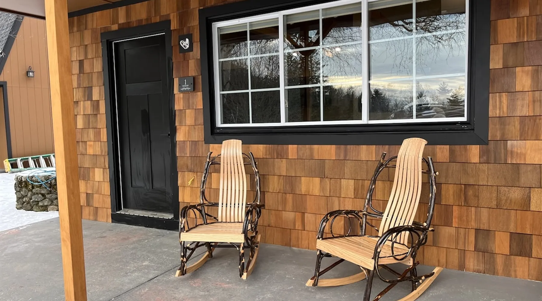 One of eleven luxury suites at the Lodge by Sunapee Stays, nestled in Sunapee with spectacular views of Mount Sunapee just out your front door. Minutes from Sunapee Harbor and less than 10 minutes to Mount Sunapee. The space This modern rustic studio suite features hickory log furniture throughout, king bed and full size memory foam sofa bed. The kitchenette is fully stocked with all the amenities to eat in. The bathroom boasts a sanctuary of its own with pebble stone shower surrounded by subway tiles and your very own bidet toilet! The shiplap vaulted ceilings and plush Adirondack style furnishings evoke relaxation after your day of adventures. Common washer and dryer located on property. Later this winter, the Lodge will offer a common indoor lounge area featuring contemporary and classic family games along with a TV. Outside you'll find a semi-private patio complete with rocking chairs and a seasonal outdoor pool with views of Mount Sunapee! In Room Amenities: King Bed Full Size Sleeper Sofa Kitchenette Microwave Refrigerator Flat Screen Smart TV Complimentary High Speed Internet Cuisinart Double Induction Electric Cooktop Coffee Pot with Coffee Toaster Oven Plates, Glasses, Silverware, Cookware Hair Dryer Premium Bath amenities Private heating/air conditioning unit Access to common washer/dryer Access to common iron/iron board Guest access This is a studio suite and one of eleven suites at The Lodge by Sunapee Stays. Each suite has its own private entrance. The Lodge features a year-round game room equipped with two TVs, oversized comfy bean bags, couches, classic and contemporary family games, and a selection of arcade games. Our seasonal heated outdoor pool opens for the summer starting Memorial Day weekend.