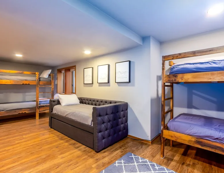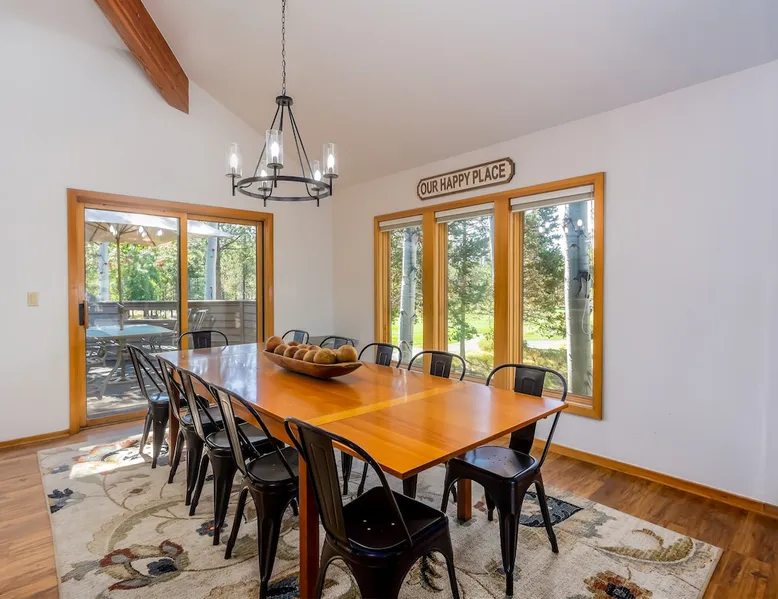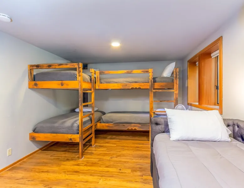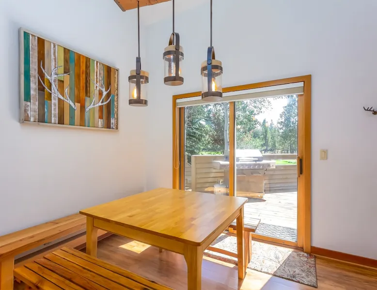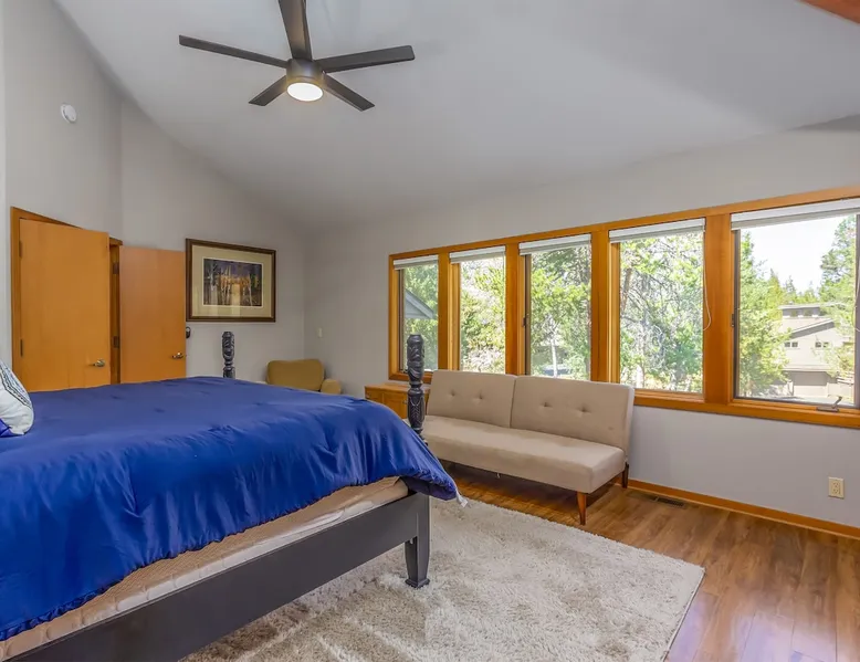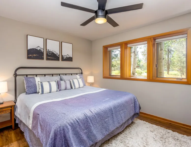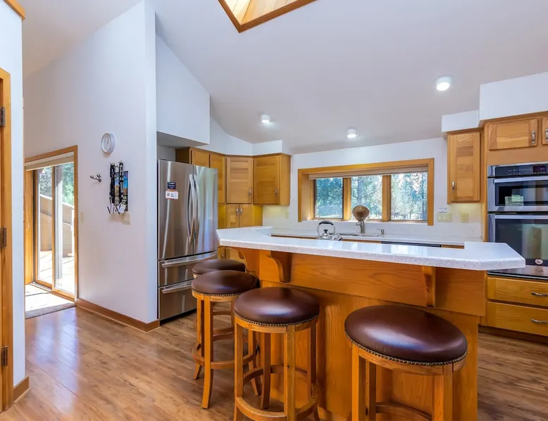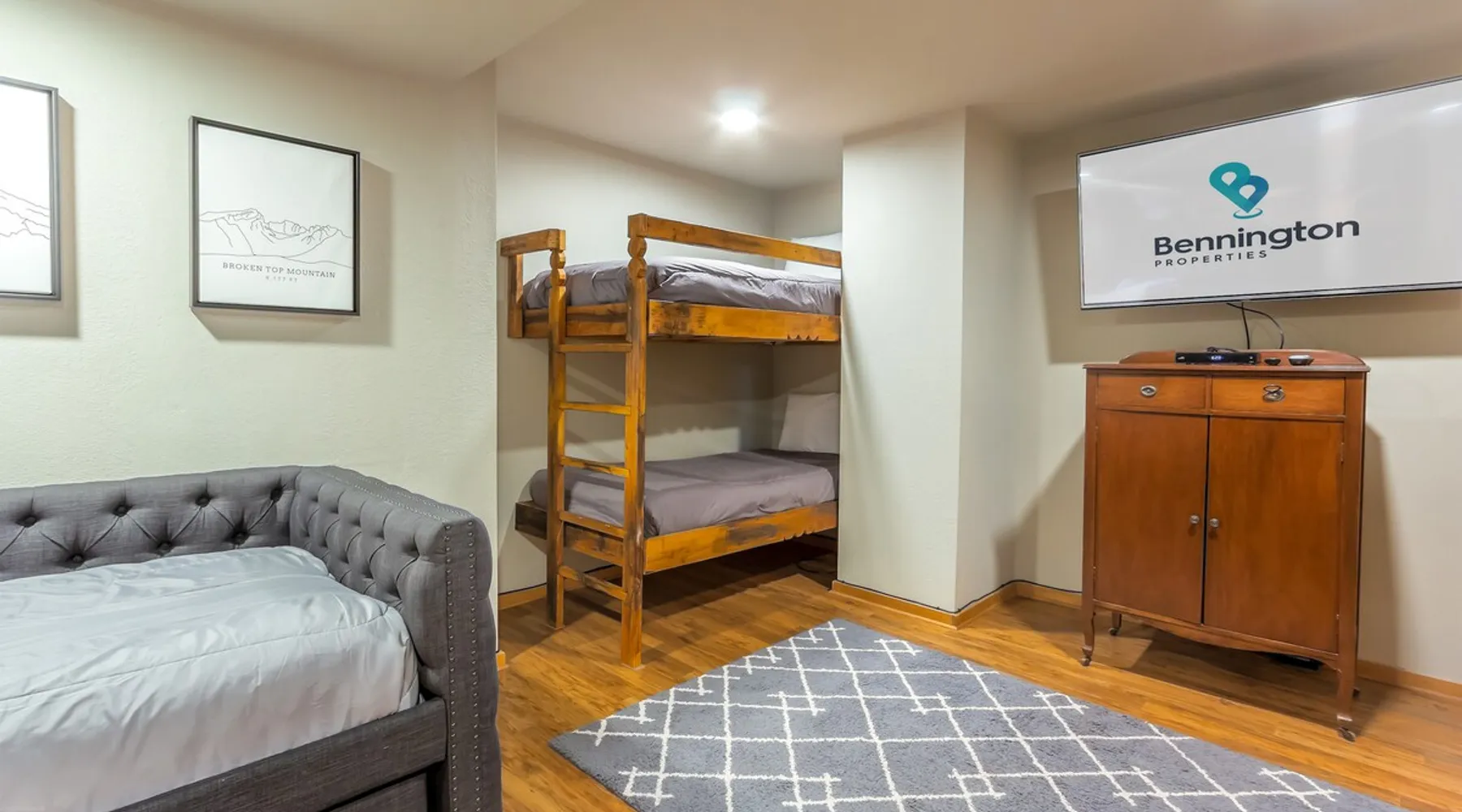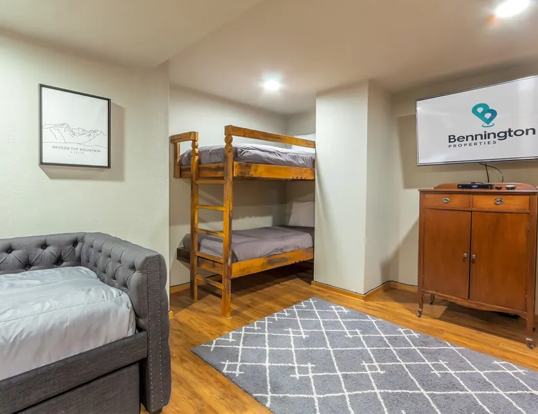 Spacious 5-bedroom Sunriver home near Fort Rock Park, perfect for family getaways year-round. Enjoy a private hot tub, fully stocked kitchen, plus ping pong and a pool table. Explore 30+ miles of trails with included bikes, float the river, visit the Nature Center, or hit the slopes in winter. The space Welcome to your perfect Sunriver escape! From the moment you walk in, you’ll be wowed by soaring ceilings, warm wood and basalt rock accents, and gorgeous natural light filling the reverse-living, open-concept space. The updated kitchen has everything you need to cook and gather, with a spacious dining room and a charming breakfast nook that might just become your favorite spot. The main level features a queen bedroom with a TV and desk, plus a guest half bath. Just half a flight up, the primary king ensuite is a true retreat with a spa-like bathroom featuring a soaking tub, skylight, and walk-in shower, along with private deck access. Downstairs, you’ll find three additional bedrooms: a fun bunk room with three twin bunks plus a twin bed with trundle, a king bedroom that shares a full bath with the bunk room, and a queen ensuite with its own bathroom and walk-in shower. There’s plenty of family fun to be had in the garage with ping pong, a pool table, and bikes for exploring the area. Relax outside on the large upstairs deck with golf course views, seating, and a gas BBQ. After a day of adventure, head down to your private hot tub and soak under the stars. Looking to book a family reunion or large group gathering? Reserve this home along with Red Cedar 16, Red Cedar 20, Red Cedar 23 and Red Cedar 49. ***Please note both fireplaces in this home will not be available for use Other things to note AGE RESTRICTIONS: Guests must be 23 years or older to rent Bennington homes and the person reserving must occupy the home the whole reservation.