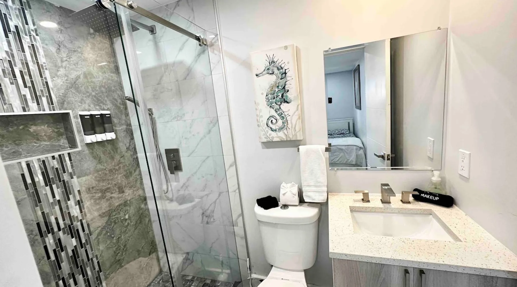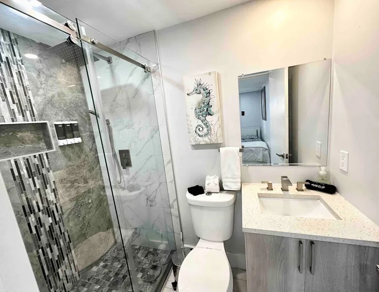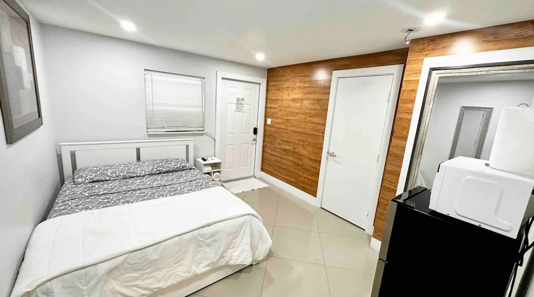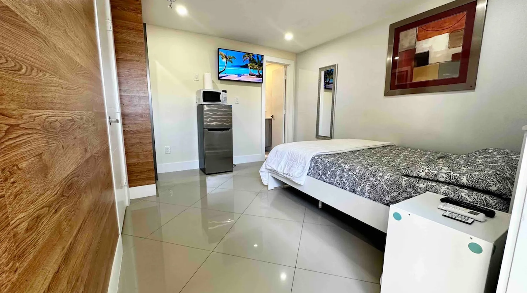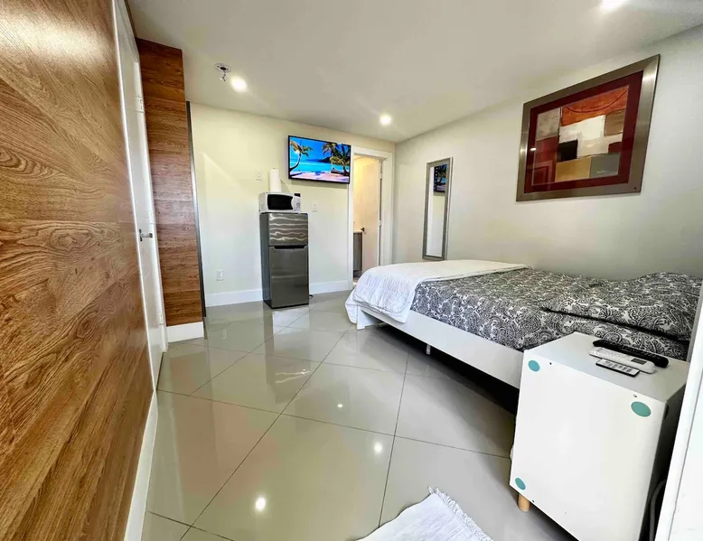 This newly remodeled studio is just a 15 minute drive to and from FLL Airport - ideal for a couple (2 people max). It is a 20 minute drive to the iconic Wave Wall Beach at Las Olas. This studio, (while adjoined to a multi-unit building), offers complete privacy with all access doors to the outside and exclusive access via keypad for you and your travel companions only. Includes: Full Bathroom, 1 closet, Mini Fridge/Microwave, Queen Bed, TV, Desk & Chair Check-in: 3 PM Check-out: 10 AM The space This is your own private space to relax and unwind during your stay! Upon entering the Queen sized bed is to your right, next to it is a bedside table with remote. There is a mini split A/C for you to customize your temperature. On the left side is a closet door with closet for your belongings and a broom/dustpan and your towels. Straight ahead is the microwave, mini fridge, single desk and chair. Directly ahead is the smart tv on the wall in front of the bed, and to the right is the bathroom door entrance, on the wall before it is a full length mirror. Inside of the bathroom is your vanity and mirror, toilet and remodeled shower. The bright floors and finishes create a pleasant, luminous ambiance for your relaxation. INCLUDED: ✔ Shower ✔Closet space for your belongings ✔Dustpan and broom ✔Midsized mini fridge/freezer & microwave ✔Smart TV ✔High-Speed Wi-Fi ✔Desk & Chair ✔Full Length Mirror Guest access ✔ Your studio is private access (Keypad Entry with your Unique code sent before check in), has a private entrance (DOOR #5) and is located within a multi-unit property ✔ 1 designated parking spot (one car per booking, all others will be towed) ✔ Your studio is private access/entrance (keypad entry) and is not shared with other guests. Please note - there is a door to the left behind a mirror with NO ACCESS! This door is locked, insulated and inaccessible from EITHER SIDE! Your unit is private to you and only you have access to your unit via keypad entrance door ✔ The outside area is yours to enjoy and is also shared with other guests. Other things to note POPULAR DISTANCES: We are… 20 minutes from Las Olas Ft. Lauderdale Beach 15 minutes from Fort Lauderdale Airport 12 minutes from Wilton Drive, Wilton Manors 20 minutes to the famous Guitar Hotel & Casino in Hollywood, FL 30 minutes to downtown Miami. EARLY CHECK-IN/ LATE CHECK-OUT FEE: Any check-in earlier than 3 pm check in time will incur a $15 per hour early check-in fee. All early check-ins must be pre-approved by host/cohost & payment confirmed before guest checks in early. Any check-out later than 10 am check out time will incur a $15 per hour late check-out fee. All late check-outs must be pre-approved by host/cohosts & payment confirmed before guest checks out late. There may be times our cleaning company is unable to change schedule and accommodate early check-in or late check-out. We thank you for your understanding. RULES: NO PARTIES or groups over 2 persons in your unit (at any time) will be permitted on the premises, no exceptions- this is a family neighborhood. NO SMOKING - Outside area ONLY, 10 feet from unit door, backyard is available for use NO MAIL OR PACKAGES OF ANY KIND to be delivered or sent to the property during your stay. Please use amazon lockers nearest location or USPS down the street. ONLY ONE CAR for your reservation permitted on the property. You are notified prior to booking that you are only to bring one car or less. Do not bring more than ONE car to the property at any time (even if the second guest is meeting you there, there cannot be more than 1 car). PARKING: You have ONE designated parking space, please do not disturb neighbors or park anywhere other than your designated parking space. Do not park on sidewalk or over swale as per Broward County regulations. NO PETS, NO EXCEPTIONS - we provide allergy free accommodations! Please check out our Guidebook for some of our favorite things to do in Fort Lauderdale!