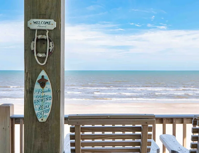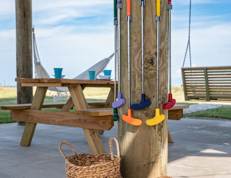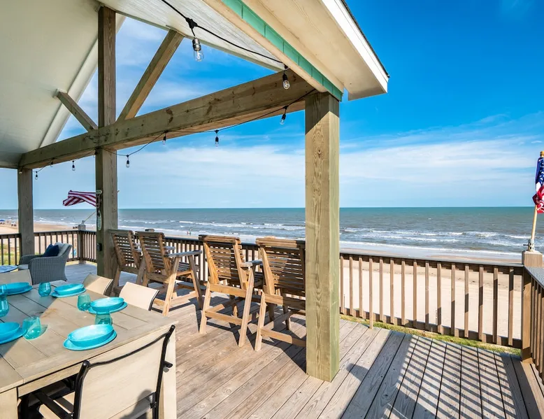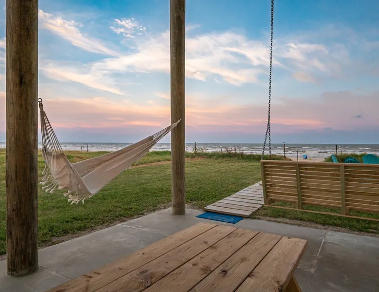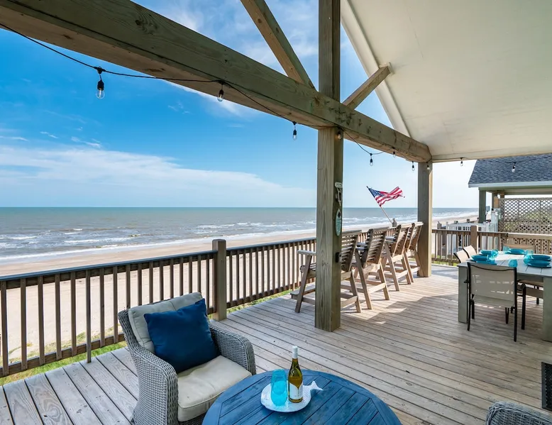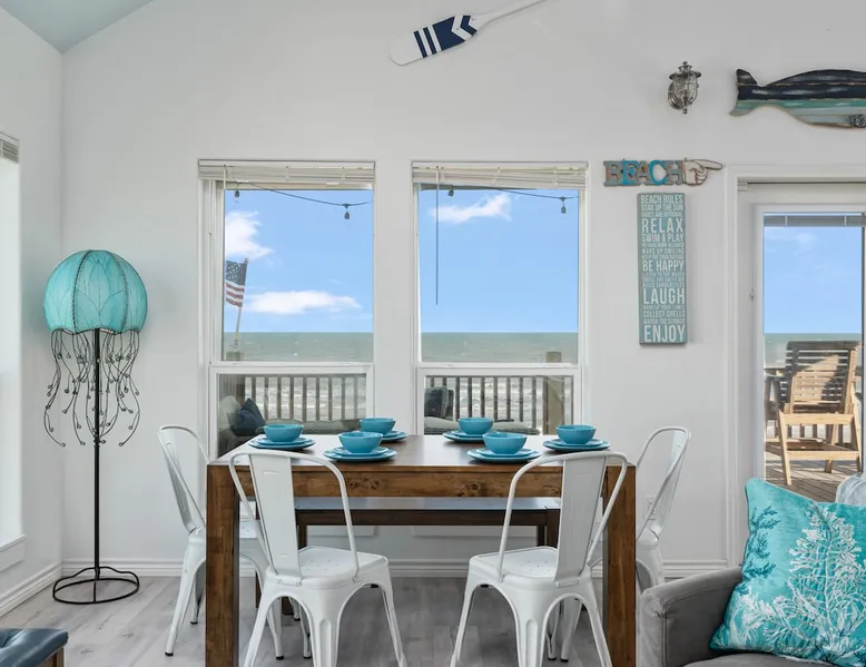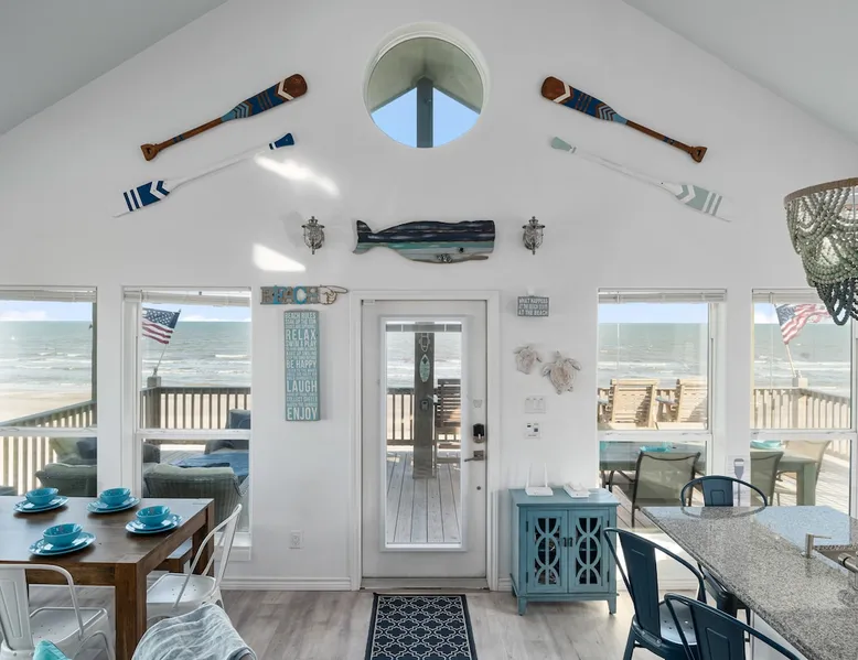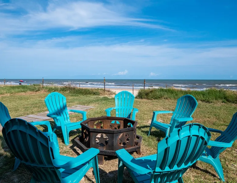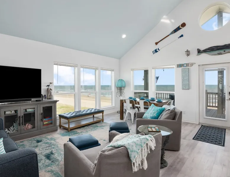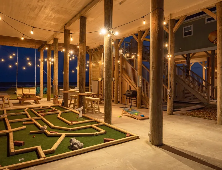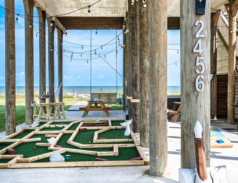 Located on one of Texas’ premier beaches, Fore Shore is steps from feeling the sand between your toes, basking in the warm seaside sun, and splashing in the sparkling Gulf waters. This spectacular 3-bedroom, 2-bath beachfront home is beautifully styled with a modern coastal theme, has wide open social areas, comfortable private bedrooms, fantastic outdoor entertaining spaces including mini golf, and is directly on the water - all making for an unforgettably perfect vacation getaway. The space Amenity Highlights ⛳️ Mini Golf 🎲 Board games, yard games, and even an arcade game 🚿 Outdoor shower 🔥 Fire pit 👶 Everything you need for baby- pack’n’play, changing pad, dishes, and high chair 🏖️ Beach chairs, gear, and toys ❄️Central HVAC system, ceiling fans and box fan 🧺 Laundry is on-site and complementary ⭐️ Complimentary unlimited Wi-Fi ⭐️Dedicated workspace ⭐️ Comprehensive housewares package + standard small appliances ⭐️Fresh linens, towels, and beach towels for every guest At Fore Shore beach house, guests will find gulf views in every room, enough space to gather with extended family and friends indoors and out, and endless possibilities for relaxation and fun! The residence boasts an open designer kitchen with high-end appliances and convenient bar seating that seamlessly transitions to the dining and living areas. Guests will love the breathtaking gulf views and watching the sunset from these rooms, or they can head outside to the adjacent covered deck for an even better view with additional dining options, a seating area, and quick escape to the sand and sea. BEDROOMS Three private bedrooms (all with smart televisions) and two full baths comfortably accommodate up to 10 guests. There is a total of 1 king bed, 1 queen bed, 4 twin beds (bunks), and a sleeper sofa in the living room. Bedroom one- Indulge in the spacious luxury of the primary bedroom featuring a king bed. It has an ensuite bathroom and access to a private balcony. There is also a desk in case you need to check off some work items before you head out for a day in the sun. Bedroom two- features a lovely queen bed and smart tv. The design blends comfort and style seamlessly which invites relaxation. Bedroom 3- is styled as a double bunk room – a fun feature that kids always love. It is comfortable and cozy and has a cabinet of bedtime storybooks for your young ones to enjoy. BATHROOMS The home has 2 clean and bright bathrooms. You’ll find one walk-in shower and one shower/tub combo. Showers are stocked with shampoo, body wash and conditioner. OUTDOOR SPACE Outdoor living at Fore Shore is amazing, too! A covered outdoor entertainment court down below is definitely the hot spot to chill day or night. Perfect your putting skills on the 9-hole mini golf course, host a cornhole tournament, nap in the hammock, relax on the porch swing, then prepare the catch of the day on the BBQ grill and serve alfresco in the shady picnic spot. Once the sun goes down, gather at the beachside firepit with Adirondack seating for s’mores and stargazing. Ample on-site parking, an outdoor shower with hot and cold water for rinsing off after seaside excursions, and convenient laundry machines add to the long list of thoughtful on-property service extras. And be sure to find the hidden stand-up arcade and make the most of all the board games when not at the beach! Guest access You’ll have access to every room and feature of this home except locked owner’s storage. Make yourself at home; hosts are just a text or call away if you need anything! Other things to note We know and understand that FUR BABIES are an extension of most families, we DO NOT ALLOW pets of any kind out of respect for the health and safety of all current and future guests. Thank you for understanding and leaving your pets behind.