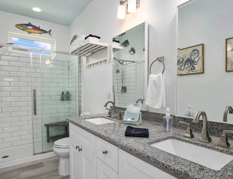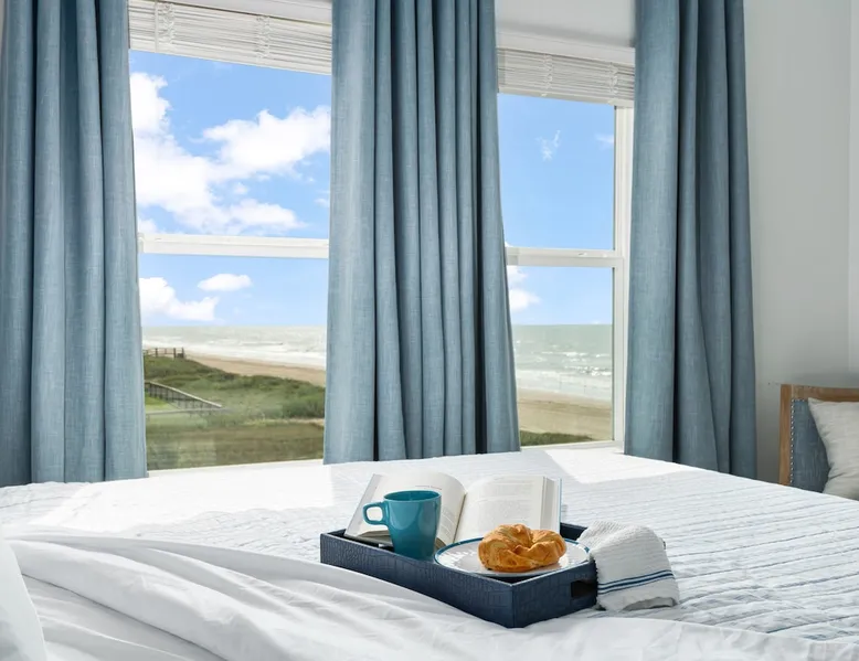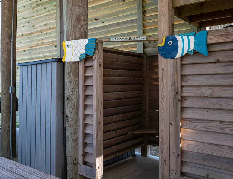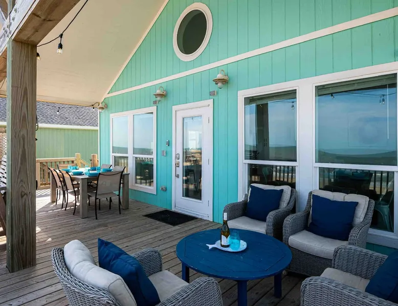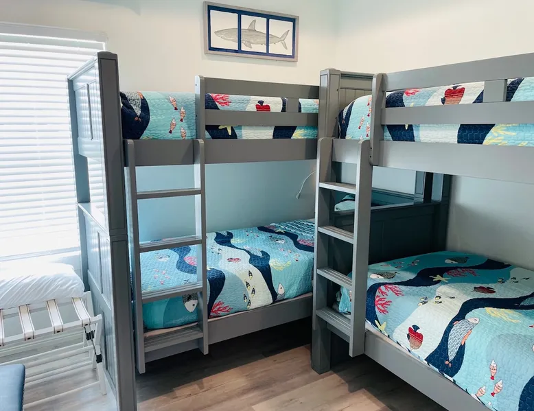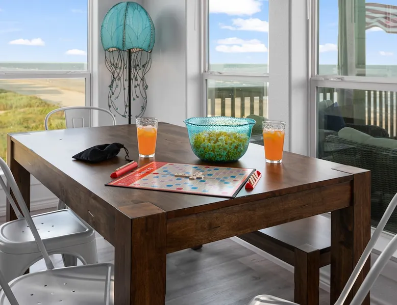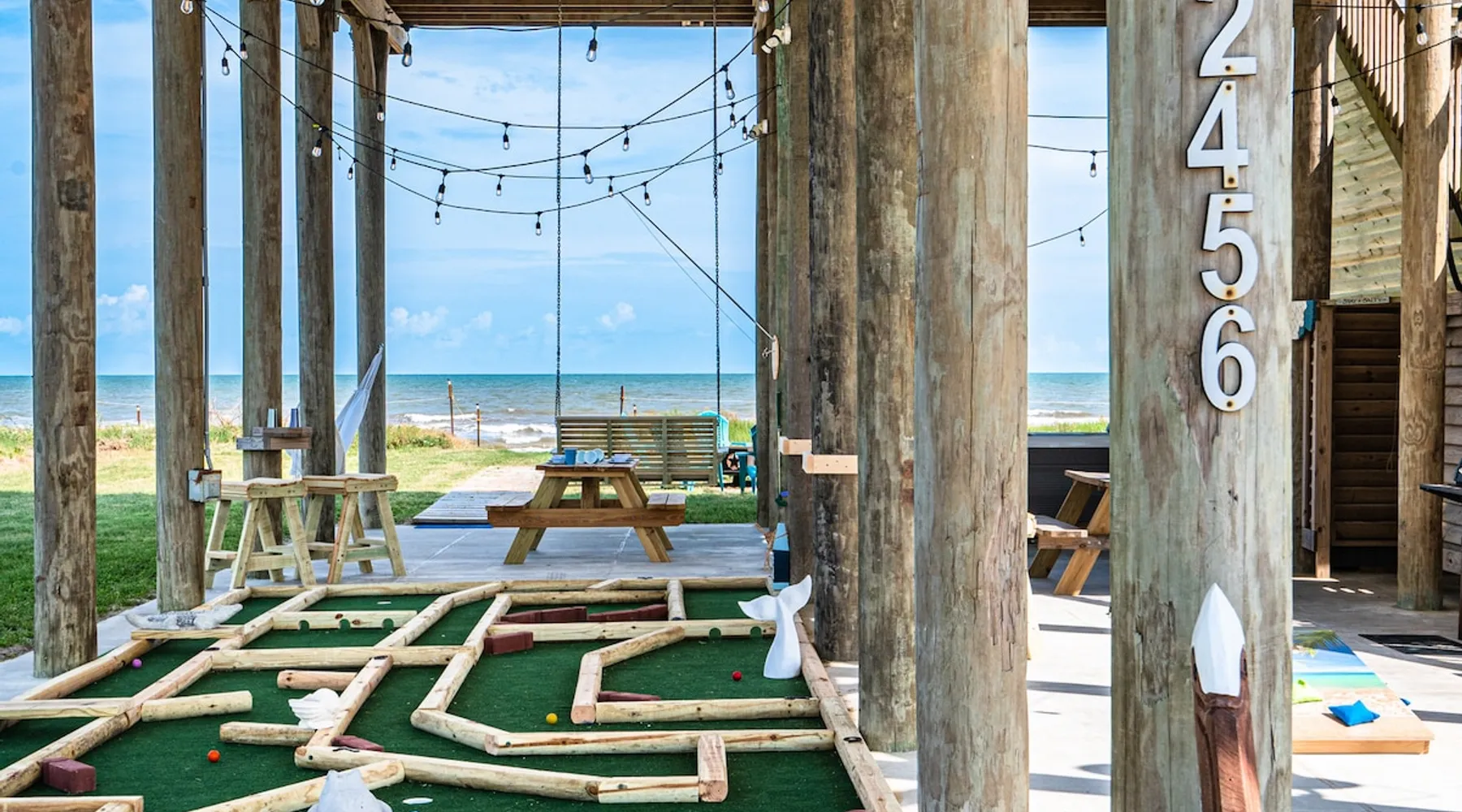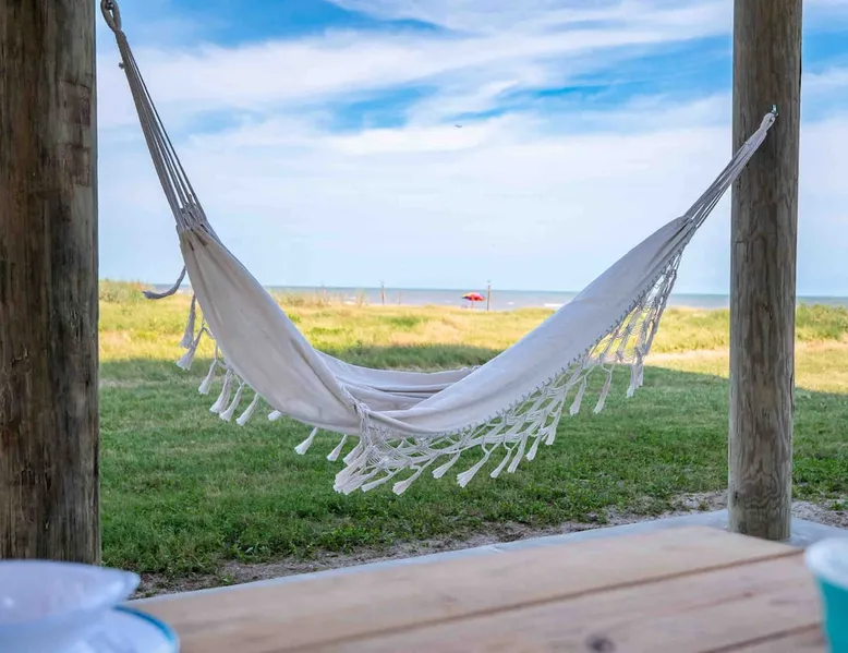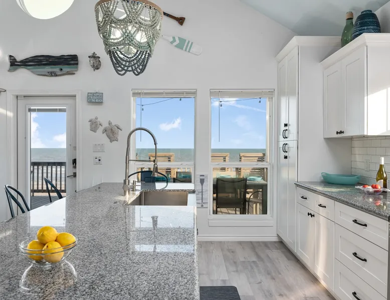 Located on one of Texas’ premier beaches, Fore Shore is steps from feeling the sand between your toes, basking in the warm seaside sun, and splashing in the sparkling Gulf waters. This spectacular 3-bedroom, 2-bath beachfront home is beautifully styled with a modern coastal theme, has wide open social areas, comfortable private bedrooms, fantastic outdoor entertaining spaces including mini golf, and is directly on the water - all making for an unforgettably perfect vacation getaway. The space Amenity Highlights ⛳️ Mini Golf 🎲 Board games, yard games, and even an arcade game 🚿 Outdoor shower 🔥 Fire pit 👶 Everything you need for baby- pack’n’play, changing pad, dishes, and high chair 🏖️ Beach chairs, gear, and toys ❄️Central HVAC system, ceiling fans and box fan 🧺 Laundry is on-site and complementary ⭐️ Complimentary unlimited Wi-Fi ⭐️Dedicated workspace ⭐️ Comprehensive housewares package + standard small appliances ⭐️Fresh linens, towels, and beach towels for every guest At Fore Shore beach house, guests will find gulf views in every room, enough space to gather with extended family and friends indoors and out, and endless possibilities for relaxation and fun! The residence boasts an open designer kitchen with high-end appliances and convenient bar seating that seamlessly transitions to the dining and living areas. Guests will love the breathtaking gulf views and watching the sunset from these rooms, or they can head outside to the adjacent covered deck for an even better view with additional dining options, a seating area, and quick escape to the sand and sea. BEDROOMS Three private bedrooms (all with smart televisions) and two full baths comfortably accommodate up to 10 guests. There is a total of 1 king bed, 1 queen bed, 4 twin beds (bunks), and a sleeper sofa in the living room. Bedroom one- Indulge in the spacious luxury of the primary bedroom featuring a king bed. It has an ensuite bathroom and access to a private balcony. There is also a desk in case you need to check off some work items before you head out for a day in the sun. Bedroom two- features a lovely queen bed and smart tv. The design blends comfort and style seamlessly which invites relaxation. Bedroom 3- is styled as a double bunk room – a fun feature that kids always love. It is comfortable and cozy and has a cabinet of bedtime storybooks for your young ones to enjoy. BATHROOMS The home has 2 clean and bright bathrooms. You’ll find one walk-in shower and one shower/tub combo. Showers are stocked with shampoo, body wash and conditioner. OUTDOOR SPACE Outdoor living at Fore Shore is amazing, too! A covered outdoor entertainment court down below is definitely the hot spot to chill day or night. Perfect your putting skills on the 9-hole mini golf course, host a cornhole tournament, nap in the hammock, relax on the porch swing, then prepare the catch of the day on the BBQ grill and serve alfresco in the shady picnic spot. Once the sun goes down, gather at the beachside firepit with Adirondack seating for s’mores and stargazing. Ample on-site parking, an outdoor shower with hot and cold water for rinsing off after seaside excursions, and convenient laundry machines add to the long list of thoughtful on-property service extras. And be sure to find the hidden stand-up arcade and make the most of all the board games when not at the beach! Guest access You’ll have access to every room and feature of this home except locked owner’s storage. Make yourself at home; hosts are just a text or call away if you need anything! Other things to note We know and understand that FUR BABIES are an extension of most families, we DO NOT ALLOW pets of any kind out of respect for the health and safety of all current and future guests. Thank you for understanding and leaving your pets behind.