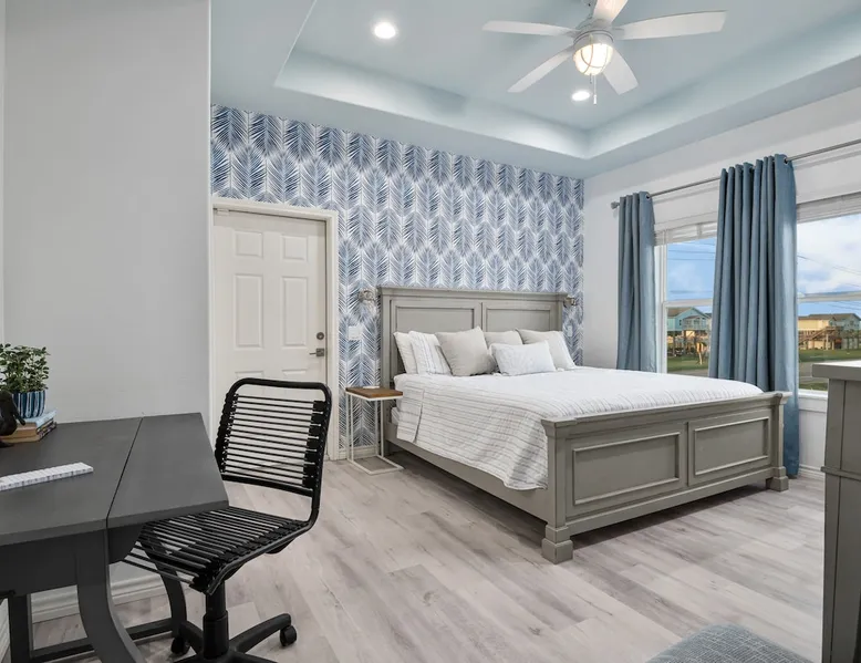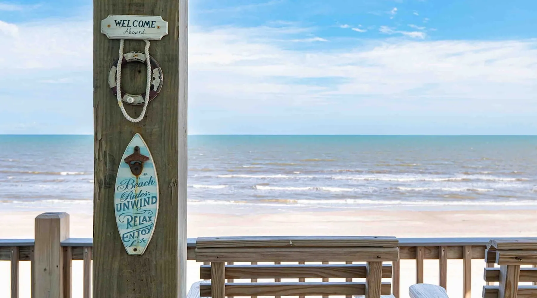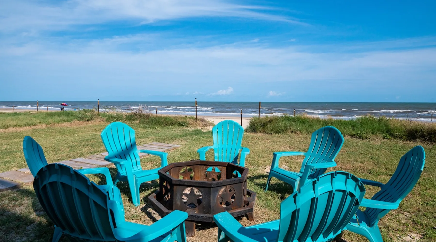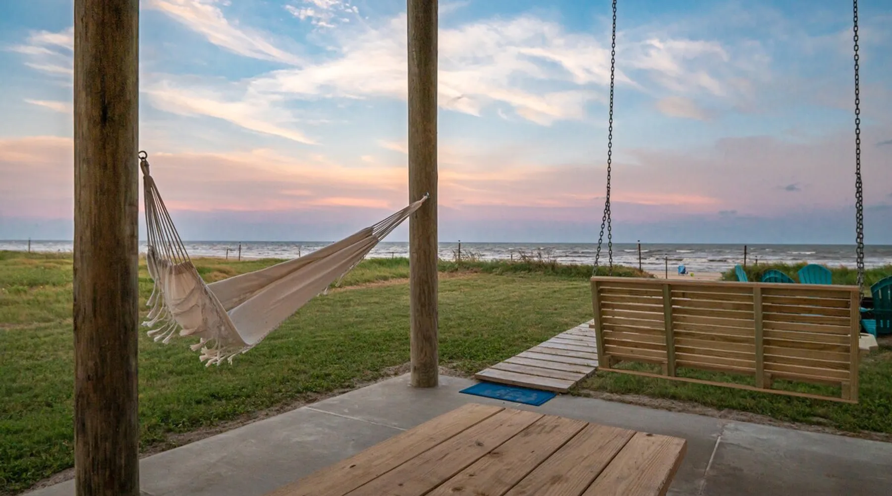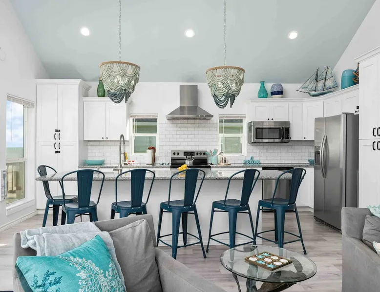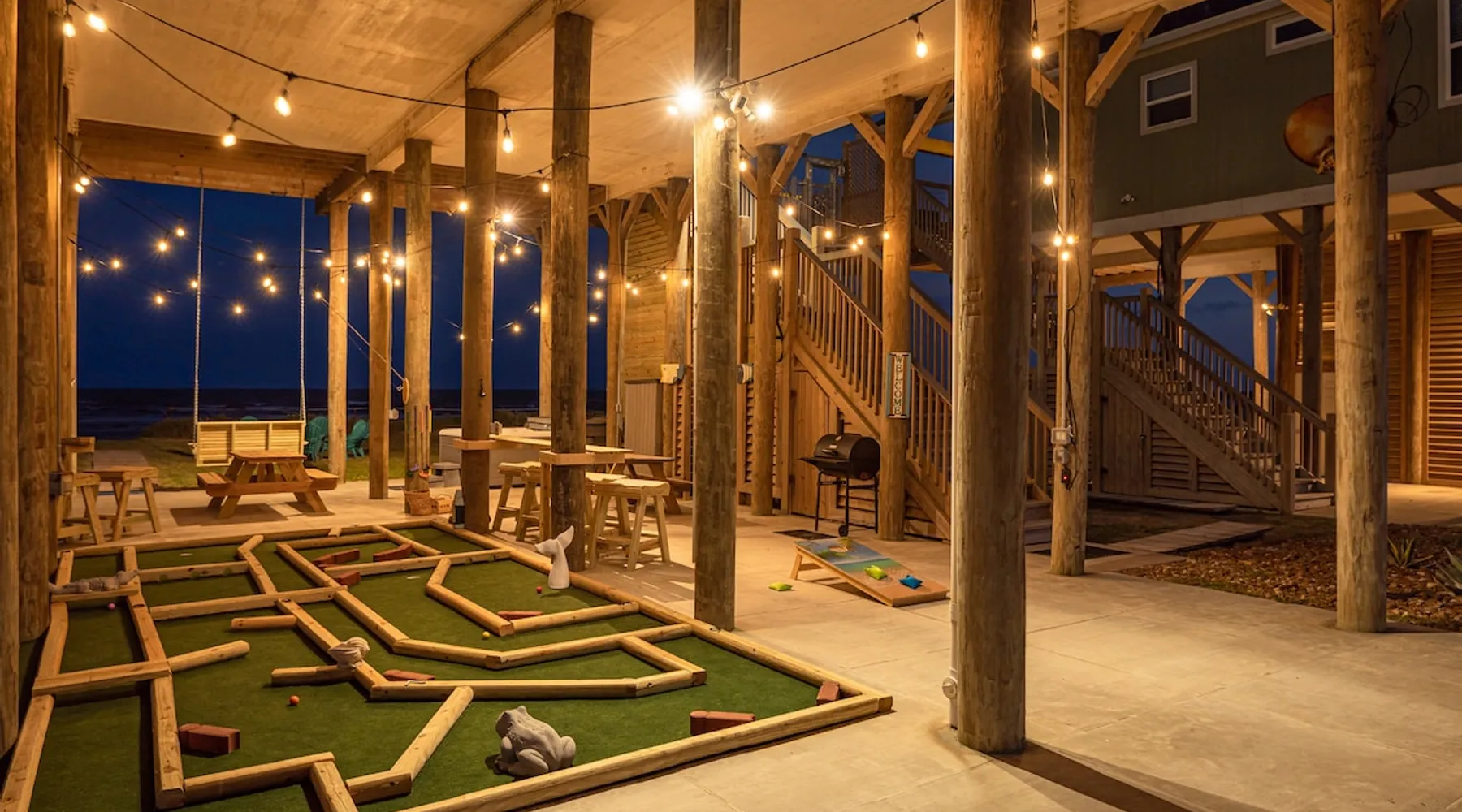 Located on one of Texas’ premier beaches, Fore Shore is steps from feeling the sand between your toes, basking in the warm seaside sun, and splashing in the sparkling Gulf waters. This spectacular 3-bedroom, 2-bath beachfront home is beautifully styled with a modern coastal theme, has wide open social areas, comfortable private bedrooms, fantastic outdoor entertaining spaces including mini golf, and is directly on the water - all making for an unforgettably perfect vacation getaway. The space Amenity Highlights ⛳️ Mini Golf 🎲 Board games, yard games, and even an arcade game 🚿 Outdoor shower 🔥 Fire pit 👶 Everything you need for baby- pack’n’play, changing pad, dishes, and high chair 🏖️ Beach chairs, gear, and toys ❄️Central HVAC system, ceiling fans and box fan 🧺 Laundry is on-site and complementary ⭐️ Complimentary unlimited Wi-Fi ⭐️Dedicated workspace ⭐️ Comprehensive housewares package + standard small appliances ⭐️Fresh linens, towels, and beach towels for every guest At Fore Shore beach house, guests will find gulf views in every room, enough space to gather with extended family and friends indoors and out, and endless possibilities for relaxation and fun! The residence boasts an open designer kitchen with high-end appliances and convenient bar seating that seamlessly transitions to the dining and living areas. Guests will love the breathtaking gulf views and watching the sunset from these rooms, or they can head outside to the adjacent covered deck for an even better view with additional dining options, a seating area, and quick escape to the sand and sea. BEDROOMS Three private bedrooms (all with smart televisions) and two full baths comfortably accommodate up to 10 guests. There is a total of 1 king bed, 1 queen bed, 4 twin beds (bunks), and a sleeper sofa in the living room. Bedroom one- Indulge in the spacious luxury of the primary bedroom featuring a king bed. It has an ensuite bathroom and access to a private balcony. There is also a desk in case you need to check off some work items before you head out for a day in the sun. Bedroom two- features a lovely queen bed and smart tv. The design blends comfort and style seamlessly which invites relaxation. Bedroom 3- is styled as a double bunk room – a fun feature that kids always love. It is comfortable and cozy and has a cabinet of bedtime storybooks for your young ones to enjoy. BATHROOMS The home has 2 clean and bright bathrooms. You’ll find one walk-in shower and one shower/tub combo. Showers are stocked with shampoo, body wash and conditioner. OUTDOOR SPACE Outdoor living at Fore Shore is amazing, too! A covered outdoor entertainment court down below is definitely the hot spot to chill day or night. Perfect your putting skills on the 9-hole mini golf course, host a cornhole tournament, nap in the hammock, relax on the porch swing, then prepare the catch of the day on the BBQ grill and serve alfresco in the shady picnic spot. Once the sun goes down, gather at the beachside firepit with Adirondack seating for s’mores and stargazing. Ample on-site parking, an outdoor shower with hot and cold water for rinsing off after seaside excursions, and convenient laundry machines add to the long list of thoughtful on-property service extras. And be sure to find the hidden stand-up arcade and make the most of all the board games when not at the beach! Guest access You’ll have access to every room and feature of this home except locked owner’s storage. Make yourself at home; hosts are just a text or call away if you need anything! Other things to note We know and understand that FUR BABIES are an extension of most families, we DO NOT ALLOW pets of any kind out of respect for the health and safety of all current and future guests. Thank you for understanding and leaving your pets behind.