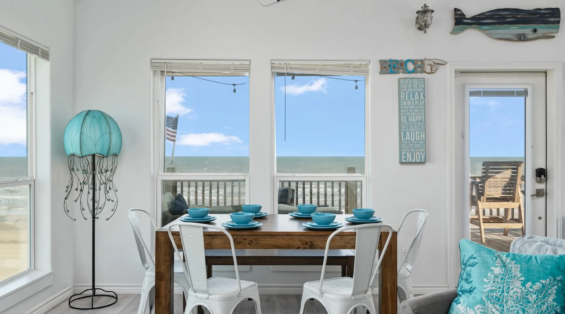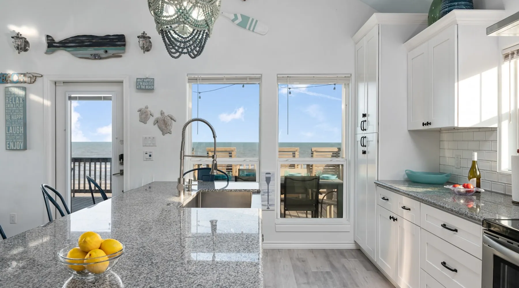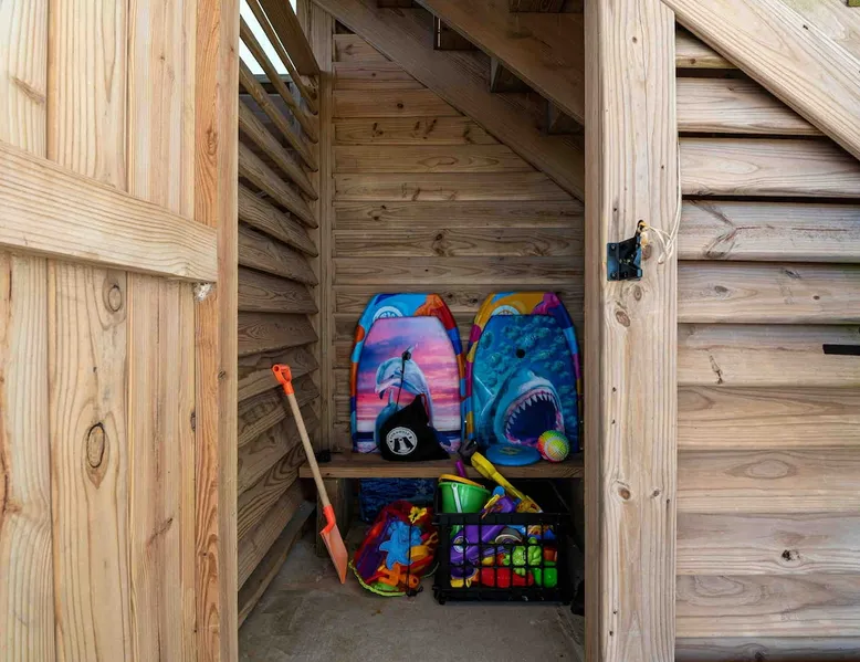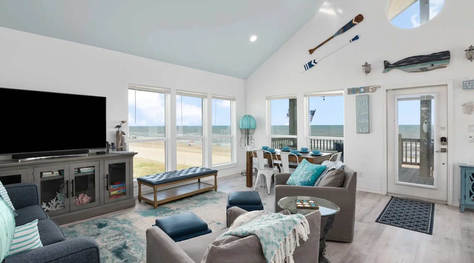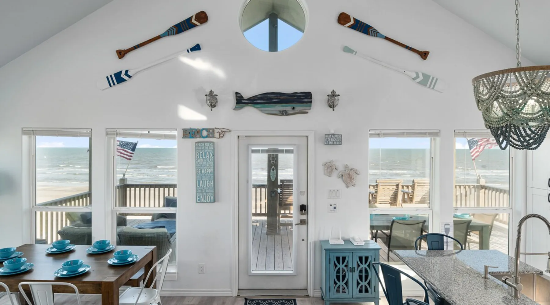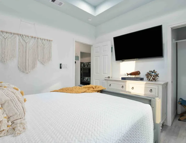Located on one of Texas’ premier beaches, Fore Shore is steps from feeling the sand between your toes, basking in the warm seaside sun, and splashing in the sparkling Gulf waters. This spectacular 3-bedroom, 2-bath beachfront home is beautifully styled with a modern coastal theme, has wide open social areas, comfortable private bedrooms, fantastic outdoor entertaining spaces including mini golf, and is directly on the water - all making for an unforgettably perfect vacation getaway. The space Amenity Highlights ⛳️ Mini Golf 🎲 Board games, yard games, and even an arcade game 🚿 Outdoor shower 🔥 Fire pit 👶 Everything you need for baby- pack’n’play, changing pad, dishes, and high chair 🏖️ Beach chairs, gear, and toys ❄️Central HVAC system, ceiling fans and box fan 🧺 Laundry is on-site and complementary ⭐️ Complimentary unlimited Wi-Fi ⭐️Dedicated workspace ⭐️ Comprehensive housewares package + standard small appliances ⭐️Fresh linens, towels, and beach towels for every guest At Fore Shore beach house, guests will find gulf views in every room, enough space to gather with extended family and friends indoors and out, and endless possibilities for relaxation and fun! The residence boasts an open designer kitchen with high-end appliances and convenient bar seating that seamlessly transitions to the dining and living areas. Guests will love the breathtaking gulf views and watching the sunset from these rooms, or they can head outside to the adjacent covered deck for an even better view with additional dining options, a seating area, and quick escape to the sand and sea. BEDROOMS Three private bedrooms (all with smart televisions) and two full baths comfortably accommodate up to 10 guests. There is a total of 1 king bed, 1 queen bed, 4 twin beds (bunks), and a sleeper sofa in the living room. Bedroom one- Indulge in the spacious luxury of the primary bedroom featuring a king bed. It has an ensuite bathroom and access to a private balcony. There is also a desk in case you need to check off some work items before you head out for a day in the sun. Bedroom two- features a lovely queen bed and smart tv. The design blends comfort and style seamlessly which invites relaxation. Bedroom 3- is styled as a double bunk room – a fun feature that kids always love. It is comfortable and cozy and has a cabinet of bedtime storybooks for your young ones to enjoy. BATHROOMS The home has 2 clean and bright bathrooms. You’ll find one walk-in shower and one shower/tub combo. Showers are stocked with shampoo, body wash and conditioner. OUTDOOR SPACE Outdoor living at Fore Shore is amazing, too! A covered outdoor entertainment court down below is definitely the hot spot to chill day or night. Perfect your putting skills on the 9-hole mini golf course, host a cornhole tournament, nap in the hammock, relax on the porch swing, then prepare the catch of the day on the BBQ grill and serve alfresco in the shady picnic spot. Once the sun goes down, gather at the beachside firepit with Adirondack seating for s’mores and stargazing. Ample on-site parking, an outdoor shower with hot and cold water for rinsing off after seaside excursions, and convenient laundry machines add to the long list of thoughtful on-property service extras. And be sure to find the hidden stand-up arcade and make the most of all the board games when not at the beach! Guest access You’ll have access to every room and feature of this home except locked owner’s storage. Make yourself at home; hosts are just a text or call away if you need anything! Other things to note We know and understand that FUR BABIES are an extension of most families, we DO NOT ALLOW pets of any kind out of respect for the health and safety of all current and future guests. Thank you for understanding and leaving your pets behind.