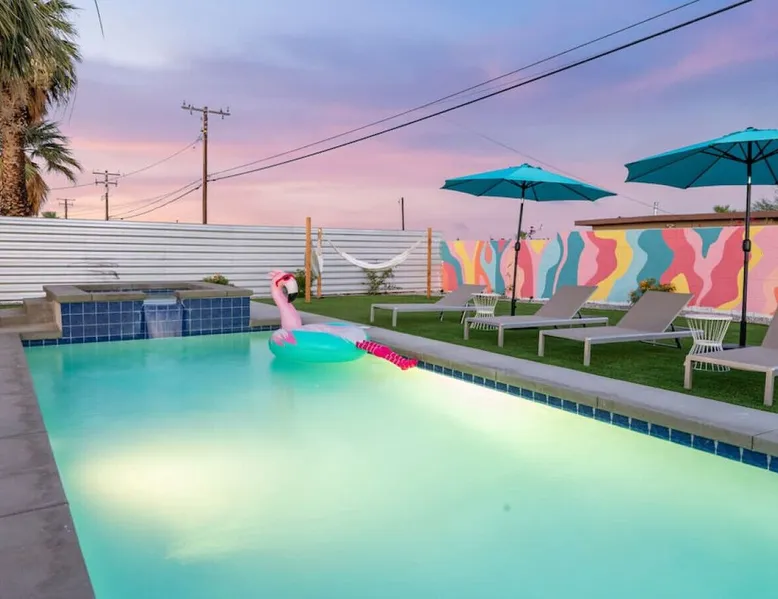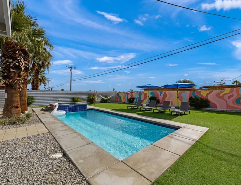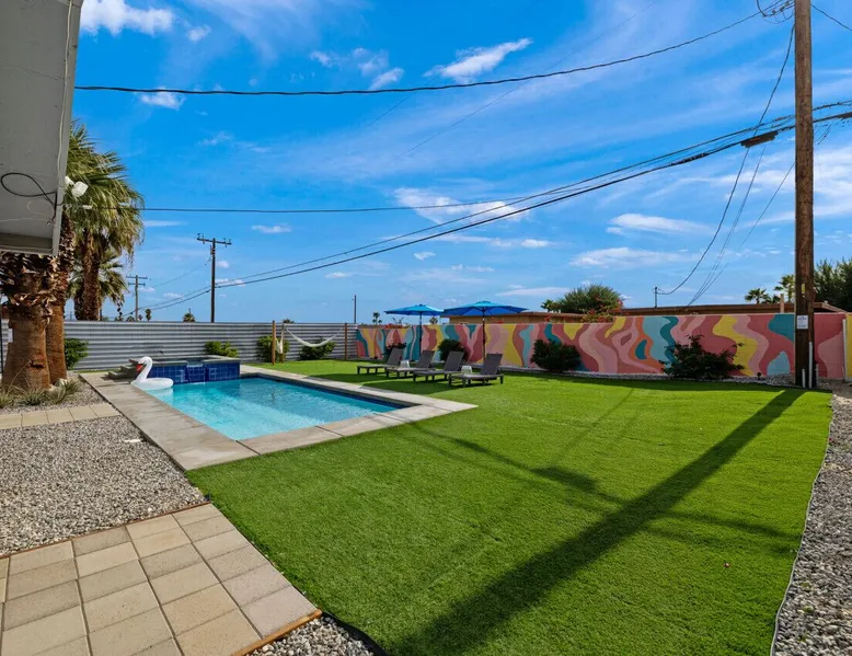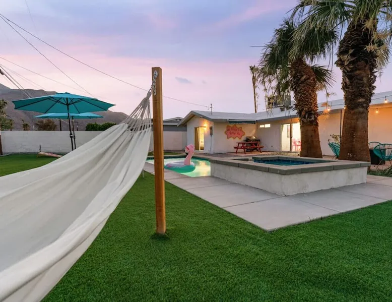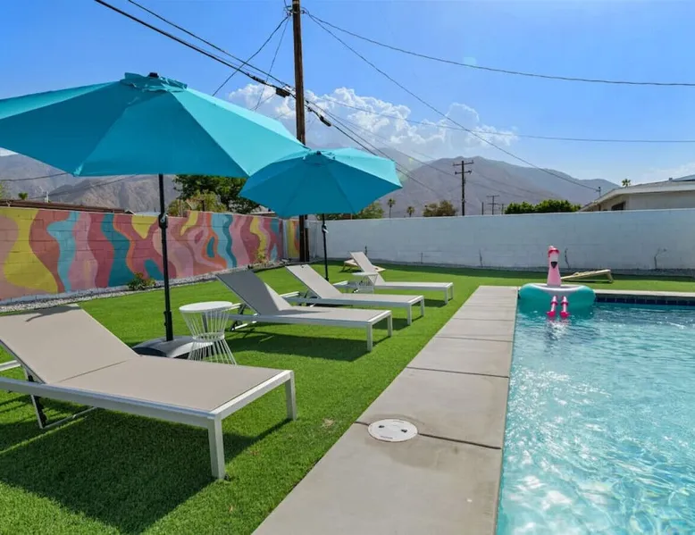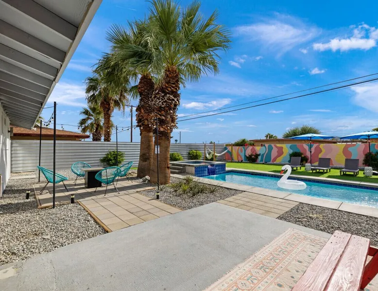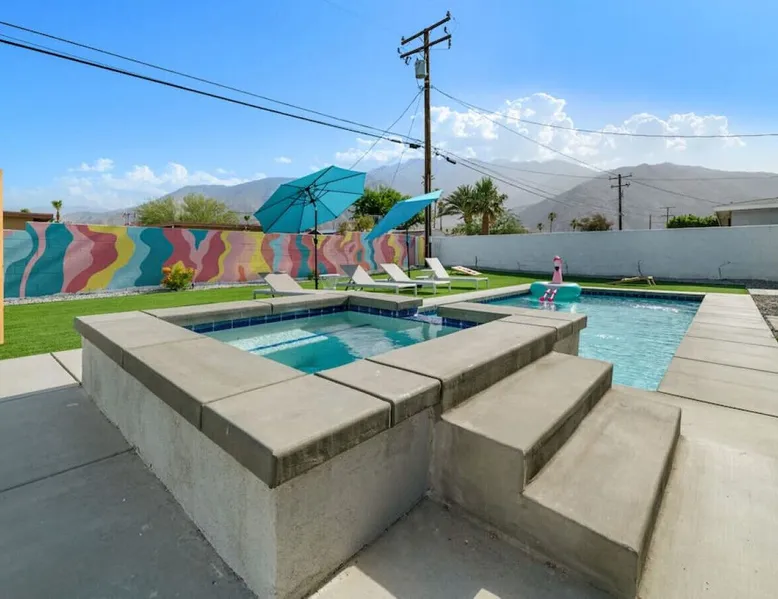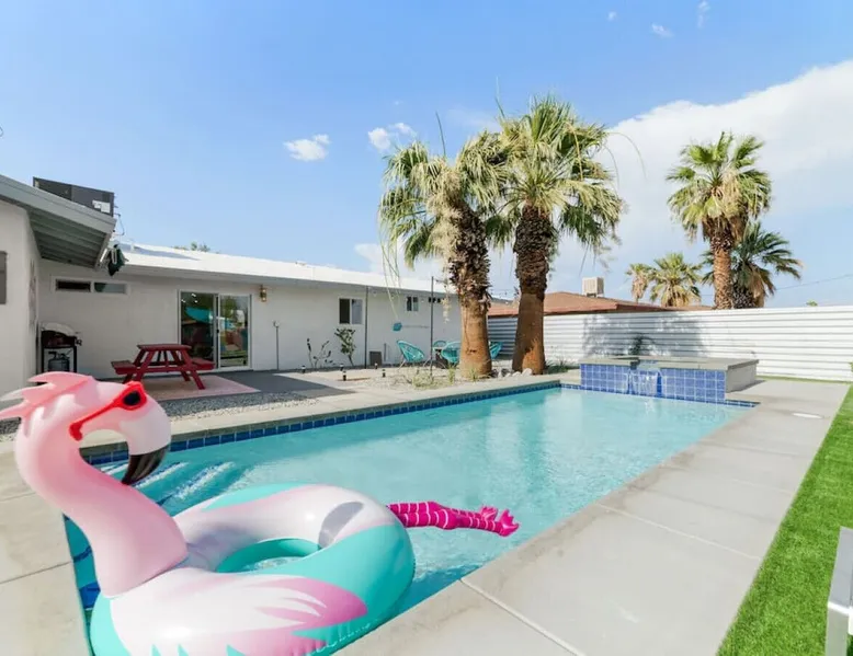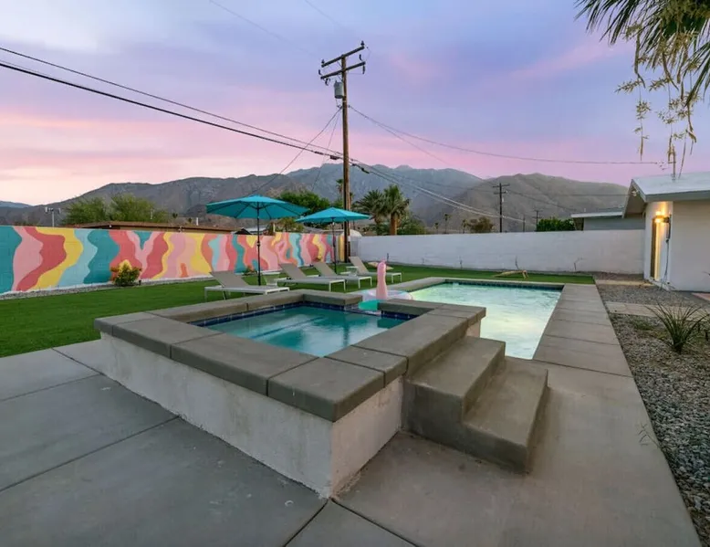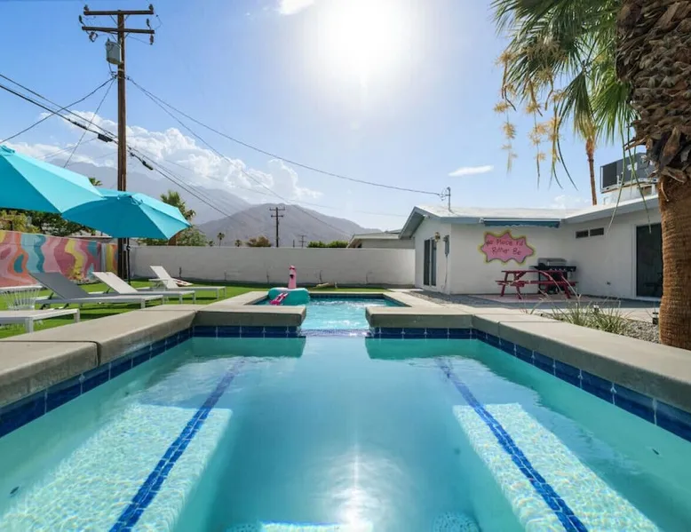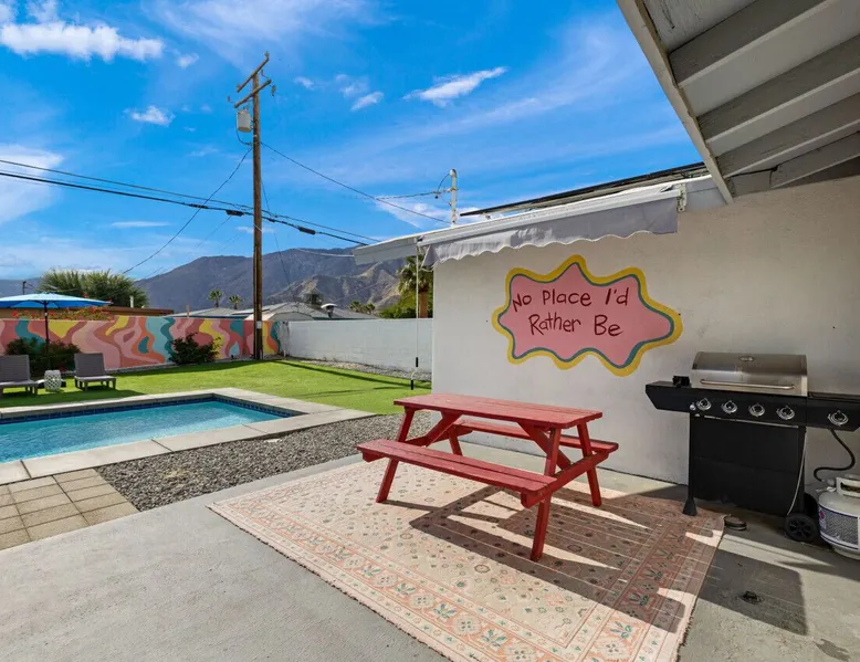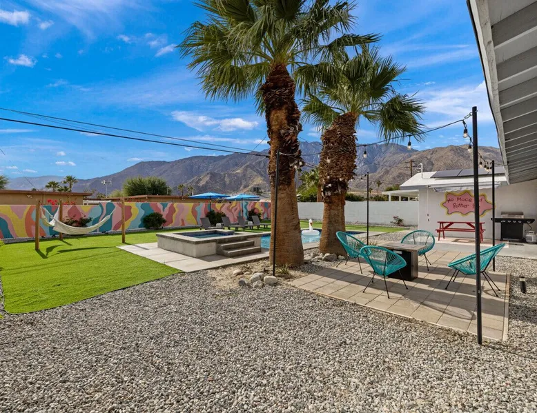 Where tranquility meets epic mountain views! Whether it's a bachelorette bash, a birthday celebration, or a pet-friendly retreat, our paradise has it all. Relax in style with stunning views of the San Jacinto from your heated saltwater pool, hot tub, or hammock. Enjoy outdoor dining, a cozy fire pit, and a fully equipped kitchen with complimentary coffee. With an IG-worthy mural, & just mins from Downtown Palm Springs, the Aerial Tramway, and the airport, your perfect getaway awaits! ☆ Recent Guest Review: "Just like the photos, very responsive and friendly host! Easy to find and great location if you want to enjoy your stay and not be bothered! Would definitely stay again! Such a cute and vibey place!” Cythally Backyard • Large salt water pool, with optional heating • 6x6 hot tub with mountain and sunset views • Sun lounge chairs, drink tables and sun umbrellas • Propane burning fire pit and lounge chairs • Outdoor dining table and chairs • Propane BBQ • Pool toys, floats, games and pump all available for your use • Large green turf grass for you to enjoy a game of corn hole • Pool towels Living room • Super comfortable couch, coffee table and armchairs • Smart TV with Roku, Netflix and Disney+ • Epic (and slightly competitive) evenings of board game fun! Dining room • Seating for 6 at a large table • Steps from the kitchen and outdoor area Kitchen • Brand new appliances including an oven, stove, microwave, dishwasher and a Whirlpool side by side refrigerator with water dispenser and ice machine • Complimentary tea and coffee station • KEURIG machine with coffee pods, cream and sugar • Pour over kettle with a wide selection of teas • Cooking basics- salt and pepper, cooking oil, foil, plastic wrap, baking paper • High velocity blender • Non-stick frying pans and cooking utensils • Plastic cups for outdoor and pool use • BBQ tools Laundry • Washer & dryer with complimentary laundry detergent and dryer napkins Bedrooms • First bedroom- Queen bed, dresser, lamps smart TV with Roku, Netflix and Disney+, private en-suite bathroom with walk in shower, and pack-and-play if you're traveling with your mini • Second bedroom- Queen bed, dresser, lamps, smart TV with Roku, Netflix and Disney+, direct access to backyard and private pool and yard entrance • Bedroom 3- One full over full bunk bed • All bedrooms equip with smart alarm clocks, built-in full-length mirror sliding closets with coat hangers, luggage stands and extra pillows and bedding Bathrooms • Master bathroom has direct access from the master bedroom it has a smart Bluetooth multimedia mirror, so you can listen to your music while in the bed or bathroom • Both bathrooms are equipped with shampoo, conditioner, body wash, complementary bathroom amenities including hair dryers and makeup towels. Storage closet •Located in the hallway, our storage closet is stocked with any extra things you may need to make your vacation feel more like a home. Including a sounds machine, extra pool and diving toys, a pool toy pump, toolbox, first aid kit, iron, ironing board, bug spray, sunscreen, aloe vera, fly swatters, a vacuum, steam mop and clean mop pads, broom and dustpan, laundry basket, close drying rack, extra propane tank and the awning handle to open the shade pergola. Distance from home to popular attractions ☆ Downtown Palm Springs: 3.5 miles ☆ Palm Springs Aerial Tramway: 5 miles ☆ Palm Springs International Airport: 5.9 miles ☆ Cabazon Outlets: 17 miles ☆ The Living Desert Zoo and Gardens: 24 miles ☆ Empire Polo Club: 29 miles ☆ Joshua Tree National Park: 36 miles ☆ Pet-Friendly Accommodations: We welcome pets for a fee of $150 per pet, per stay. Please note that a pet fee will be applied to cover the cleaning of pet hair. If any waste beyond hair (such as urine or feces) is found, an additional cleaning fee of $35-$50 will be charged. Cleaning up after your pet is your responsibility, pets should not be left unattended in the home and are not allowed in pool. *Additional pet fees (plus tax) will be processed through our guest portal after your reservation is confirmed. Kindly let us know if you’ll be traveling with a pet. Thank you for your cooperation! ☆ Hot Tub: The use of the hot tub is included in your nightly rate, it can be heated from the backyard it takes about 30 minutes to get to 100-102 degrees. ☆ Pool heater: The pool requires a lot of natural gas to heat, so using this will incur a daily fee of $100 (Plus Tax). This will be billed prior to your arrival if you request it. Our pool cleaner comes every Monday and Thursday; he comes and goes through the side gate and will not worry you throughout your stay. ☆ Desert living: This home, like many in Palm Springs, is located in the desert, so it's natural for sand to be around. On windy days, some sand and leaves may blow into the pool. While our pool cleaners do their best to keep it clear, there may occasionally be some debris in the water. We provide skimmers for your convenience if you'd like to remove any leaves or sand yourself. ☆ Bachelorette Parties: Given the design of our home, it is a popular choice for bachelorette celebrations. In collaboration with West Coast Bach, we provide enhanced services such as balloon arches, photo backdrops, marquee letters, bubbly/tequila bars, fridge stocking, charcuterie boards, and even cabana boy services. Our goal is to streamline your preparations and create a dreamy setup for your event. If you're booking for a bachelorette party and require assistance with these services, please inform us upon booking! ☆ Location: Our home is located in the up-and-coming neighborhood of Tram View Heights, a community that reflects the evolving character of Palm Springs. The area is experiencing redevelopment and growth, adding to its vibrant and dynamic atmosphere. Like other parts of Palm Springs. Like many urban areas, you may notice a visible homeless popul