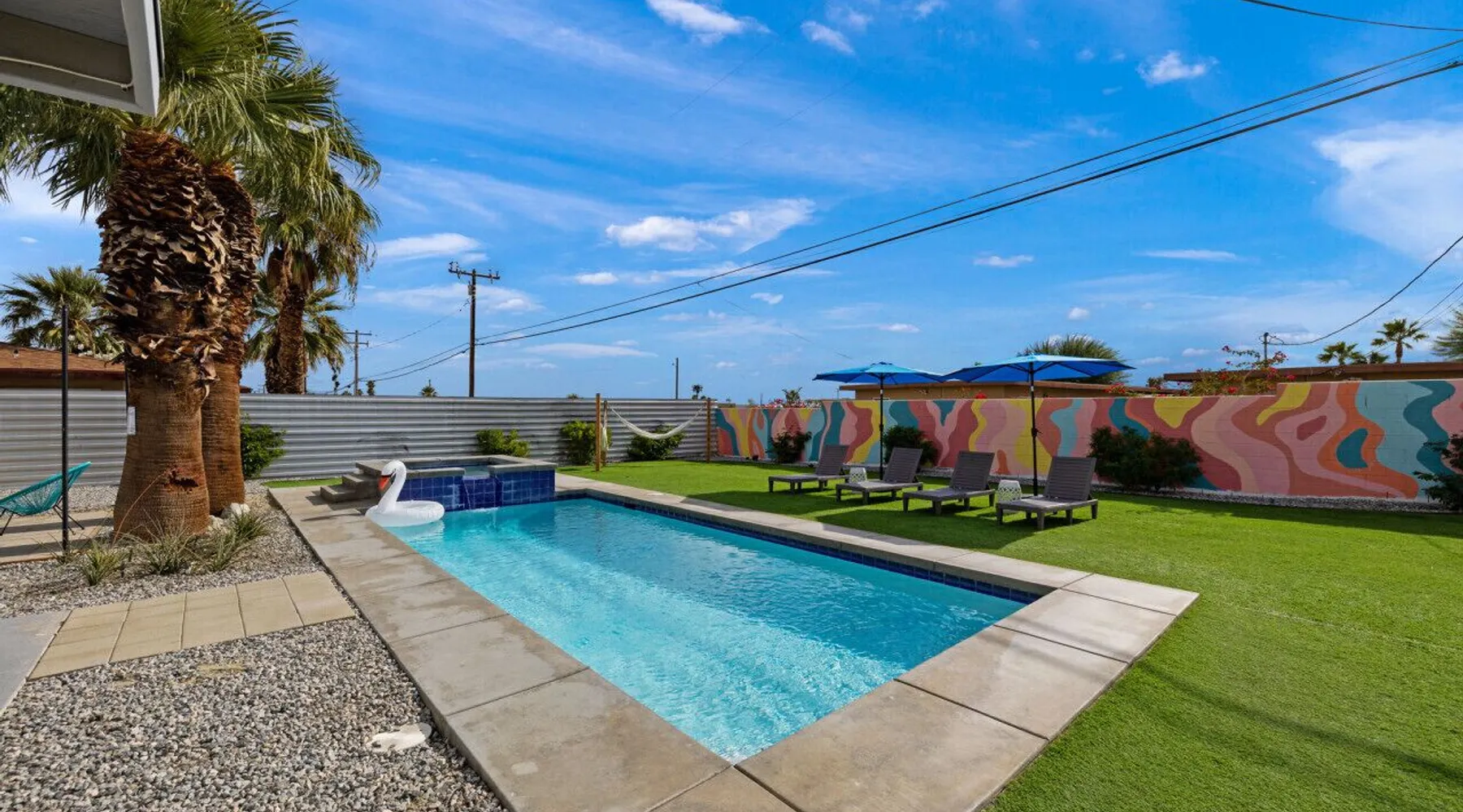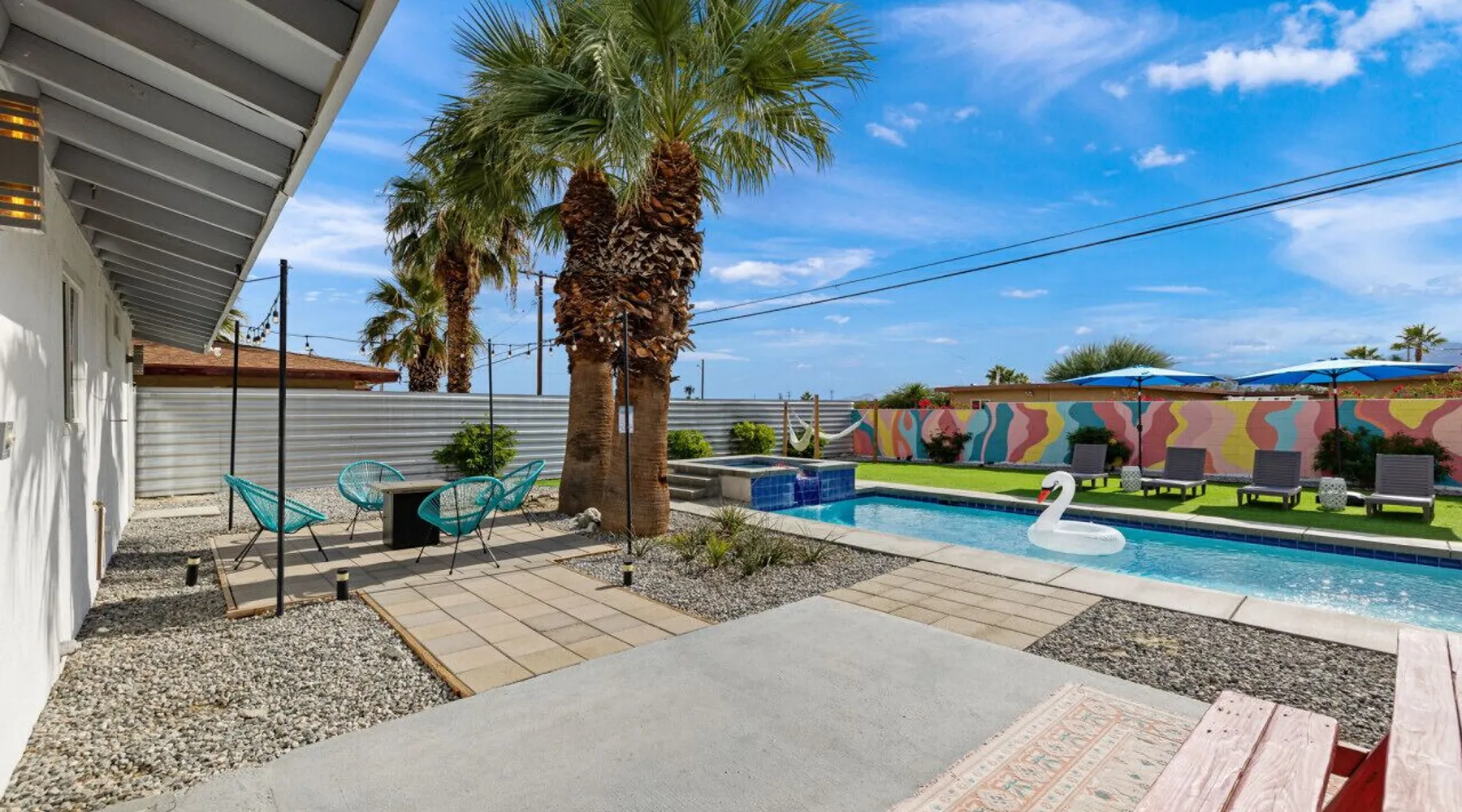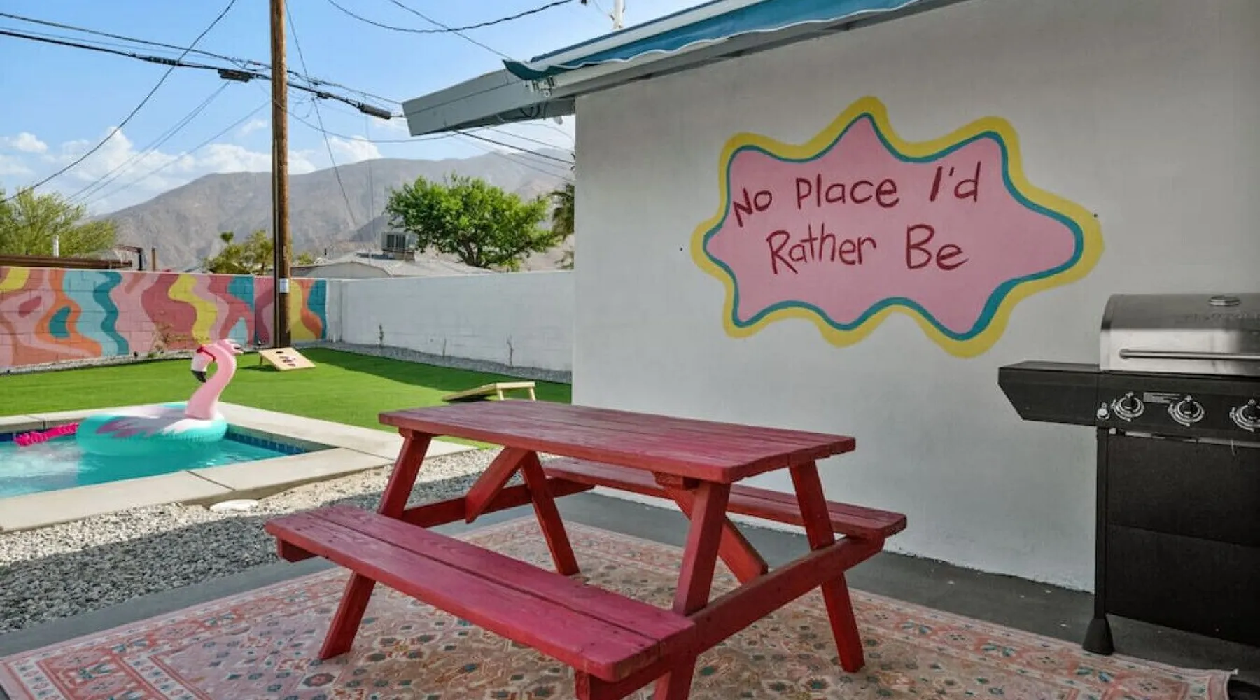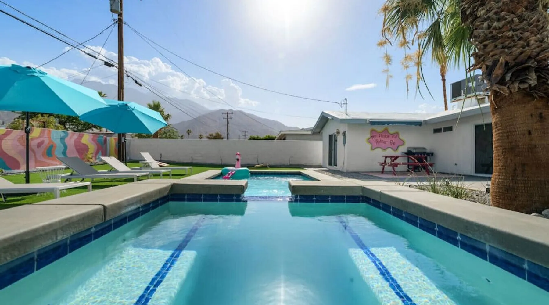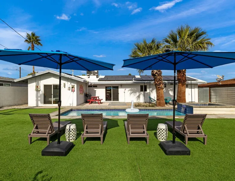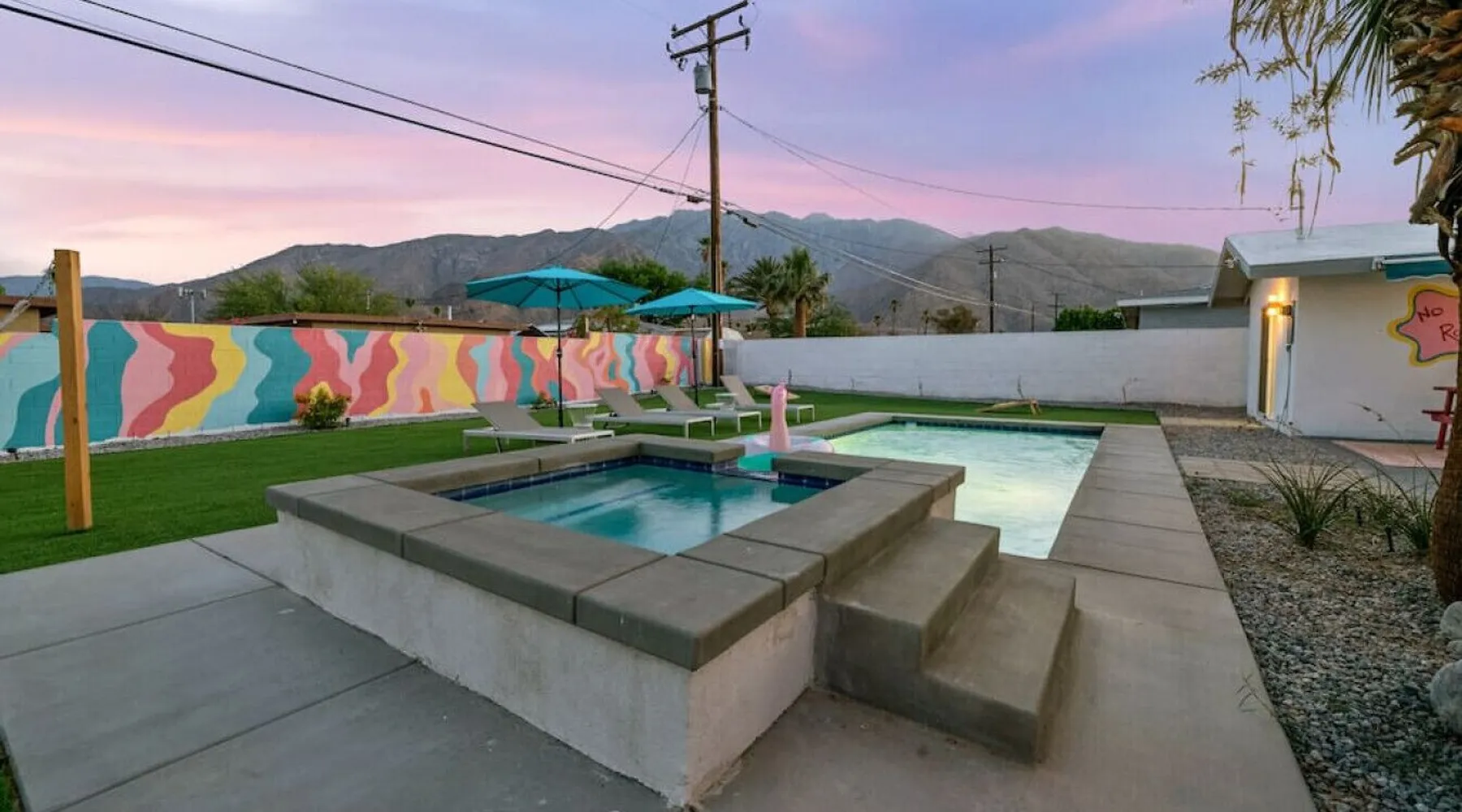 Where tranquility meets epic mountain views! Whether it's a bachelorette bash, a birthday celebration, or a pet-friendly retreat, our paradise has it all. Relax in style with stunning views of the San Jacinto from your heated saltwater pool, hot tub, or hammock. Enjoy outdoor dining, a cozy fire pit, and a fully equipped kitchen with complimentary coffee. With an IG-worthy mural, & just mins from Downtown Palm Springs, the Aerial Tramway, and the airport, your perfect getaway awaits! ☆ Recent Guest Review: "Just like the photos, very responsive and friendly host! Easy to find and great location if you want to enjoy your stay and not be bothered! Would definitely stay again! Such a cute and vibey place!” Cythally Backyard • Large salt water pool, with optional heating • 6x6 hot tub with mountain and sunset views • Sun lounge chairs, drink tables and sun umbrellas • Propane burning fire pit and lounge chairs • Outdoor dining table and chairs • Propane BBQ • Pool toys, floats, games and pump all available for your use • Large green turf grass for you to enjoy a game of corn hole • Pool towels Living room • Super comfortable couch, coffee table and armchairs • Smart TV with Roku, Netflix and Disney+ • Epic (and slightly competitive) evenings of board game fun! Dining room • Seating for 6 at a large table • Steps from the kitchen and outdoor area Kitchen • Brand new appliances including an oven, stove, microwave, dishwasher and a Whirlpool side by side refrigerator with water dispenser and ice machine • Complimentary tea and coffee station • KEURIG machine with coffee pods, cream and sugar • Pour over kettle with a wide selection of teas • Cooking basics- salt and pepper, cooking oil, foil, plastic wrap, baking paper • High velocity blender • Non-stick frying pans and cooking utensils • Plastic cups for outdoor and pool use • BBQ tools Laundry • Washer & dryer with complimentary laundry detergent and dryer napkins Bedrooms • First bedroom- Queen bed, dresser, lamps smart TV with Roku, Netflix and Disney+, private en-suite bathroom with walk in shower, and pack-and-play if you're traveling with your mini • Second bedroom- Queen bed, dresser, lamps, smart TV with Roku, Netflix and Disney+, direct access to backyard and private pool and yard entrance • Bedroom 3- One full over full bunk bed • All bedrooms equip with smart alarm clocks, built-in full-length mirror sliding closets with coat hangers, luggage stands and extra pillows and bedding Bathrooms • Master bathroom has direct access from the master bedroom it has a smart Bluetooth multimedia mirror, so you can listen to your music while in the bed or bathroom • Both bathrooms are equipped with shampoo, conditioner, body wash, complementary bathroom amenities including hair dryers and makeup towels. Storage closet •Located in the hallway, our storage closet is stocked with any extra things you may need to make your vacation feel more like a home. Including a sounds machine, extra pool and diving toys, a pool toy pump, toolbox, first aid kit, iron, ironing board, bug spray, sunscreen, aloe vera, fly swatters, a vacuum, steam mop and clean mop pads, broom and dustpan, laundry basket, close drying rack, extra propane tank and the awning handle to open the shade pergola. Distance from home to popular attractions ☆ Downtown Palm Springs: 3.5 miles ☆ Palm Springs Aerial Tramway: 5 miles ☆ Palm Springs International Airport: 5.9 miles ☆ Cabazon Outlets: 17 miles ☆ The Living Desert Zoo and Gardens: 24 miles ☆ Empire Polo Club: 29 miles ☆ Joshua Tree National Park: 36 miles ☆ Pet-Friendly Accommodations: We welcome pets for a fee of $150 per pet, per stay. Please note that a pet fee will be applied to cover the cleaning of pet hair. If any waste beyond hair (such as urine or feces) is found, an additional cleaning fee of $35-$50 will be charged. Cleaning up after your pet is your responsibility, pets should not be left unattended in the home and are not allowed in pool. *Additional pet fees (plus tax) will be processed through our guest portal after your reservation is confirmed. Kindly let us know if you’ll be traveling with a pet. Thank you for your cooperation! ☆ Hot Tub: The use of the hot tub is included in your nightly rate, it can be heated from the backyard it takes about 30 minutes to get to 100-102 degrees. ☆ Pool heater: The pool requires a lot of natural gas to heat, so using this will incur a daily fee of $100 (Plus Tax). This will be billed prior to your arrival if you request it. Our pool cleaner comes every Monday and Thursday; he comes and goes through the side gate and will not worry you throughout your stay. ☆ Desert living: This home, like many in Palm Springs, is located in the desert, so it's natural for sand to be around. On windy days, some sand and leaves may blow into the pool. While our pool cleaners do their best to keep it clear, there may occasionally be some debris in the water. We provide skimmers for your convenience if you'd like to remove any leaves or sand yourself. ☆ Bachelorette Parties: Given the design of our home, it is a popular choice for bachelorette celebrations. In collaboration with West Coast Bach, we provide enhanced services such as balloon arches, photo backdrops, marquee letters, bubbly/tequila bars, fridge stocking, charcuterie boards, and even cabana boy services. Our goal is to streamline your preparations and create a dreamy setup for your event. If you're booking for a bachelorette party and require assistance with these services, please inform us upon booking! ☆ Location: Our home is located in the up-and-coming neighborhood of Tram View Heights, a community that reflects the evolving character of Palm Springs. The area is experiencing redevelopment and growth, adding to its vibrant and dynamic atmosphere. Like other parts of Palm Springs. Like many urban areas, you may notice a visible homeless popul