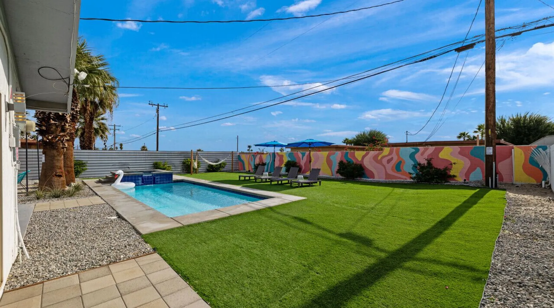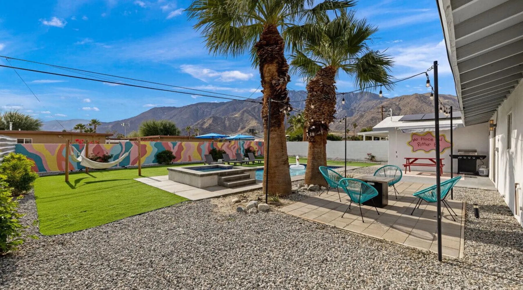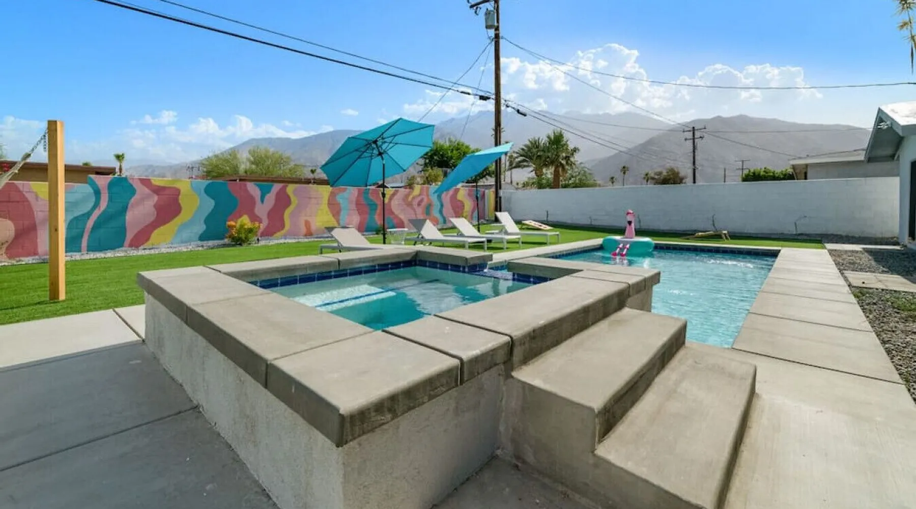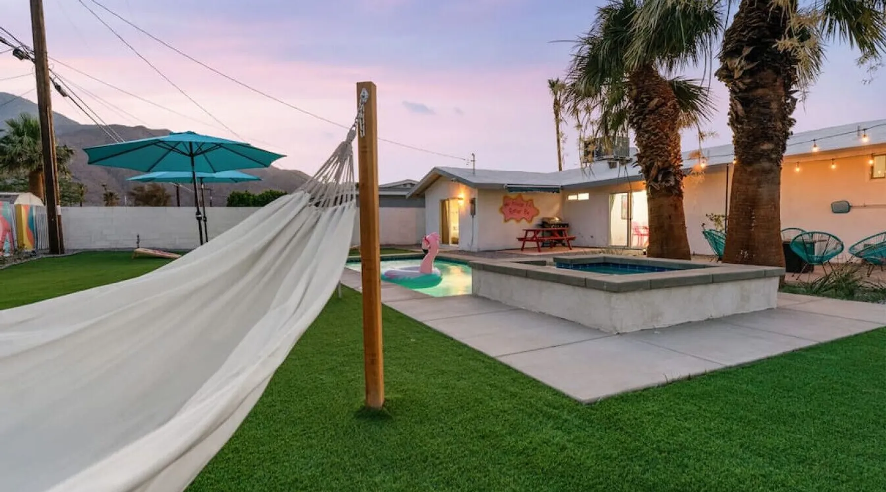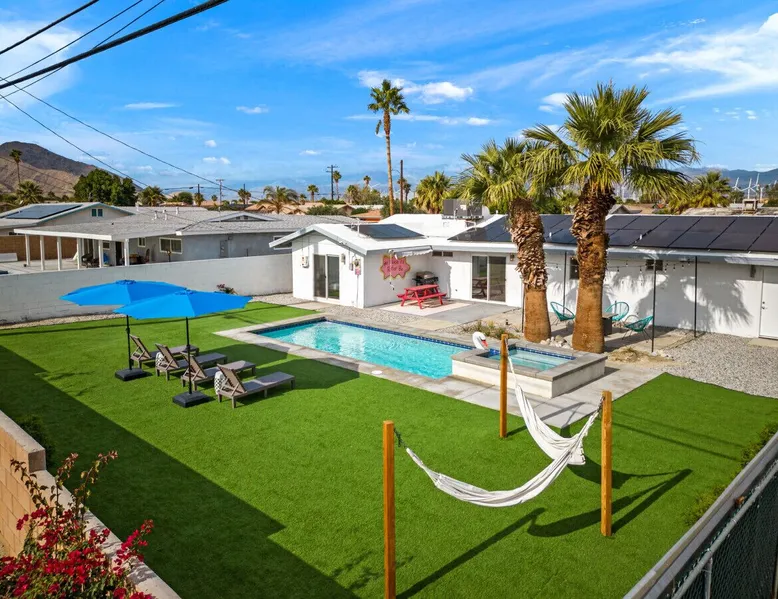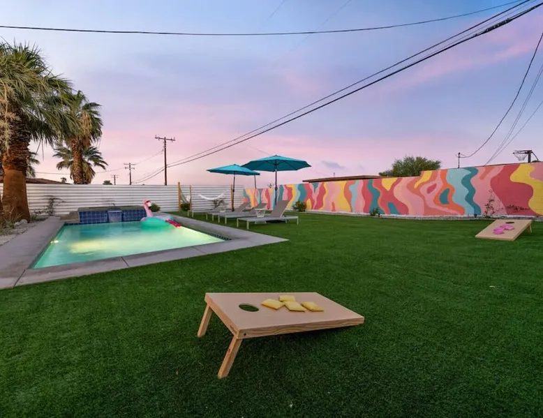 Where tranquility meets epic mountain views! Whether it's a bachelorette bash, a birthday celebration, or a pet-friendly retreat, our paradise has it all. Relax in style with stunning views of the San Jacinto from your heated saltwater pool, hot tub, or hammock. Enjoy outdoor dining, a cozy fire pit, and a fully equipped kitchen with complimentary coffee. With an IG-worthy mural, & just mins from Downtown Palm Springs, the Aerial Tramway, and the airport, your perfect getaway awaits! ☆ Recent Guest Review: "Just like the photos, very responsive and friendly host! Easy to find and great location if you want to enjoy your stay and not be bothered! Would definitely stay again! Such a cute and vibey place!” Cythally Backyard • Large salt water pool, with optional heating • 6x6 hot tub with mountain and sunset views • Sun lounge chairs, drink tables and sun umbrellas • Propane burning fire pit and lounge chairs • Outdoor dining table and chairs • Propane BBQ • Pool toys, floats, games and pump all available for your use • Large green turf grass for you to enjoy a game of corn hole • Pool towels Living room • Super comfortable couch, coffee table and armchairs • Smart TV with Roku, Netflix and Disney+ • Epic (and slightly competitive) evenings of board game fun! Dining room • Seating for 6 at a large table • Steps from the kitchen and outdoor area Kitchen • Brand new appliances including an oven, stove, microwave, dishwasher and a Whirlpool side by side refrigerator with water dispenser and ice machine • Complimentary tea and coffee station • KEURIG machine with coffee pods, cream and sugar • Pour over kettle with a wide selection of teas • Cooking basics- salt and pepper, cooking oil, foil, plastic wrap, baking paper • High velocity blender • Non-stick frying pans and cooking utensils • Plastic cups for outdoor and pool use • BBQ tools Laundry • Washer & dryer with complimentary laundry detergent and dryer napkins Bedrooms • First bedroom- Queen bed, dresser, lamps smart TV with Roku, Netflix and Disney+, private en-suite bathroom with walk in shower, and pack-and-play if you're traveling with your mini • Second bedroom- Queen bed, dresser, lamps, smart TV with Roku, Netflix and Disney+, direct access to backyard and private pool and yard entrance • Bedroom 3- One full over full bunk bed • All bedrooms equip with smart alarm clocks, built-in full-length mirror sliding closets with coat hangers, luggage stands and extra pillows and bedding Bathrooms • Master bathroom has direct access from the master bedroom it has a smart Bluetooth multimedia mirror, so you can listen to your music while in the bed or bathroom • Both bathrooms are equipped with shampoo, conditioner, body wash, complementary bathroom amenities including hair dryers and makeup towels. Storage closet •Located in the hallway, our storage closet is stocked with any extra things you may need to make your vacation feel more like a home. Including a sounds machine, extra pool and diving toys, a pool toy pump, toolbox, first aid kit, iron, ironing board, bug spray, sunscreen, aloe vera, fly swatters, a vacuum, steam mop and clean mop pads, broom and dustpan, laundry basket, close drying rack, extra propane tank and the awning handle to open the shade pergola. Distance from home to popular attractions ☆ Downtown Palm Springs: 3.5 miles ☆ Palm Springs Aerial Tramway: 5 miles ☆ Palm Springs International Airport: 5.9 miles ☆ Cabazon Outlets: 17 miles ☆ The Living Desert Zoo and Gardens: 24 miles ☆ Empire Polo Club: 29 miles ☆ Joshua Tree National Park: 36 miles ☆ Pet-Friendly Accommodations: We welcome pets for a fee of $150 per pet, per stay. Please note that a pet fee will be applied to cover the cleaning of pet hair. If any waste beyond hair (such as urine or feces) is found, an additional cleaning fee of $35-$50 will be charged. Cleaning up after your pet is your responsibility, pets should not be left unattended in the home and are not allowed in pool. *Additional pet fees (plus tax) will be processed through our guest portal after your reservation is confirmed. Kindly let us know if you’ll be traveling with a pet. Thank you for your cooperation! ☆ Hot Tub: The use of the hot tub is included in your nightly rate, it can be heated from the backyard it takes about 30 minutes to get to 100-102 degrees. ☆ Pool heater: The pool requires a lot of natural gas to heat, so using this will incur a daily fee of $100 (Plus Tax). This will be billed prior to your arrival if you request it. Our pool cleaner comes every Monday and Thursday; he comes and goes through the side gate and will not worry you throughout your stay. ☆ Desert living: This home, like many in Palm Springs, is located in the desert, so it's natural for sand to be around. On windy days, some sand and leaves may blow into the pool. While our pool cleaners do their best to keep it clear, there may occasionally be some debris in the water. We provide skimmers for your convenience if you'd like to remove any leaves or sand yourself. ☆ Bachelorette Parties: Given the design of our home, it is a popular choice for bachelorette celebrations. In collaboration with West Coast Bach, we provide enhanced services such as balloon arches, photo backdrops, marquee letters, bubbly/tequila bars, fridge stocking, charcuterie boards, and even cabana boy services. Our goal is to streamline your preparations and create a dreamy setup for your event. If you're booking for a bachelorette party and require assistance with these services, please inform us upon booking! ☆ Location: Our home is located in the up-and-coming neighborhood of Tram View Heights, a community that reflects the evolving character of Palm Springs. The area is experiencing redevelopment and growth, adding to its vibrant and dynamic atmosphere. Like other parts of Palm Springs. Like many urban areas, you may notice a visible homeless popul