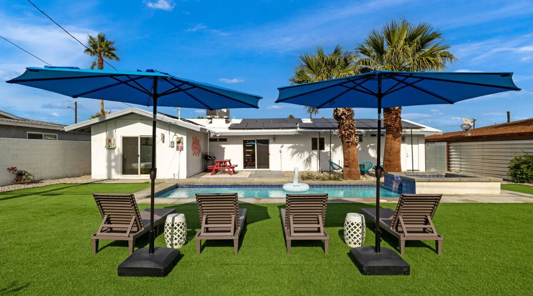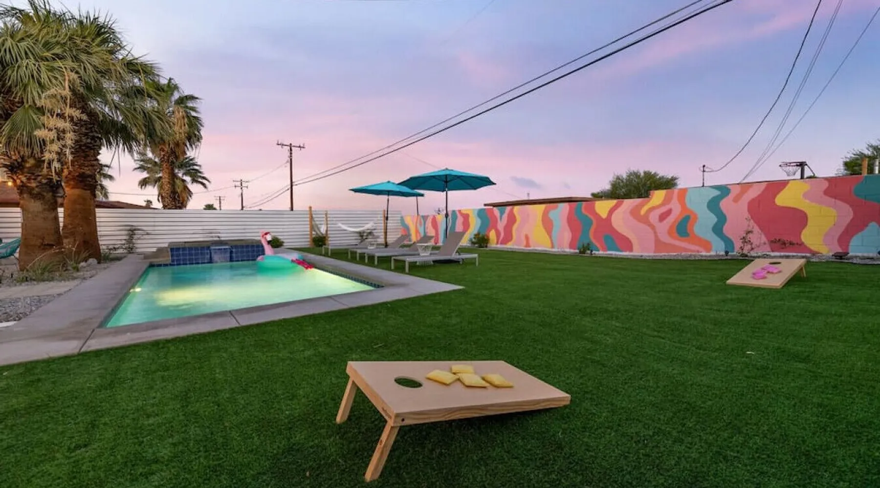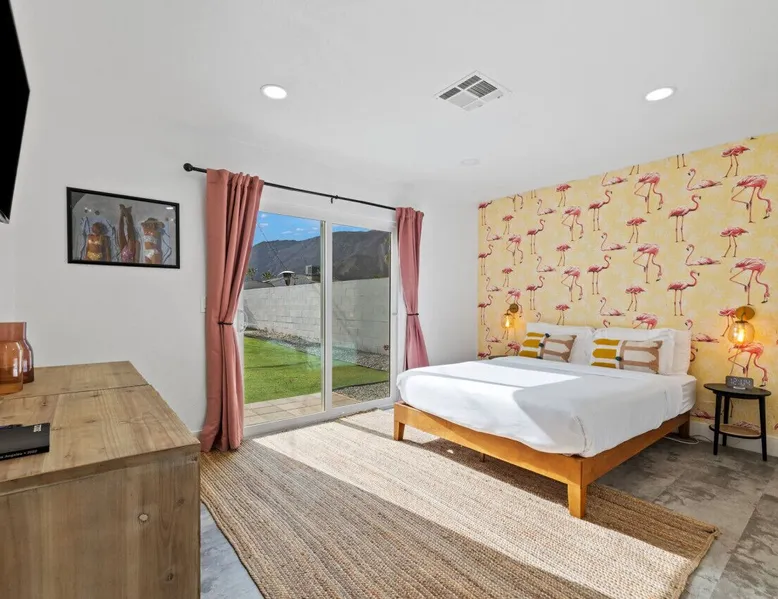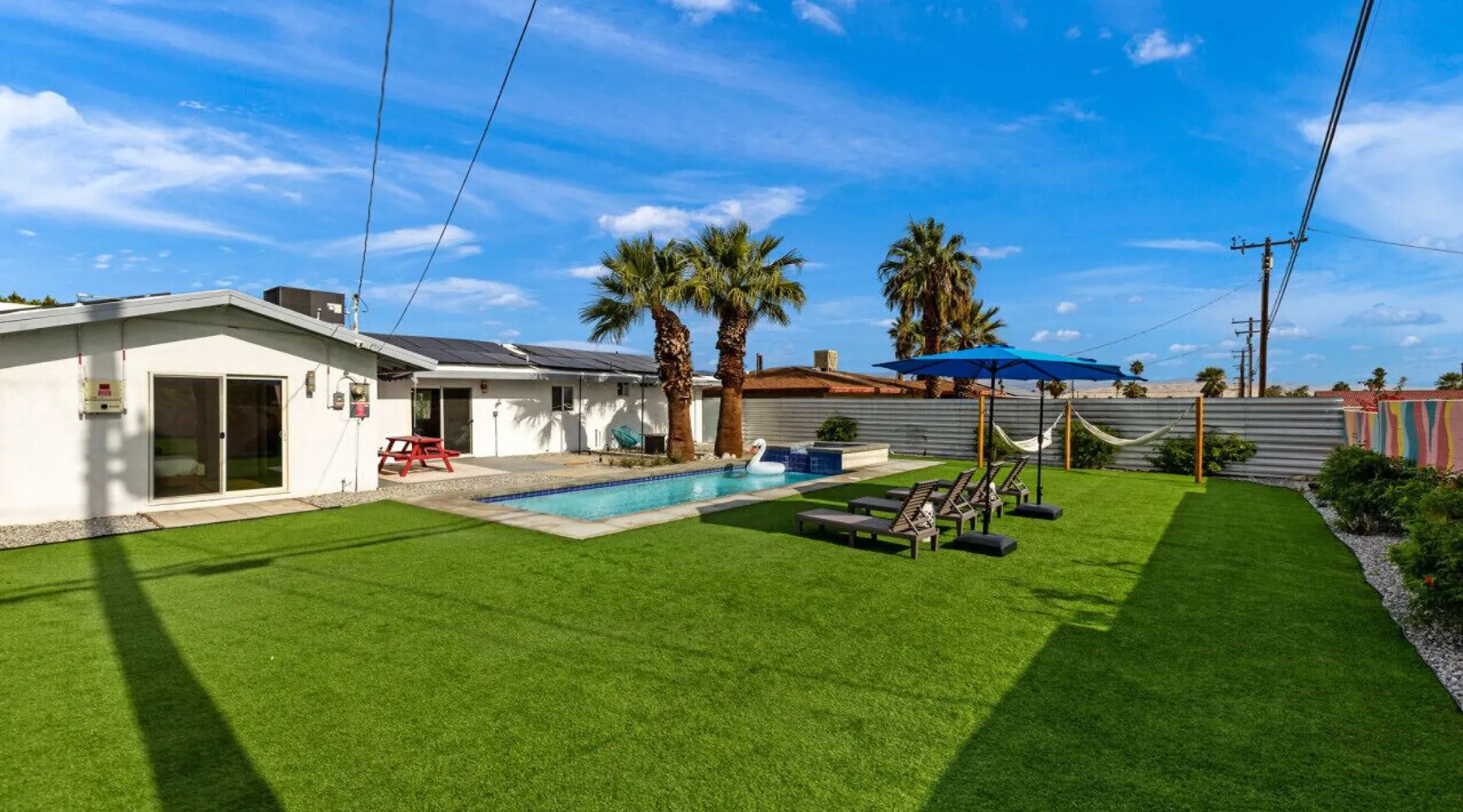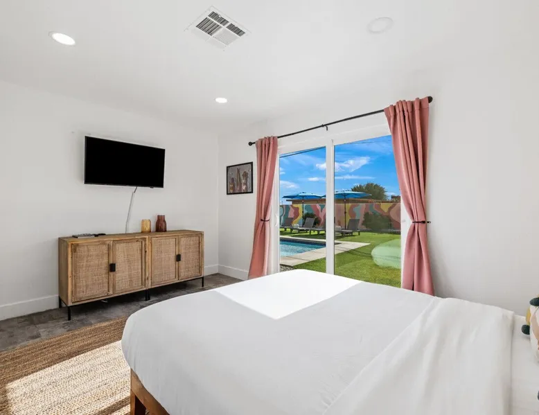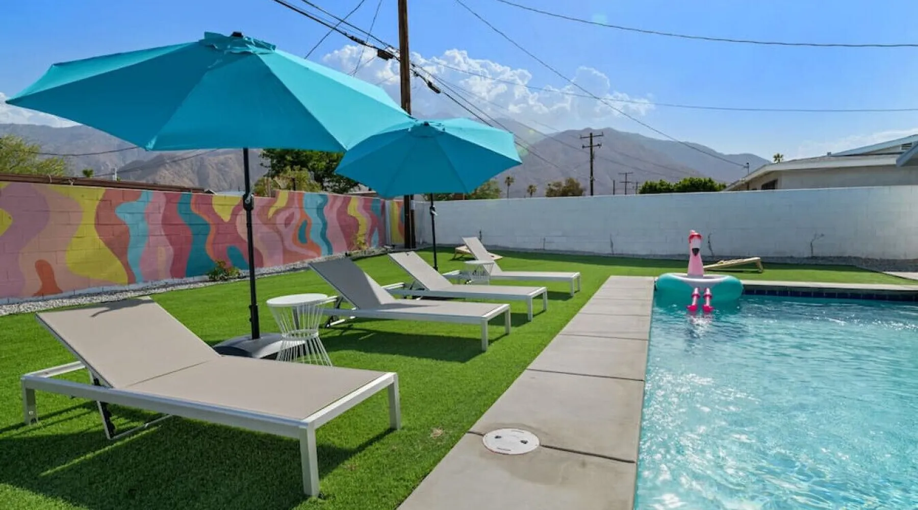 Where tranquility meets epic mountain views! Whether it's a bachelorette bash, a birthday celebration, or a pet-friendly retreat, our paradise has it all. Relax in style with stunning views of the San Jacinto from your heated saltwater pool, hot tub, or hammock. Enjoy outdoor dining, a cozy fire pit, and a fully equipped kitchen with complimentary coffee. With an IG-worthy mural, & just mins from Downtown Palm Springs, the Aerial Tramway, and the airport, your perfect getaway awaits! ☆ Recent Guest Review: "Just like the photos, very responsive and friendly host! Easy to find and great location if you want to enjoy your stay and not be bothered! Would definitely stay again! Such a cute and vibey place!” Cythally Backyard • Large salt water pool, with optional heating • 6x6 hot tub with mountain and sunset views • Sun lounge chairs, drink tables and sun umbrellas • Propane burning fire pit and lounge chairs • Outdoor dining table and chairs • Propane BBQ • Pool toys, floats, games and pump all available for your use • Large green turf grass for you to enjoy a game of corn hole • Pool towels Living room • Super comfortable couch, coffee table and armchairs • Smart TV with Roku, Netflix and Disney+ • Epic (and slightly competitive) evenings of board game fun! Dining room • Seating for 6 at a large table • Steps from the kitchen and outdoor area Kitchen • Brand new appliances including an oven, stove, microwave, dishwasher and a Whirlpool side by side refrigerator with water dispenser and ice machine • Complimentary tea and coffee station • KEURIG machine with coffee pods, cream and sugar • Pour over kettle with a wide selection of teas • Cooking basics- salt and pepper, cooking oil, foil, plastic wrap, baking paper • High velocity blender • Non-stick frying pans and cooking utensils • Plastic cups for outdoor and pool use • BBQ tools Laundry • Washer & dryer with complimentary laundry detergent and dryer napkins Bedrooms • First bedroom- Queen bed, dresser, lamps smart TV with Roku, Netflix and Disney+, private en-suite bathroom with walk in shower, and pack-and-play if you're traveling with your mini • Second bedroom- Queen bed, dresser, lamps, smart TV with Roku, Netflix and Disney+, direct access to backyard and private pool and yard entrance • Bedroom 3- One full over full bunk bed • All bedrooms equip with smart alarm clocks, built-in full-length mirror sliding closets with coat hangers, luggage stands and extra pillows and bedding Bathrooms • Master bathroom has direct access from the master bedroom it has a smart Bluetooth multimedia mirror, so you can listen to your music while in the bed or bathroom • Both bathrooms are equipped with shampoo, conditioner, body wash, complementary bathroom amenities including hair dryers and makeup towels. Storage closet •Located in the hallway, our storage closet is stocked with any extra things you may need to make your vacation feel more like a home. Including a sounds machine, extra pool and diving toys, a pool toy pump, toolbox, first aid kit, iron, ironing board, bug spray, sunscreen, aloe vera, fly swatters, a vacuum, steam mop and clean mop pads, broom and dustpan, laundry basket, close drying rack, extra propane tank and the awning handle to open the shade pergola. Distance from home to popular attractions ☆ Downtown Palm Springs: 3.5 miles ☆ Palm Springs Aerial Tramway: 5 miles ☆ Palm Springs International Airport: 5.9 miles ☆ Cabazon Outlets: 17 miles ☆ The Living Desert Zoo and Gardens: 24 miles ☆ Empire Polo Club: 29 miles ☆ Joshua Tree National Park: 36 miles ☆ Pet-Friendly Accommodations: We welcome pets for a fee of $150 per pet, per stay. Please note that a pet fee will be applied to cover the cleaning of pet hair. If any waste beyond hair (such as urine or feces) is found, an additional cleaning fee of $35-$50 will be charged. Cleaning up after your pet is your responsibility, pets should not be left unattended in the home and are not allowed in pool. *Additional pet fees (plus tax) will be processed through our guest portal after your reservation is confirmed. Kindly let us know if you’ll be traveling with a pet. Thank you for your cooperation! ☆ Hot Tub: The use of the hot tub is included in your nightly rate, it can be heated from the backyard it takes about 30 minutes to get to 100-102 degrees. ☆ Pool heater: The pool requires a lot of natural gas to heat, so using this will incur a daily fee of $100 (Plus Tax). This will be billed prior to your arrival if you request it. Our pool cleaner comes every Monday and Thursday; he comes and goes through the side gate and will not worry you throughout your stay. ☆ Desert living: This home, like many in Palm Springs, is located in the desert, so it's natural for sand to be around. On windy days, some sand and leaves may blow into the pool. While our pool cleaners do their best to keep it clear, there may occasionally be some debris in the water. We provide skimmers for your convenience if you'd like to remove any leaves or sand yourself. ☆ Bachelorette Parties: Given the design of our home, it is a popular choice for bachelorette celebrations. In collaboration with West Coast Bach, we provide enhanced services such as balloon arches, photo backdrops, marquee letters, bubbly/tequila bars, fridge stocking, charcuterie boards, and even cabana boy services. Our goal is to streamline your preparations and create a dreamy setup for your event. If you're booking for a bachelorette party and require assistance with these services, please inform us upon booking! ☆ Location: Our home is located in the up-and-coming neighborhood of Tram View Heights, a community that reflects the evolving character of Palm Springs. The area is experiencing redevelopment and growth, adding to its vibrant and dynamic atmosphere. Like other parts of Palm Springs. Like many urban areas, you may notice a visible homeless popul