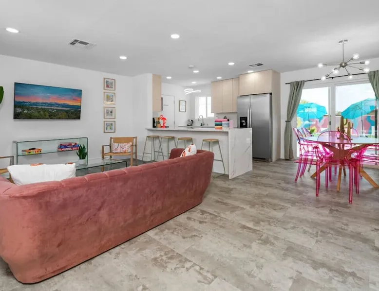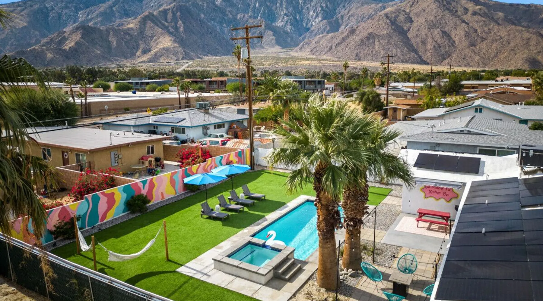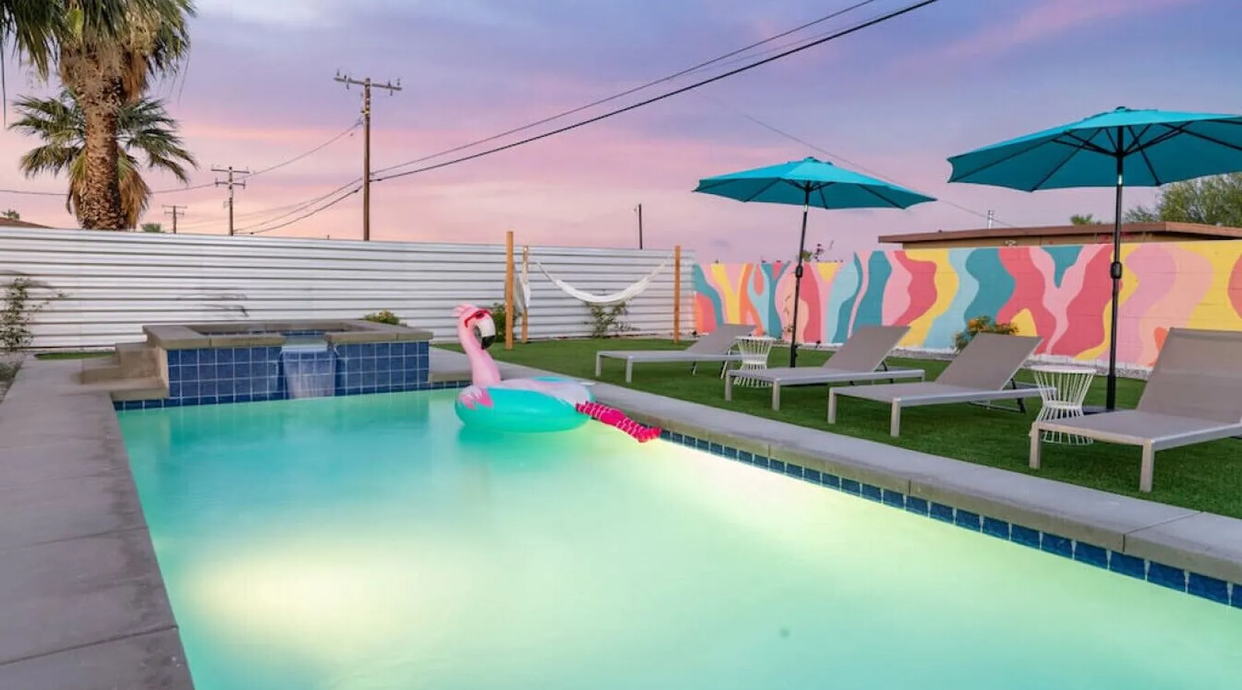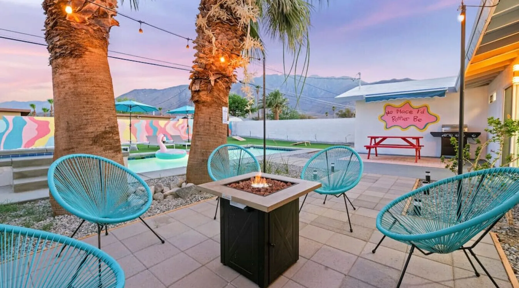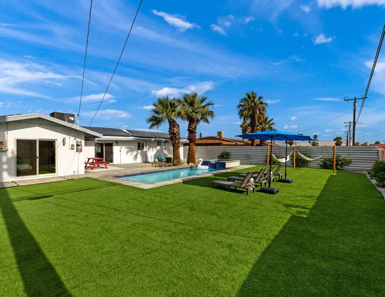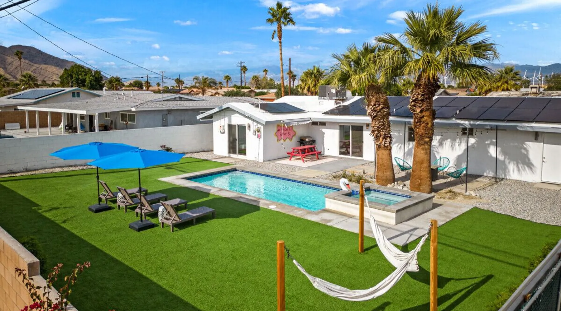 Where tranquility meets epic mountain views! Whether it's a bachelorette bash, a birthday celebration, or a pet-friendly retreat, our paradise has it all. Relax in style with stunning views of the San Jacinto from your heated saltwater pool, hot tub, or hammock. Enjoy outdoor dining, a cozy fire pit, and a fully equipped kitchen with complimentary coffee. With an IG-worthy mural, & just mins from Downtown Palm Springs, the Aerial Tramway, and the airport, your perfect getaway awaits! ☆ Recent Guest Review: "Just like the photos, very responsive and friendly host! Easy to find and great location if you want to enjoy your stay and not be bothered! Would definitely stay again! Such a cute and vibey place!” Cythally Backyard • Large salt water pool, with optional heating • 6x6 hot tub with mountain and sunset views • Sun lounge chairs, drink tables and sun umbrellas • Propane burning fire pit and lounge chairs • Outdoor dining table and chairs • Propane BBQ • Pool toys, floats, games and pump all available for your use • Large green turf grass for you to enjoy a game of corn hole • Pool towels Living room • Super comfortable couch, coffee table and armchairs • Smart TV with Roku, Netflix and Disney+ • Epic (and slightly competitive) evenings of board game fun! Dining room • Seating for 6 at a large table • Steps from the kitchen and outdoor area Kitchen • Brand new appliances including an oven, stove, microwave, dishwasher and a Whirlpool side by side refrigerator with water dispenser and ice machine • Complimentary tea and coffee station • KEURIG machine with coffee pods, cream and sugar • Pour over kettle with a wide selection of teas • Cooking basics- salt and pepper, cooking oil, foil, plastic wrap, baking paper • High velocity blender • Non-stick frying pans and cooking utensils • Plastic cups for outdoor and pool use • BBQ tools Laundry • Washer & dryer with complimentary laundry detergent and dryer napkins Bedrooms • First bedroom- Queen bed, dresser, lamps smart TV with Roku, Netflix and Disney+, private en-suite bathroom with walk in shower, and pack-and-play if you're traveling with your mini • Second bedroom- Queen bed, dresser, lamps, smart TV with Roku, Netflix and Disney+, direct access to backyard and private pool and yard entrance • Bedroom 3- One full over full bunk bed • All bedrooms equip with smart alarm clocks, built-in full-length mirror sliding closets with coat hangers, luggage stands and extra pillows and bedding Bathrooms • Master bathroom has direct access from the master bedroom it has a smart Bluetooth multimedia mirror, so you can listen to your music while in the bed or bathroom • Both bathrooms are equipped with shampoo, conditioner, body wash, complementary bathroom amenities including hair dryers and makeup towels. Storage closet •Located in the hallway, our storage closet is stocked with any extra things you may need to make your vacation feel more like a home. Including a sounds machine, extra pool and diving toys, a pool toy pump, toolbox, first aid kit, iron, ironing board, bug spray, sunscreen, aloe vera, fly swatters, a vacuum, steam mop and clean mop pads, broom and dustpan, laundry basket, close drying rack, extra propane tank and the awning handle to open the shade pergola. Distance from home to popular attractions ☆ Downtown Palm Springs: 3.5 miles ☆ Palm Springs Aerial Tramway: 5 miles ☆ Palm Springs International Airport: 5.9 miles ☆ Cabazon Outlets: 17 miles ☆ The Living Desert Zoo and Gardens: 24 miles ☆ Empire Polo Club: 29 miles ☆ Joshua Tree National Park: 36 miles ☆ Pet-Friendly Accommodations: We welcome pets for a fee of $150 per pet, per stay. Please note that a pet fee will be applied to cover the cleaning of pet hair. If any waste beyond hair (such as urine or feces) is found, an additional cleaning fee of $35-$50 will be charged. Cleaning up after your pet is your responsibility, pets should not be left unattended in the home and are not allowed in pool. *Additional pet fees (plus tax) will be processed through our guest portal after your reservation is confirmed. Kindly let us know if you’ll be traveling with a pet. Thank you for your cooperation! ☆ Hot Tub: The use of the hot tub is included in your nightly rate, it can be heated from the backyard it takes about 30 minutes to get to 100-102 degrees. ☆ Pool heater: The pool requires a lot of natural gas to heat, so using this will incur a daily fee of $100 (Plus Tax). This will be billed prior to your arrival if you request it. Our pool cleaner comes every Monday and Thursday; he comes and goes through the side gate and will not worry you throughout your stay. ☆ Desert living: This home, like many in Palm Springs, is located in the desert, so it's natural for sand to be around. On windy days, some sand and leaves may blow into the pool. While our pool cleaners do their best to keep it clear, there may occasionally be some debris in the water. We provide skimmers for your convenience if you'd like to remove any leaves or sand yourself. ☆ Bachelorette Parties: Given the design of our home, it is a popular choice for bachelorette celebrations. In collaboration with West Coast Bach, we provide enhanced services such as balloon arches, photo backdrops, marquee letters, bubbly/tequila bars, fridge stocking, charcuterie boards, and even cabana boy services. Our goal is to streamline your preparations and create a dreamy setup for your event. If you're booking for a bachelorette party and require assistance with these services, please inform us upon booking! ☆ Location: Our home is located in the up-and-coming neighborhood of Tram View Heights, a community that reflects the evolving character of Palm Springs. The area is experiencing redevelopment and growth, adding to its vibrant and dynamic atmosphere. Like other parts of Palm Springs. Like many urban areas, you may notice a visible homeless popul