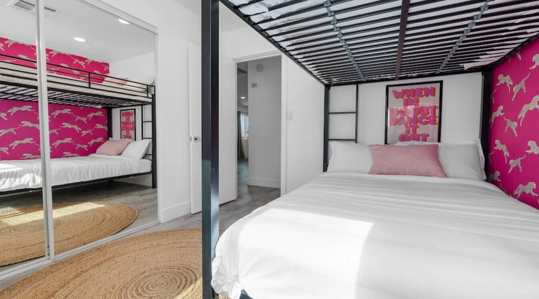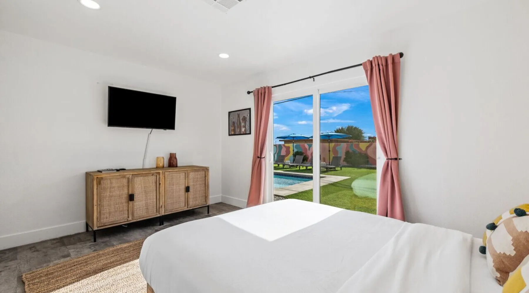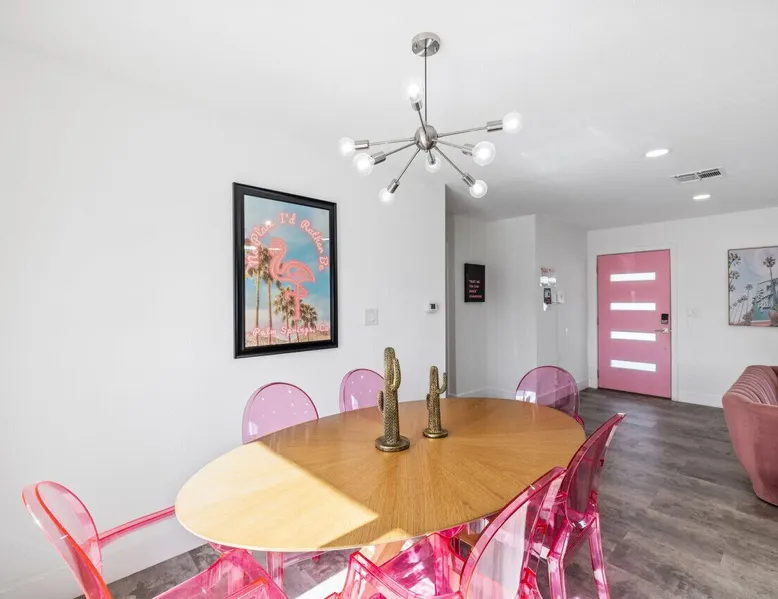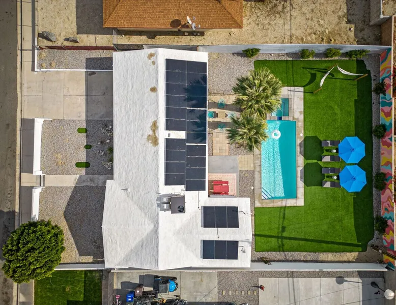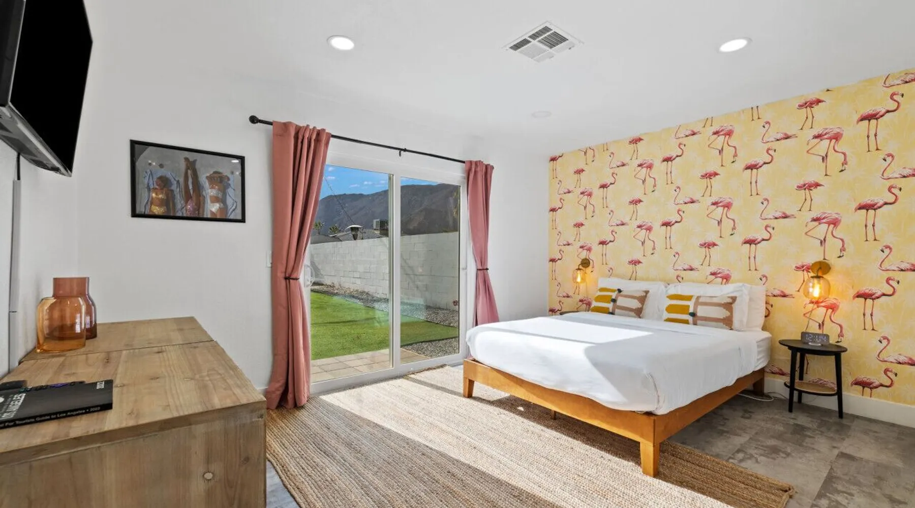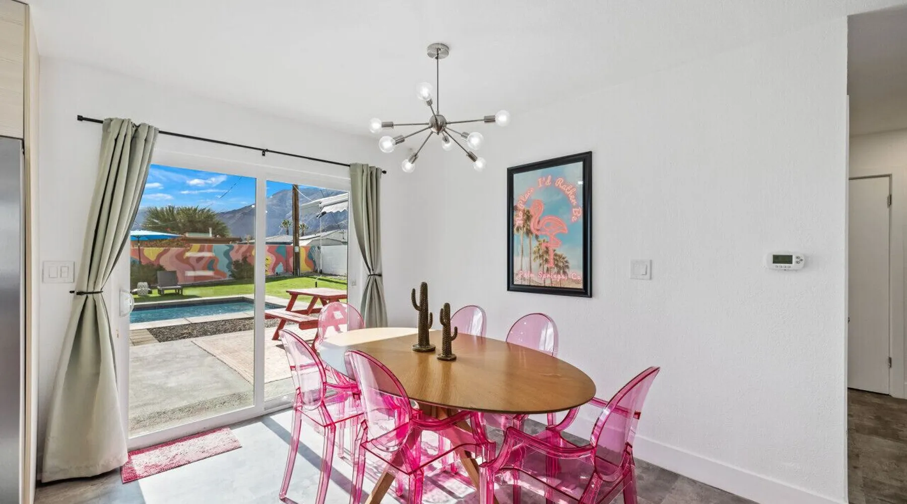 Where tranquility meets epic mountain views! Whether it's a bachelorette bash, a birthday celebration, or a pet-friendly retreat, our paradise has it all. Relax in style with stunning views of the San Jacinto from your heated saltwater pool, hot tub, or hammock. Enjoy outdoor dining, a cozy fire pit, and a fully equipped kitchen with complimentary coffee. With an IG-worthy mural, & just mins from Downtown Palm Springs, the Aerial Tramway, and the airport, your perfect getaway awaits! ☆ Recent Guest Review: "Just like the photos, very responsive and friendly host! Easy to find and great location if you want to enjoy your stay and not be bothered! Would definitely stay again! Such a cute and vibey place!” Cythally Backyard • Large salt water pool, with optional heating • 6x6 hot tub with mountain and sunset views • Sun lounge chairs, drink tables and sun umbrellas • Propane burning fire pit and lounge chairs • Outdoor dining table and chairs • Propane BBQ • Pool toys, floats, games and pump all available for your use • Large green turf grass for you to enjoy a game of corn hole • Pool towels Living room • Super comfortable couch, coffee table and armchairs • Smart TV with Roku, Netflix and Disney+ • Epic (and slightly competitive) evenings of board game fun! Dining room • Seating for 6 at a large table • Steps from the kitchen and outdoor area Kitchen • Brand new appliances including an oven, stove, microwave, dishwasher and a Whirlpool side by side refrigerator with water dispenser and ice machine • Complimentary tea and coffee station • KEURIG machine with coffee pods, cream and sugar • Pour over kettle with a wide selection of teas • Cooking basics- salt and pepper, cooking oil, foil, plastic wrap, baking paper • High velocity blender • Non-stick frying pans and cooking utensils • Plastic cups for outdoor and pool use • BBQ tools Laundry • Washer & dryer with complimentary laundry detergent and dryer napkins Bedrooms • First bedroom- Queen bed, dresser, lamps smart TV with Roku, Netflix and Disney+, private en-suite bathroom with walk in shower, and pack-and-play if you're traveling with your mini • Second bedroom- Queen bed, dresser, lamps, smart TV with Roku, Netflix and Disney+, direct access to backyard and private pool and yard entrance • Bedroom 3- One full over full bunk bed • All bedrooms equip with smart alarm clocks, built-in full-length mirror sliding closets with coat hangers, luggage stands and extra pillows and bedding Bathrooms • Master bathroom has direct access from the master bedroom it has a smart Bluetooth multimedia mirror, so you can listen to your music while in the bed or bathroom • Both bathrooms are equipped with shampoo, conditioner, body wash, complementary bathroom amenities including hair dryers and makeup towels. Storage closet •Located in the hallway, our storage closet is stocked with any extra things you may need to make your vacation feel more like a home. Including a sounds machine, extra pool and diving toys, a pool toy pump, toolbox, first aid kit, iron, ironing board, bug spray, sunscreen, aloe vera, fly swatters, a vacuum, steam mop and clean mop pads, broom and dustpan, laundry basket, close drying rack, extra propane tank and the awning handle to open the shade pergola. Distance from home to popular attractions ☆ Downtown Palm Springs: 3.5 miles ☆ Palm Springs Aerial Tramway: 5 miles ☆ Palm Springs International Airport: 5.9 miles ☆ Cabazon Outlets: 17 miles ☆ The Living Desert Zoo and Gardens: 24 miles ☆ Empire Polo Club: 29 miles ☆ Joshua Tree National Park: 36 miles ☆ Pet-Friendly Accommodations: We welcome pets for a fee of $150 per pet, per stay. Please note that a pet fee will be applied to cover the cleaning of pet hair. If any waste beyond hair (such as urine or feces) is found, an additional cleaning fee of $35-$50 will be charged. Cleaning up after your pet is your responsibility, pets should not be left unattended in the home and are not allowed in pool. *Additional pet fees (plus tax) will be processed through our guest portal after your reservation is confirmed. Kindly let us know if you’ll be traveling with a pet. Thank you for your cooperation! ☆ Hot Tub: The use of the hot tub is included in your nightly rate, it can be heated from the backyard it takes about 30 minutes to get to 100-102 degrees. ☆ Pool heater: The pool requires a lot of natural gas to heat, so using this will incur a daily fee of $100 (Plus Tax). This will be billed prior to your arrival if you request it. Our pool cleaner comes every Monday and Thursday; he comes and goes through the side gate and will not worry you throughout your stay. ☆ Desert living: This home, like many in Palm Springs, is located in the desert, so it's natural for sand to be around. On windy days, some sand and leaves may blow into the pool. While our pool cleaners do their best to keep it clear, there may occasionally be some debris in the water. We provide skimmers for your convenience if you'd like to remove any leaves or sand yourself. ☆ Bachelorette Parties: Given the design of our home, it is a popular choice for bachelorette celebrations. In collaboration with West Coast Bach, we provide enhanced services such as balloon arches, photo backdrops, marquee letters, bubbly/tequila bars, fridge stocking, charcuterie boards, and even cabana boy services. Our goal is to streamline your preparations and create a dreamy setup for your event. If you're booking for a bachelorette party and require assistance with these services, please inform us upon booking! ☆ Location: Our home is located in the up-and-coming neighborhood of Tram View Heights, a community that reflects the evolving character of Palm Springs. The area is experiencing redevelopment and growth, adding to its vibrant and dynamic atmosphere. Like other parts of Palm Springs. Like many urban areas, you may notice a visible homeless popul