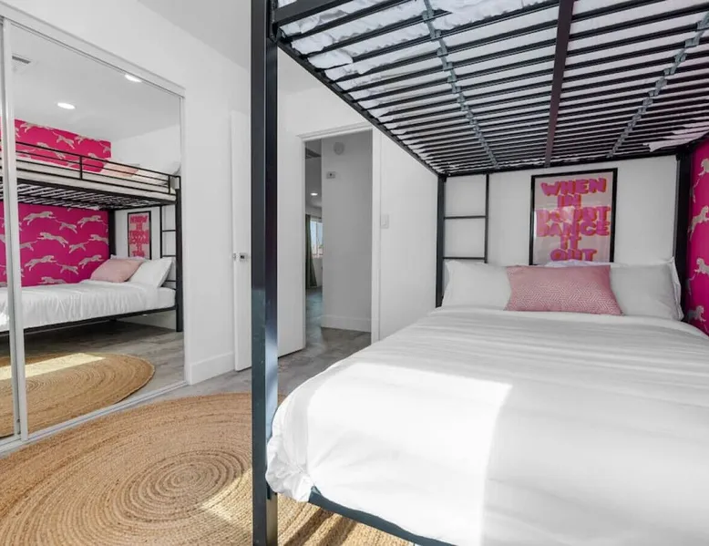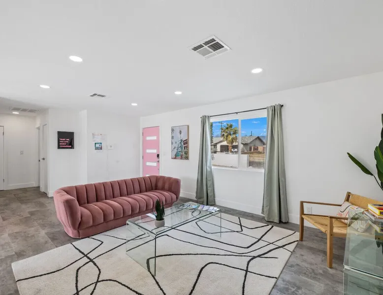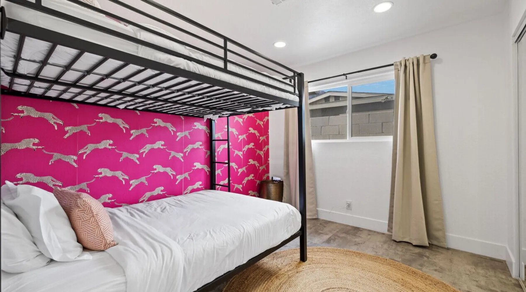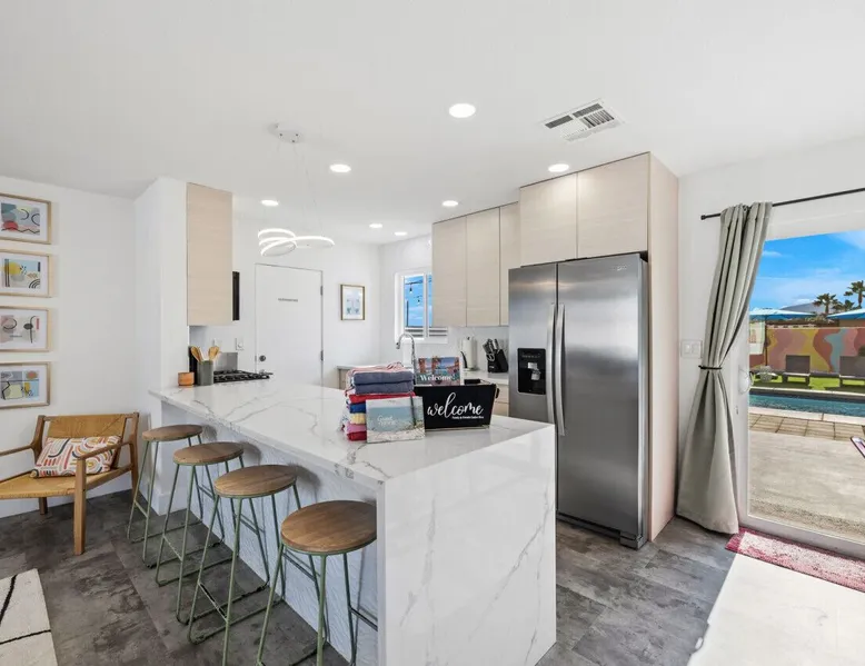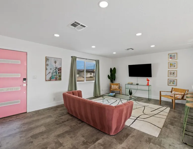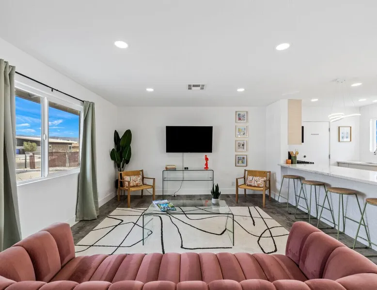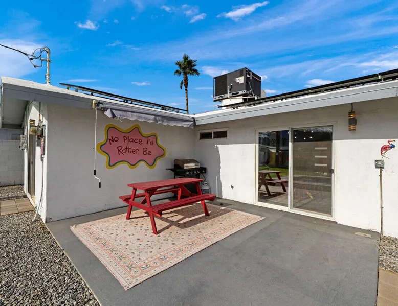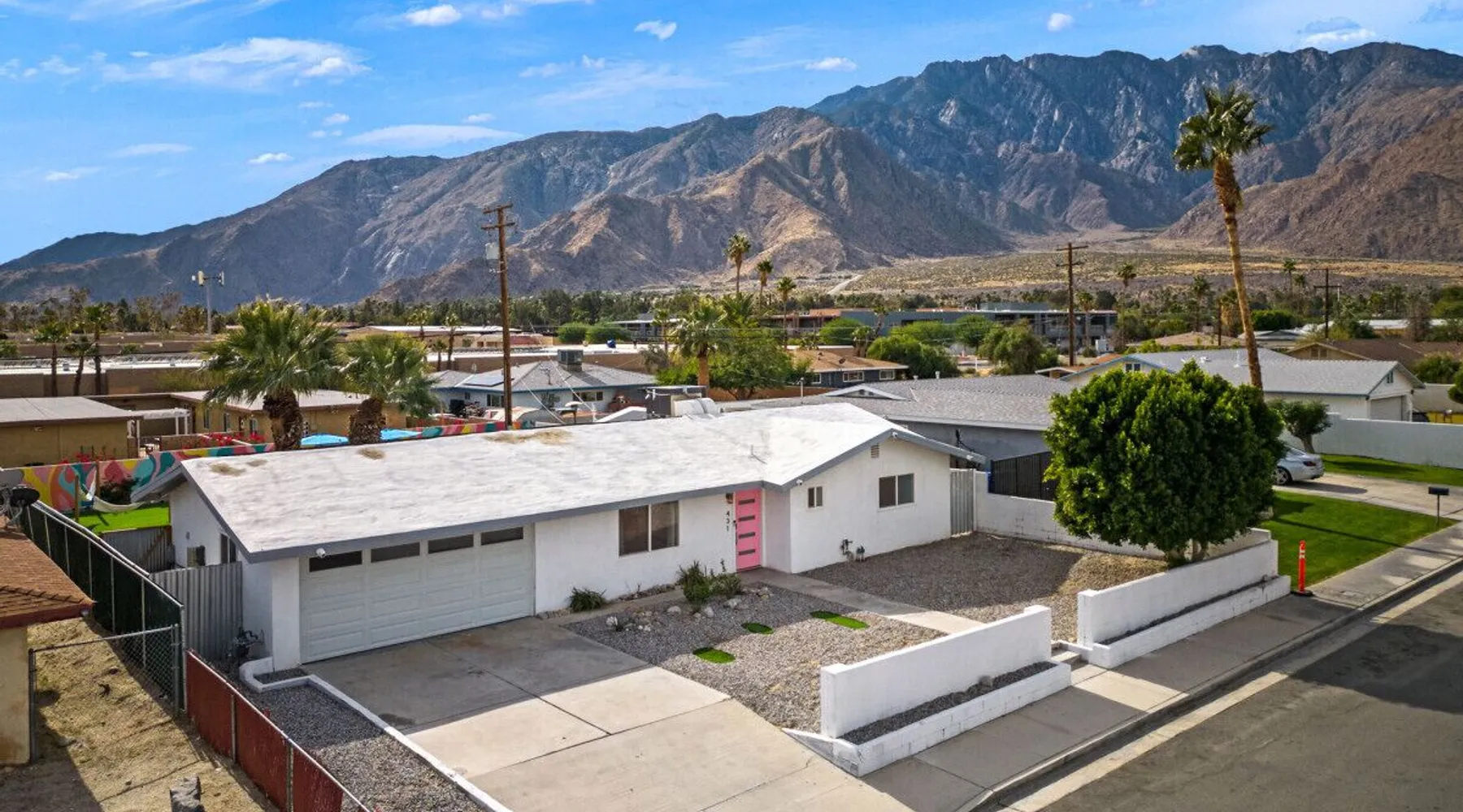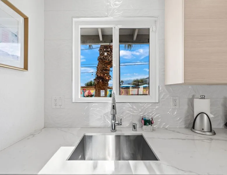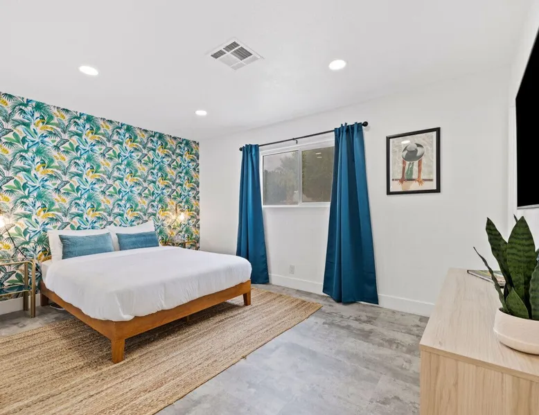 Where tranquility meets epic mountain views! Whether it's a bachelorette bash, a birthday celebration, or a pet-friendly retreat, our paradise has it all. Relax in style with stunning views of the San Jacinto from your heated saltwater pool, hot tub, or hammock. Enjoy outdoor dining, a cozy fire pit, and a fully equipped kitchen with complimentary coffee. With an IG-worthy mural, & just mins from Downtown Palm Springs, the Aerial Tramway, and the airport, your perfect getaway awaits! ☆ Recent Guest Review: "Just like the photos, very responsive and friendly host! Easy to find and great location if you want to enjoy your stay and not be bothered! Would definitely stay again! Such a cute and vibey place!” Cythally Backyard • Large salt water pool, with optional heating • 6x6 hot tub with mountain and sunset views • Sun lounge chairs, drink tables and sun umbrellas • Propane burning fire pit and lounge chairs • Outdoor dining table and chairs • Propane BBQ • Pool toys, floats, games and pump all available for your use • Large green turf grass for you to enjoy a game of corn hole • Pool towels Living room • Super comfortable couch, coffee table and armchairs • Smart TV with Roku, Netflix and Disney+ • Epic (and slightly competitive) evenings of board game fun! Dining room • Seating for 6 at a large table • Steps from the kitchen and outdoor area Kitchen • Brand new appliances including an oven, stove, microwave, dishwasher and a Whirlpool side by side refrigerator with water dispenser and ice machine • Complimentary tea and coffee station • KEURIG machine with coffee pods, cream and sugar • Pour over kettle with a wide selection of teas • Cooking basics- salt and pepper, cooking oil, foil, plastic wrap, baking paper • High velocity blender • Non-stick frying pans and cooking utensils • Plastic cups for outdoor and pool use • BBQ tools Laundry • Washer & dryer with complimentary laundry detergent and dryer napkins Bedrooms • First bedroom- Queen bed, dresser, lamps smart TV with Roku, Netflix and Disney+, private en-suite bathroom with walk in shower, and pack-and-play if you're traveling with your mini • Second bedroom- Queen bed, dresser, lamps, smart TV with Roku, Netflix and Disney+, direct access to backyard and private pool and yard entrance • Bedroom 3- One full over full bunk bed • All bedrooms equip with smart alarm clocks, built-in full-length mirror sliding closets with coat hangers, luggage stands and extra pillows and bedding Bathrooms • Master bathroom has direct access from the master bedroom it has a smart Bluetooth multimedia mirror, so you can listen to your music while in the bed or bathroom • Both bathrooms are equipped with shampoo, conditioner, body wash, complementary bathroom amenities including hair dryers and makeup towels. Storage closet •Located in the hallway, our storage closet is stocked with any extra things you may need to make your vacation feel more like a home. Including a sounds machine, extra pool and diving toys, a pool toy pump, toolbox, first aid kit, iron, ironing board, bug spray, sunscreen, aloe vera, fly swatters, a vacuum, steam mop and clean mop pads, broom and dustpan, laundry basket, close drying rack, extra propane tank and the awning handle to open the shade pergola. Distance from home to popular attractions ☆ Downtown Palm Springs: 3.5 miles ☆ Palm Springs Aerial Tramway: 5 miles ☆ Palm Springs International Airport: 5.9 miles ☆ Cabazon Outlets: 17 miles ☆ The Living Desert Zoo and Gardens: 24 miles ☆ Empire Polo Club: 29 miles ☆ Joshua Tree National Park: 36 miles ☆ Pet-Friendly Accommodations: We welcome pets for a fee of $150 per pet, per stay. Please note that a pet fee will be applied to cover the cleaning of pet hair. If any waste beyond hair (such as urine or feces) is found, an additional cleaning fee of $35-$50 will be charged. Cleaning up after your pet is your responsibility, pets should not be left unattended in the home and are not allowed in pool. *Additional pet fees (plus tax) will be processed through our guest portal after your reservation is confirmed. Kindly let us know if you’ll be traveling with a pet. Thank you for your cooperation! ☆ Hot Tub: The use of the hot tub is included in your nightly rate, it can be heated from the backyard it takes about 30 minutes to get to 100-102 degrees. ☆ Pool heater: The pool requires a lot of natural gas to heat, so using this will incur a daily fee of $100 (Plus Tax). This will be billed prior to your arrival if you request it. Our pool cleaner comes every Monday and Thursday; he comes and goes through the side gate and will not worry you throughout your stay. ☆ Desert living: This home, like many in Palm Springs, is located in the desert, so it's natural for sand to be around. On windy days, some sand and leaves may blow into the pool. While our pool cleaners do their best to keep it clear, there may occasionally be some debris in the water. We provide skimmers for your convenience if you'd like to remove any leaves or sand yourself. ☆ Bachelorette Parties: Given the design of our home, it is a popular choice for bachelorette celebrations. In collaboration with West Coast Bach, we provide enhanced services such as balloon arches, photo backdrops, marquee letters, bubbly/tequila bars, fridge stocking, charcuterie boards, and even cabana boy services. Our goal is to streamline your preparations and create a dreamy setup for your event. If you're booking for a bachelorette party and require assistance with these services, please inform us upon booking! ☆ Location: Our home is located in the up-and-coming neighborhood of Tram View Heights, a community that reflects the evolving character of Palm Springs. The area is experiencing redevelopment and growth, adding to its vibrant and dynamic atmosphere. Like other parts of Palm Springs. Like many urban areas, you may notice a visible homeless popul