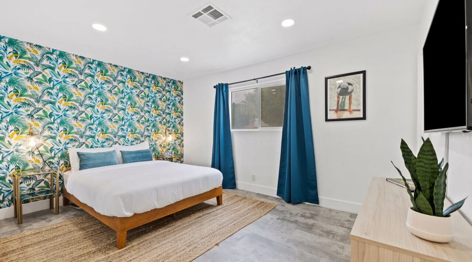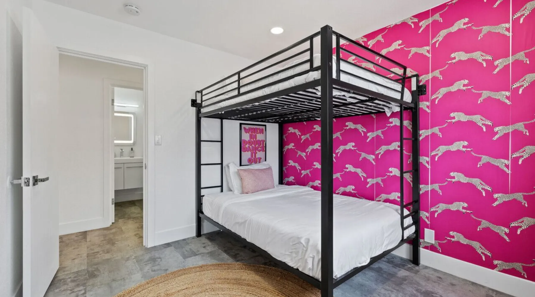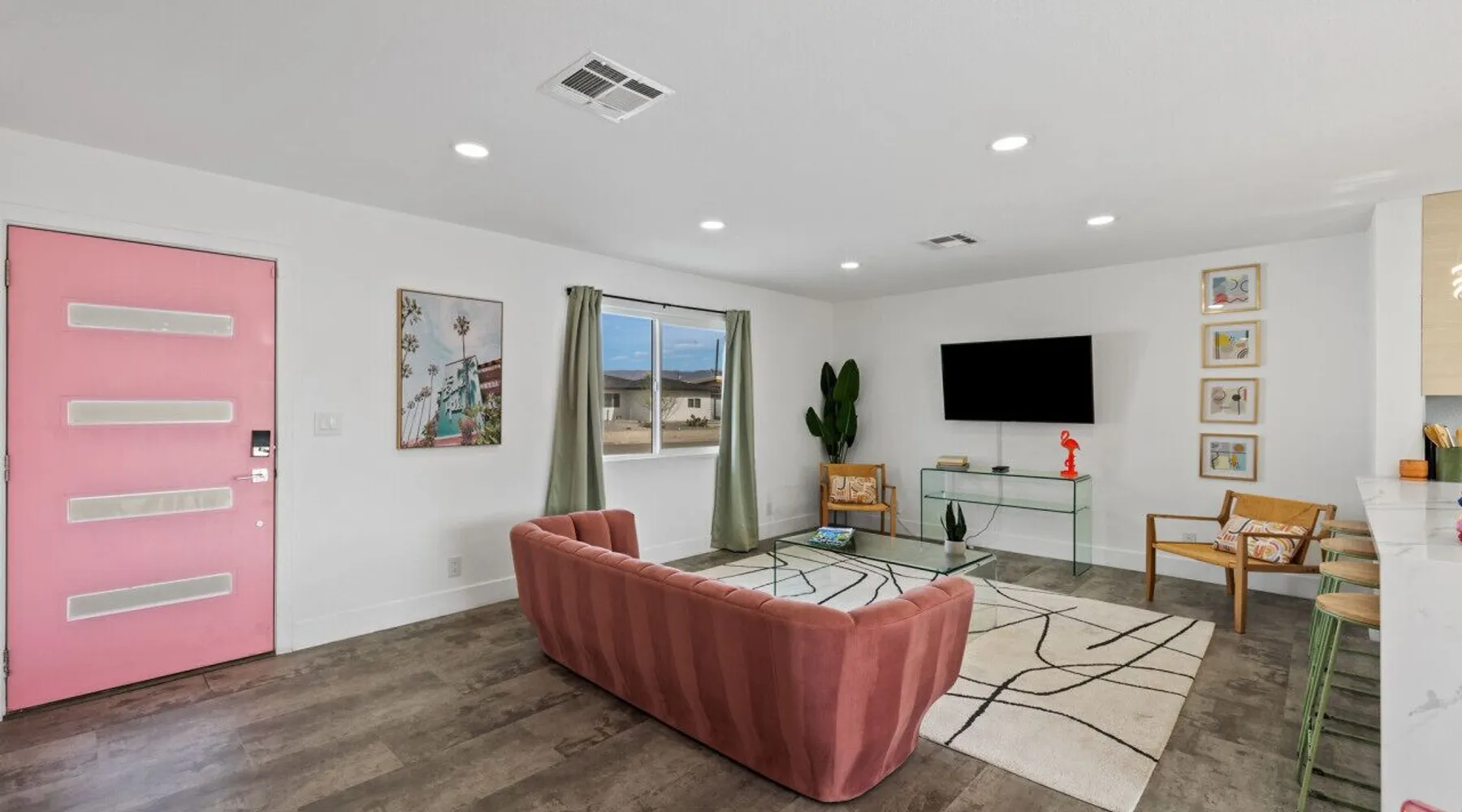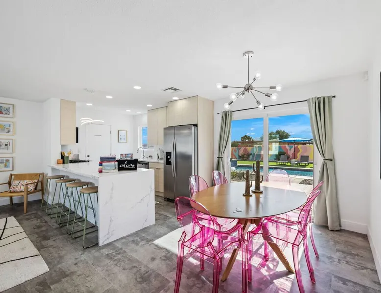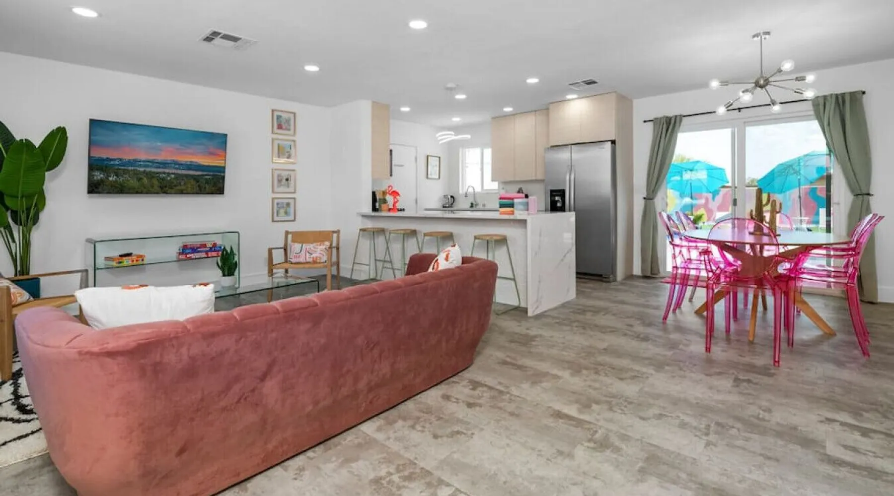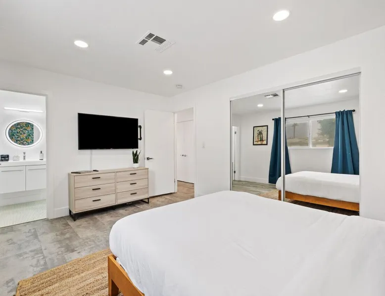Where tranquility meets epic mountain views! Whether it's a bachelorette bash, a birthday celebration, or a pet-friendly retreat, our paradise has it all. Relax in style with stunning views of the San Jacinto from your heated saltwater pool, hot tub, or hammock. Enjoy outdoor dining, a cozy fire pit, and a fully equipped kitchen with complimentary coffee. With an IG-worthy mural, & just mins from Downtown Palm Springs, the Aerial Tramway, and the airport, your perfect getaway awaits! ☆ Recent Guest Review: "Just like the photos, very responsive and friendly host! Easy to find and great location if you want to enjoy your stay and not be bothered! Would definitely stay again! Such a cute and vibey place!” Cythally Backyard • Large salt water pool, with optional heating • 6x6 hot tub with mountain and sunset views • Sun lounge chairs, drink tables and sun umbrellas • Propane burning fire pit and lounge chairs • Outdoor dining table and chairs • Propane BBQ • Pool toys, floats, games and pump all available for your use • Large green turf grass for you to enjoy a game of corn hole • Pool towels Living room • Super comfortable couch, coffee table and armchairs • Smart TV with Roku, Netflix and Disney+ • Epic (and slightly competitive) evenings of board game fun! Dining room • Seating for 6 at a large table • Steps from the kitchen and outdoor area Kitchen • Brand new appliances including an oven, stove, microwave, dishwasher and a Whirlpool side by side refrigerator with water dispenser and ice machine • Complimentary tea and coffee station • KEURIG machine with coffee pods, cream and sugar • Pour over kettle with a wide selection of teas • Cooking basics- salt and pepper, cooking oil, foil, plastic wrap, baking paper • High velocity blender • Non-stick frying pans and cooking utensils • Plastic cups for outdoor and pool use • BBQ tools Laundry • Washer & dryer with complimentary laundry detergent and dryer napkins Bedrooms • First bedroom- Queen bed, dresser, lamps smart TV with Roku, Netflix and Disney+, private en-suite bathroom with walk in shower, and pack-and-play if you're traveling with your mini • Second bedroom- Queen bed, dresser, lamps, smart TV with Roku, Netflix and Disney+, direct access to backyard and private pool and yard entrance • Bedroom 3- One full over full bunk bed • All bedrooms equip with smart alarm clocks, built-in full-length mirror sliding closets with coat hangers, luggage stands and extra pillows and bedding Bathrooms • Master bathroom has direct access from the master bedroom it has a smart Bluetooth multimedia mirror, so you can listen to your music while in the bed or bathroom • Both bathrooms are equipped with shampoo, conditioner, body wash, complementary bathroom amenities including hair dryers and makeup towels. Storage closet •Located in the hallway, our storage closet is stocked with any extra things you may need to make your vacation feel more like a home. Including a sounds machine, extra pool and diving toys, a pool toy pump, toolbox, first aid kit, iron, ironing board, bug spray, sunscreen, aloe vera, fly swatters, a vacuum, steam mop and clean mop pads, broom and dustpan, laundry basket, close drying rack, extra propane tank and the awning handle to open the shade pergola. Distance from home to popular attractions ☆ Downtown Palm Springs: 3.5 miles ☆ Palm Springs Aerial Tramway: 5 miles ☆ Palm Springs International Airport: 5.9 miles ☆ Cabazon Outlets: 17 miles ☆ The Living Desert Zoo and Gardens: 24 miles ☆ Empire Polo Club: 29 miles ☆ Joshua Tree National Park: 36 miles ☆ Pet-Friendly Accommodations: We welcome pets for a fee of $150 per pet, per stay. Please note that a pet fee will be applied to cover the cleaning of pet hair. If any waste beyond hair (such as urine or feces) is found, an additional cleaning fee of $35-$50 will be charged. Cleaning up after your pet is your responsibility, pets should not be left unattended in the home and are not allowed in pool. *Additional pet fees (plus tax) will be processed through our guest portal after your reservation is confirmed. Kindly let us know if you’ll be traveling with a pet. Thank you for your cooperation! ☆ Hot Tub: The use of the hot tub is included in your nightly rate, it can be heated from the backyard it takes about 30 minutes to get to 100-102 degrees. ☆ Pool heater: The pool requires a lot of natural gas to heat, so using this will incur a daily fee of $100 (Plus Tax). This will be billed prior to your arrival if you request it. Our pool cleaner comes every Monday and Thursday; he comes and goes through the side gate and will not worry you throughout your stay. ☆ Desert living: This home, like many in Palm Springs, is located in the desert, so it's natural for sand to be around. On windy days, some sand and leaves may blow into the pool. While our pool cleaners do their best to keep it clear, there may occasionally be some debris in the water. We provide skimmers for your convenience if you'd like to remove any leaves or sand yourself. ☆ Bachelorette Parties: Given the design of our home, it is a popular choice for bachelorette celebrations. In collaboration with West Coast Bach, we provide enhanced services such as balloon arches, photo backdrops, marquee letters, bubbly/tequila bars, fridge stocking, charcuterie boards, and even cabana boy services. Our goal is to streamline your preparations and create a dreamy setup for your event. If you're booking for a bachelorette party and require assistance with these services, please inform us upon booking! ☆ Location: Our home is located in the up-and-coming neighborhood of Tram View Heights, a community that reflects the evolving character of Palm Springs. The area is experiencing redevelopment and growth, adding to its vibrant and dynamic atmosphere. Like other parts of Palm Springs. Like many urban areas, you may notice a visible homeless popul