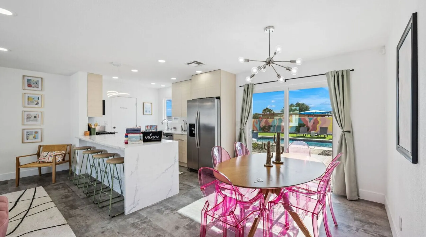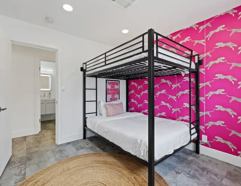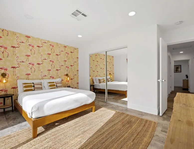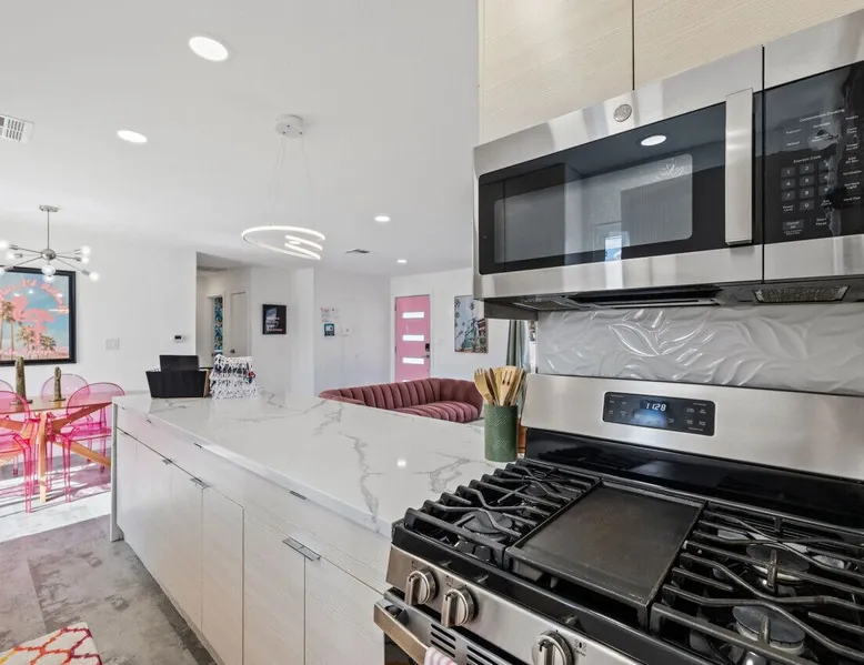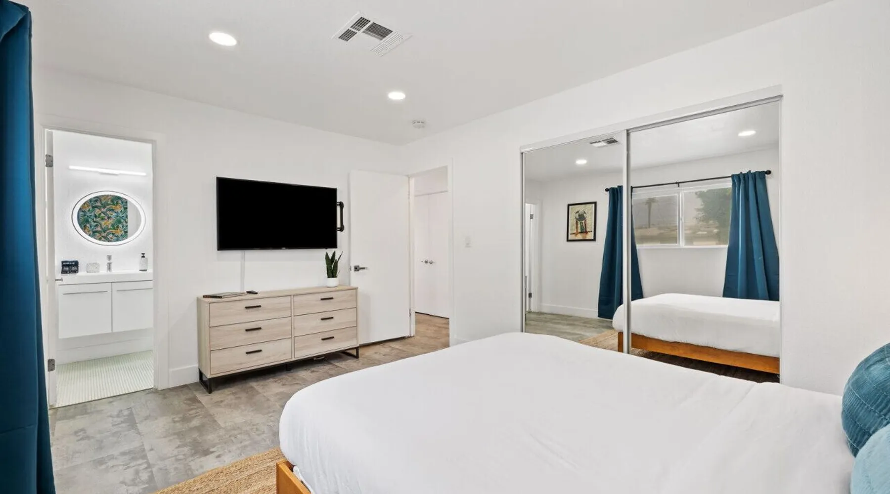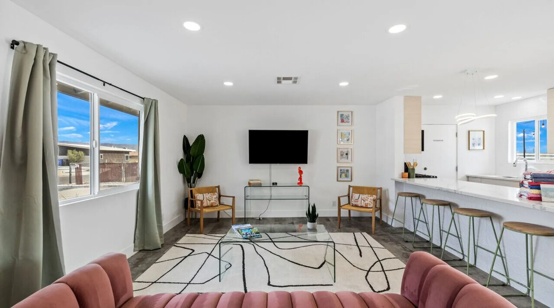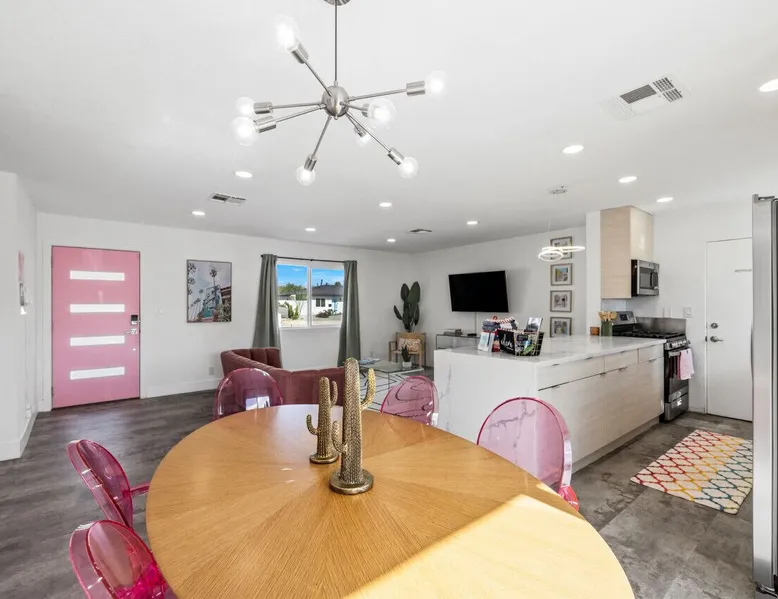 Where tranquility meets epic mountain views! Whether it's a bachelorette bash, a birthday celebration, or a pet-friendly retreat, our paradise has it all. Relax in style with stunning views of the San Jacinto from your heated saltwater pool, hot tub, or hammock. Enjoy outdoor dining, a cozy fire pit, and a fully equipped kitchen with complimentary coffee. With an IG-worthy mural, & just mins from Downtown Palm Springs, the Aerial Tramway, and the airport, your perfect getaway awaits! ☆ Recent Guest Review: "Just like the photos, very responsive and friendly host! Easy to find and great location if you want to enjoy your stay and not be bothered! Would definitely stay again! Such a cute and vibey place!” Cythally Backyard • Large salt water pool, with optional heating • 6x6 hot tub with mountain and sunset views • Sun lounge chairs, drink tables and sun umbrellas • Propane burning fire pit and lounge chairs • Outdoor dining table and chairs • Propane BBQ • Pool toys, floats, games and pump all available for your use • Large green turf grass for you to enjoy a game of corn hole • Pool towels Living room • Super comfortable couch, coffee table and armchairs • Smart TV with Roku, Netflix and Disney+ • Epic (and slightly competitive) evenings of board game fun! Dining room • Seating for 6 at a large table • Steps from the kitchen and outdoor area Kitchen • Brand new appliances including an oven, stove, microwave, dishwasher and a Whirlpool side by side refrigerator with water dispenser and ice machine • Complimentary tea and coffee station • KEURIG machine with coffee pods, cream and sugar • Pour over kettle with a wide selection of teas • Cooking basics- salt and pepper, cooking oil, foil, plastic wrap, baking paper • High velocity blender • Non-stick frying pans and cooking utensils • Plastic cups for outdoor and pool use • BBQ tools Laundry • Washer & dryer with complimentary laundry detergent and dryer napkins Bedrooms • First bedroom- Queen bed, dresser, lamps smart TV with Roku, Netflix and Disney+, private en-suite bathroom with walk in shower, and pack-and-play if you're traveling with your mini • Second bedroom- Queen bed, dresser, lamps, smart TV with Roku, Netflix and Disney+, direct access to backyard and private pool and yard entrance • Bedroom 3- One full over full bunk bed • All bedrooms equip with smart alarm clocks, built-in full-length mirror sliding closets with coat hangers, luggage stands and extra pillows and bedding Bathrooms • Master bathroom has direct access from the master bedroom it has a smart Bluetooth multimedia mirror, so you can listen to your music while in the bed or bathroom • Both bathrooms are equipped with shampoo, conditioner, body wash, complementary bathroom amenities including hair dryers and makeup towels. Storage closet •Located in the hallway, our storage closet is stocked with any extra things you may need to make your vacation feel more like a home. Including a sounds machine, extra pool and diving toys, a pool toy pump, toolbox, first aid kit, iron, ironing board, bug spray, sunscreen, aloe vera, fly swatters, a vacuum, steam mop and clean mop pads, broom and dustpan, laundry basket, close drying rack, extra propane tank and the awning handle to open the shade pergola. Distance from home to popular attractions ☆ Downtown Palm Springs: 3.5 miles ☆ Palm Springs Aerial Tramway: 5 miles ☆ Palm Springs International Airport: 5.9 miles ☆ Cabazon Outlets: 17 miles ☆ The Living Desert Zoo and Gardens: 24 miles ☆ Empire Polo Club: 29 miles ☆ Joshua Tree National Park: 36 miles ☆ Pet-Friendly Accommodations: We welcome pets for a fee of $150 per pet, per stay. Please note that a pet fee will be applied to cover the cleaning of pet hair. If any waste beyond hair (such as urine or feces) is found, an additional cleaning fee of $35-$50 will be charged. Cleaning up after your pet is your responsibility, pets should not be left unattended in the home and are not allowed in pool. *Additional pet fees (plus tax) will be processed through our guest portal after your reservation is confirmed. Kindly let us know if you’ll be traveling with a pet. Thank you for your cooperation! ☆ Hot Tub: The use of the hot tub is included in your nightly rate, it can be heated from the backyard it takes about 30 minutes to get to 100-102 degrees. ☆ Pool heater: The pool requires a lot of natural gas to heat, so using this will incur a daily fee of $100 (Plus Tax). This will be billed prior to your arrival if you request it. Our pool cleaner comes every Monday and Thursday; he comes and goes through the side gate and will not worry you throughout your stay. ☆ Desert living: This home, like many in Palm Springs, is located in the desert, so it's natural for sand to be around. On windy days, some sand and leaves may blow into the pool. While our pool cleaners do their best to keep it clear, there may occasionally be some debris in the water. We provide skimmers for your convenience if you'd like to remove any leaves or sand yourself. ☆ Bachelorette Parties: Given the design of our home, it is a popular choice for bachelorette celebrations. In collaboration with West Coast Bach, we provide enhanced services such as balloon arches, photo backdrops, marquee letters, bubbly/tequila bars, fridge stocking, charcuterie boards, and even cabana boy services. Our goal is to streamline your preparations and create a dreamy setup for your event. If you're booking for a bachelorette party and require assistance with these services, please inform us upon booking! ☆ Location: Our home is located in the up-and-coming neighborhood of Tram View Heights, a community that reflects the evolving character of Palm Springs. The area is experiencing redevelopment and growth, adding to its vibrant and dynamic atmosphere. Like other parts of Palm Springs. Like many urban areas, you may notice a visible homeless popul