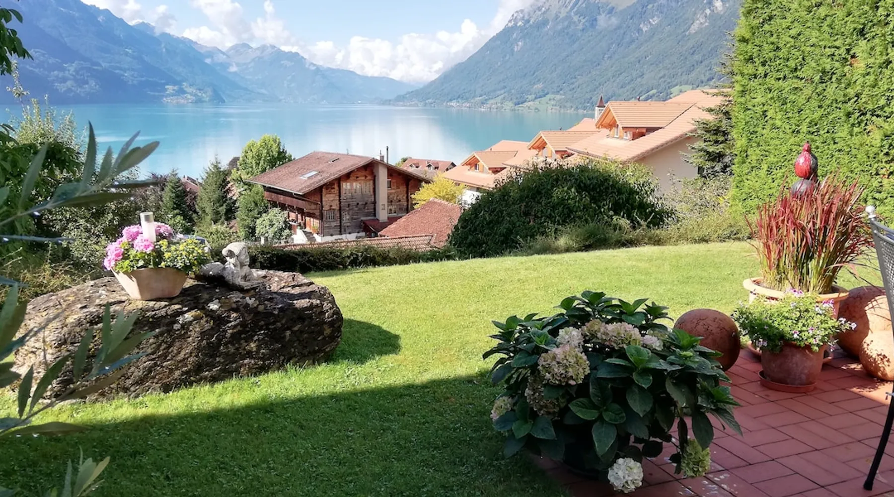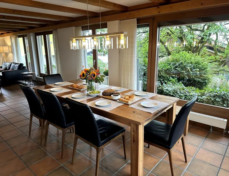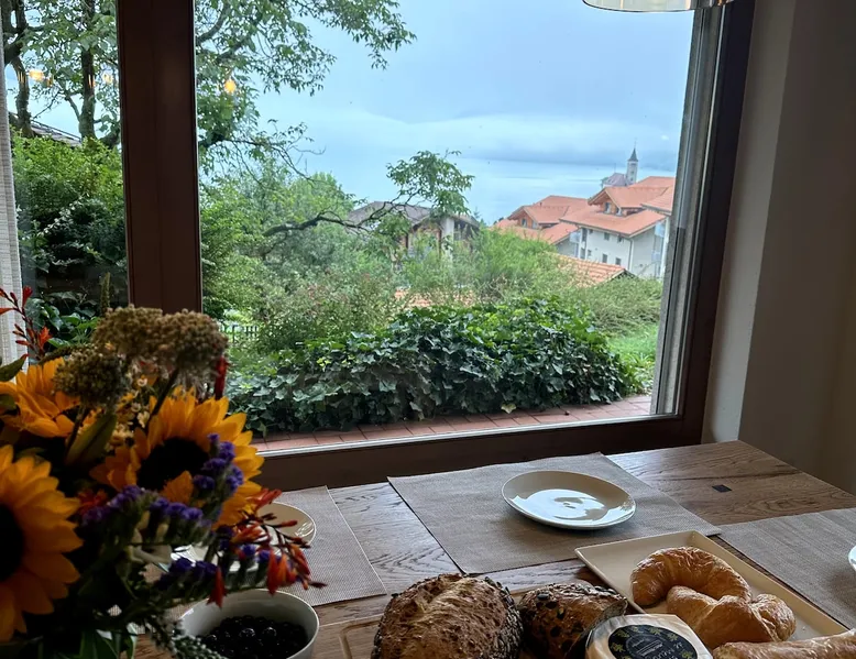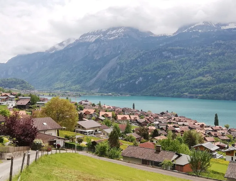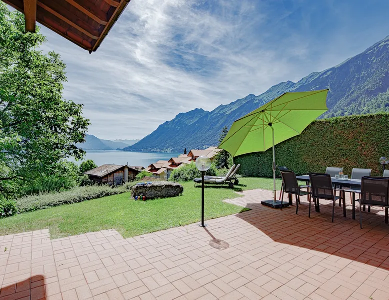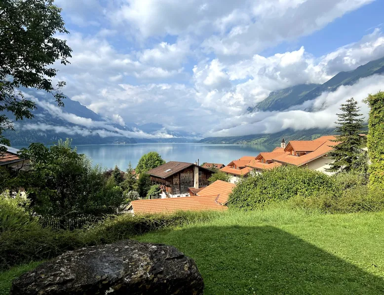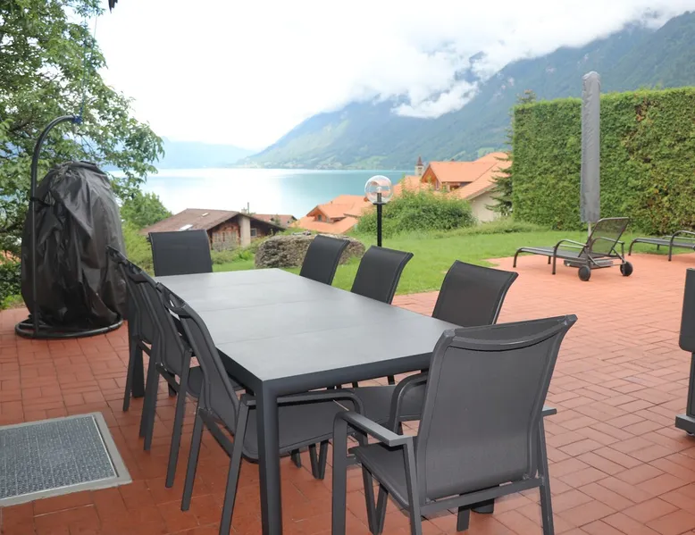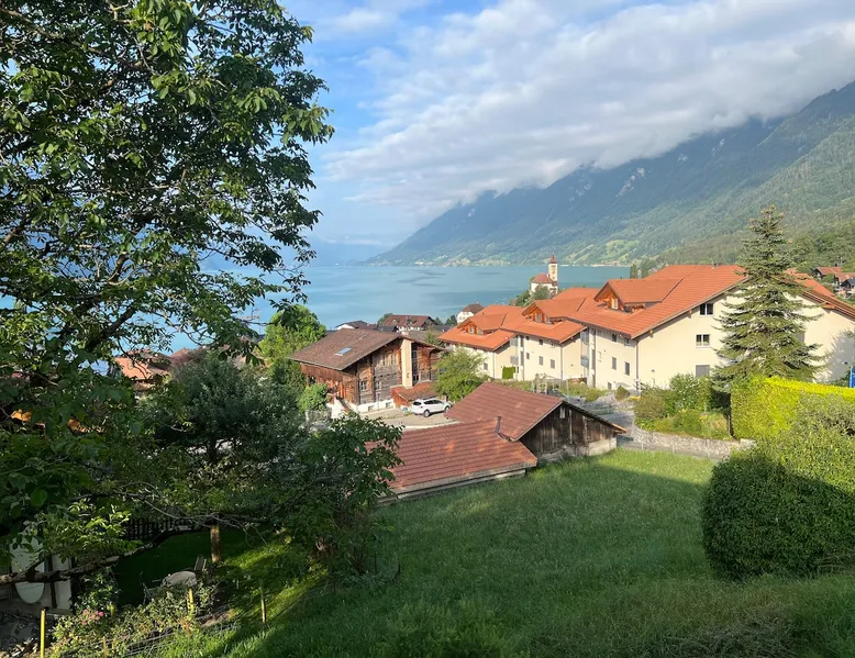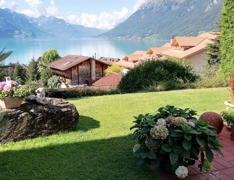 Find serenity in a historic Swiss village by turquoise Lake Brienz! Brienz Villa on Alpgasse is a stylish home with breathtaking views, ideal for 1 or 2 families. It's a 5 min walk to swimming/lakeside restaurants, 15 min to the train/ferry. Treat yourself to a luxurious vacation and discover the Bernese Oberland from here! The Villa has 2 units -you rent the main levels of this beautiful home. A lower apartment, with separate entrance/garden, is also rentable. The space Feel a warm welcome from a family-owned vacation home! Terrasse with dining area, outdoor fireplace, and spectacular views! Well-equipped kitchen Dining room with lake view Spacious living room with large TV 4 bedrooms (King, King, Queen, and 2 Twin beds) 2 full baths, 1 half bath Washer/dryer (on-site, shared) Fast wifi Grill and 1 kayak. Parking for up to 3 cars No pets Local quiet hours 10 pm-7 am Please respect that there is NO SMOKING allowed inside the home. All the furnishings are new and of good quality. Windows have retractable shutters for privacy. On the entrance level is the spacious entryway, guest bathroom, kitchen, dining room, and large living room with fireplace. The kitchen is well-equipped (including microwave, raclette, fondue, rice cooker, kettle, Nespresso machine, milk foamer.) From the kitchen and living room you have direct access to the large private patio with a beautiful view of Lake Brienz and surrounding mountains! The 4 bedrooms are on the upper floor. 1 bathroom with shower, toilet and sink is accessible to all. The other bathroom with corner bath, shower, toilet, double sink is connected to one of the bedrooms w/ King bed. On request we provide a baby bed for toddlers up to 3 years old and a high chair. The washing machine and dryer are in the basement and is shared with the guests of the lower apartment. The lower apartment is also rented on Airbnb. It has own private entrance and garden area. If you prefer to rent both units together, please inquire. Other things to note The walk to the house from the train and ferry stations takes about 15 minutes. The path via Feldstrasse has the easiest, most gradual incline with an elevation gain of about 35 meters or 115 feet.